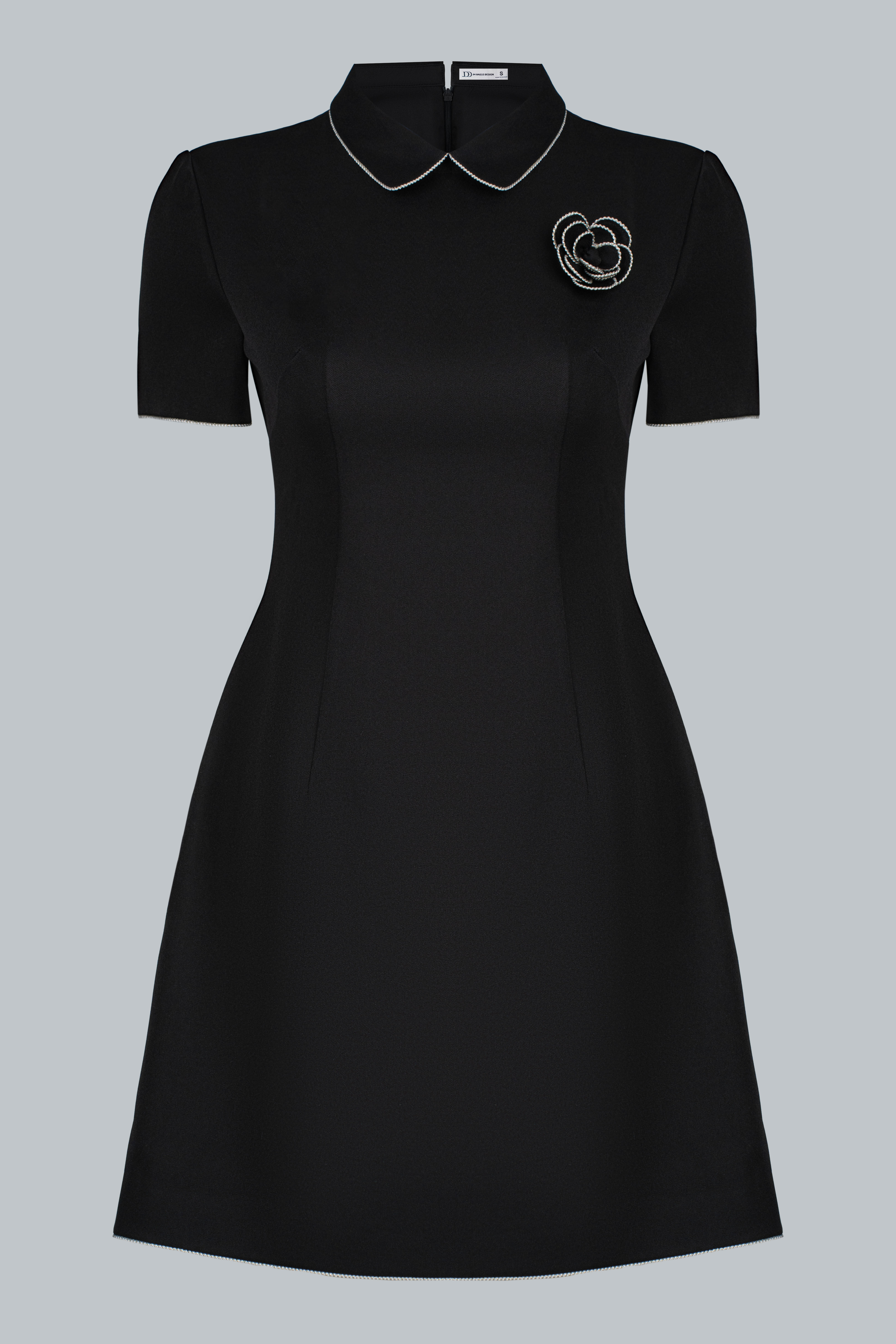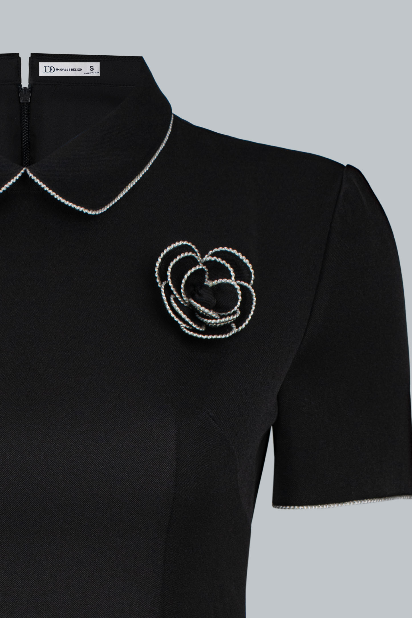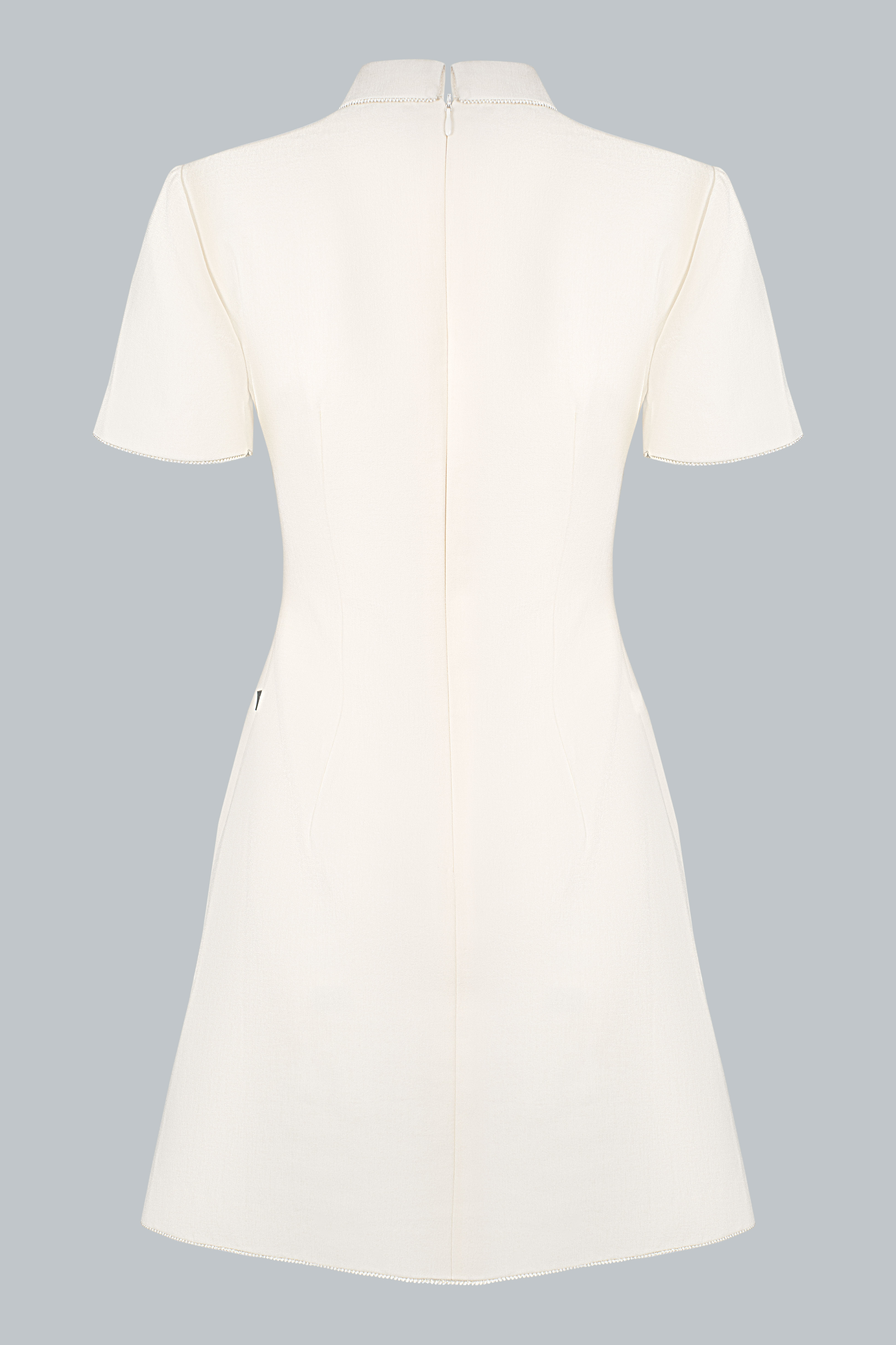Đầm mini trên gối, form ôm vừa tôn đường cong mềm mại nhưng vẫn giữ sự kín đáo. Cổ sen bo nhẹ viền ren tinh tế, kết hợp tay ngắn tạo vẻ thanh thoát. Ngực áo điểm nhấn hoa cài 3D cùng tông, mang lại sự duyên dáng ngọt ngào. Gam trắng kem ngọc trai làm sáng gương mặt, gợi cảm giác sang trọng và trong trẻo.