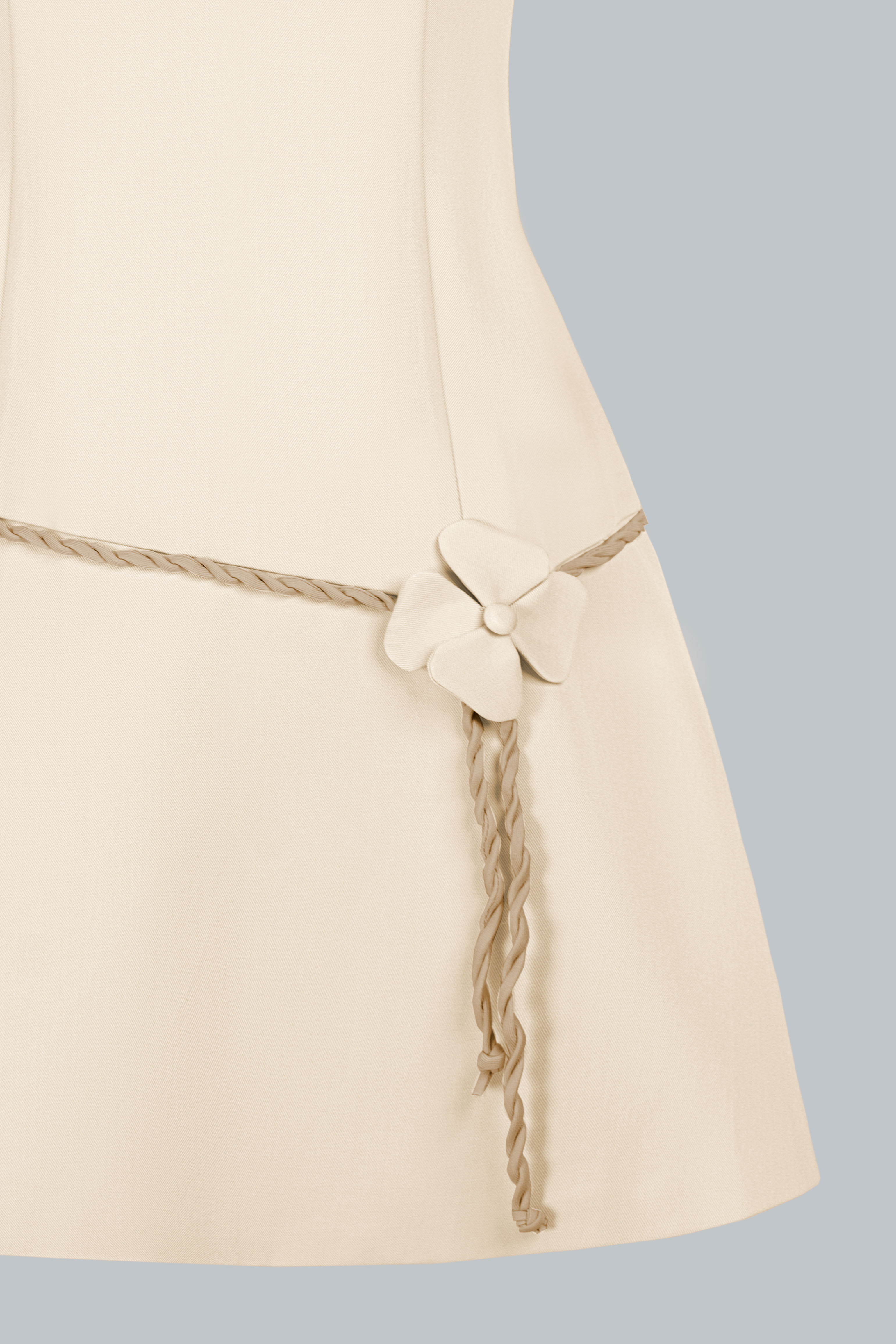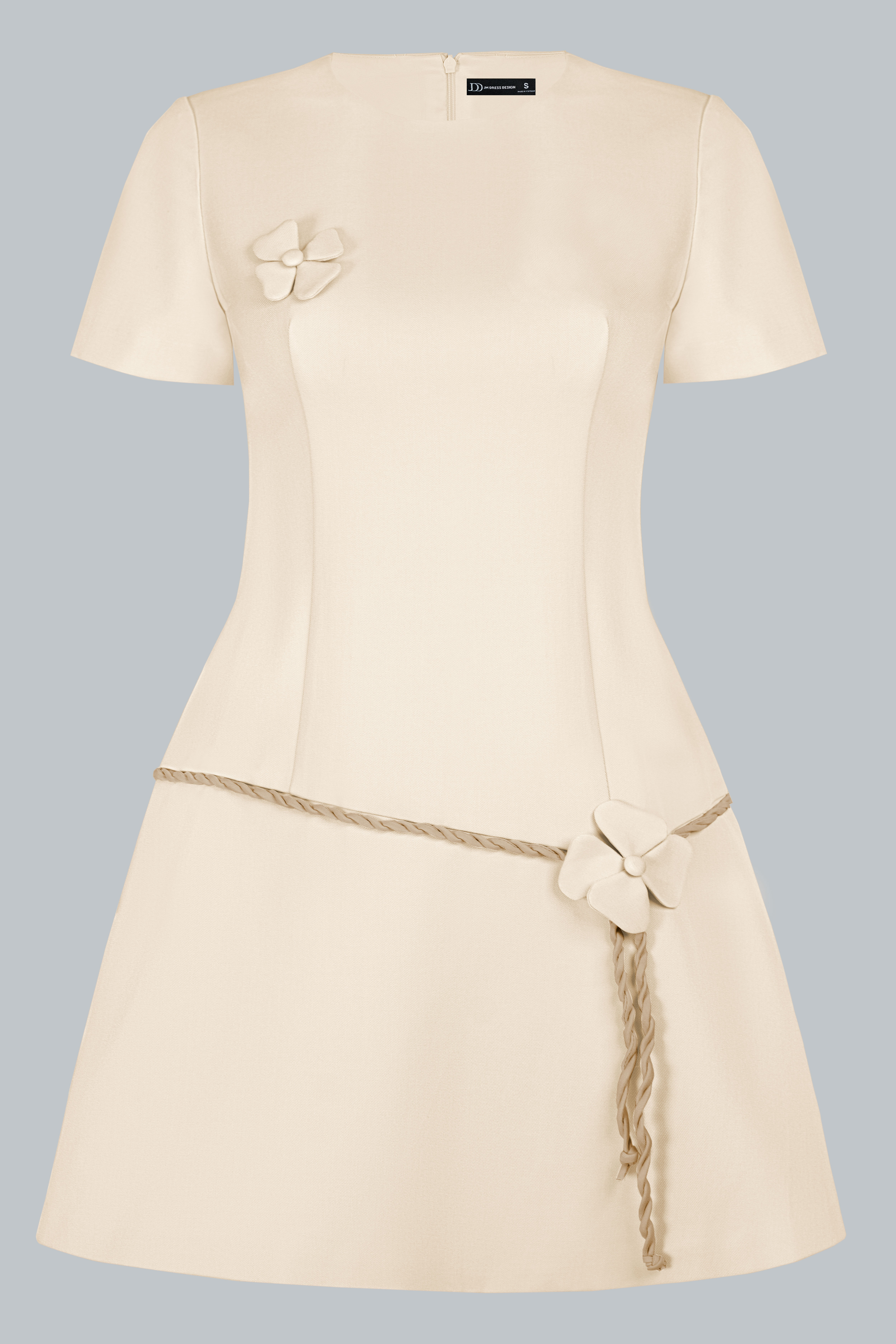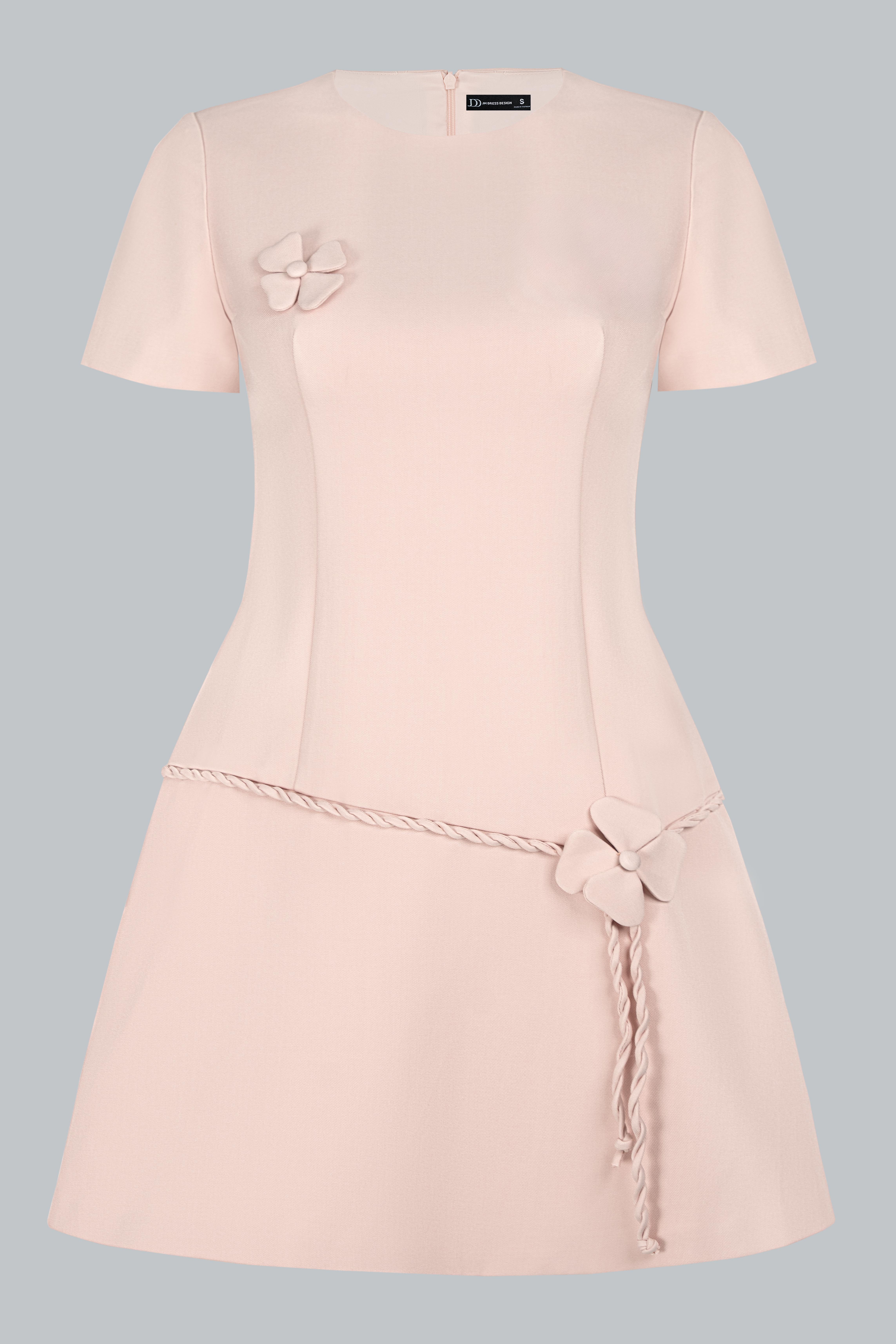 Thiết kế cổ tròn tối giản, tay ngắn gọn gàng giúp tôn lên nét tinh khôi. Điểm nhấn nằm ở những bông hoa 3D nhỏ nhắn đặt khéo léo trên ngực và thắt eo, kết hợp cùng dây đai xoắn tinh xảo, tạo điểm nhìn duyên dáng. Phom A-line được xử lý tinh tế, vừa vặn phần thân trên và rủ nhẹ xuống, mang đến sự cân đối cho vóc dáng.