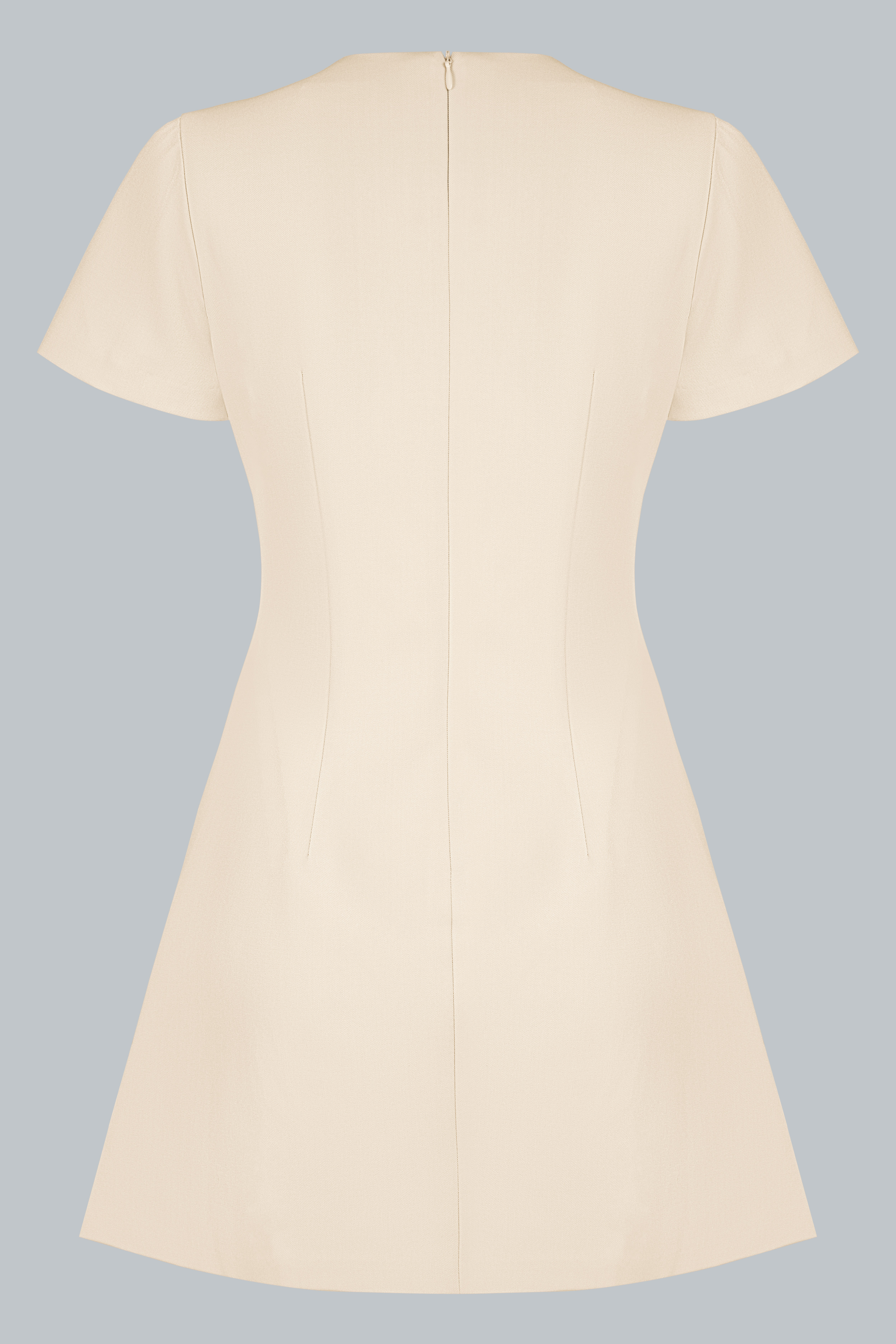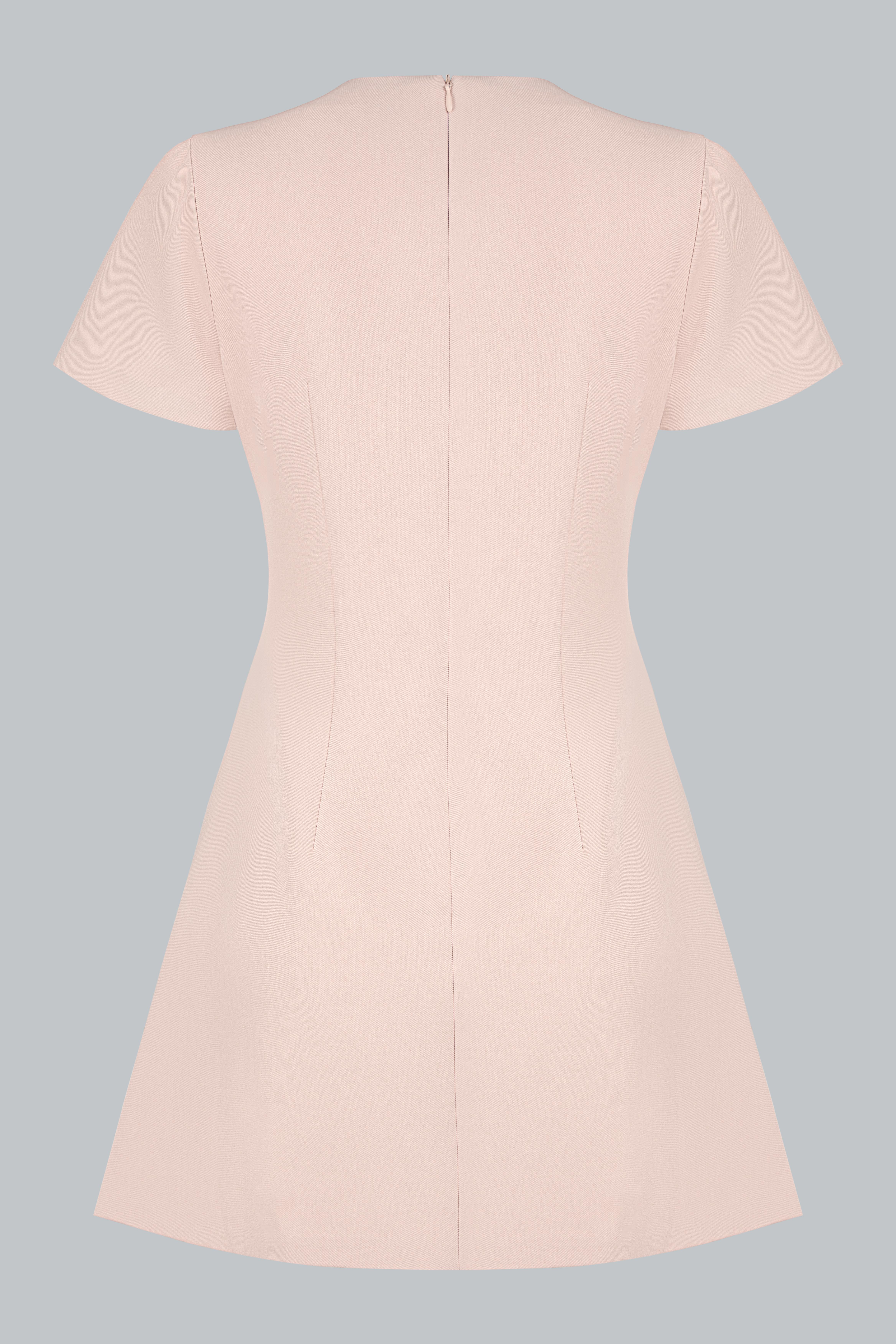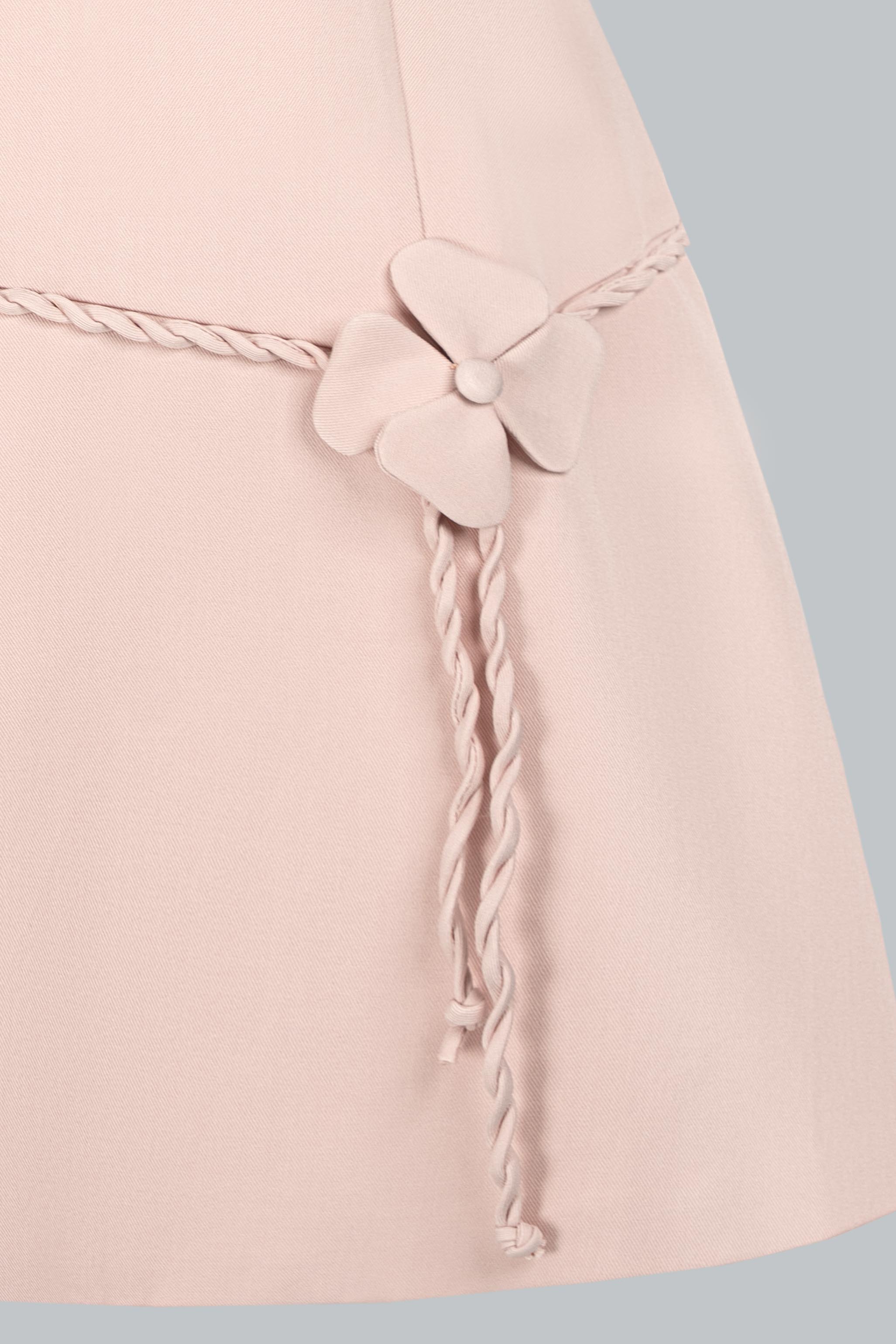 Thiết kế cổ tròn tối giản, tay ngắn gọn gàng giúp tôn lên nét tinh khôi. Điểm nhấn nằm ở những bông hoa 3D nhỏ nhắn đặt khéo léo trên ngực và thắt eo, kết hợp cùng dây đai xoắn tinh xảo, tạo điểm nhìn duyên dáng. Phom A-line được xử lý tinh tế, vừa vặn phần thân trên và rủ nhẹ xuống, mang đến sự cân đối cho vóc dáng.