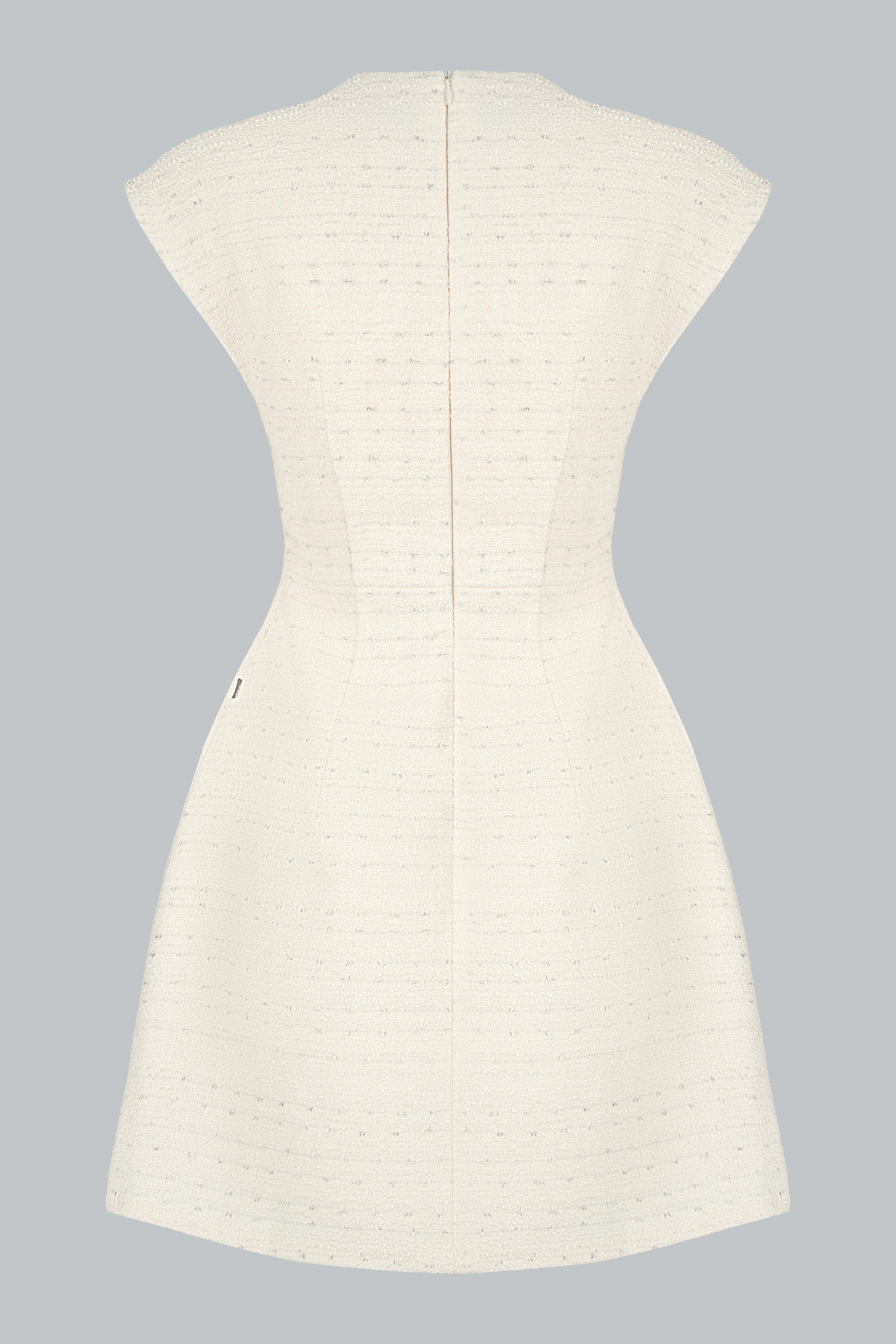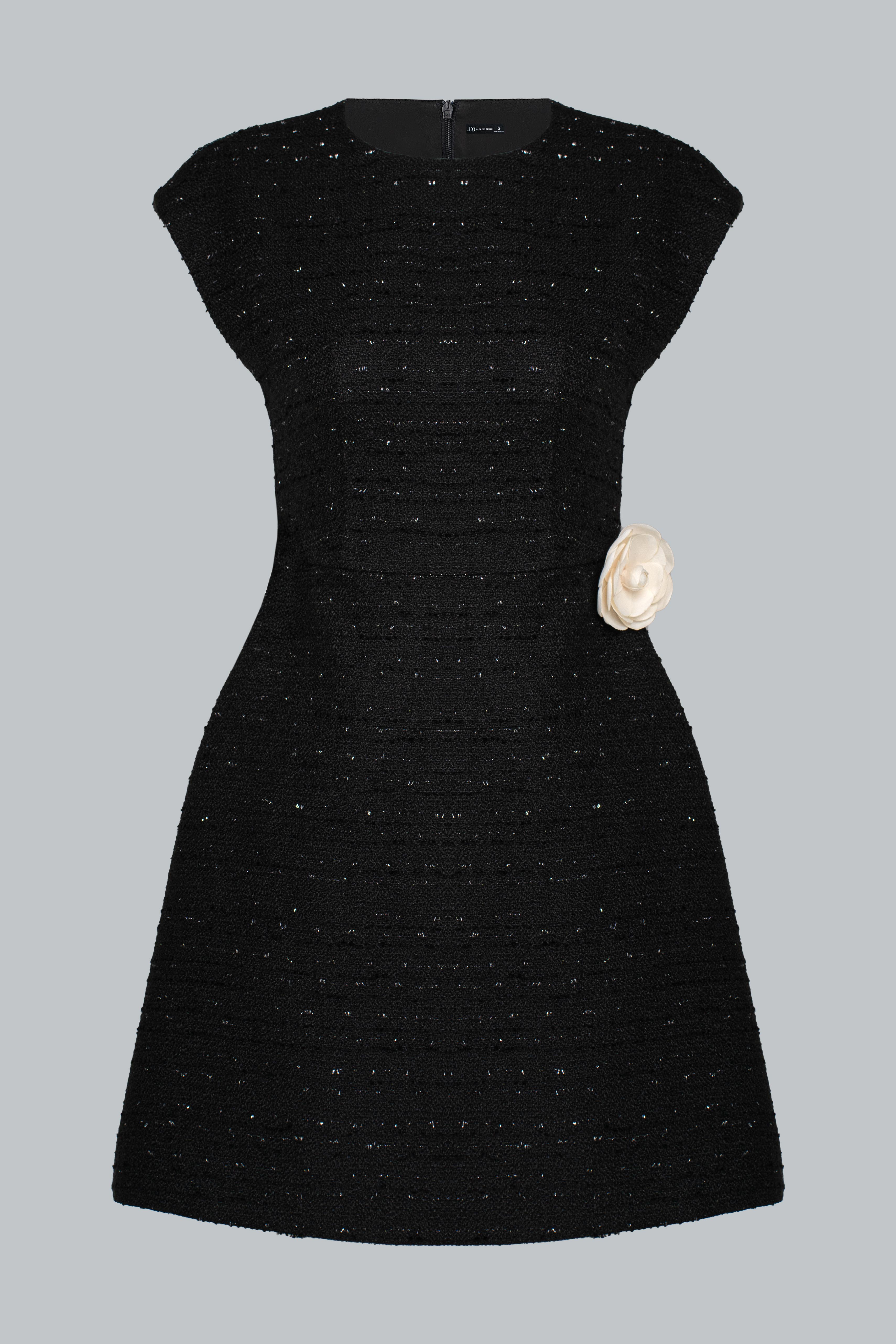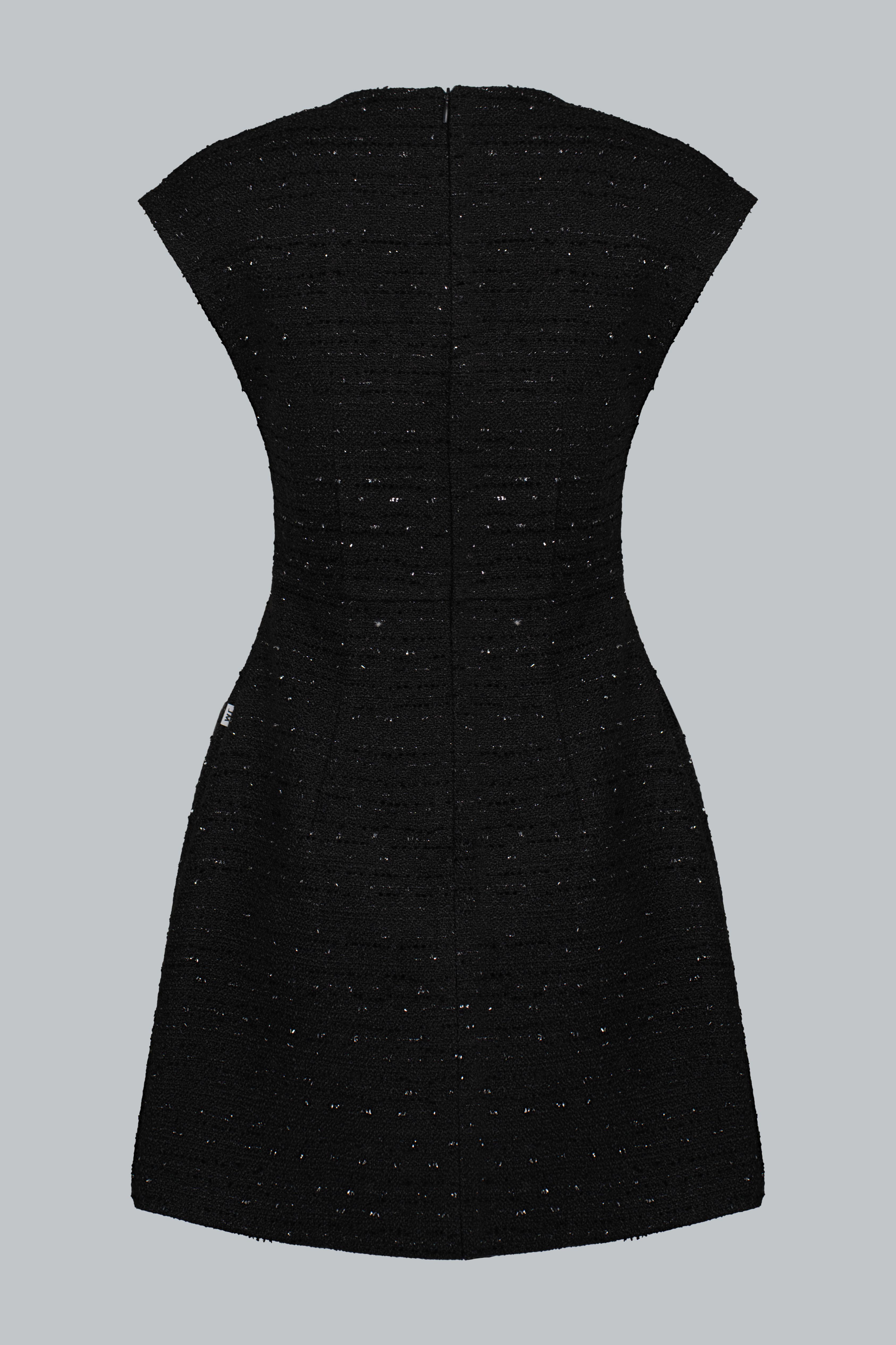 Dáng mini A-line gọn gàng, tôn đôi chân thon dài và mang lại vẻ ngoài trẻ trung, hiện đại. Trên nền tweed đen ánh kim, từng đường cắt được xử lý khéo léo, giữ form chuẩn chỉnh. Thiết kế tối giản nhưng không đơn điệu: cổ tròn thanh lịch, thân váy gọn dáng, mang đến sự linh hoạt trong mọi hoàn cảnh. Đây là chiếc váy kinh điển, đẹp bền bỉ cùng thời gian.