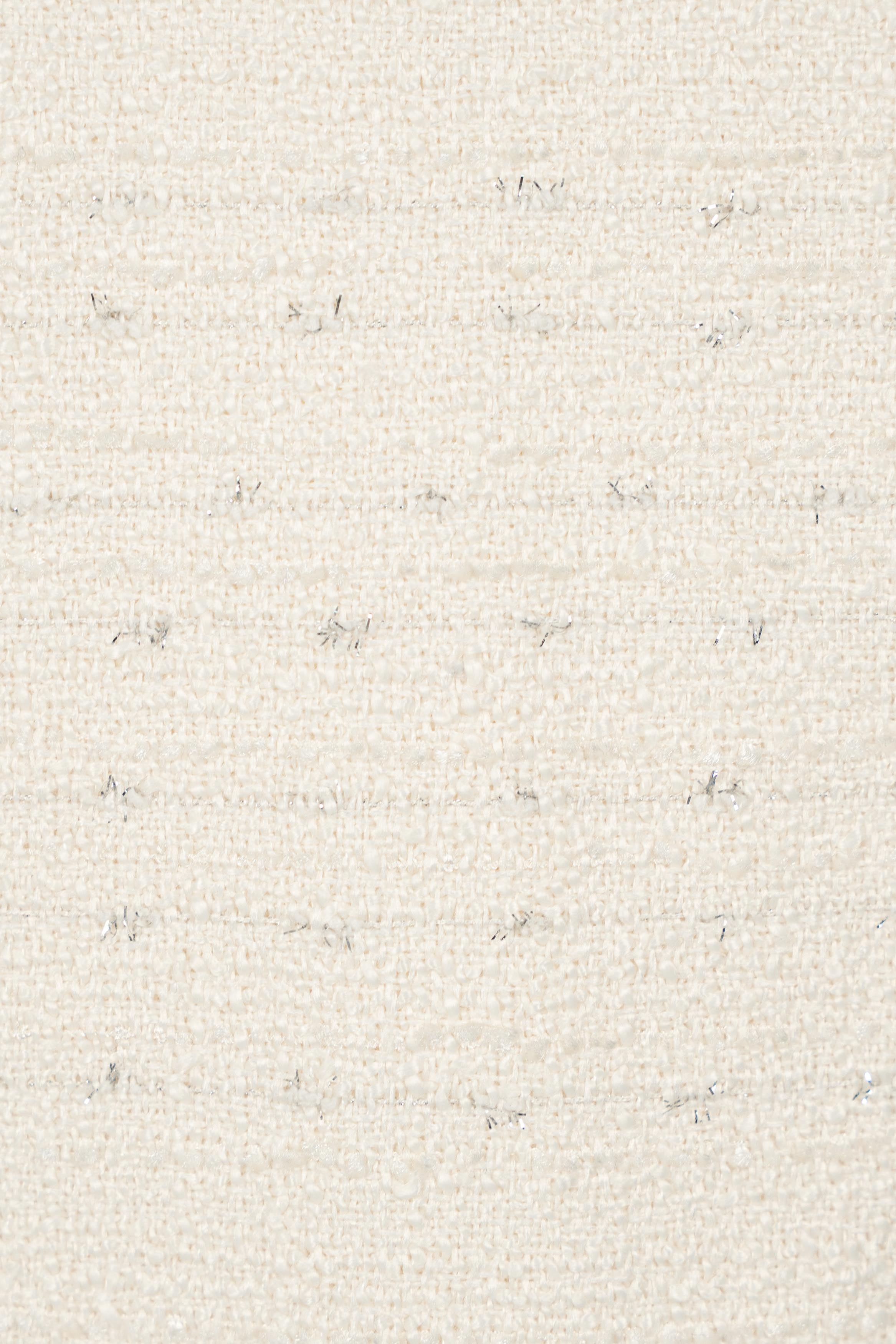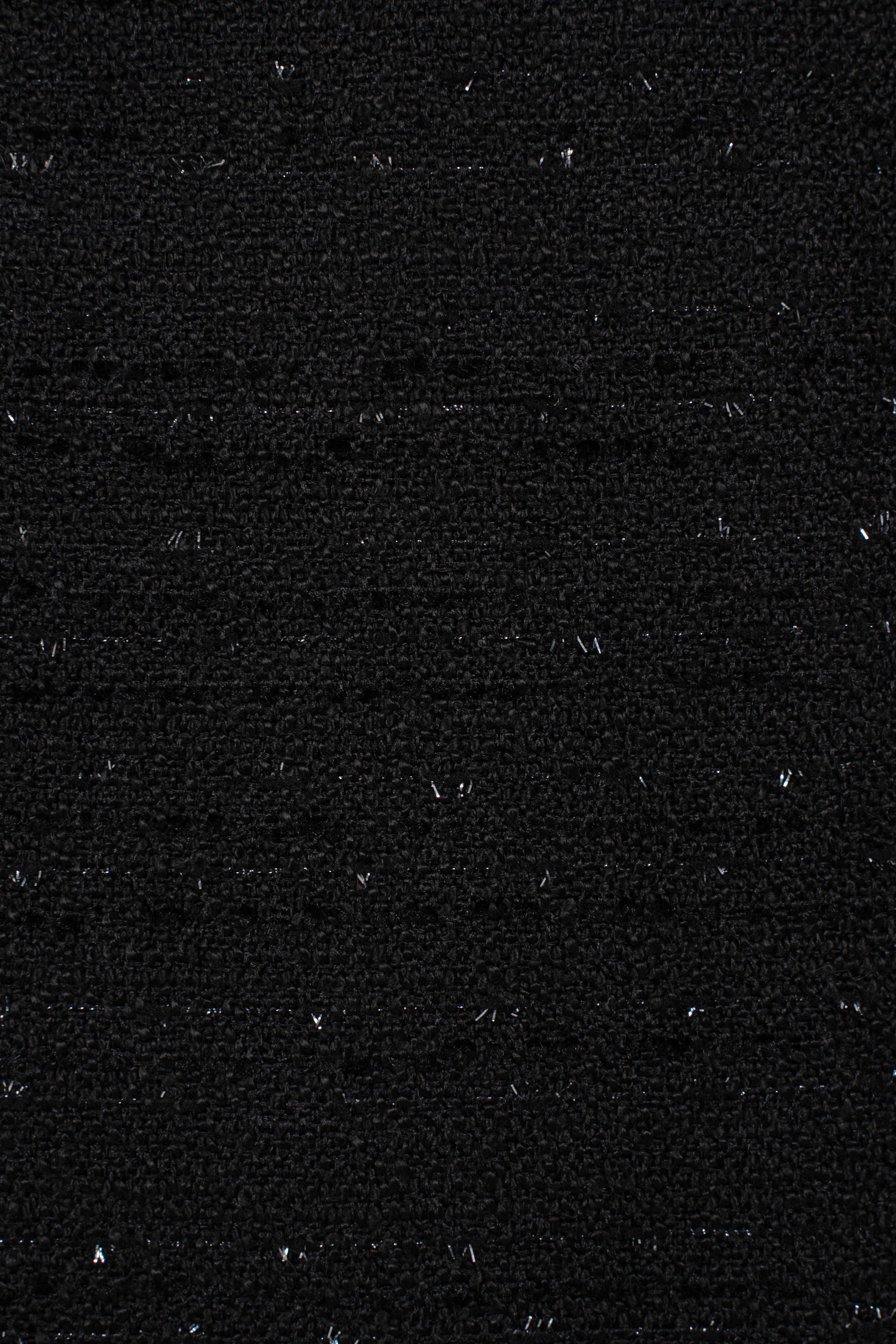 Tweed đen ánh kim sang trọng, giữ phom đứng dáng nhưng vẫn tạo cảm giác thoải mái. Bề mặt ánh kim tinh tế phản chiếu ánh sáng, đủ để nổi bật trong buổi tiệc tối nhưng không quá rực rỡ. Lớp lót mềm mại bên trong giúp nàng tự tin vận động cả ngày dài.