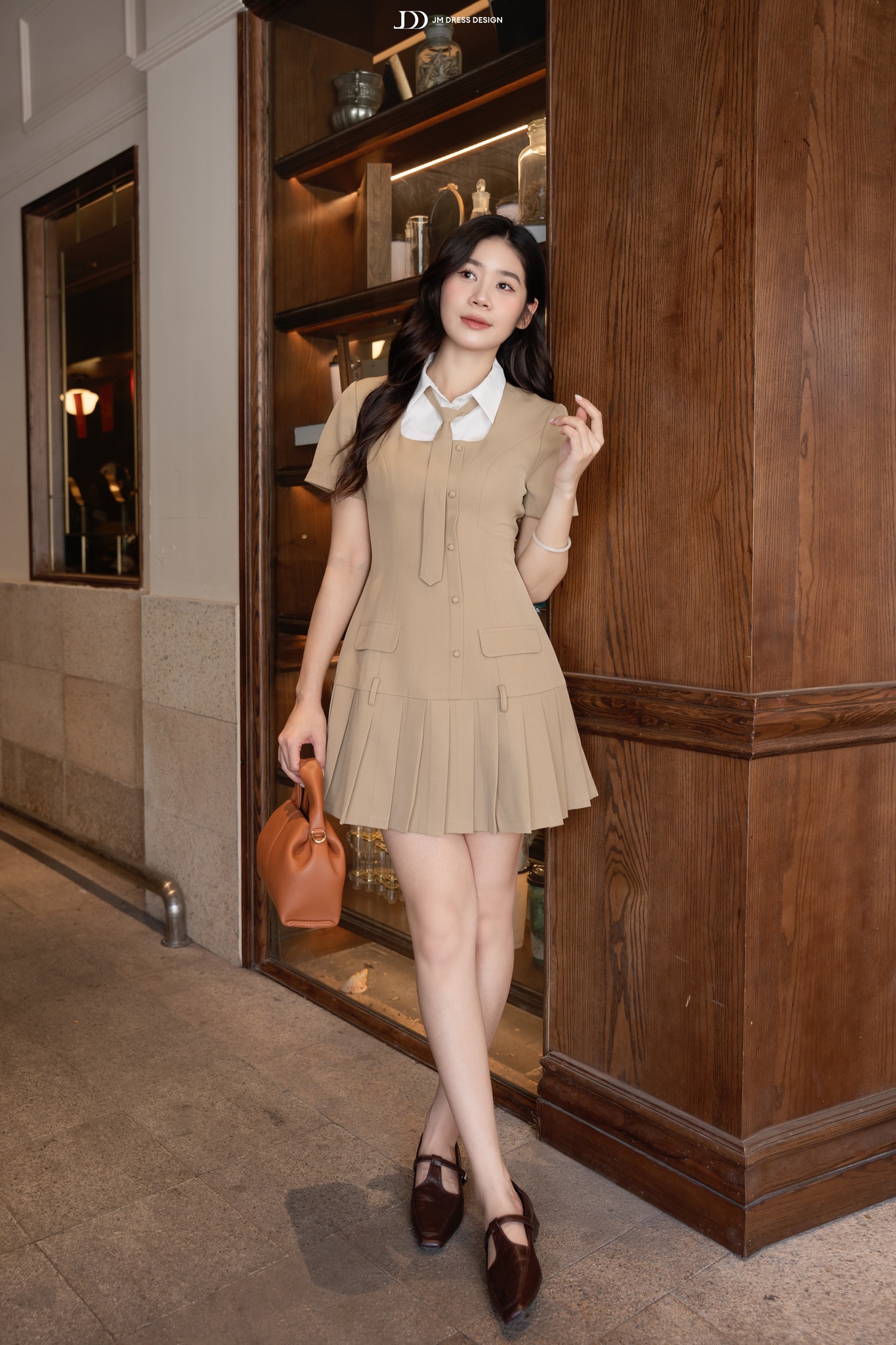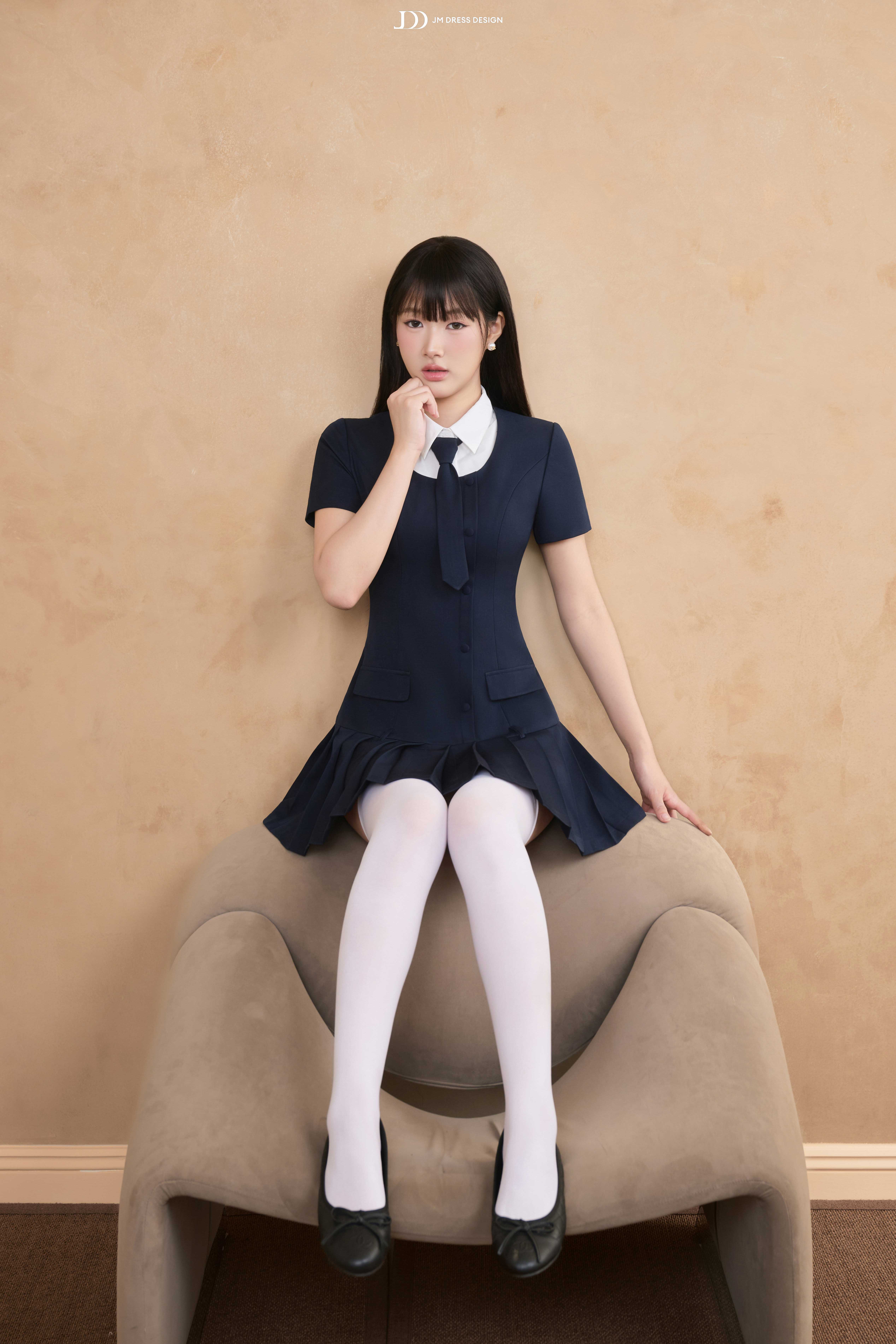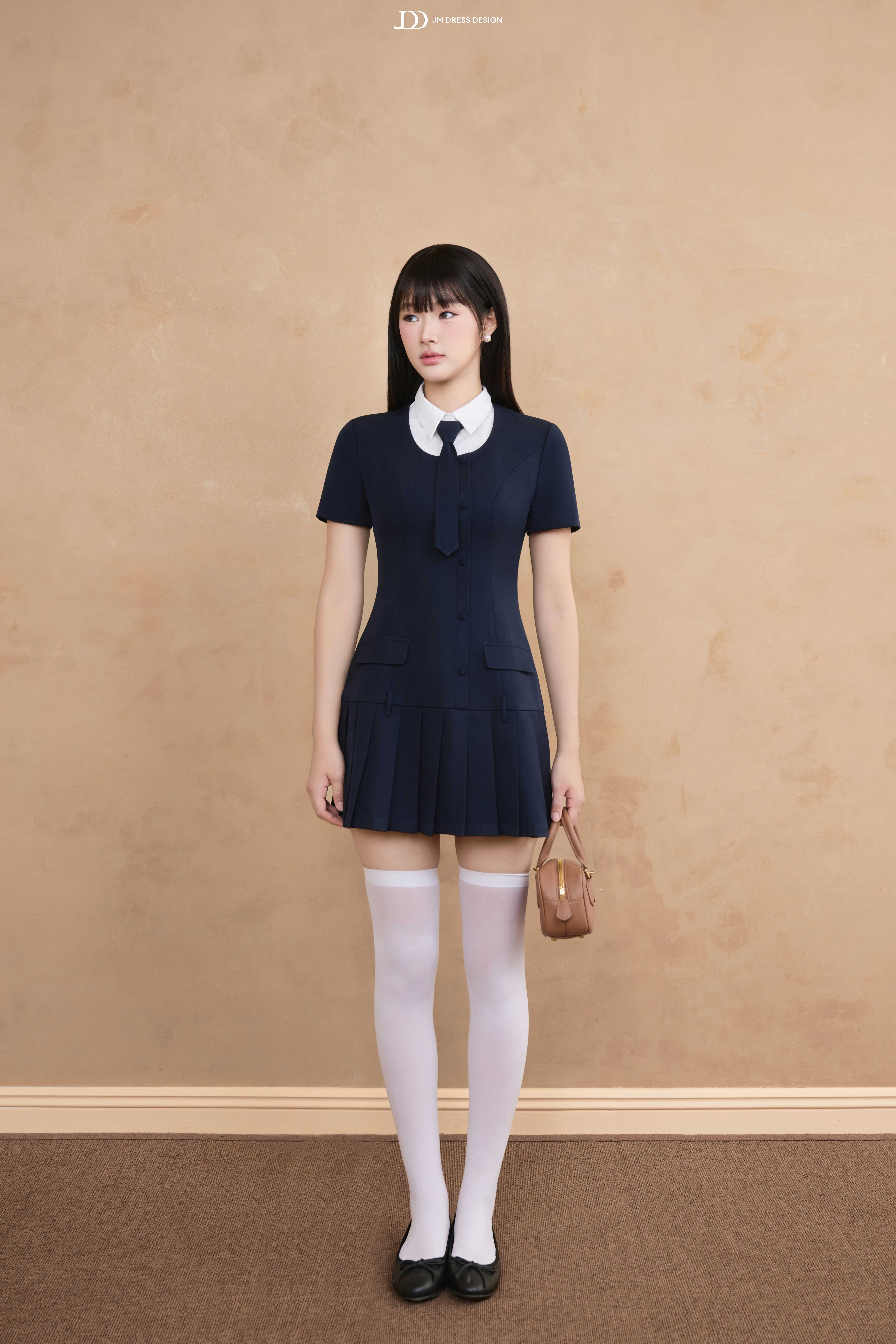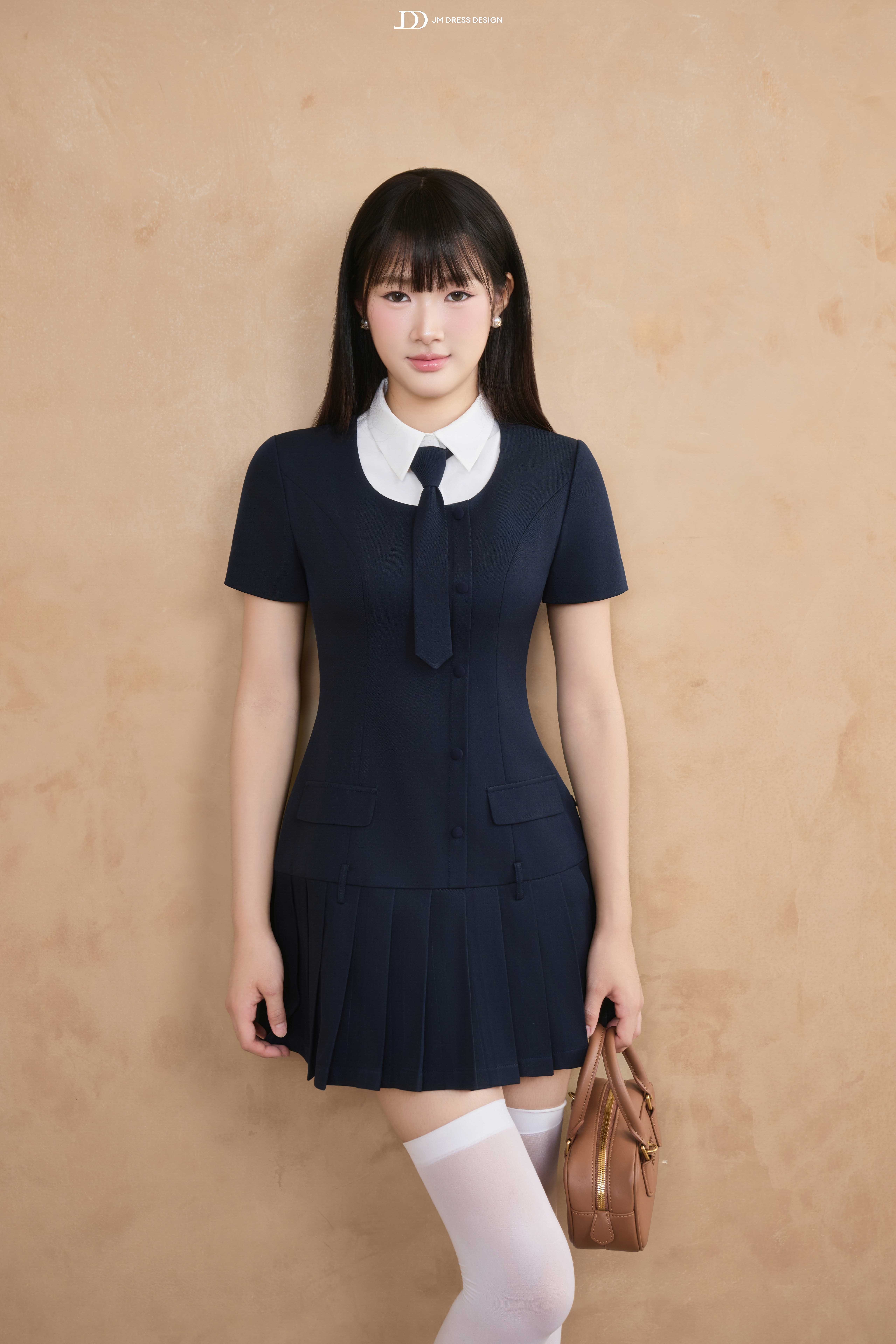 Váy ngắn xếp ly phối cùng phần cổ sơ mi trắng và cà vạt nhỏ, tạo tổng thể vừa tinh nghịch vừa duyên dáng. Cổ áo có thể tháo rời để tiện giặt giữ màu. Tỉ lệ váy ngắn – tất cao – giày loafer tạo hiệu ứng hack dáng, giúp nàng thêm phần năng động.