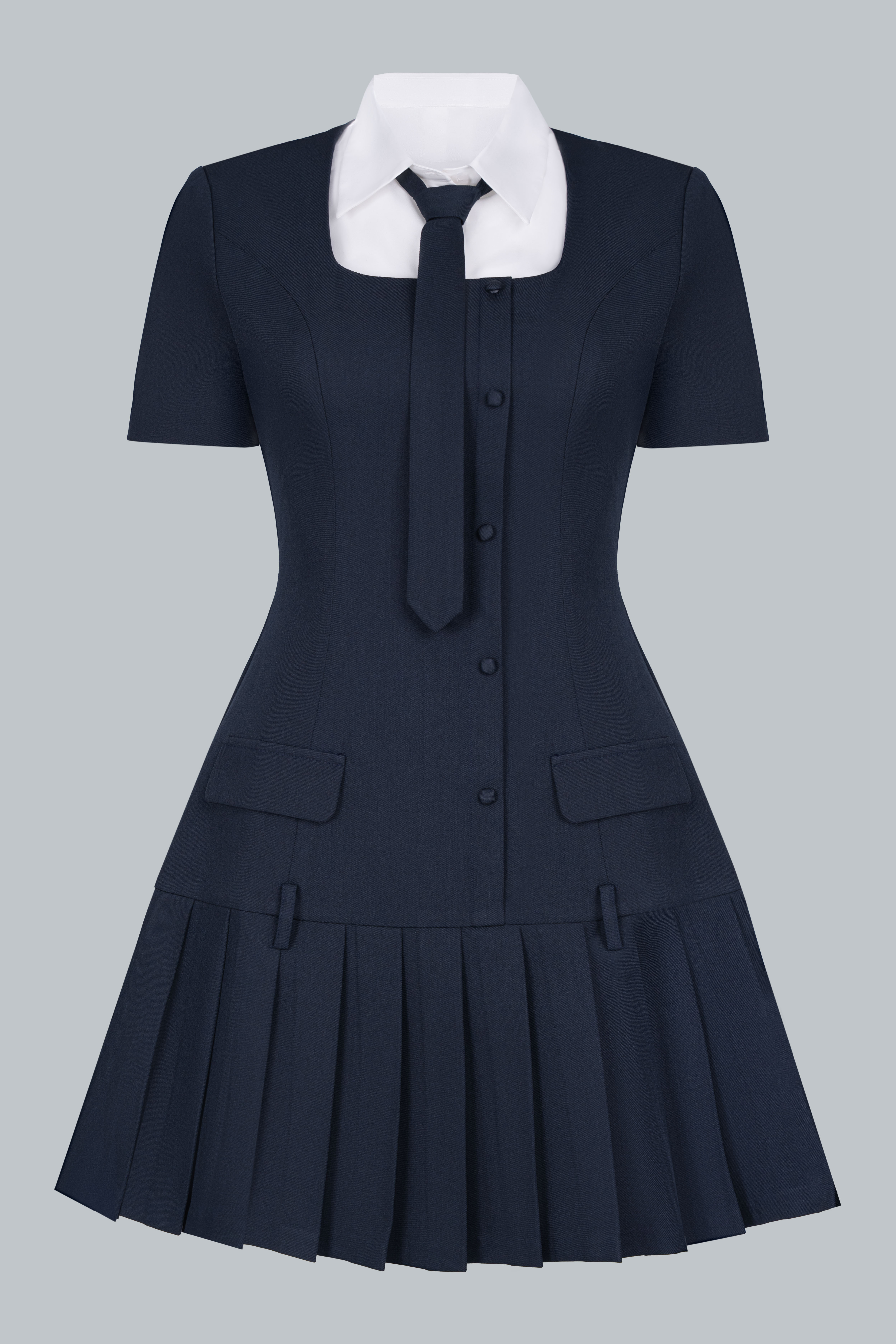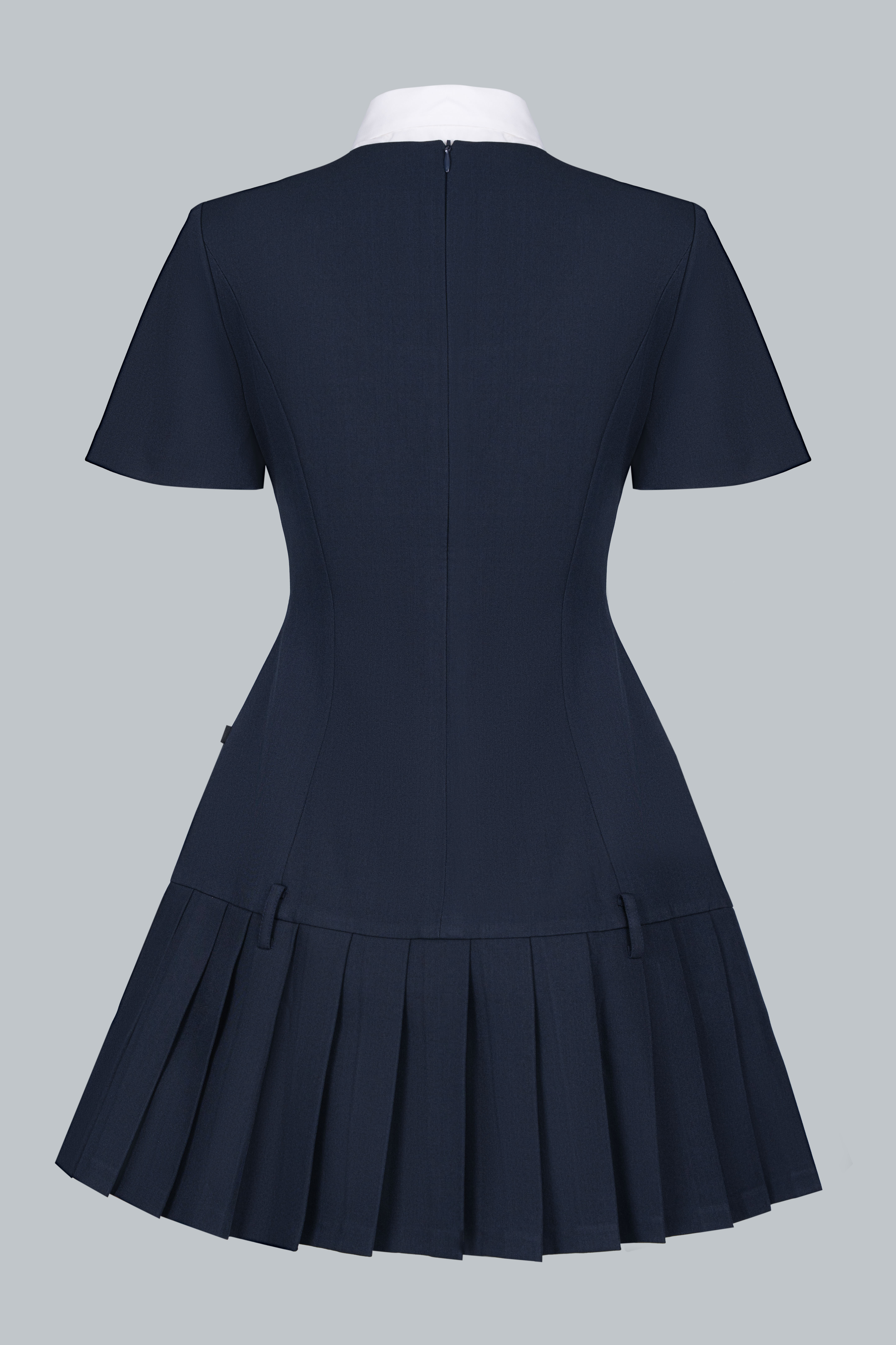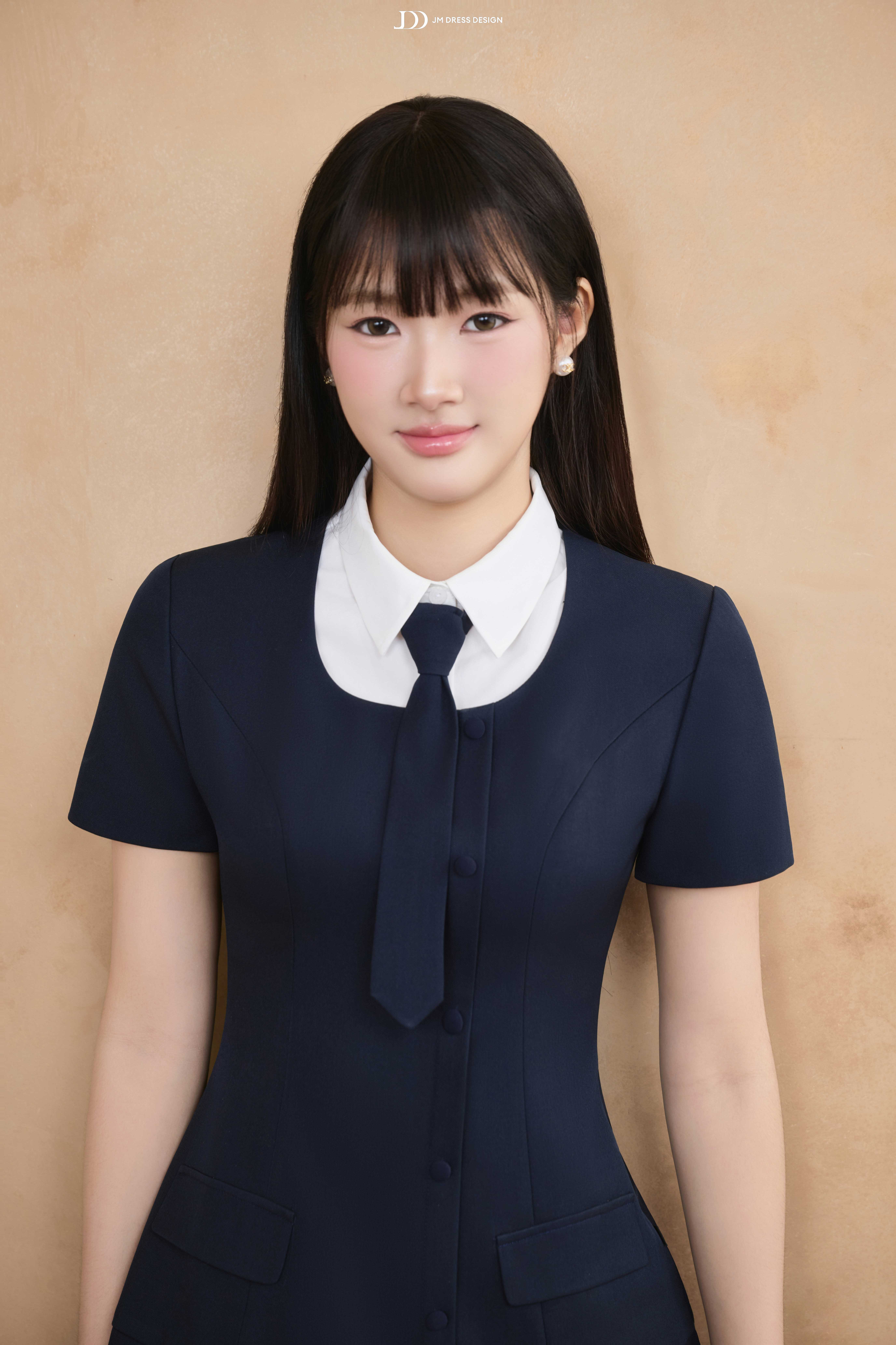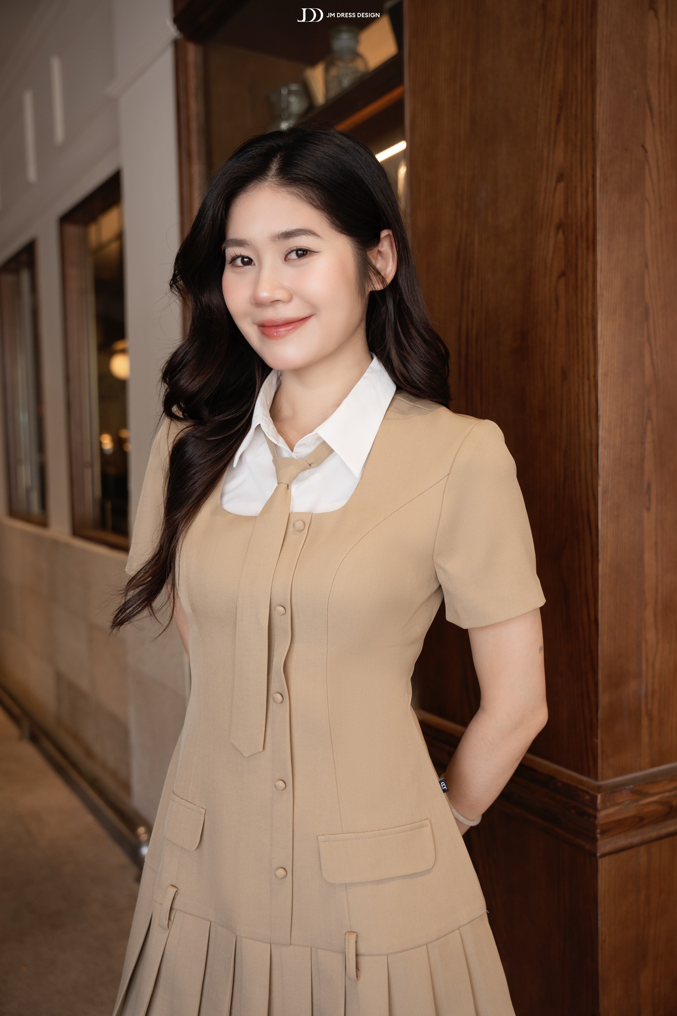 Váy ngắn xếp ly phối cùng phần cổ sơ mi trắng và cà vạt nhỏ, tạo tổng thể vừa tinh nghịch vừa duyên dáng. Cổ áo có thể tháo rời để tiện giặt giữ màu. Tỉ lệ váy ngắn – tất cao – giày loafer tạo hiệu ứng hack dáng, giúp nàng thêm phần năng động.