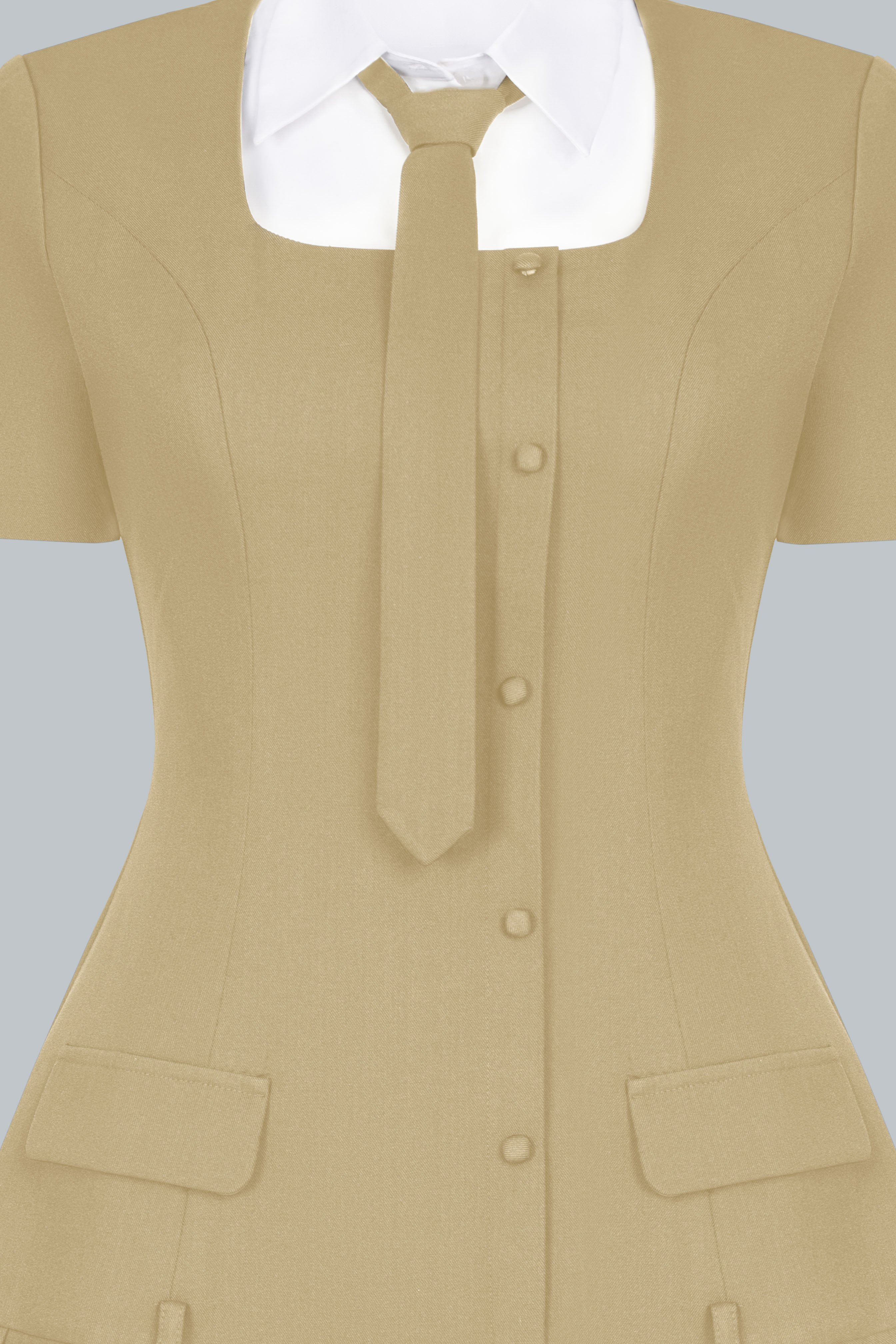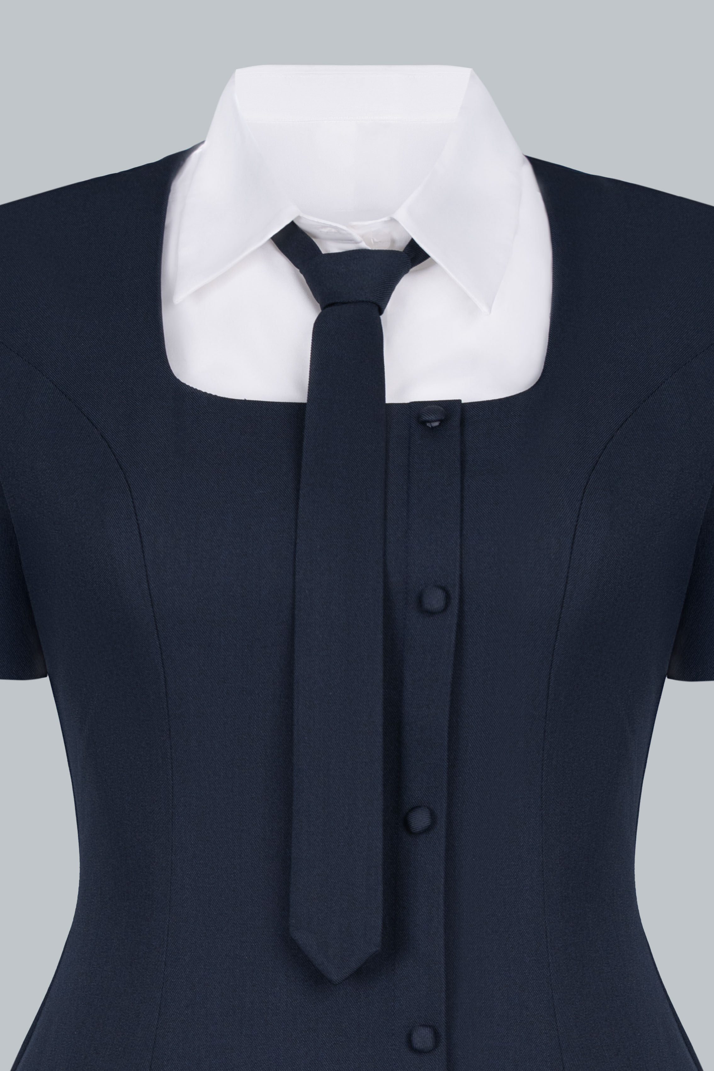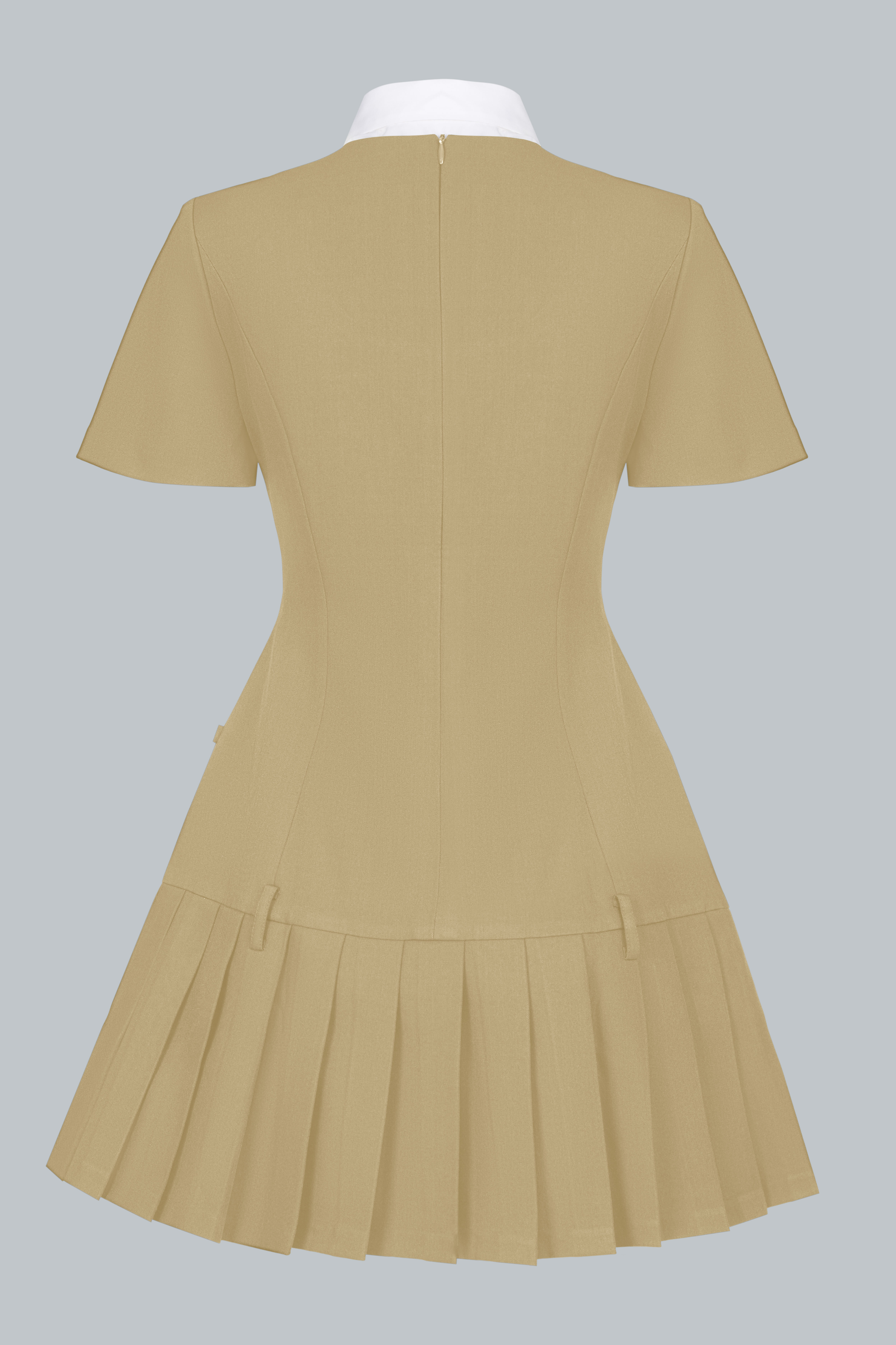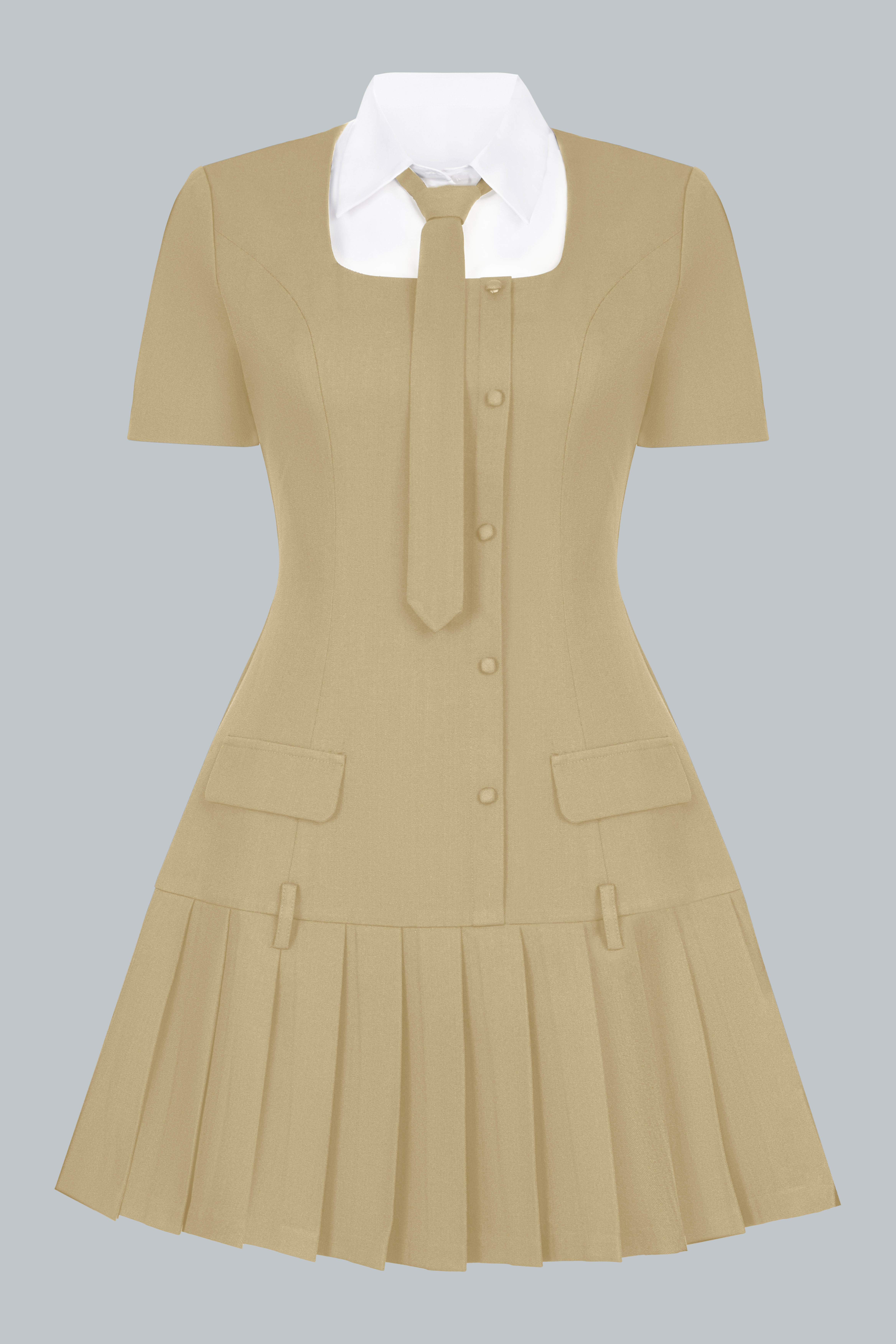Váy ngắn xếp ly phối cùng phần cổ sơ mi trắng và cà vạt nhỏ, tạo tổng thể vừa tinh nghịch vừa duyên dáng. Cổ áo có thể tháo rời để tiện giặt giữ màu. Tỉ lệ váy ngắn – tất cao – giày loafer tạo hiệu ứng hack dáng, giúp nàng thêm phần năng động.
