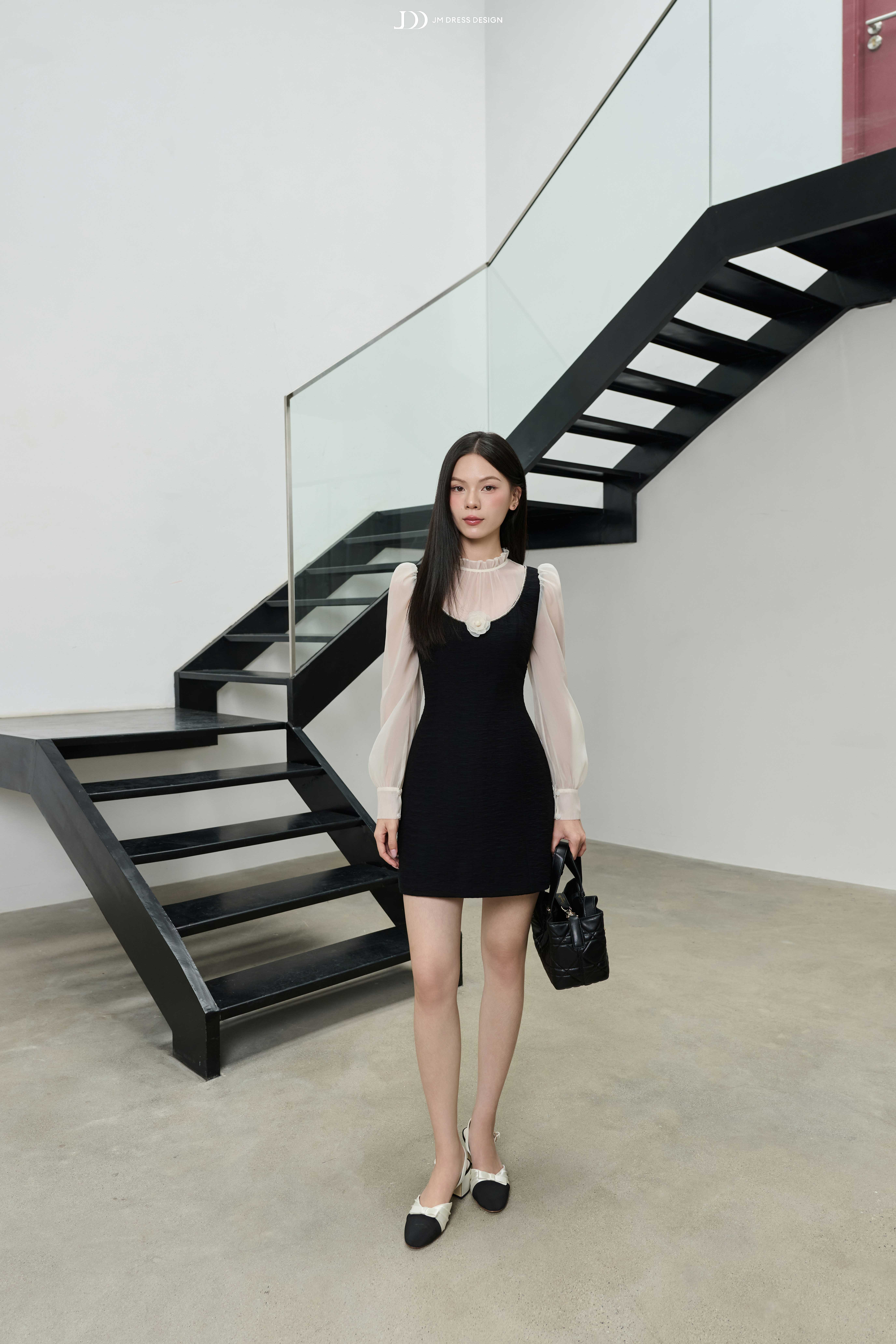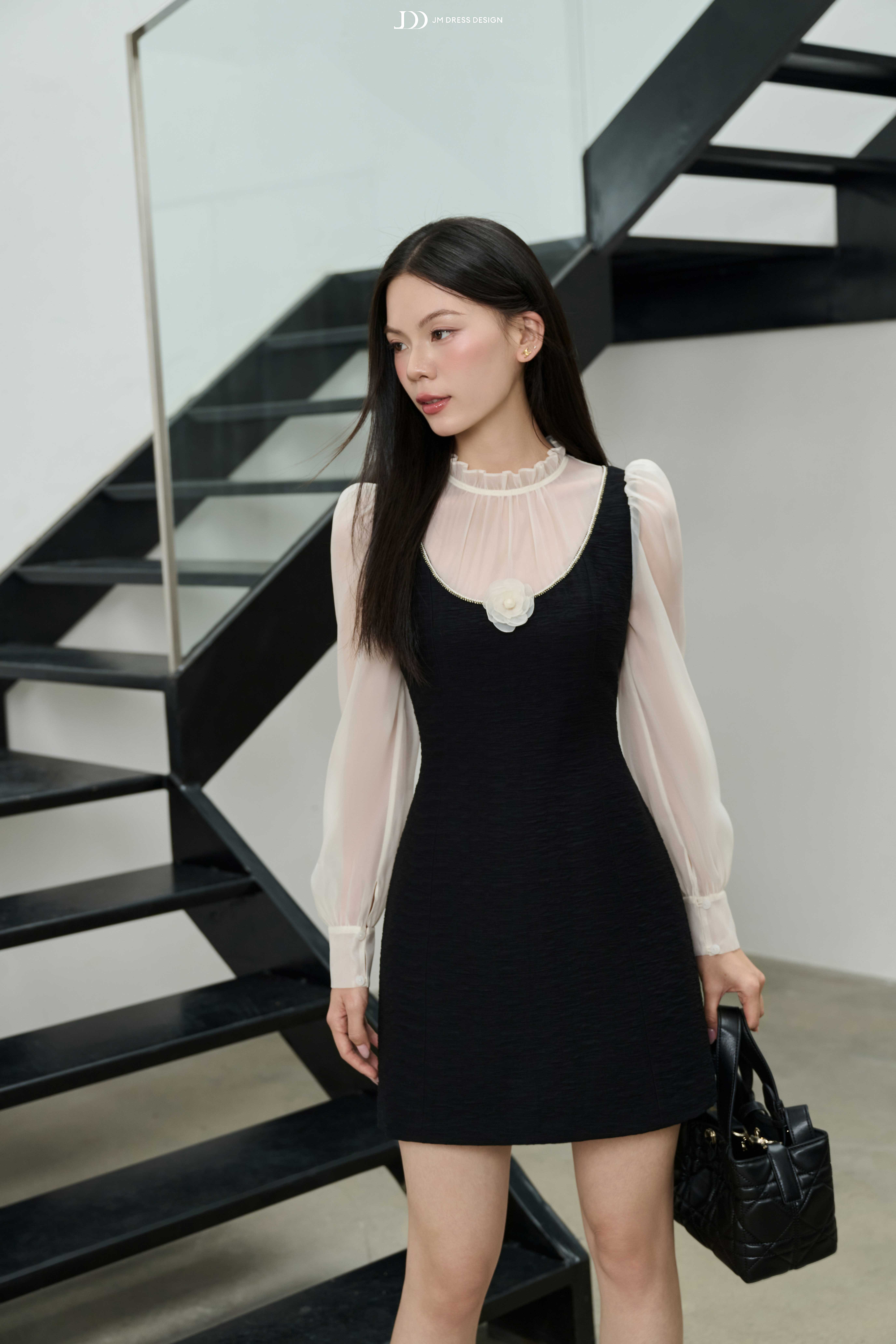 Phụ kiện: khuyên ngọc trai nhỏ, vòng cổ mảnh, kẹp tóc ngọc trai hoặc băng đô đen để giữ tinh thần nhẹ nhàng – thanh lịch.