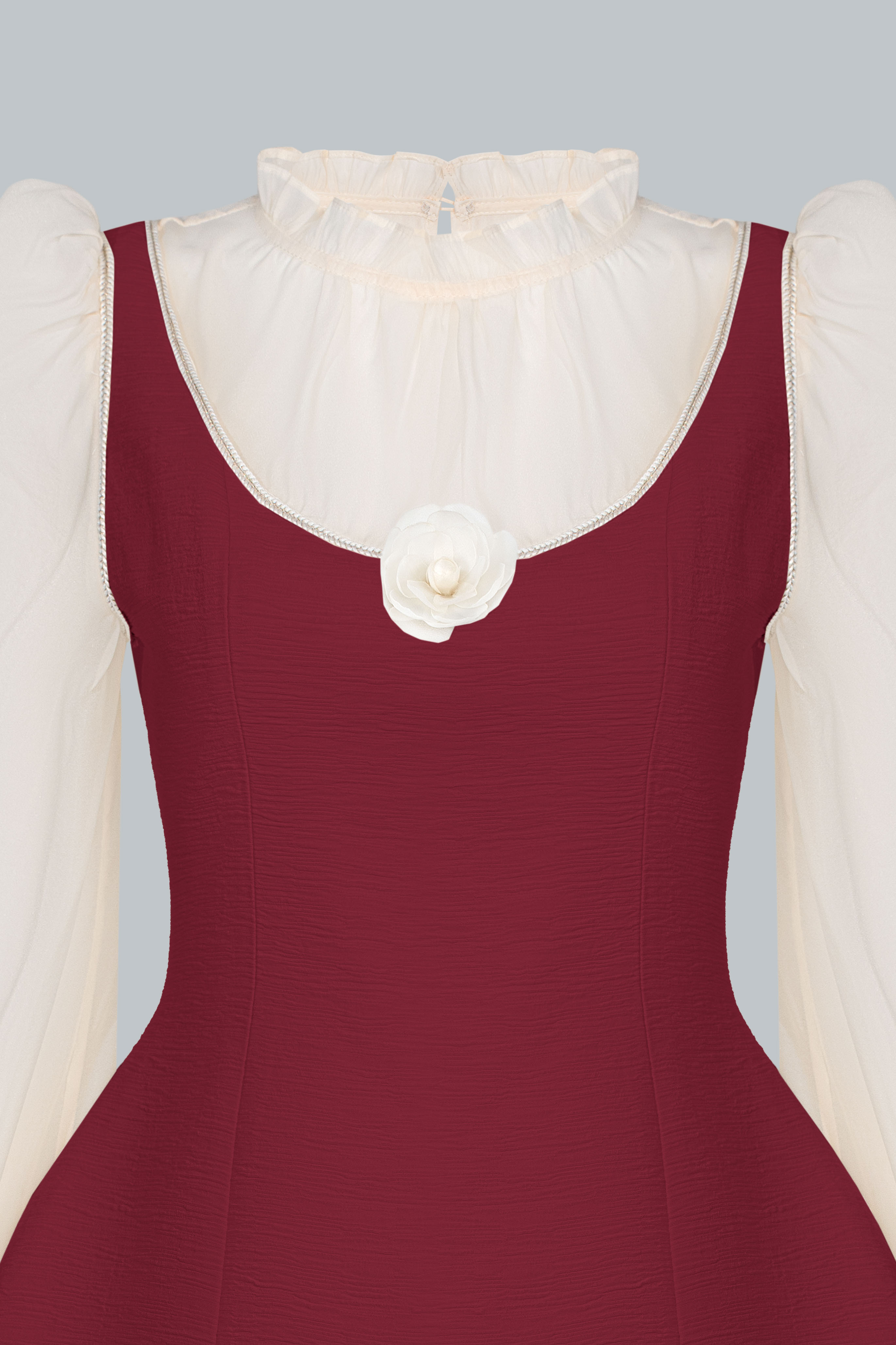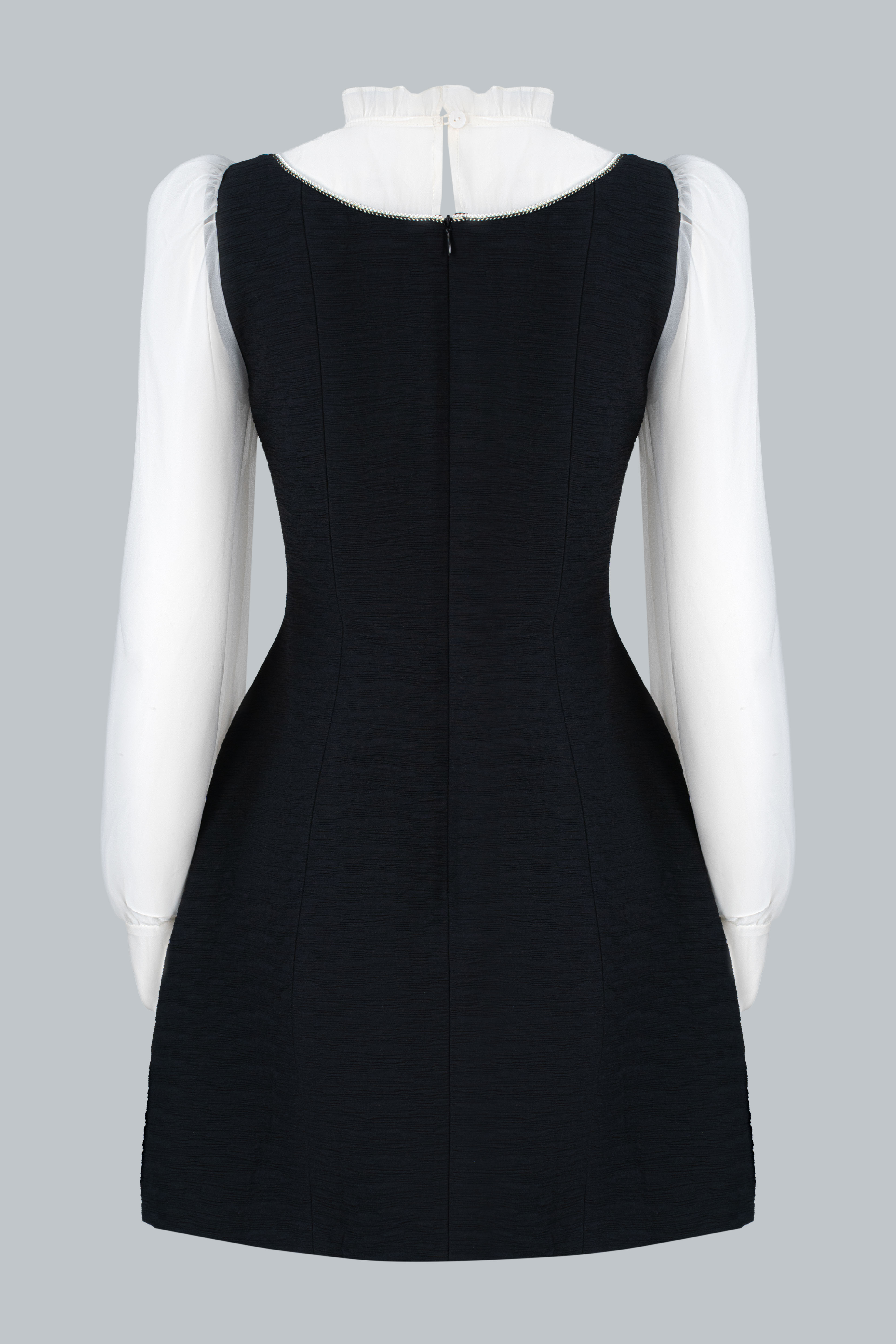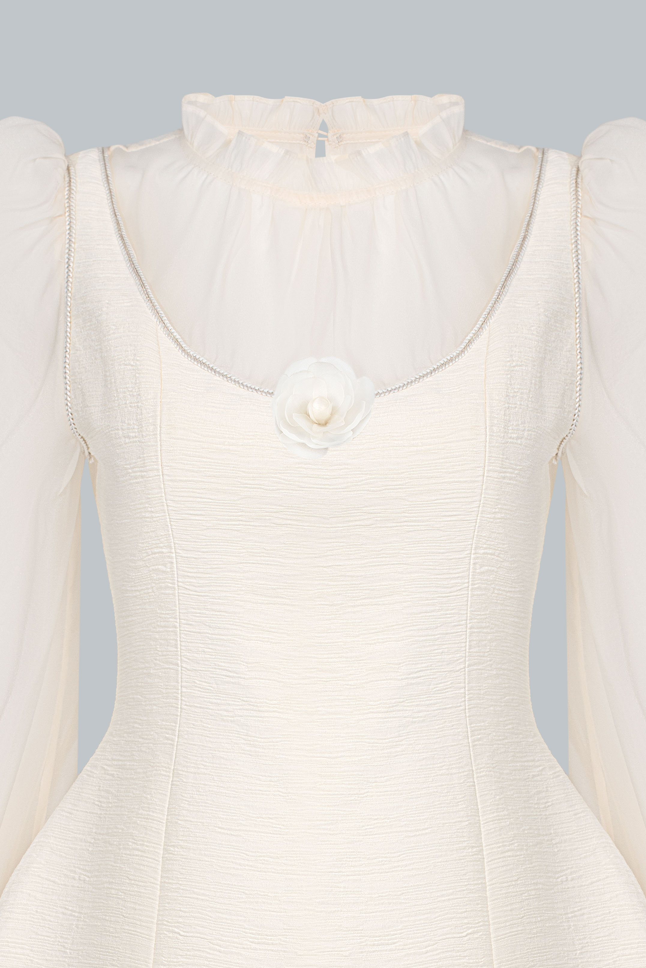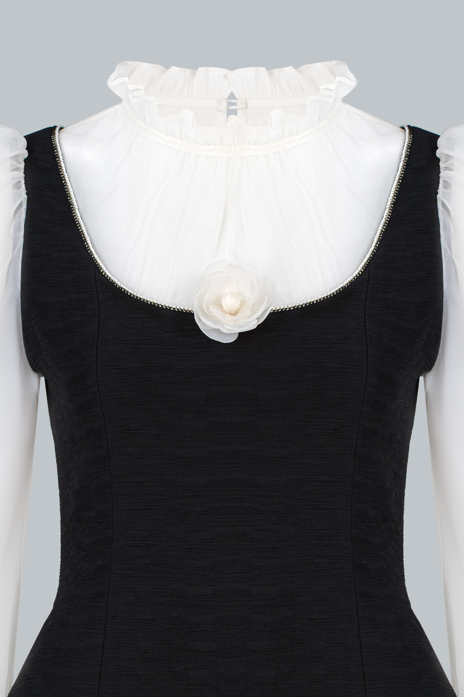 Lớp áo trong sử dụng chất liệu tơ mỏng màu kem, tạo độ trong nhẹ và cảm giác yêu kiều. Cổ bèo mềm ôm nhẹ quanh viền cổ giúp gương mặt sáng và thanh thoát hơn. Tay phồng nhẹ cùng phần bo cổ tay tạo hiệu ứng tiểu thư tinh tế, nhưng không hề kiểu cách.