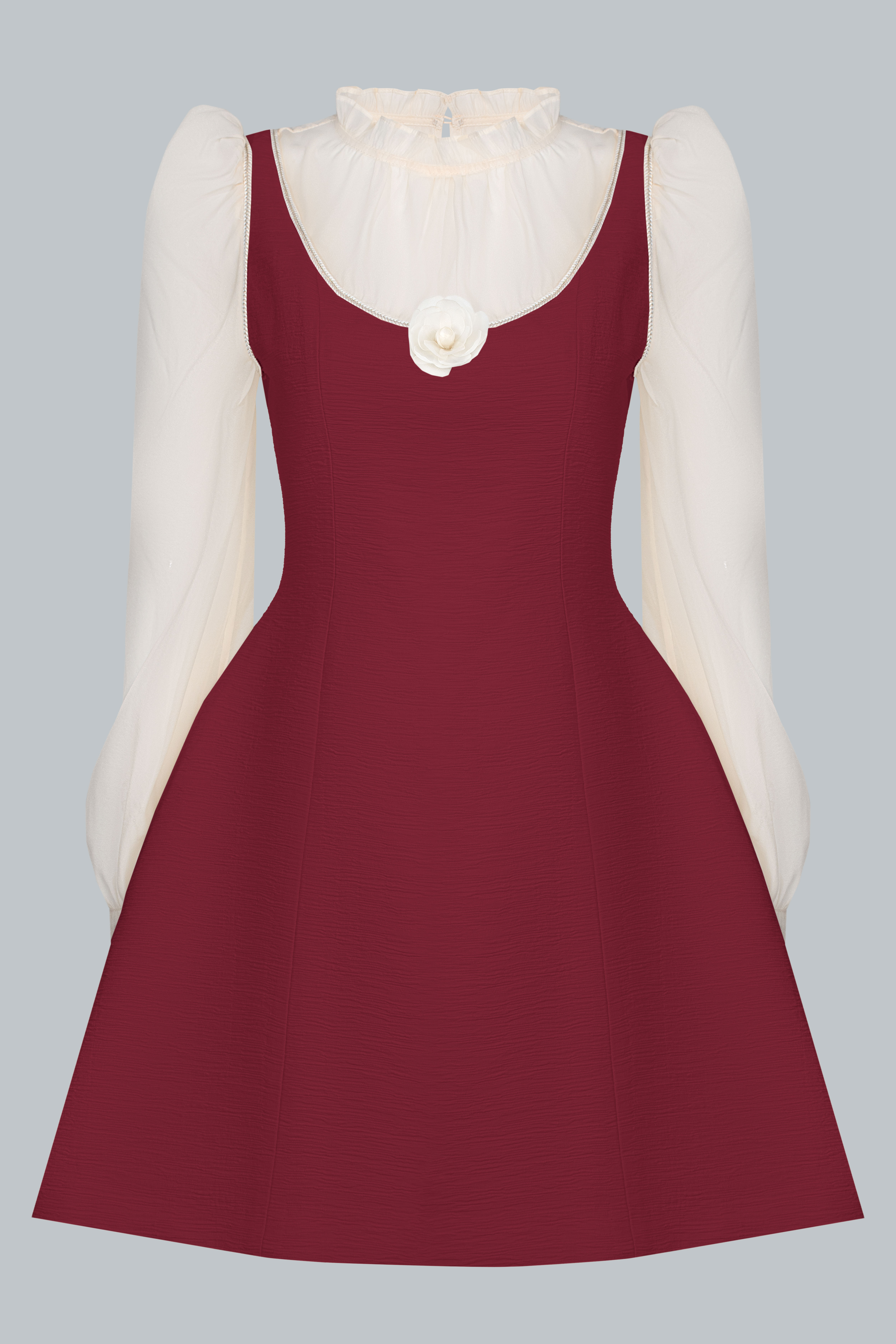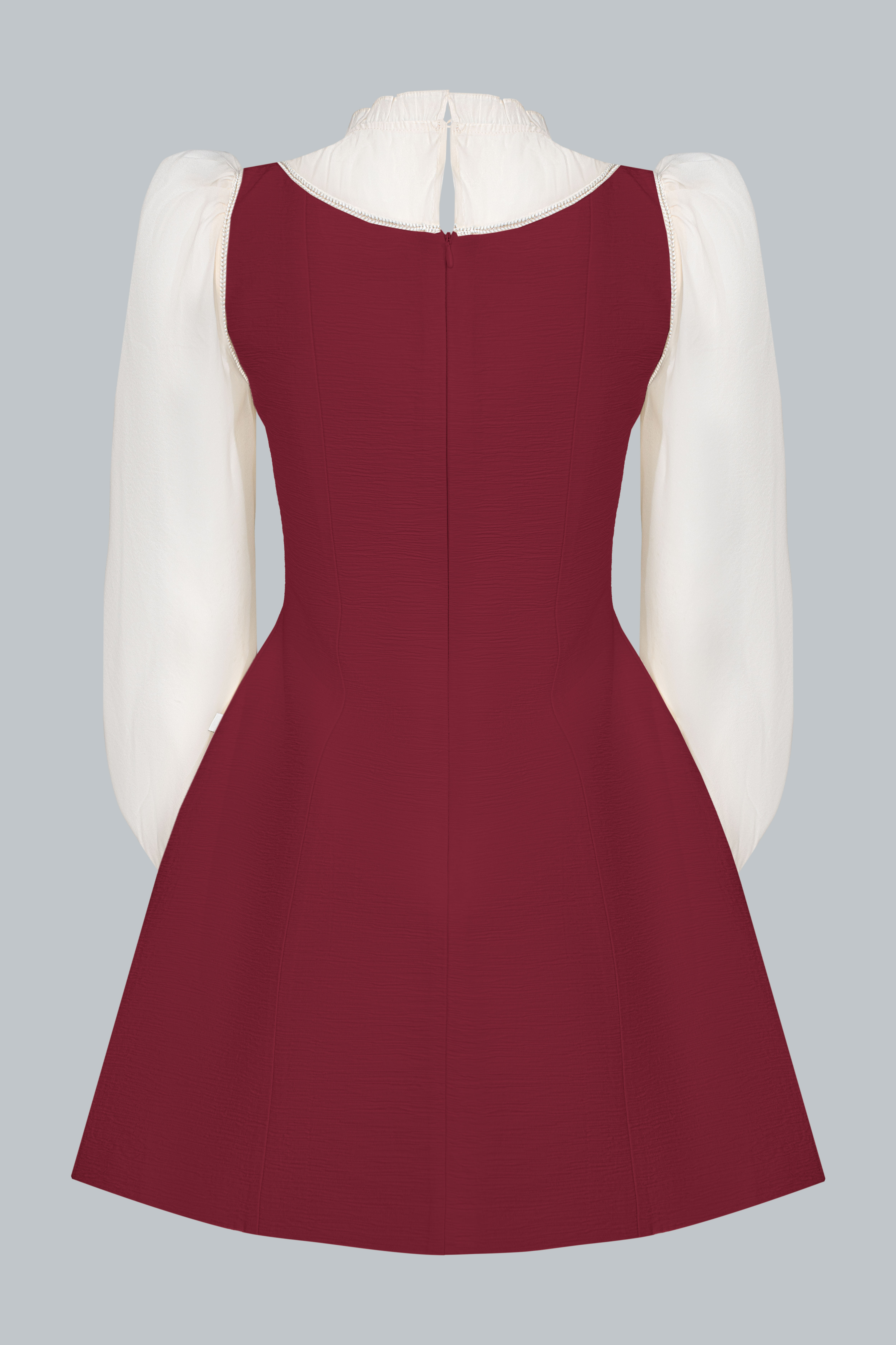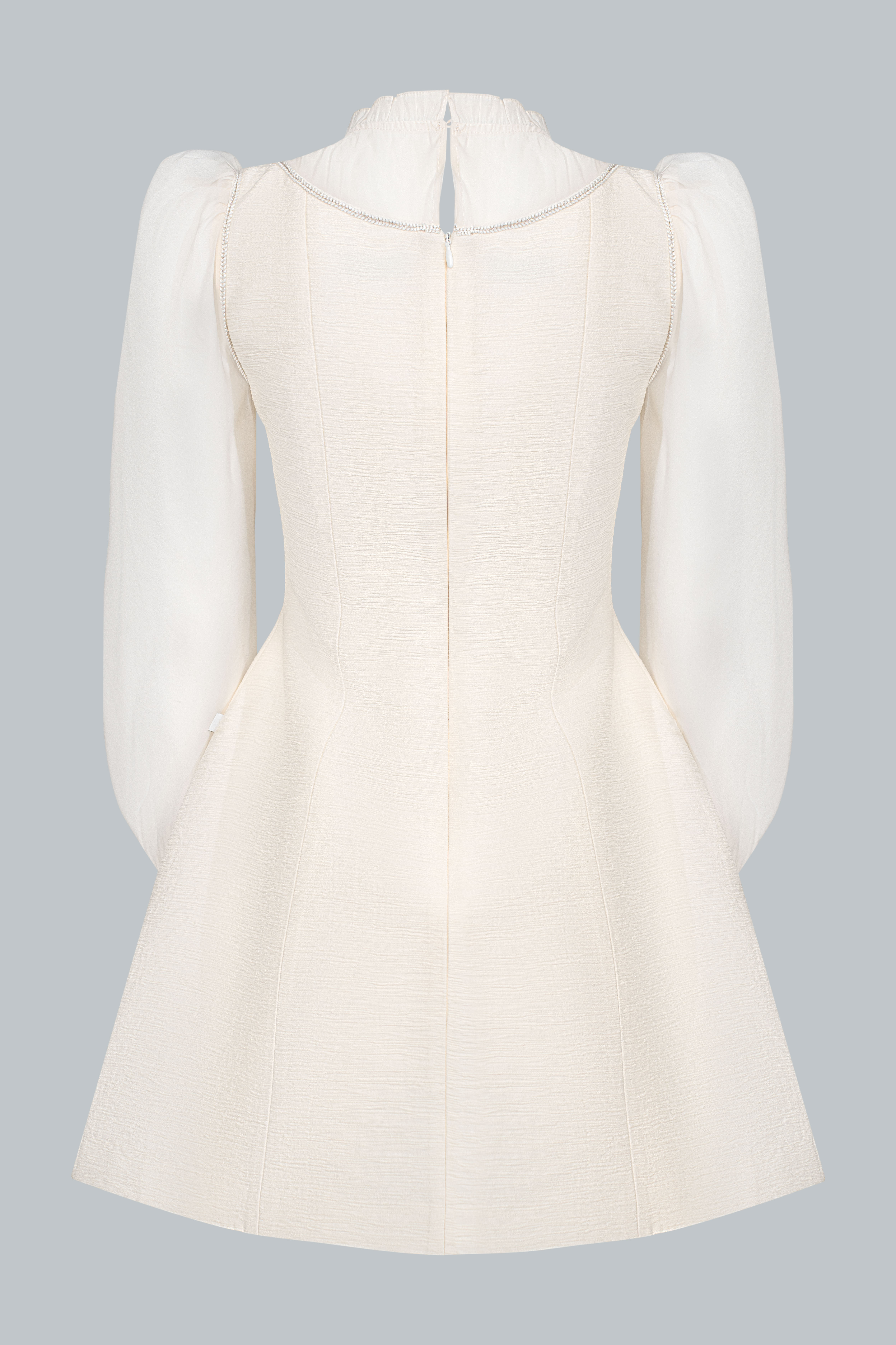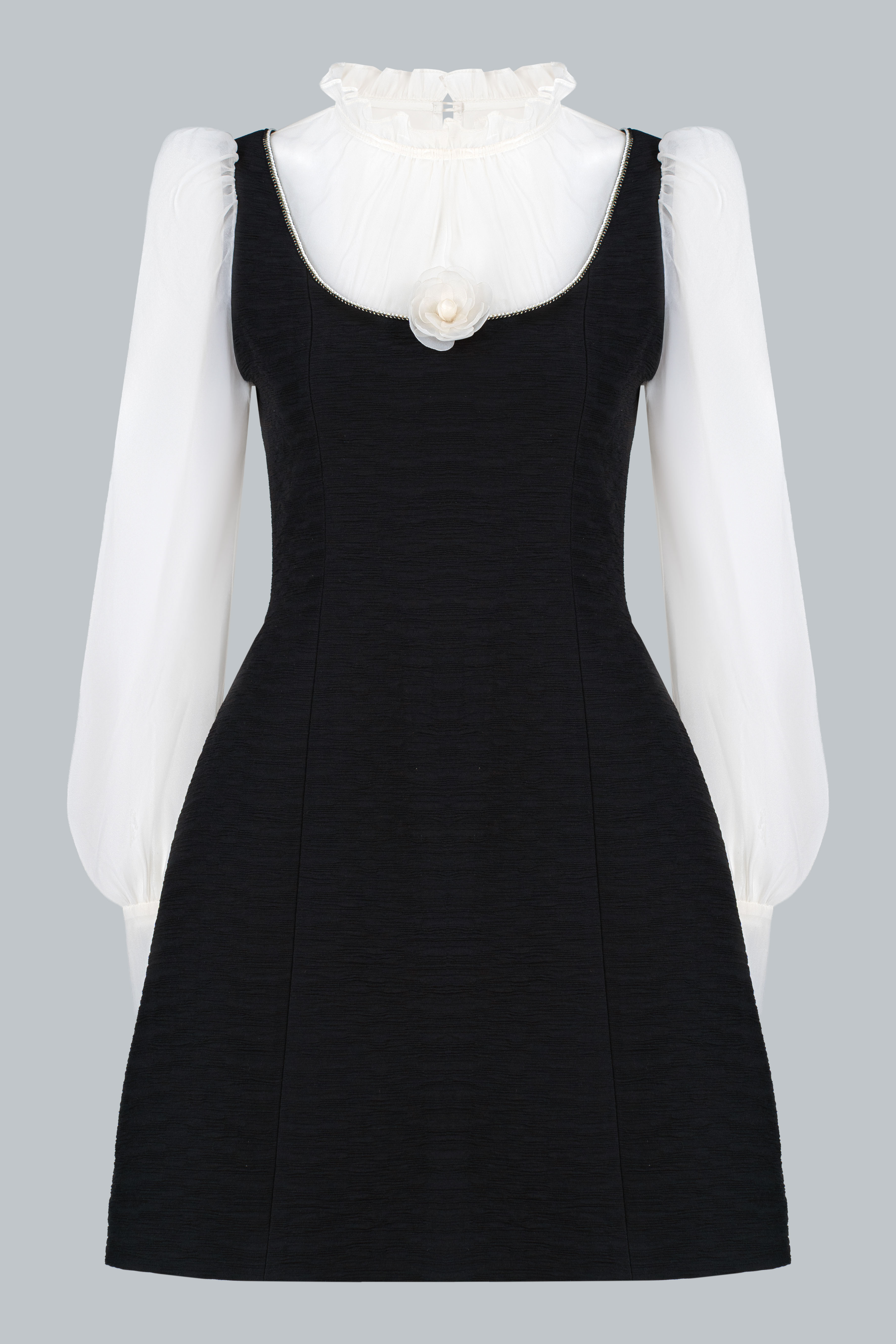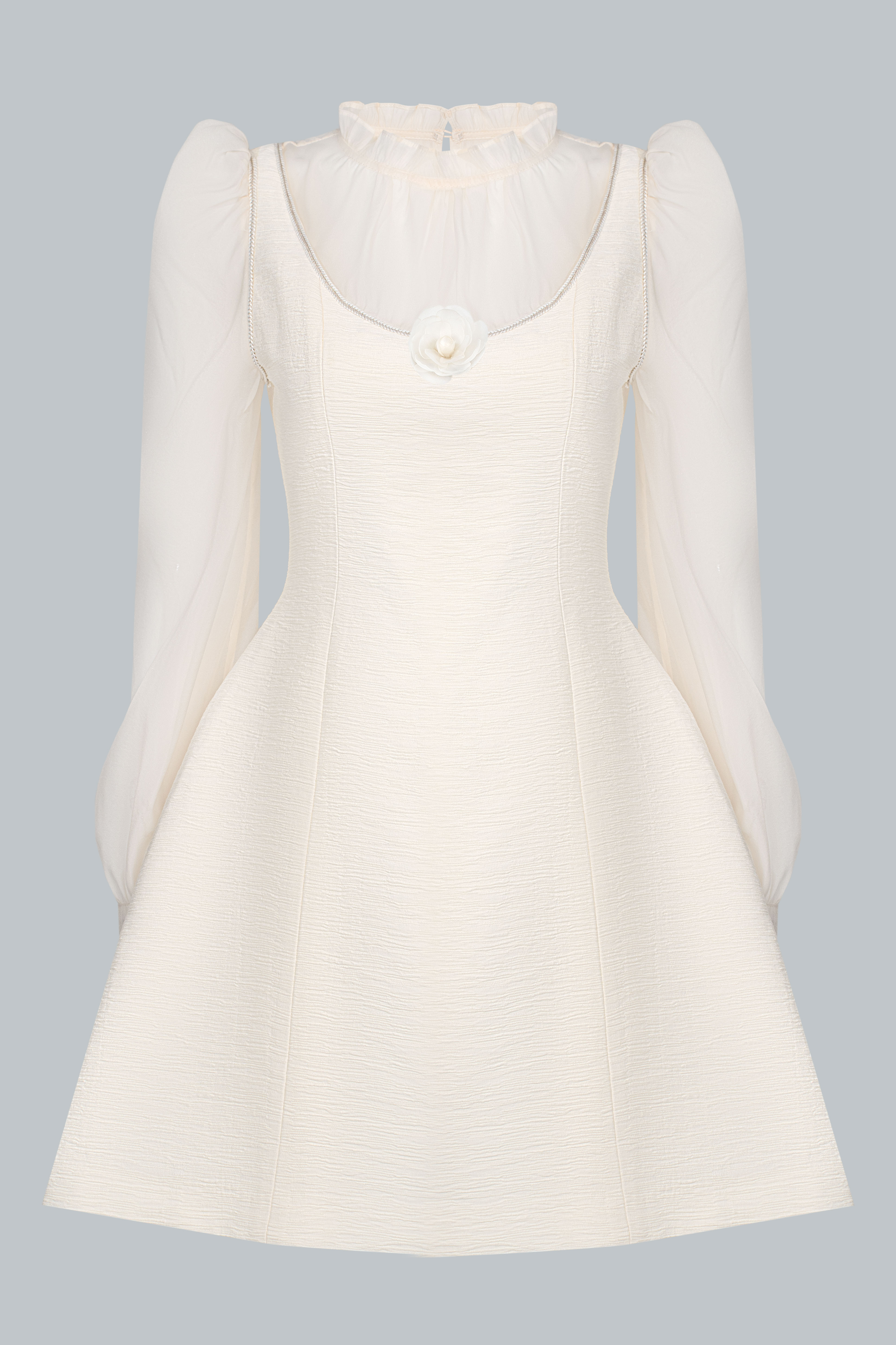 Lớp áo trong sử dụng chất liệu tơ mỏng màu kem, tạo độ trong nhẹ và cảm giác yêu kiều. Cổ bèo mềm ôm nhẹ quanh viền cổ giúp gương mặt sáng và thanh thoát hơn. Tay phồng nhẹ cùng phần bo cổ tay tạo hiệu ứng tiểu thư tinh tế, nhưng không hề kiểu cách.