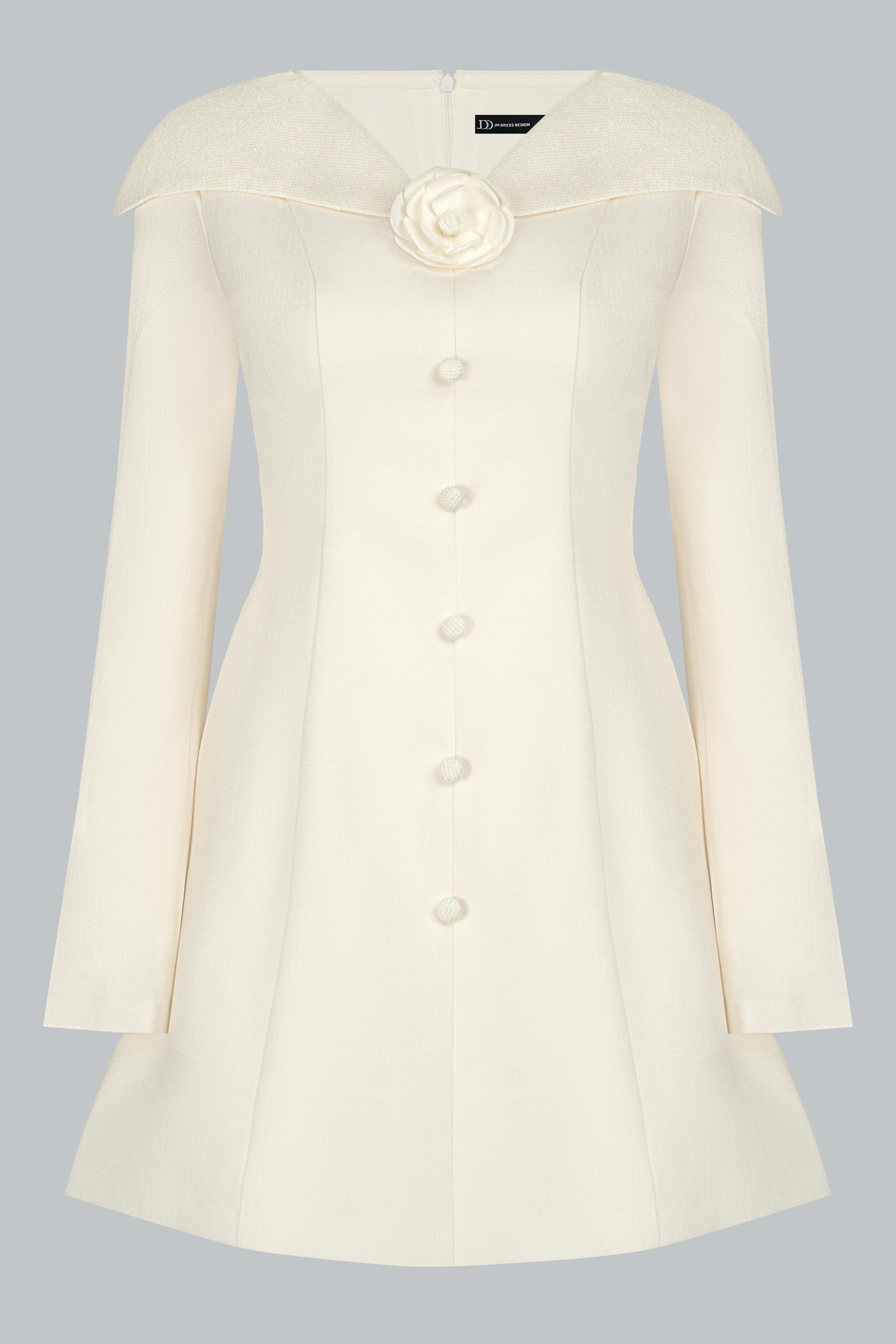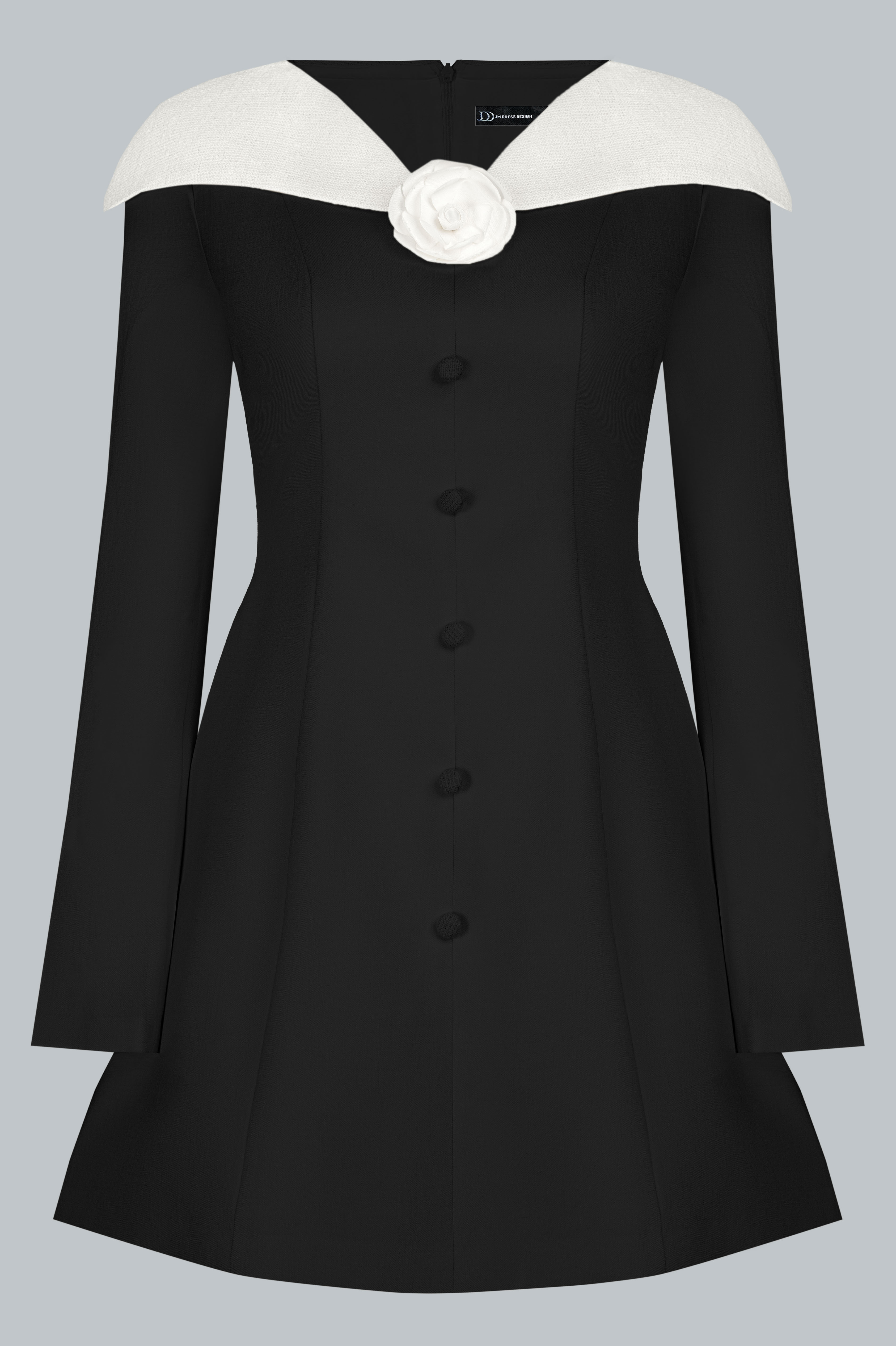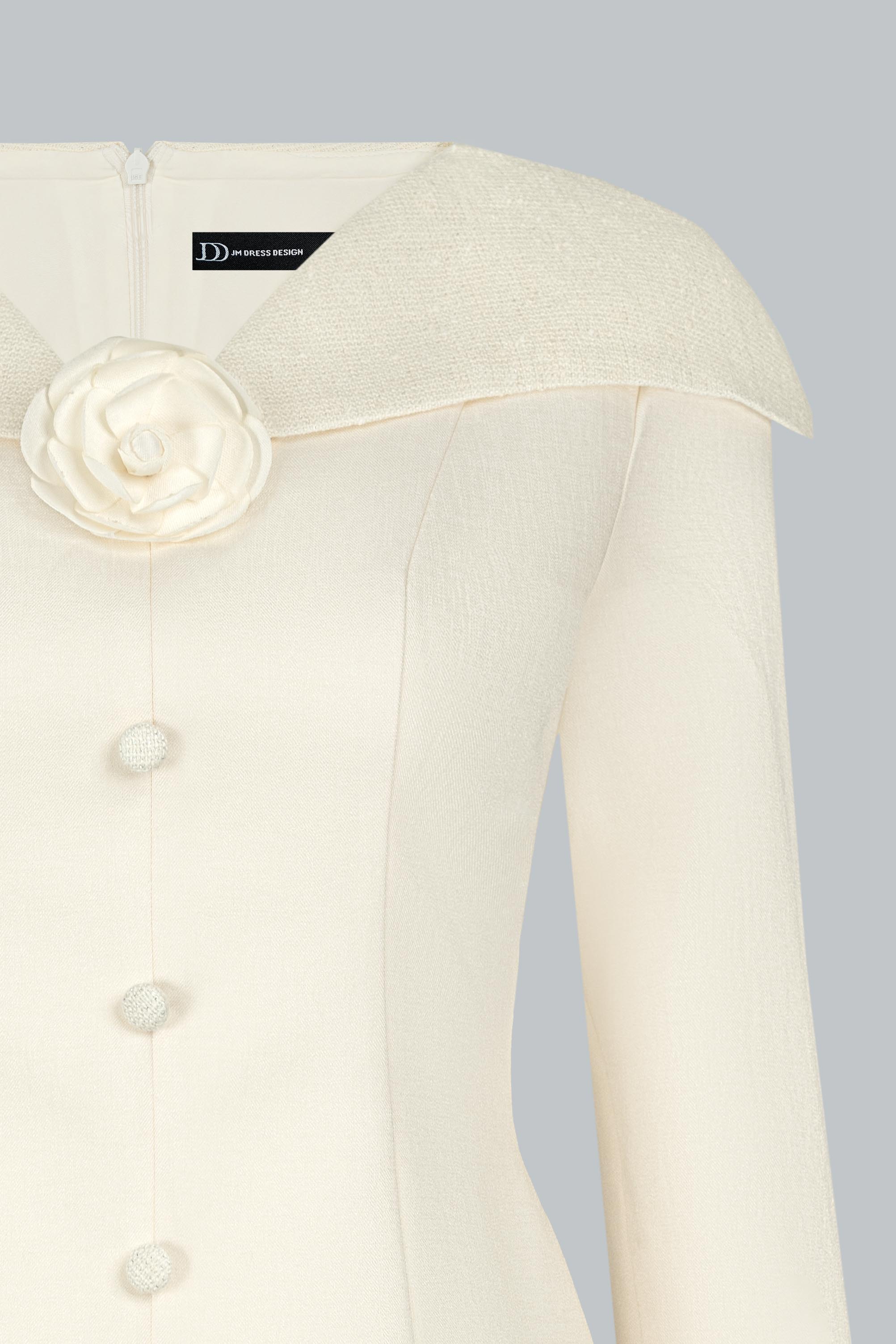 Điểm nhấn nổi bật của thiết kế là cổ áo bản rộng cách điệu, gợi nên dáng dấp cổ điển mà vẫn hiện đại. Bông hoa 3D cài giữa ngực tạo điểm chạm dịu dàng, tôn thêm sự nữ tính. Hàng khuy bọc chạy dọc thân váy vừa tinh tế vừa cân đối, mang lại cảm giác chỉnh chu. Dáng váy A-line dài tay, ôm vừa vặn phần thân trên và rủ nhẹ xuống, khéo léo làm nổi bật vóc dáng.