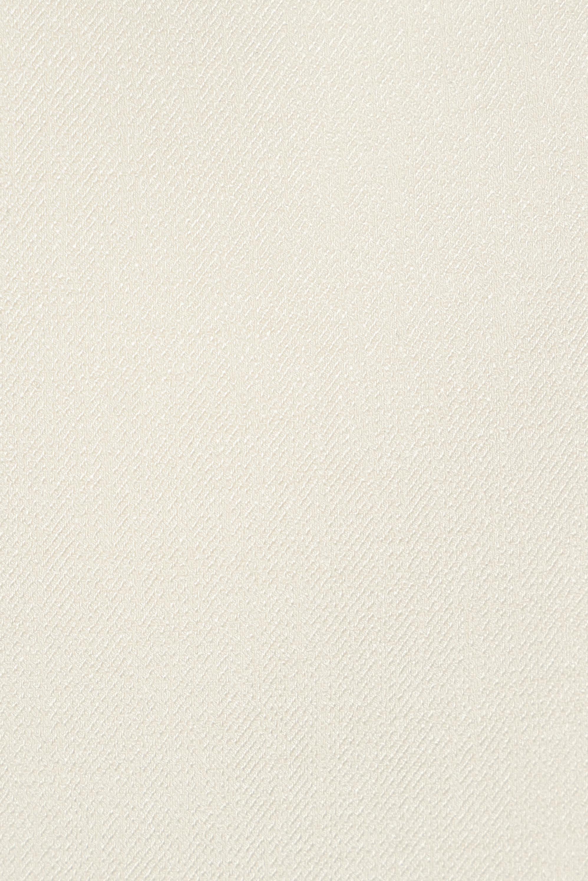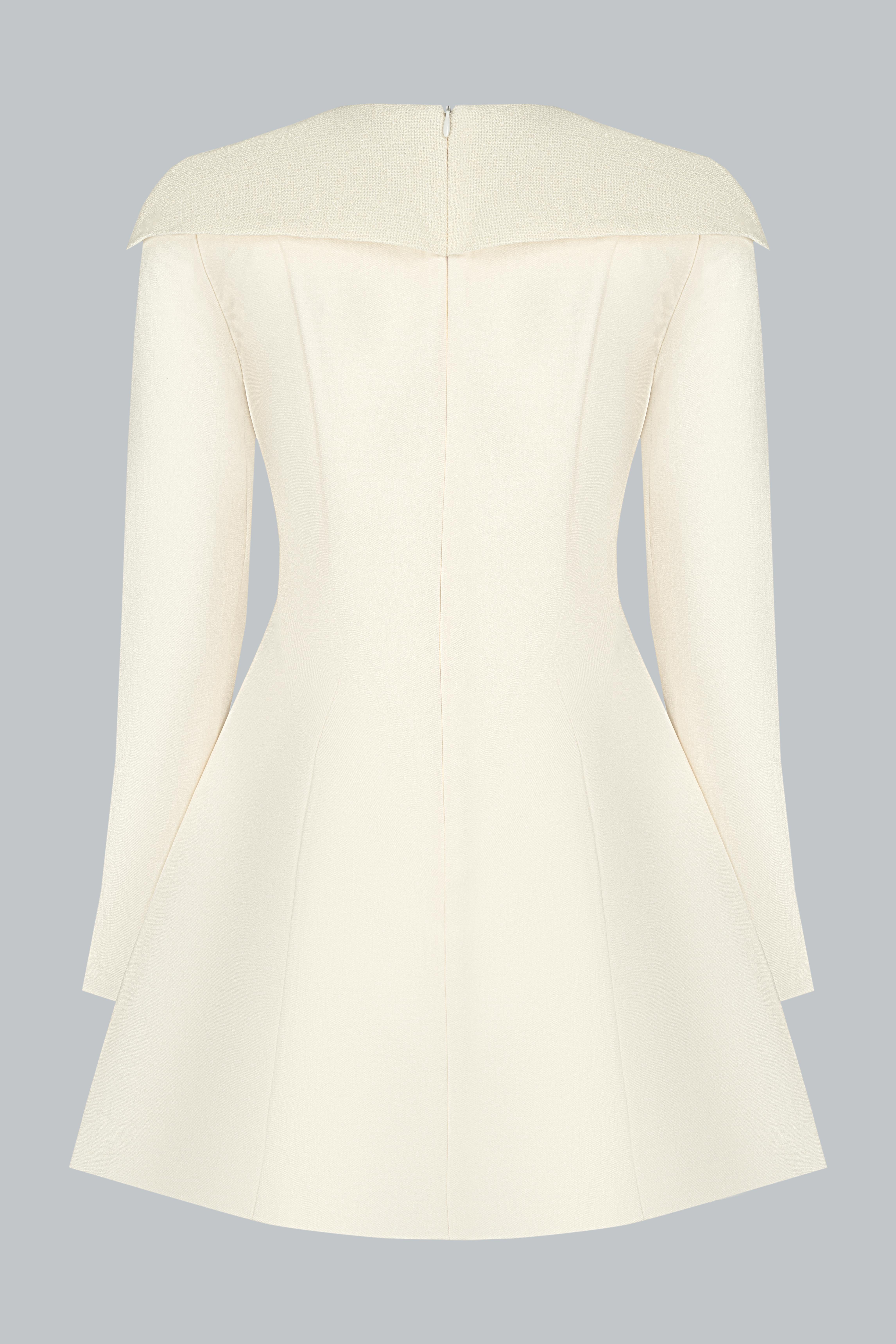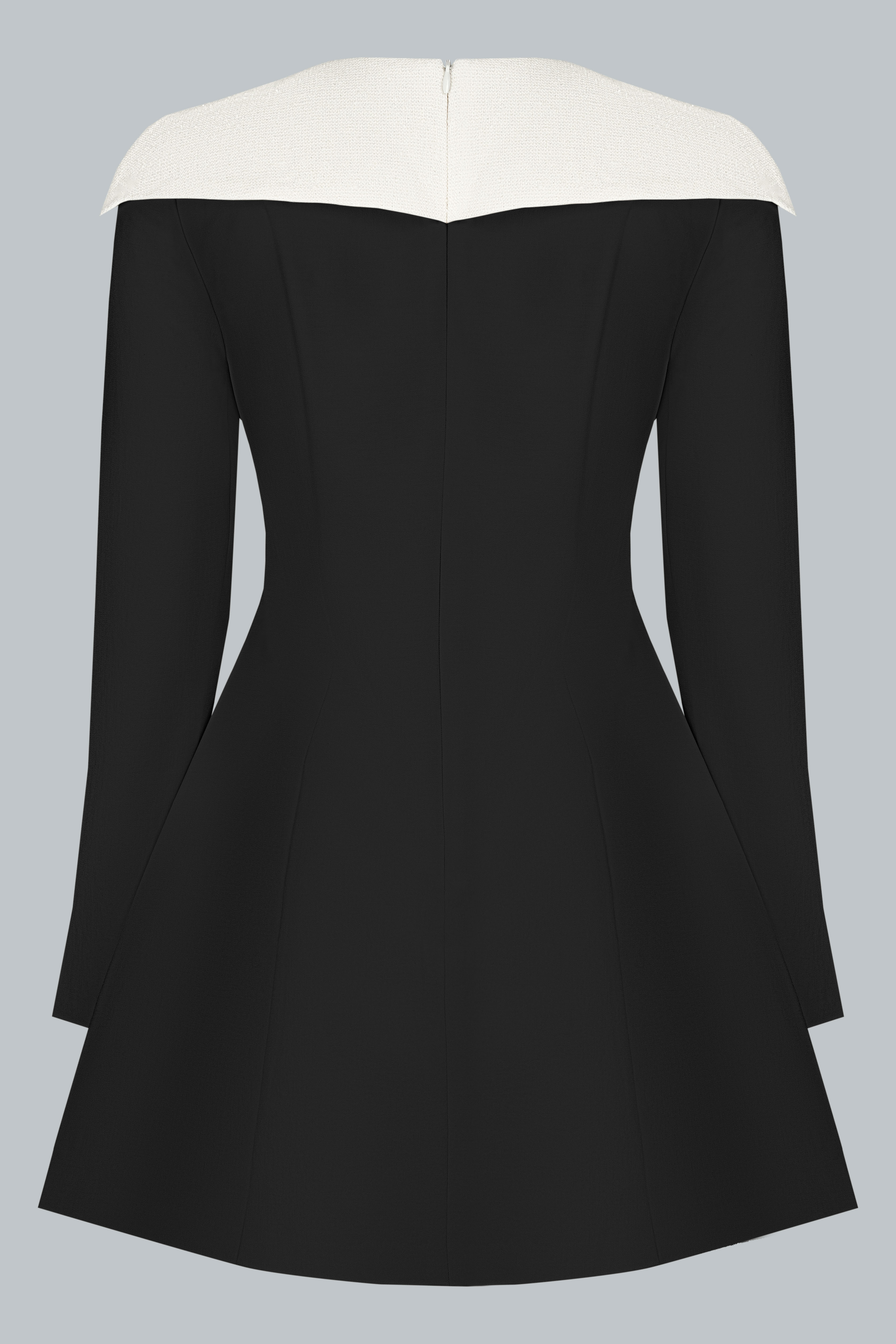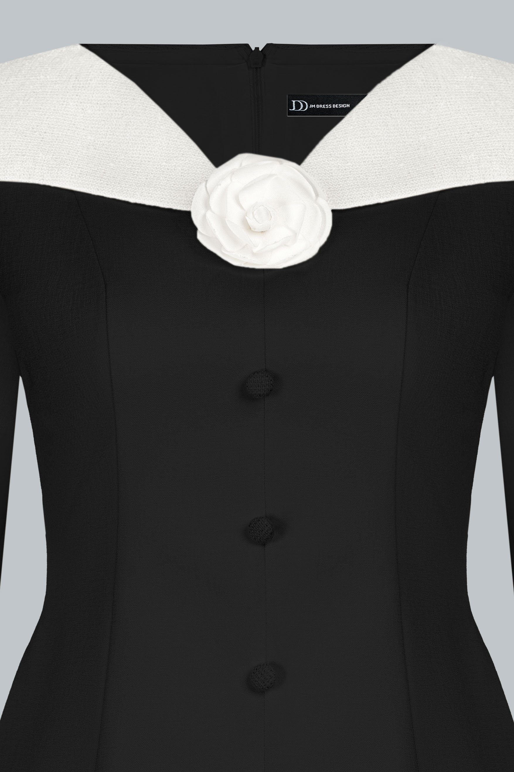 Điểm nhấn nổi bật của thiết kế là cổ áo bản rộng cách điệu, gợi nên dáng dấp cổ điển mà vẫn hiện đại. Bông hoa 3D cài giữa ngực tạo điểm chạm dịu dàng, tôn thêm sự nữ tính. Hàng khuy bọc chạy dọc thân váy vừa tinh tế vừa cân đối, mang lại cảm giác chỉnh chu. Dáng váy A-line dài tay, ôm vừa vặn phần thân trên và rủ nhẹ xuống, khéo léo làm nổi bật vóc dáng.