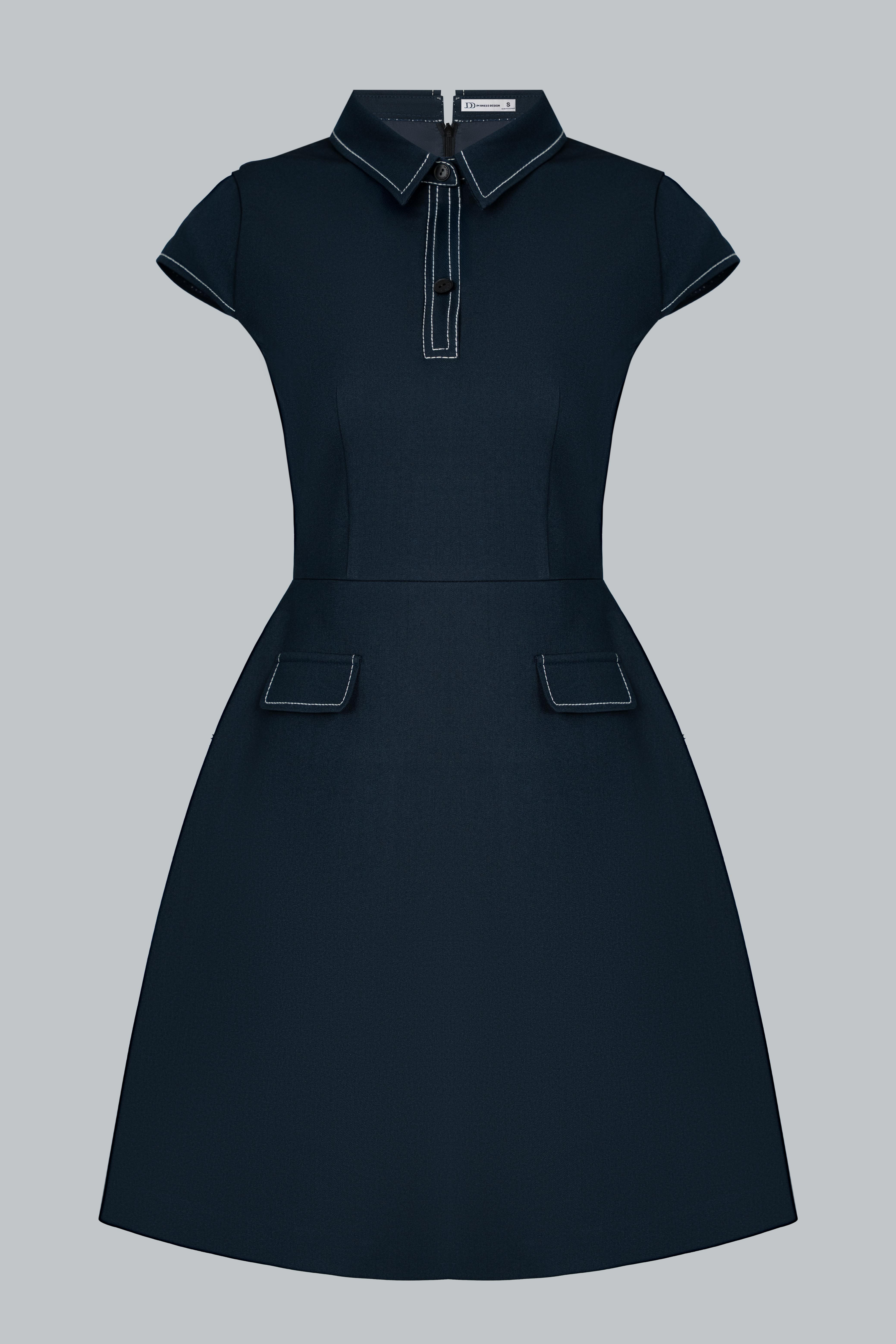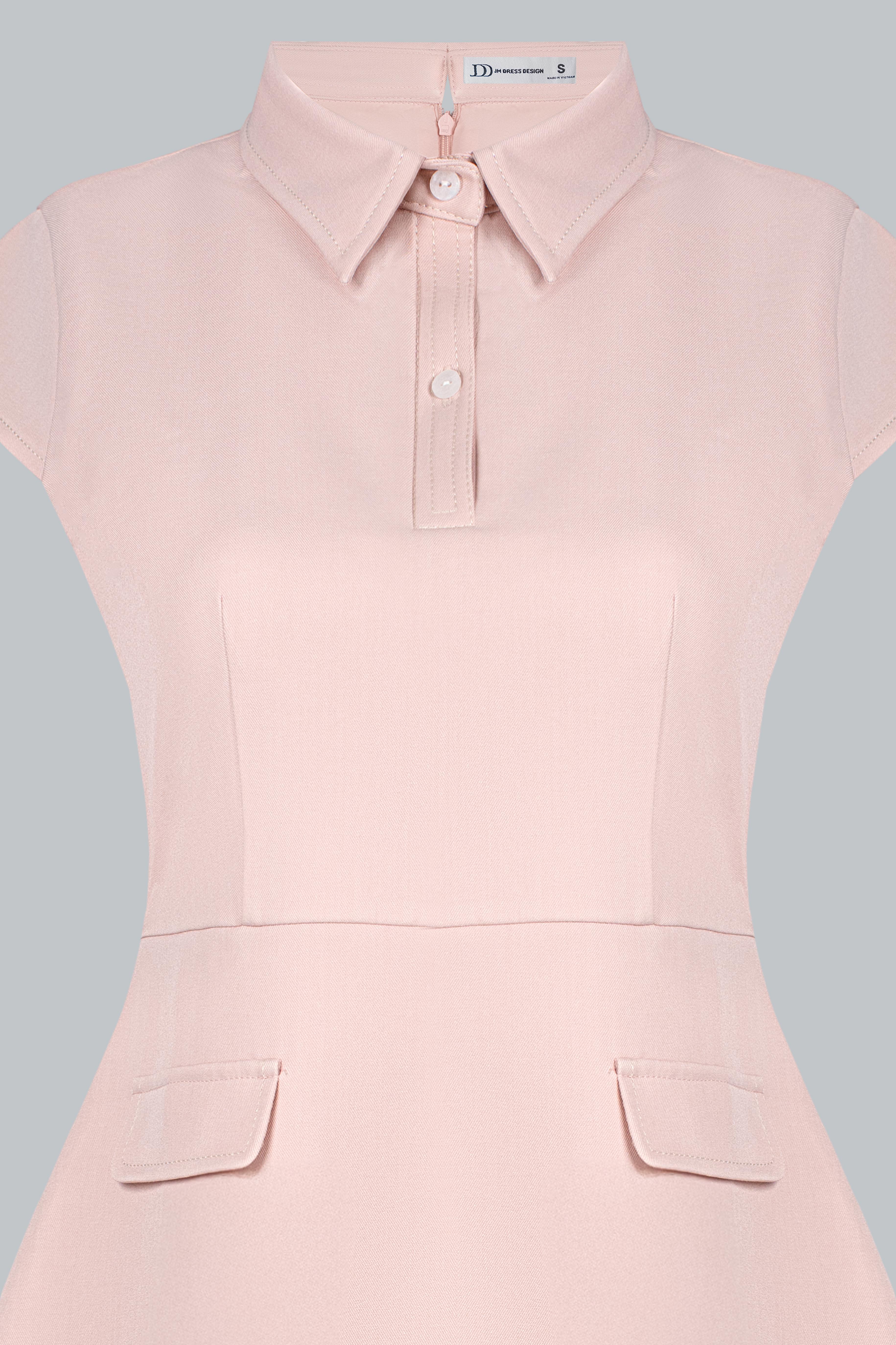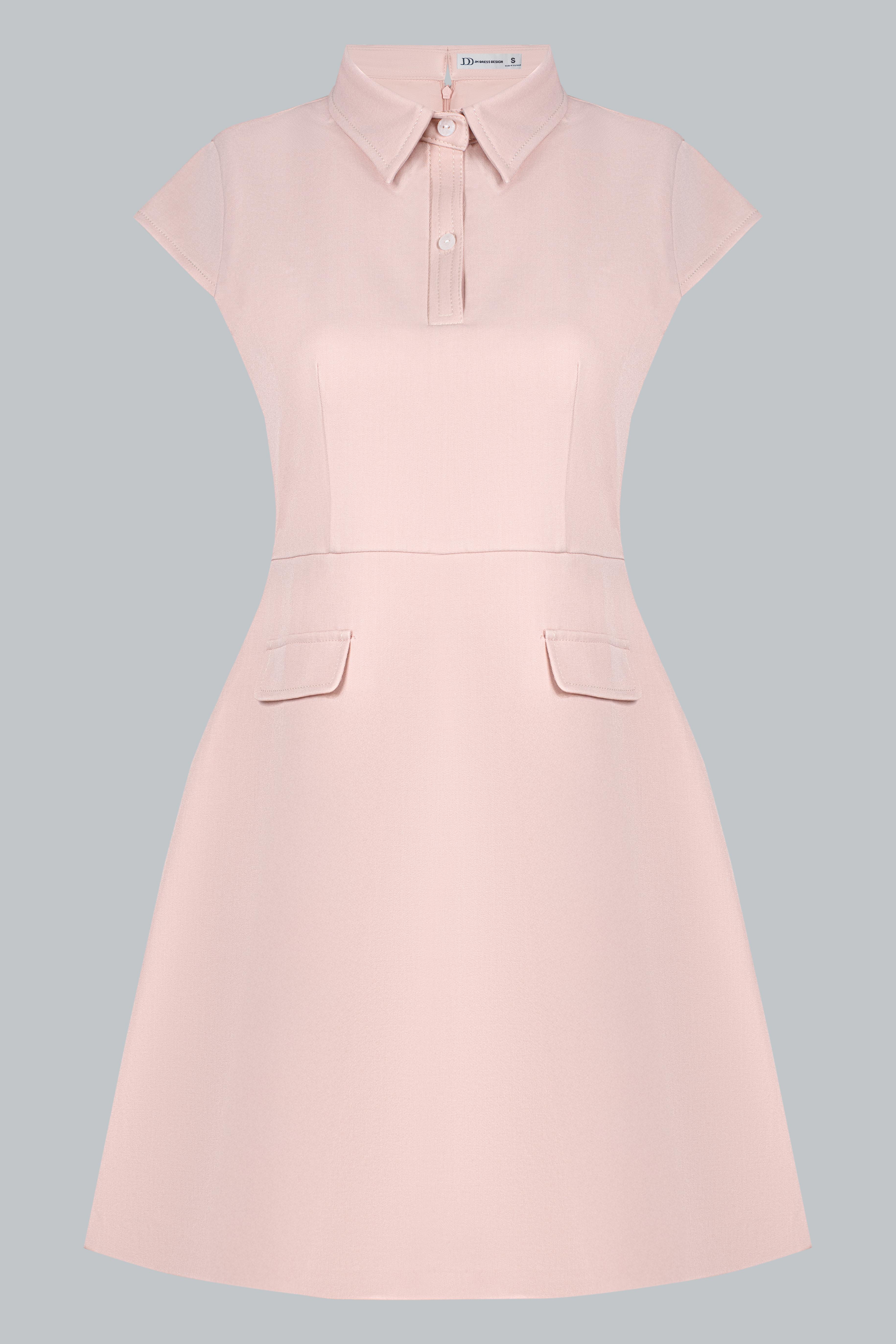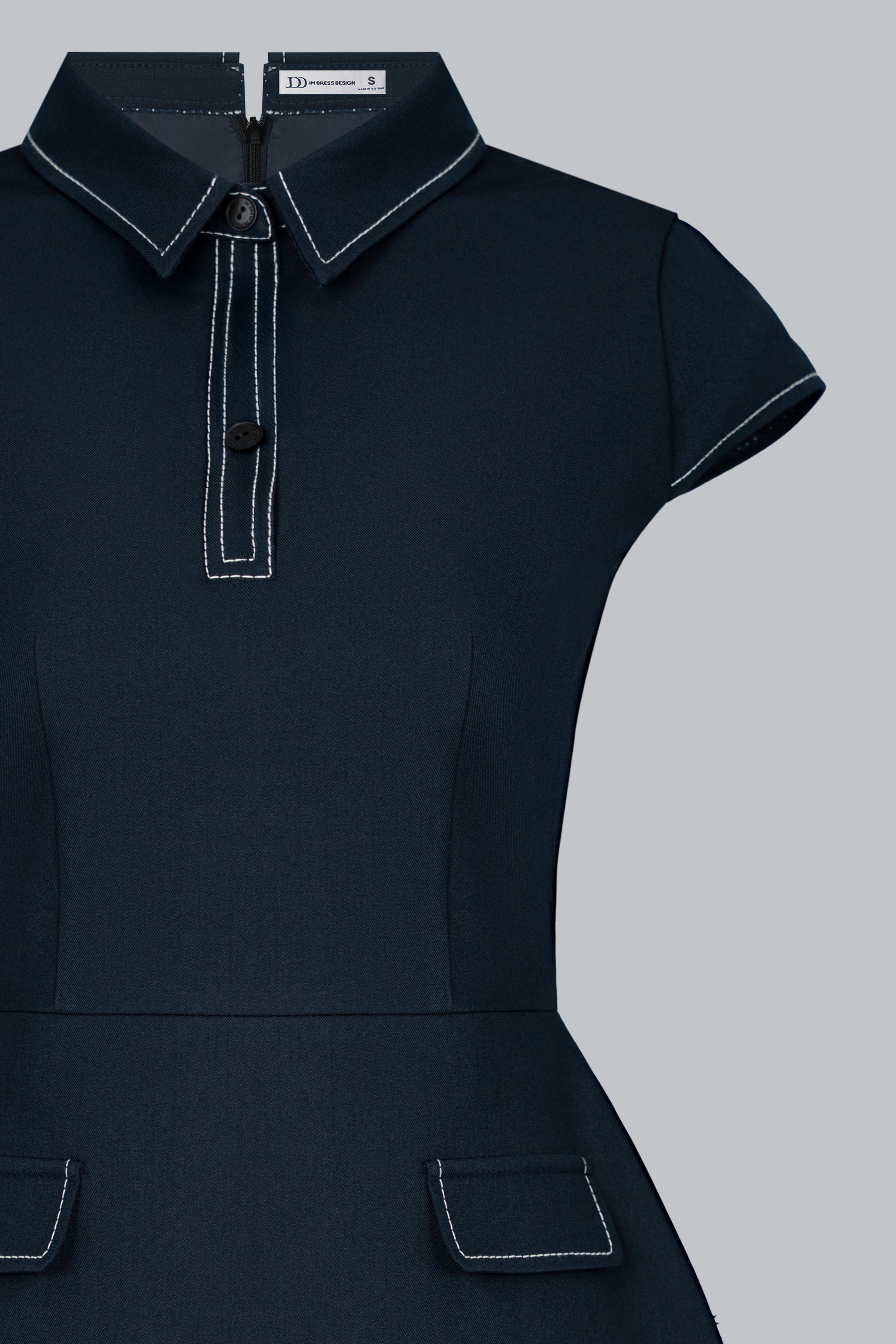 Đầm dáng A ngắn trên gối – tôn đôi chân và mang lại sự năng động. Cổ polo có đường viền chỉ trắng tạo điểm nhấn nổi bật và gợi cảm hứng từ phong cách preppy thanh lịch. Tay con (cap sleeves) vừa đủ gọn gàng, tôn vai mà vẫn kín đáo. Hai chi tiết túi nắp giả ở hông được đặt khéo léo – tạo độ cân đối và điểm nhìn tinh tế. Thiết kế cổ kéo ngắn ẩn hoặc có thể là đường trang trí – thêm chút nhấn nhá thể thao hiện đại. Tổng thể vừa basic, vừa retro nhẹ, phù hợp nhiều phong cách và độ tuổi.