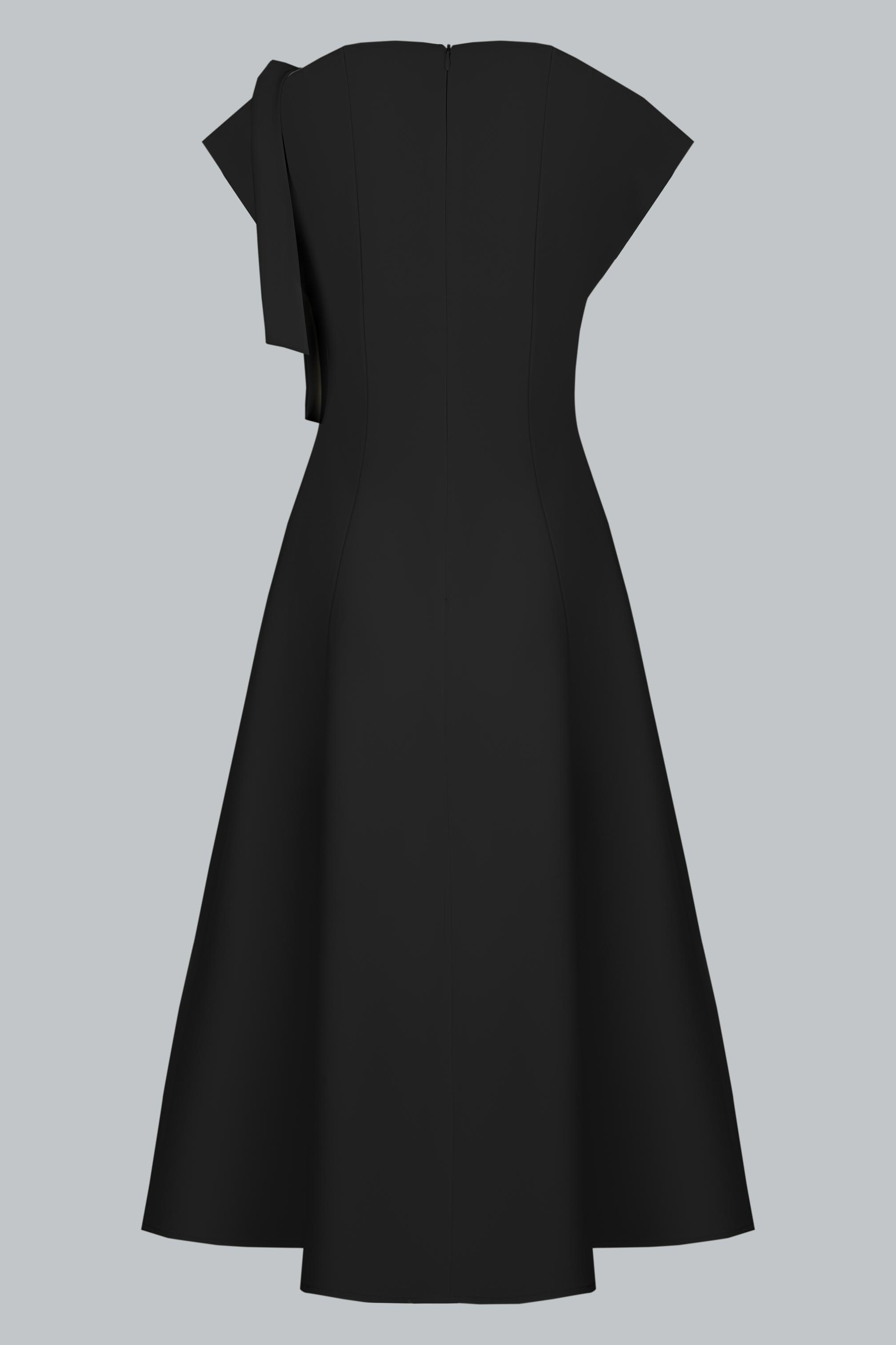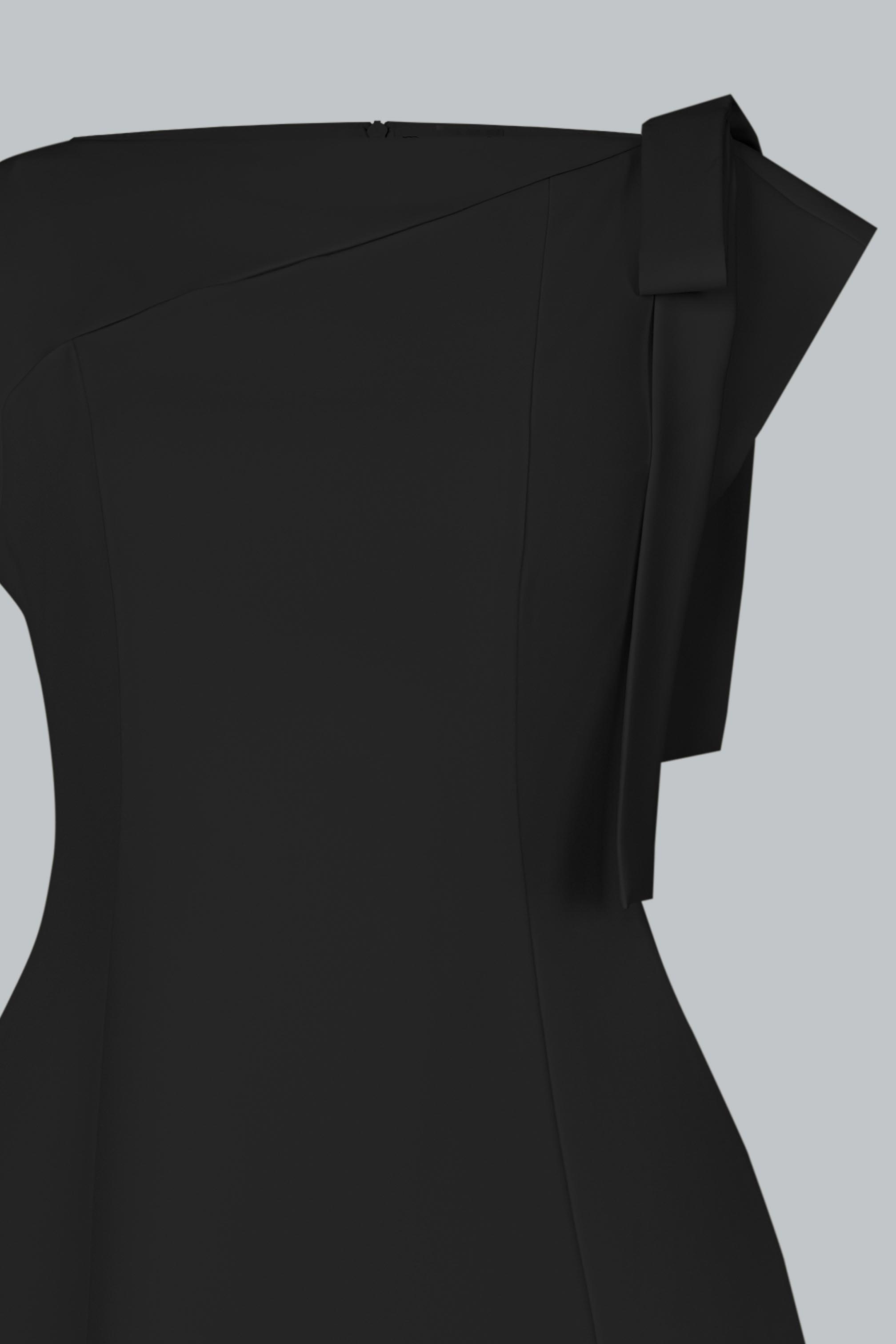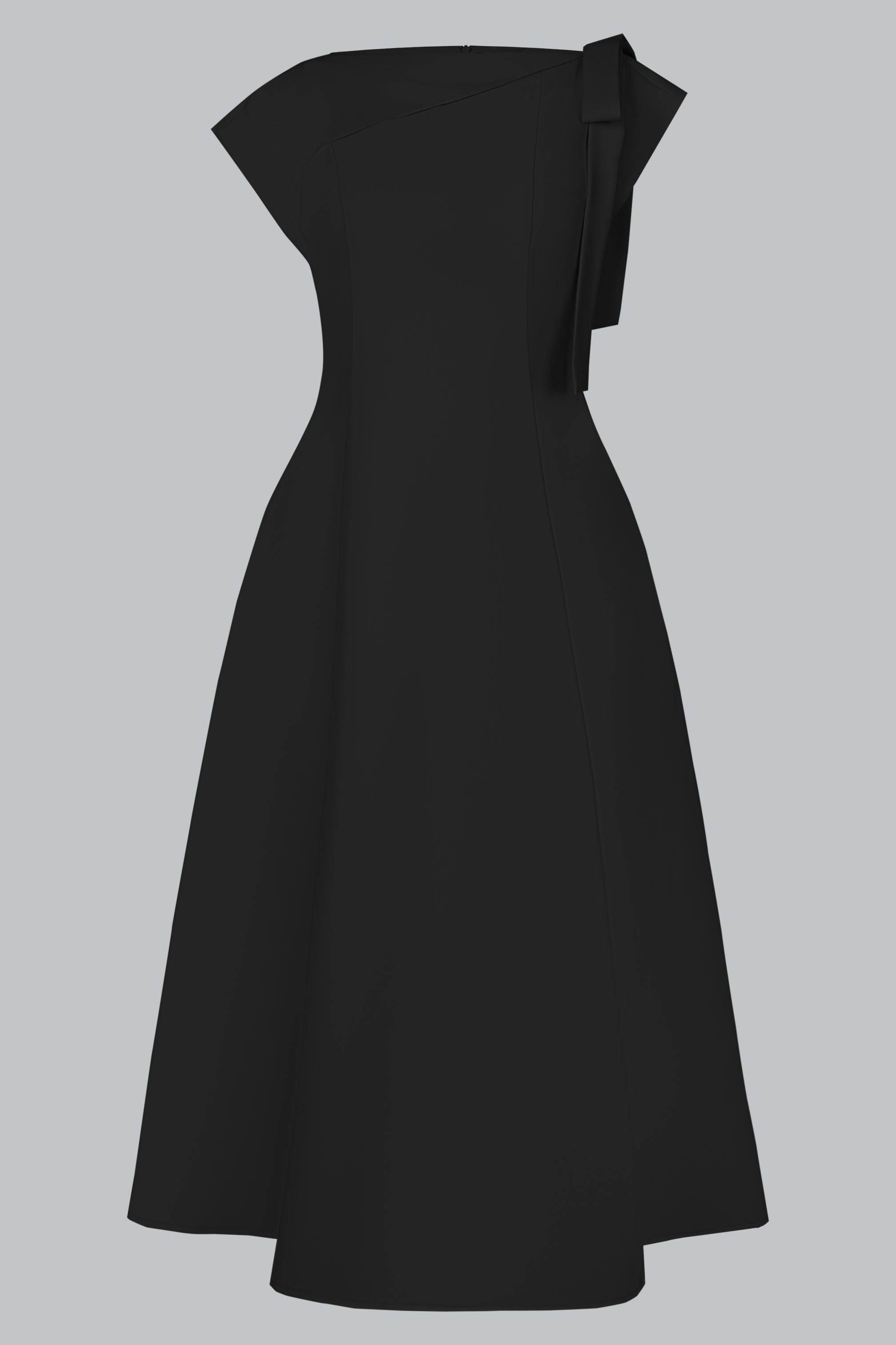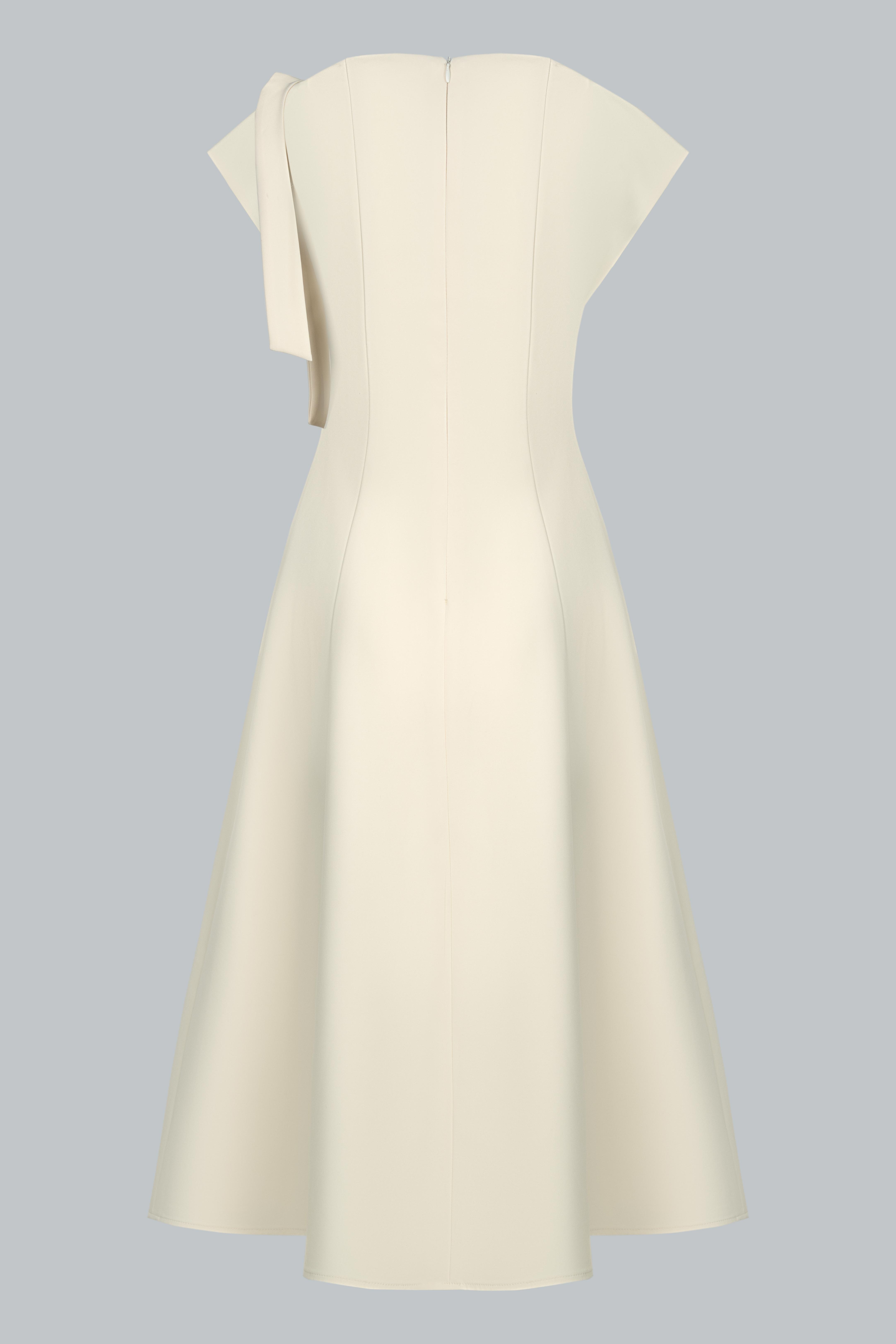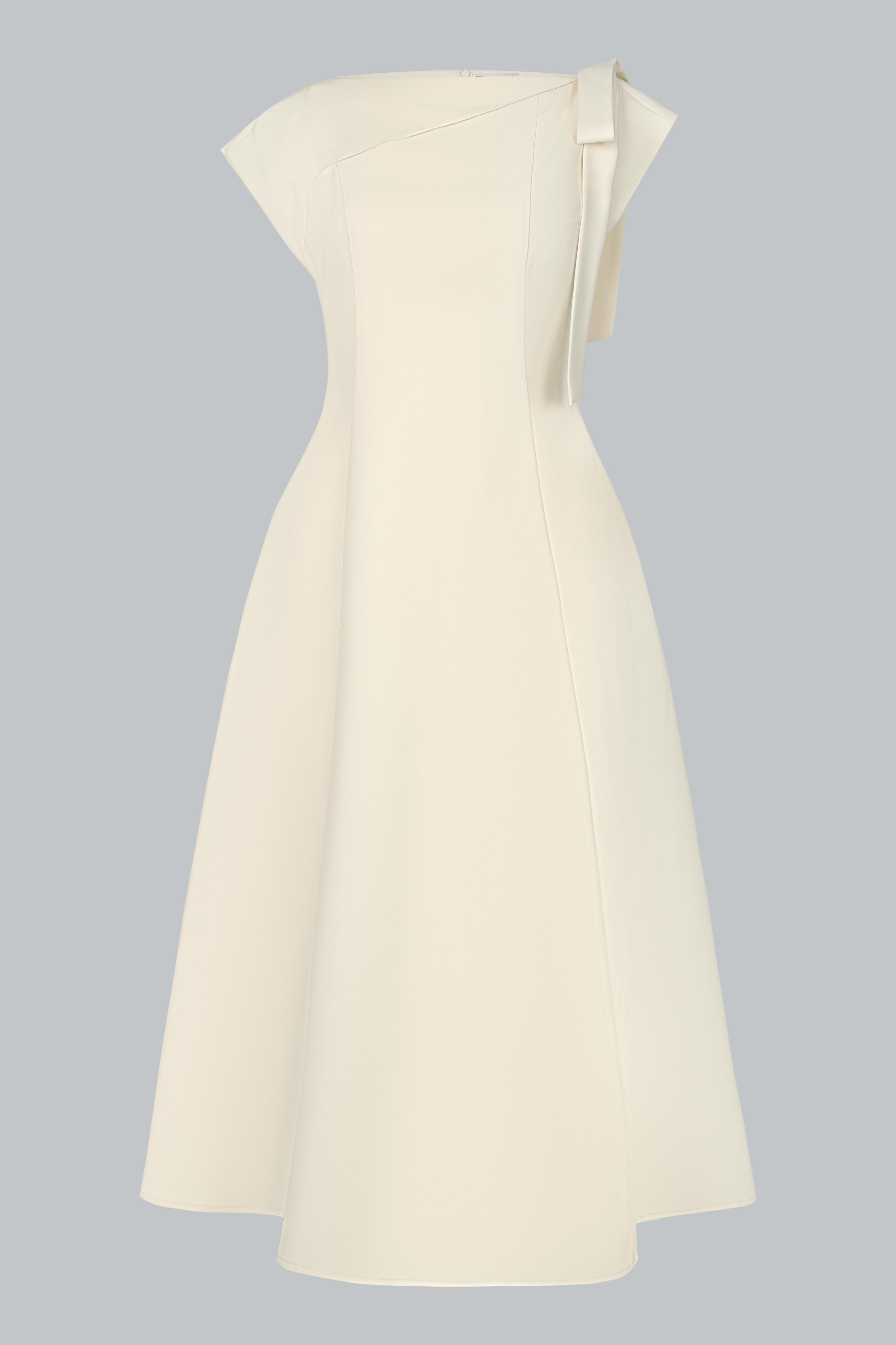 Đầm dáng A dài qua gối, ôm nhẹ phần thân trên và buông rũ mềm mại từ eo xuống – tạo nên tổng thể cân đối, nữ tính và thanh thoát. Thiết kế cổ lệch bất đối xứng, khoe khéo bờ vai mảnh, mang đến vẻ đẹp hiện đại mà không phá vỡ sự dịu dàng. Dải nơ vải bản to đính vai trái – như một điểm lặng mềm mại, giữ lại nét thơ giữa tổng thể tối giản. Thiết kế không tay nhưng vẫn đủ kín đáo nhờ cấu trúc cổ và chiều dài váy, tạo cảm giác thanh lịch, chuyên nghiệp mà vẫn phảng phất vẻ tiểu thư.