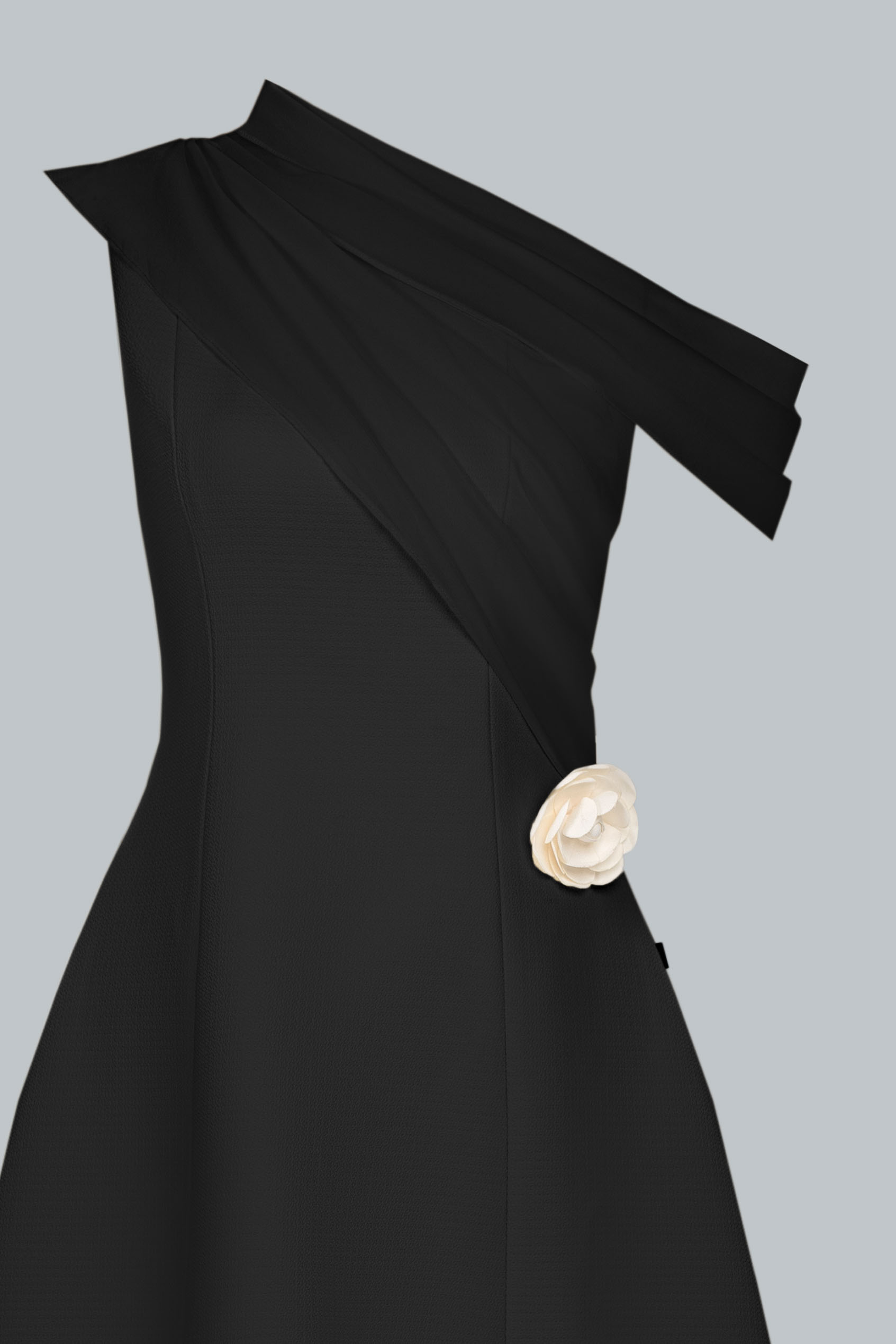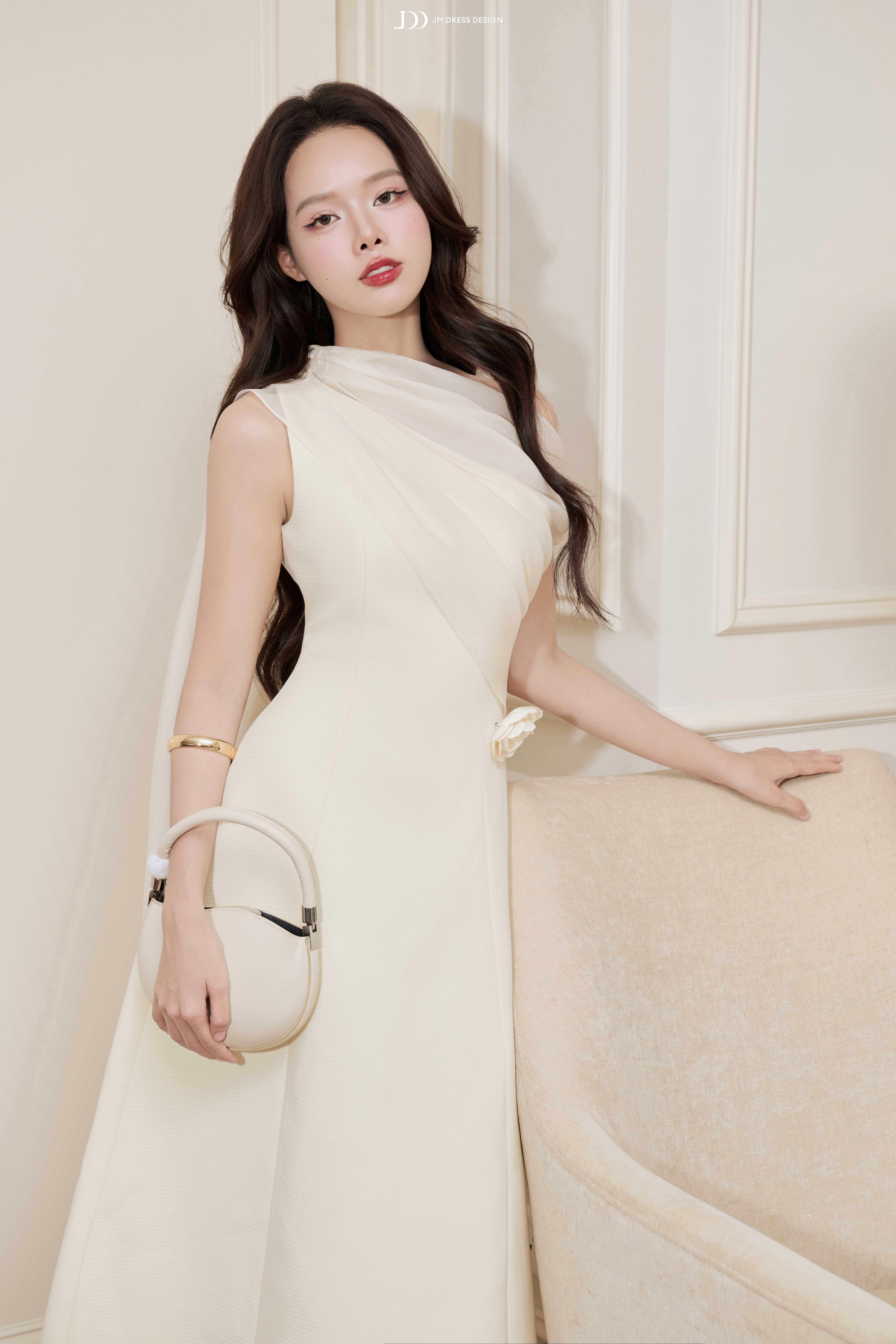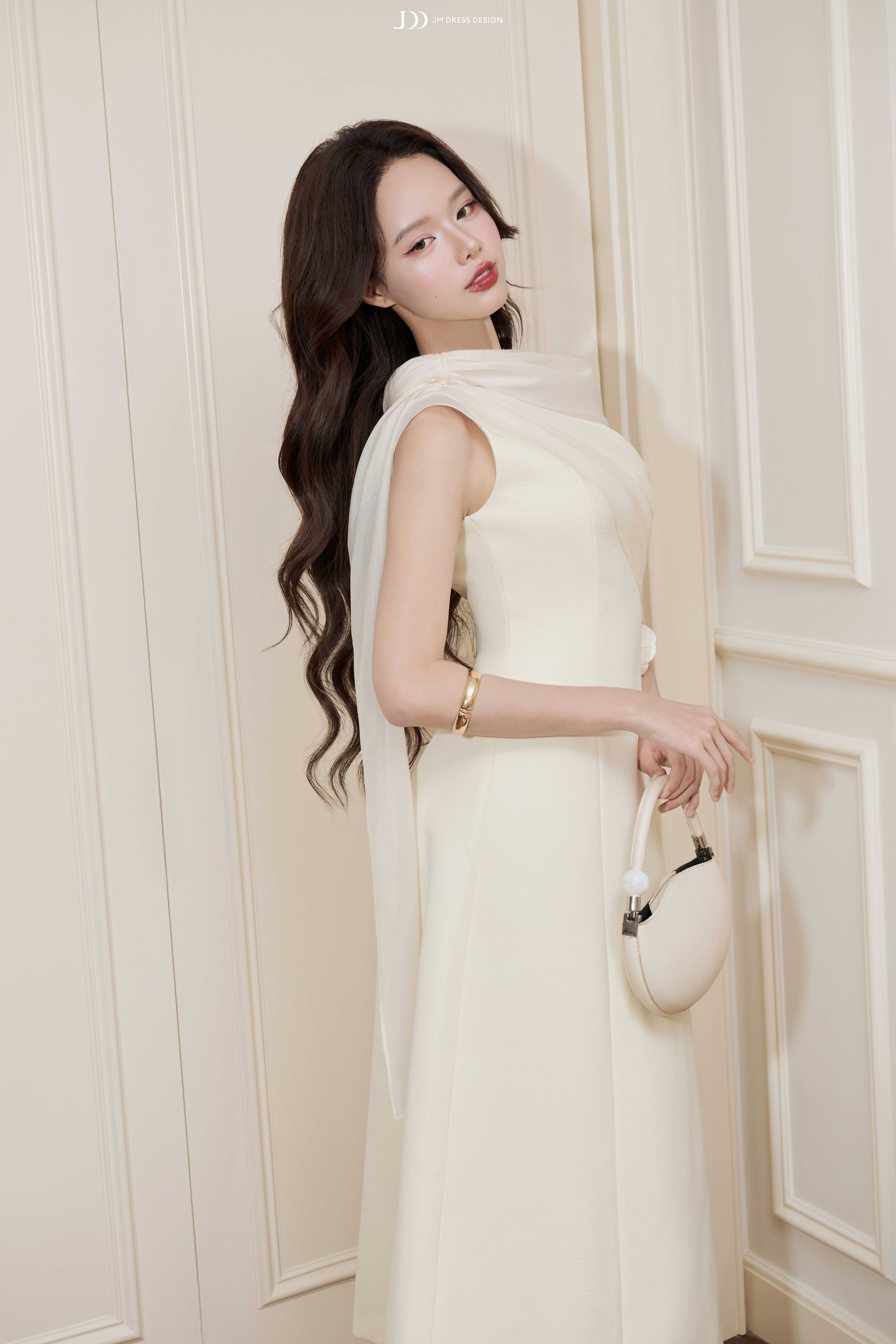 Điểm nhấn độc đáo của váy nằm ở phần cổ lệch bất đối xứng tạo nét kiêu hãnh thanh lịch. Lớp voan mỏng được quấn hờ quanh vai, mềm mại như làn khói, gợi cảm giác bồng bềnh mà không kém phần quyền lực. Hoa nhỏ được cài khéo léo tại eo tinh xảo, vừa định hình vòng hai, vừa tạo điểm nhấn lãng mạn. Dáng midi suông thẳng tôn vóc dáng, giữ được sự cân bằng giữa kín đáo và gợi cảm.
