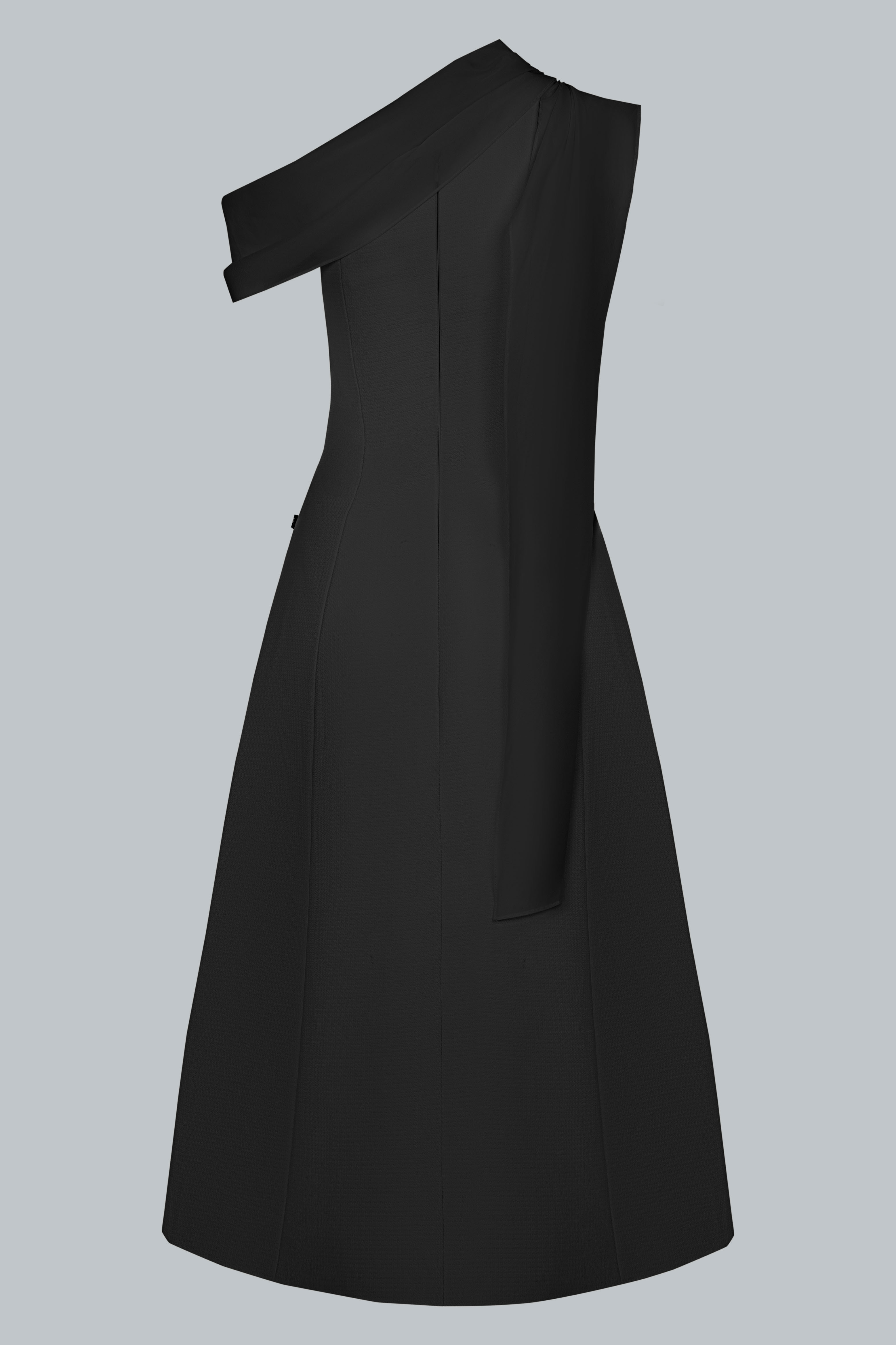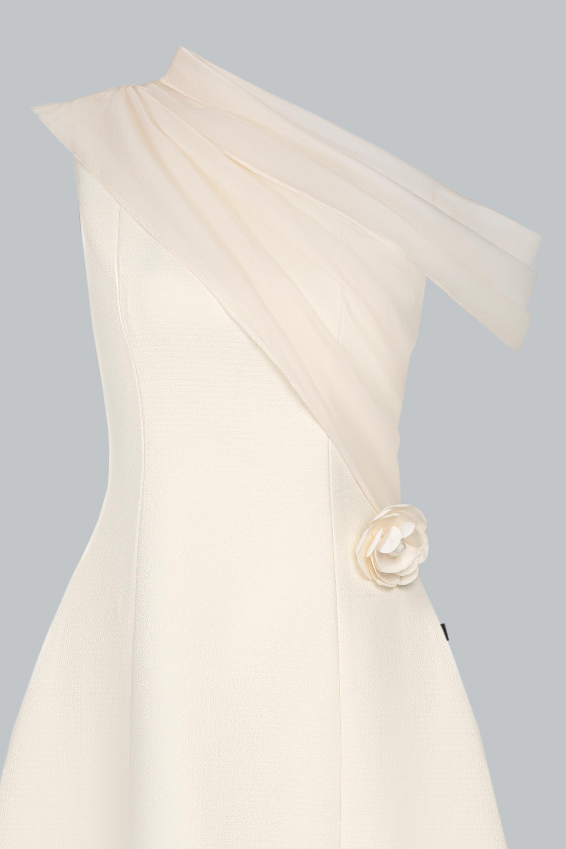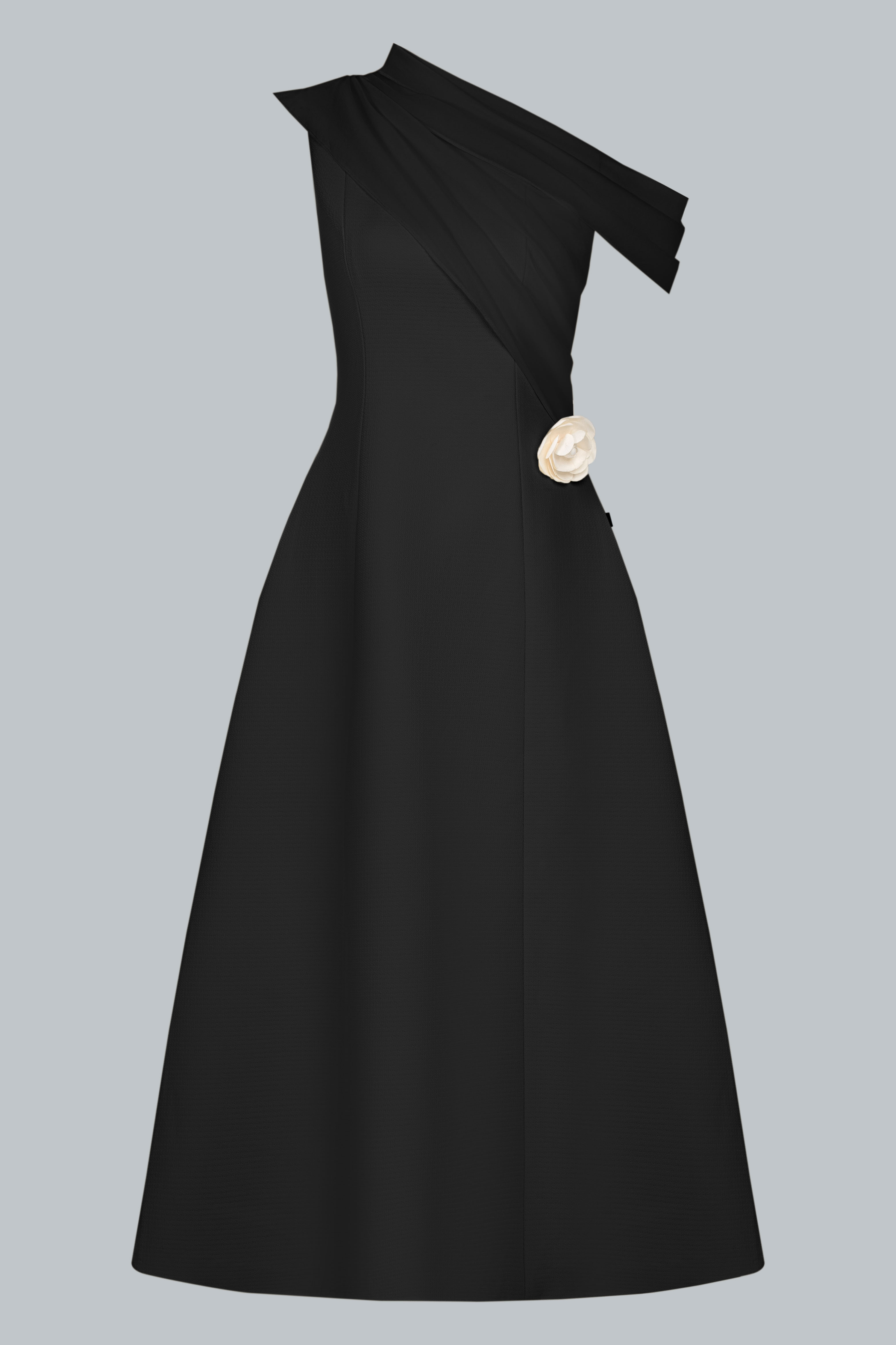 Điểm nhấn độc đáo của váy nằm ở phần cổ lệch bất đối xứng tạo nét kiêu hãnh thanh lịch. Lớp voan mỏng được quấn hờ quanh vai, mềm mại như làn khói, gợi cảm giác bồng bềnh mà không kém phần quyền lực. Hoa nhỏ được cài khéo léo tại eo tinh xảo, vừa định hình vòng hai, vừa tạo điểm nhấn lãng mạn. Dáng midi suông thẳng tôn vóc dáng, giữ được sự cân bằng giữa kín đáo và gợi cảm.