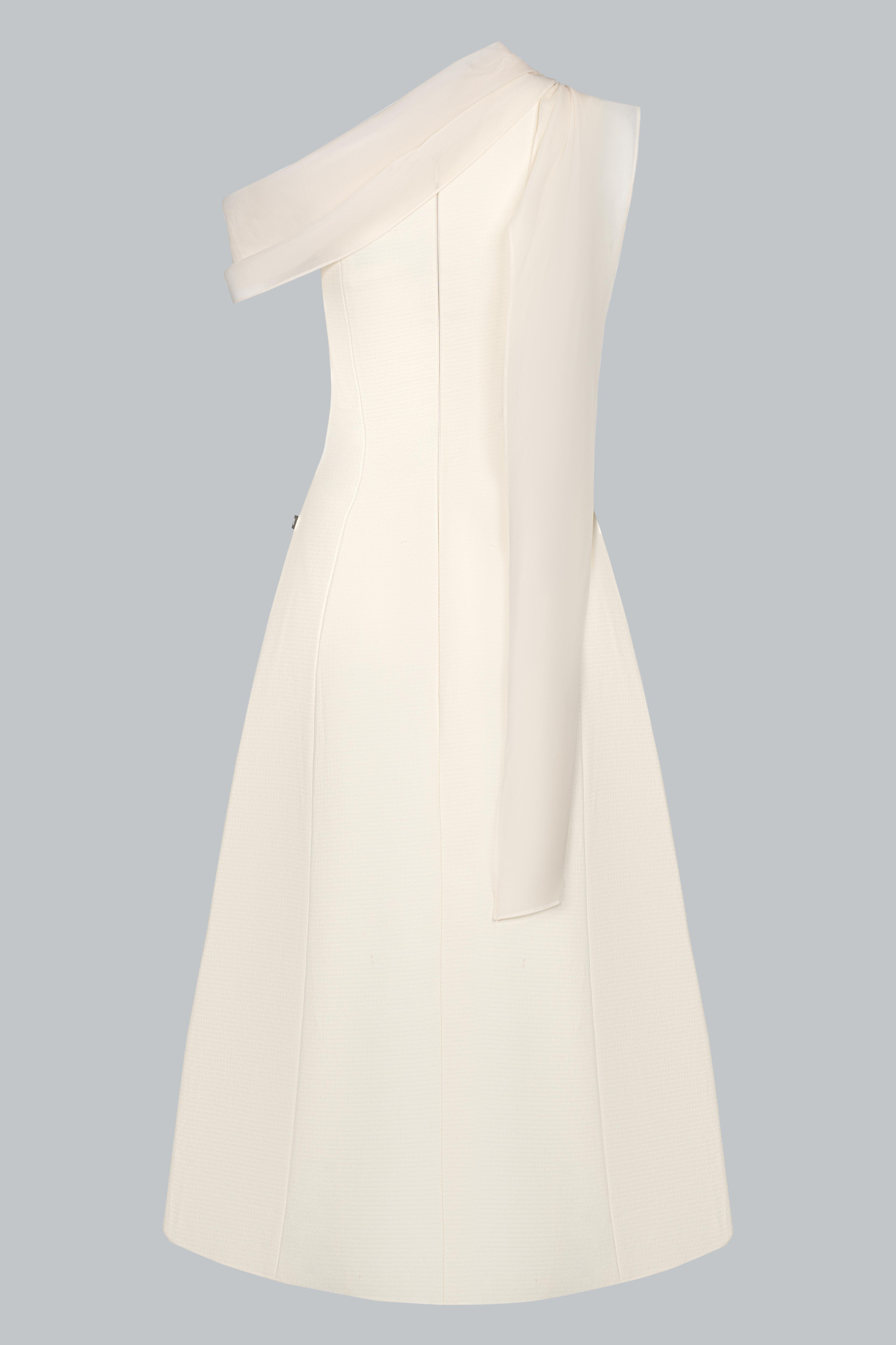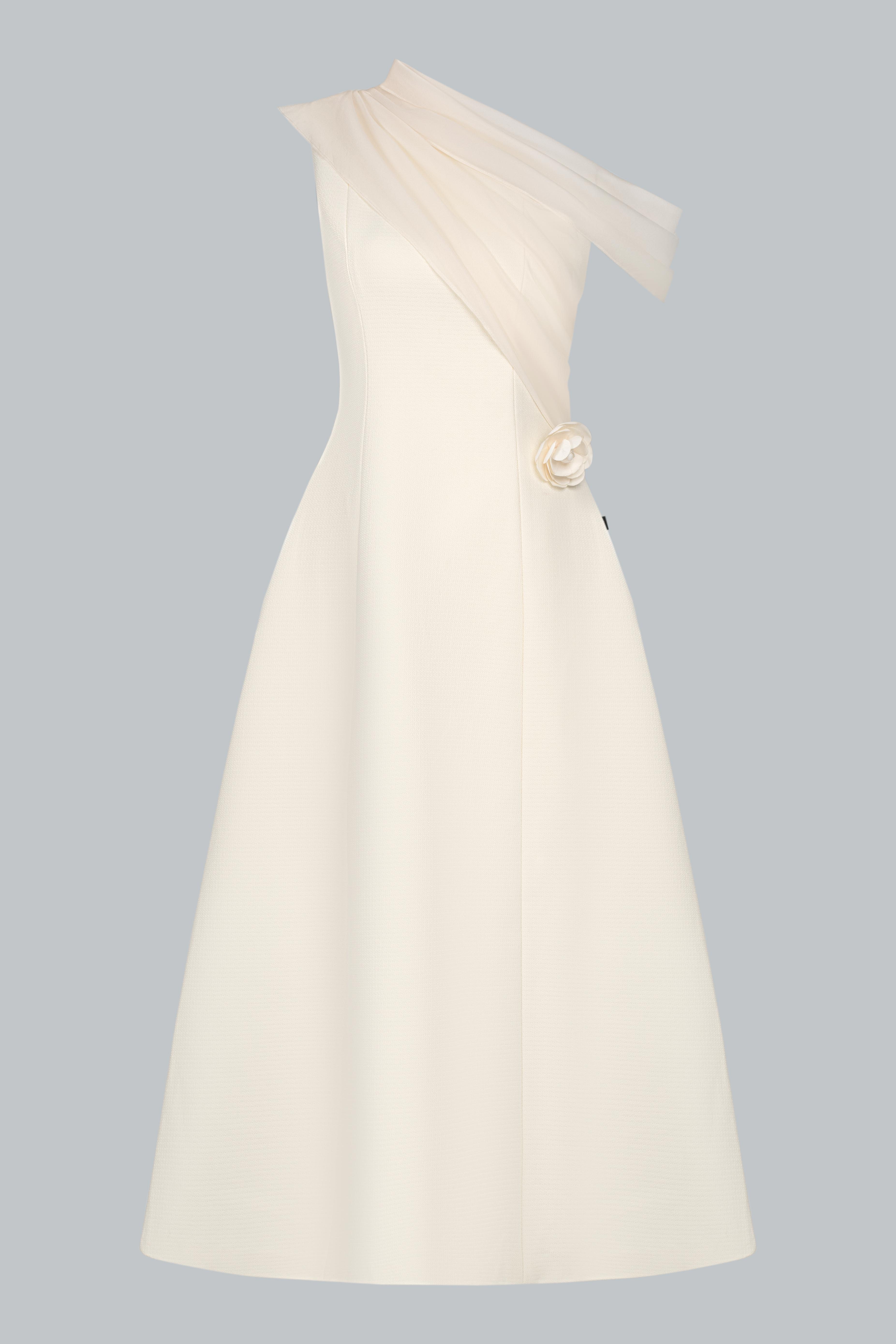 Một chiếc đầm midi dự tiệc cao cấp trong sắc trắng kem thanh khiết – thanh lịch và hiện đại. Như một “kho báu” nhẹ nhàng, nàng toả sáng không vì sự phô trương, tinh tế trong từng đường cắt, sang trọng trong từng chi tiết.