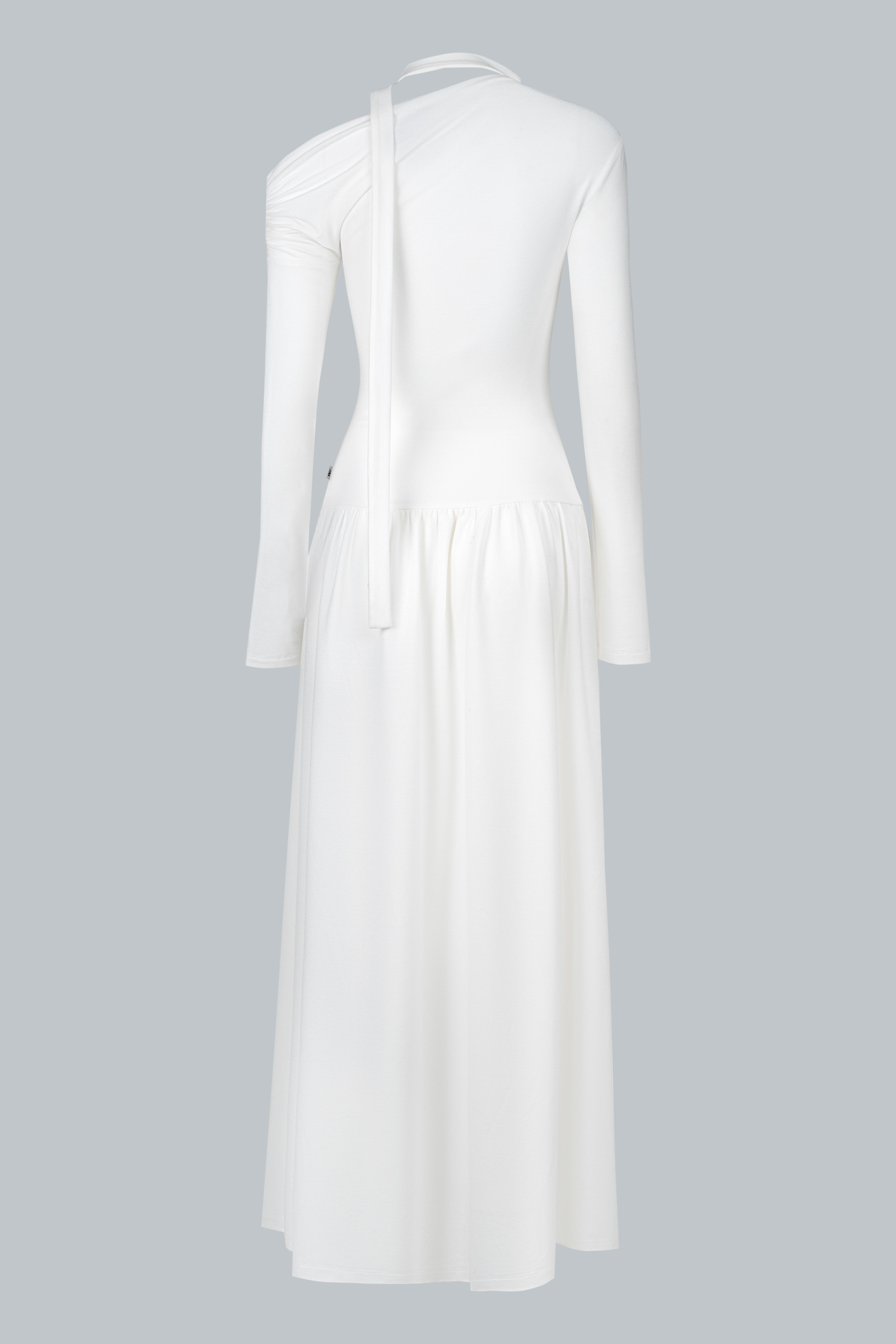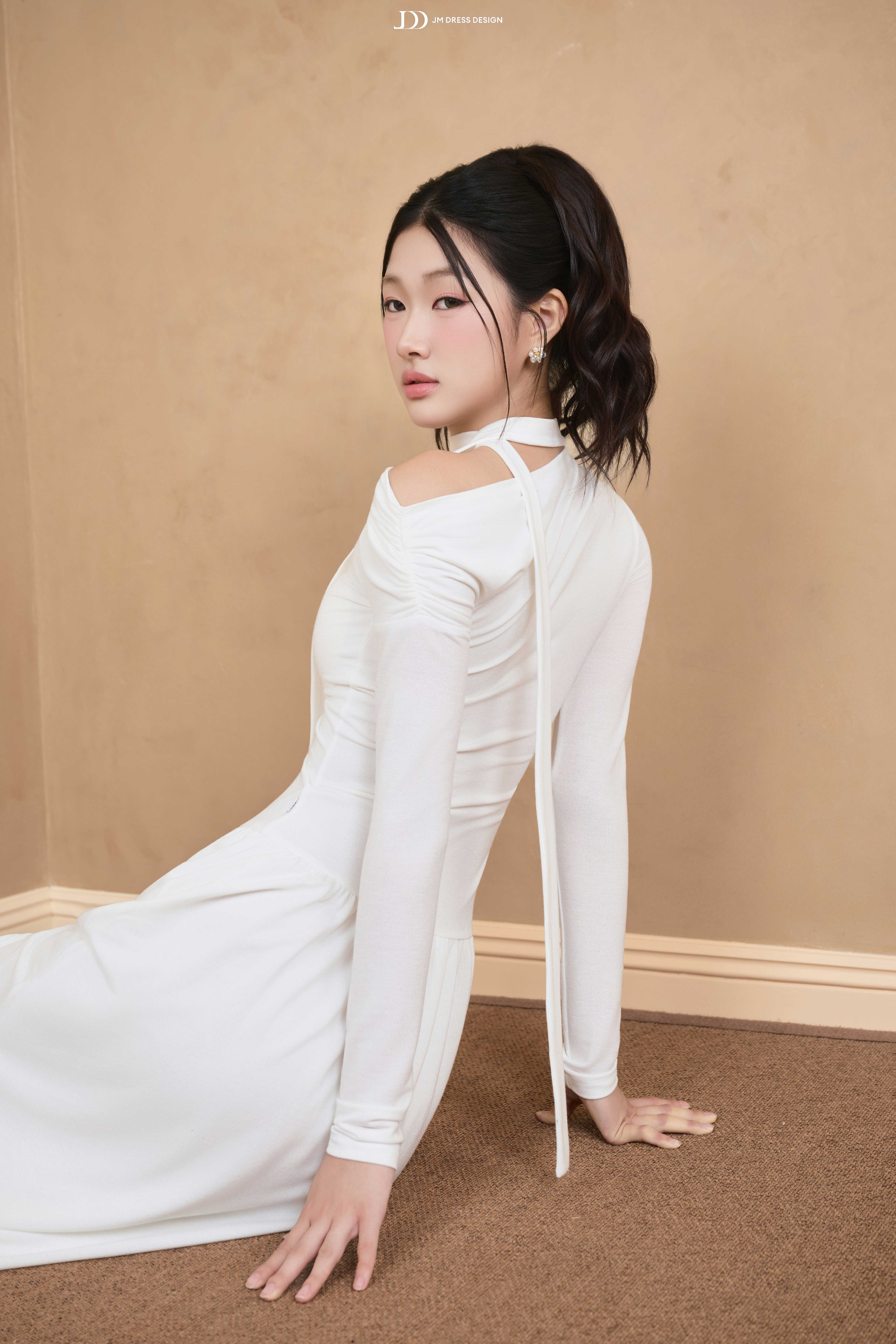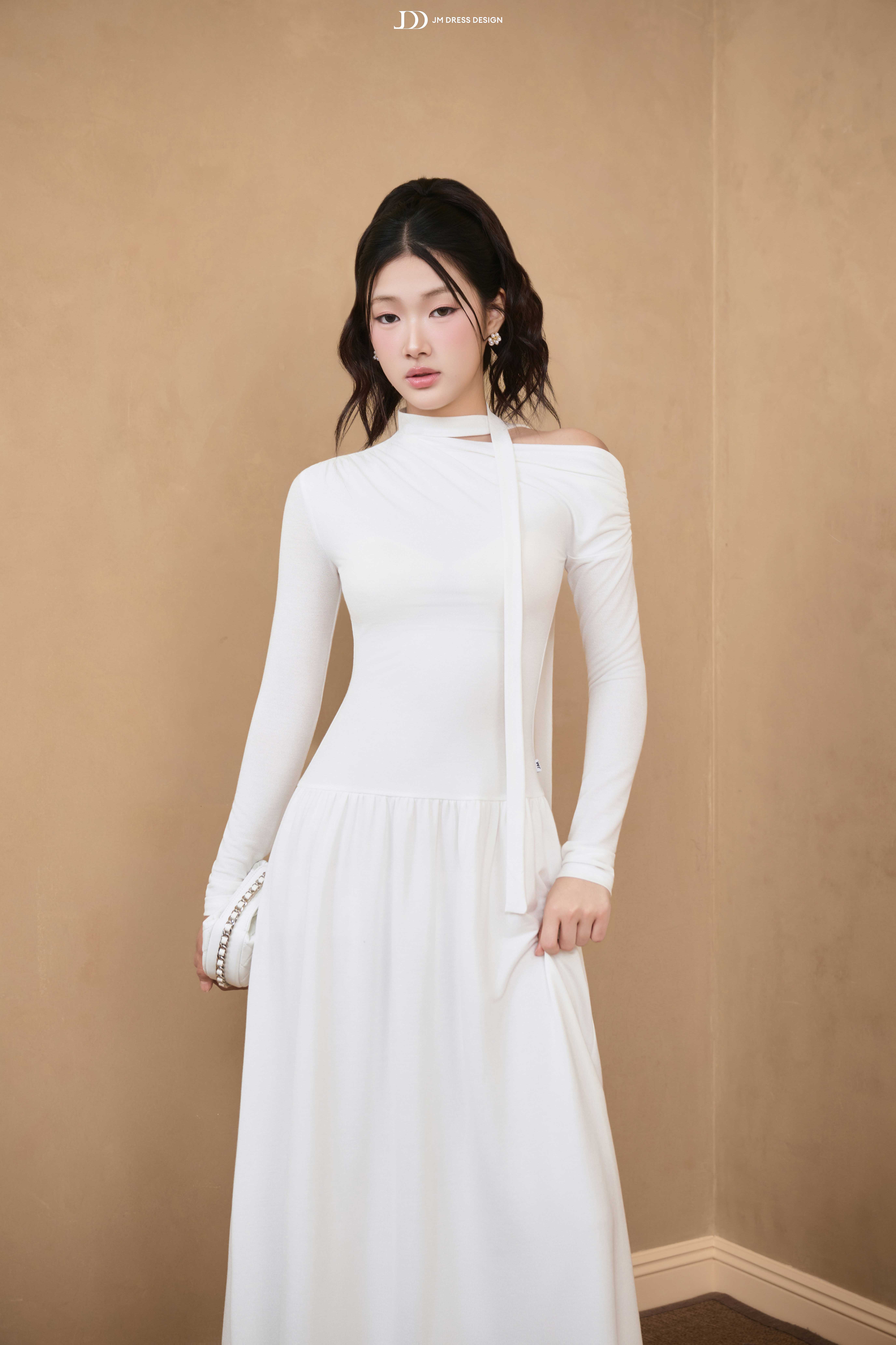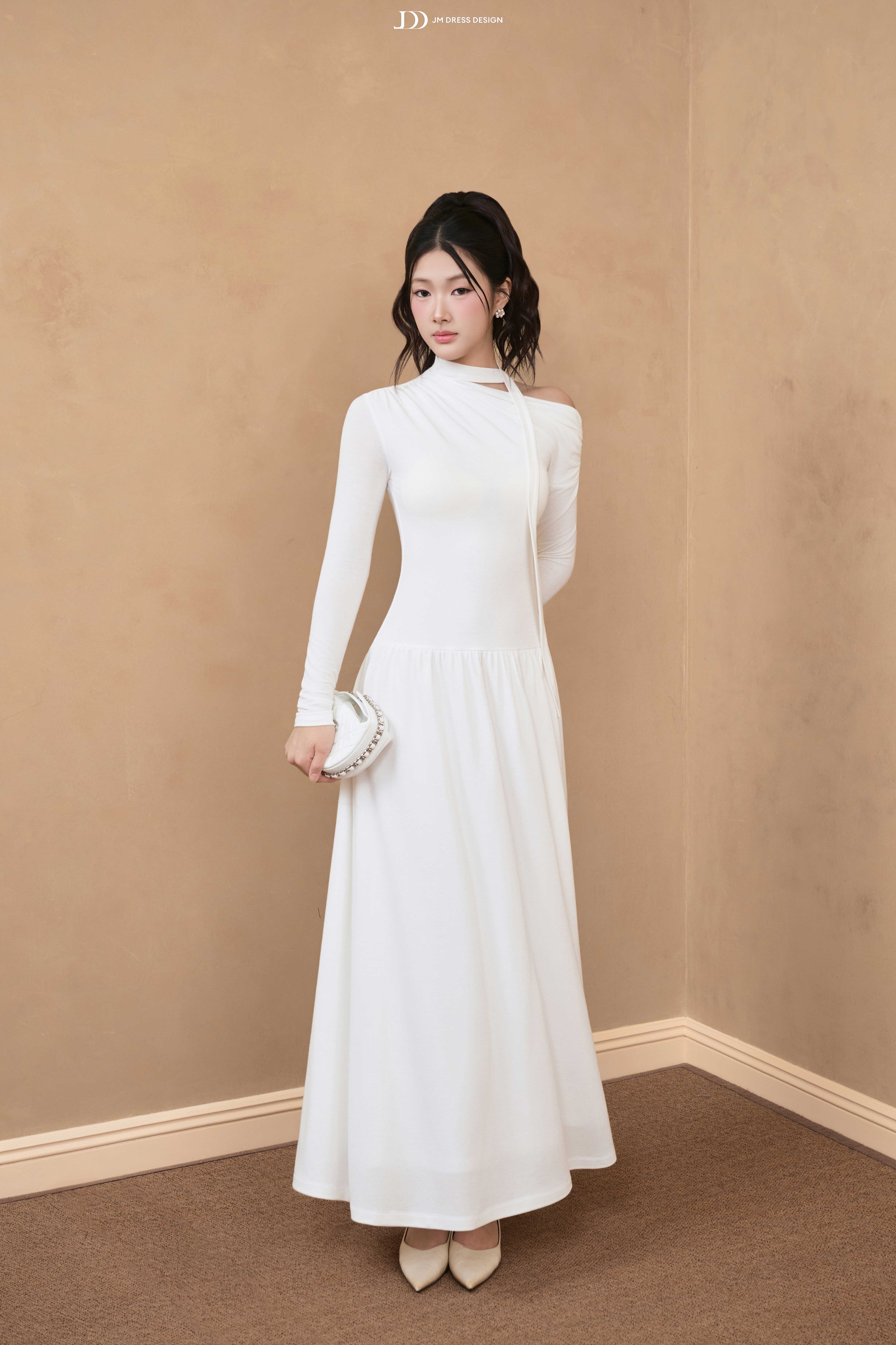 Đầm dài tay lệch vai khéo léo để lộ bờ vai mảnh mai, kết hợp cổ cao vắt dây chéo ôm sát, tạo điểm nhấn vừa gợi cảm vừa thanh lịch. Thân váy buông rủ nhẹ, dáng suông mềm mại giúp tôn dáng nhưng không phô trương, phù hợp phong cách tối giản hiện đại. Màu trắng tinh khôi làm nổi bật vẻ trong trẻo, dễ dàng kết hợp phụ kiện để biến hóa theo từng hoàn cảnh.