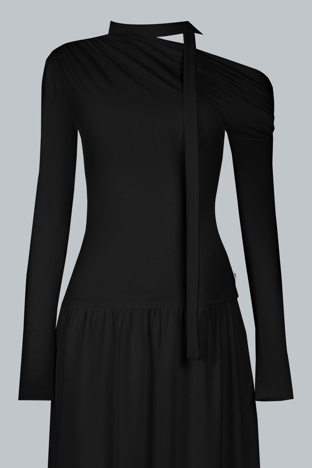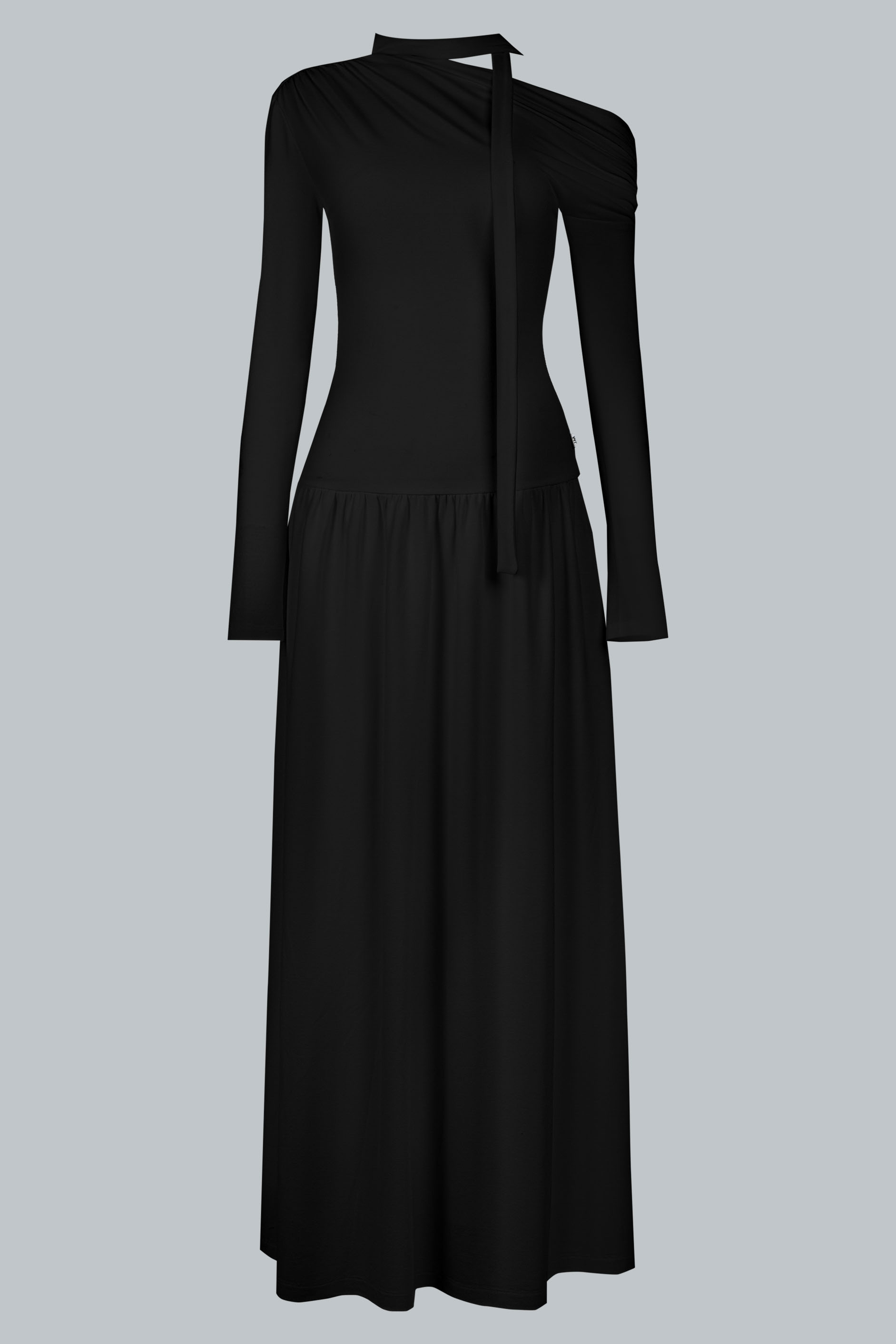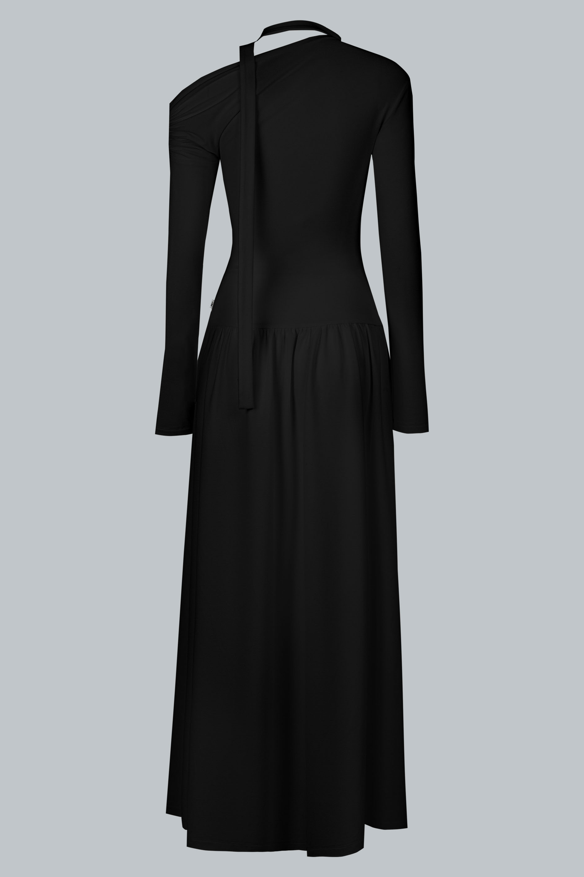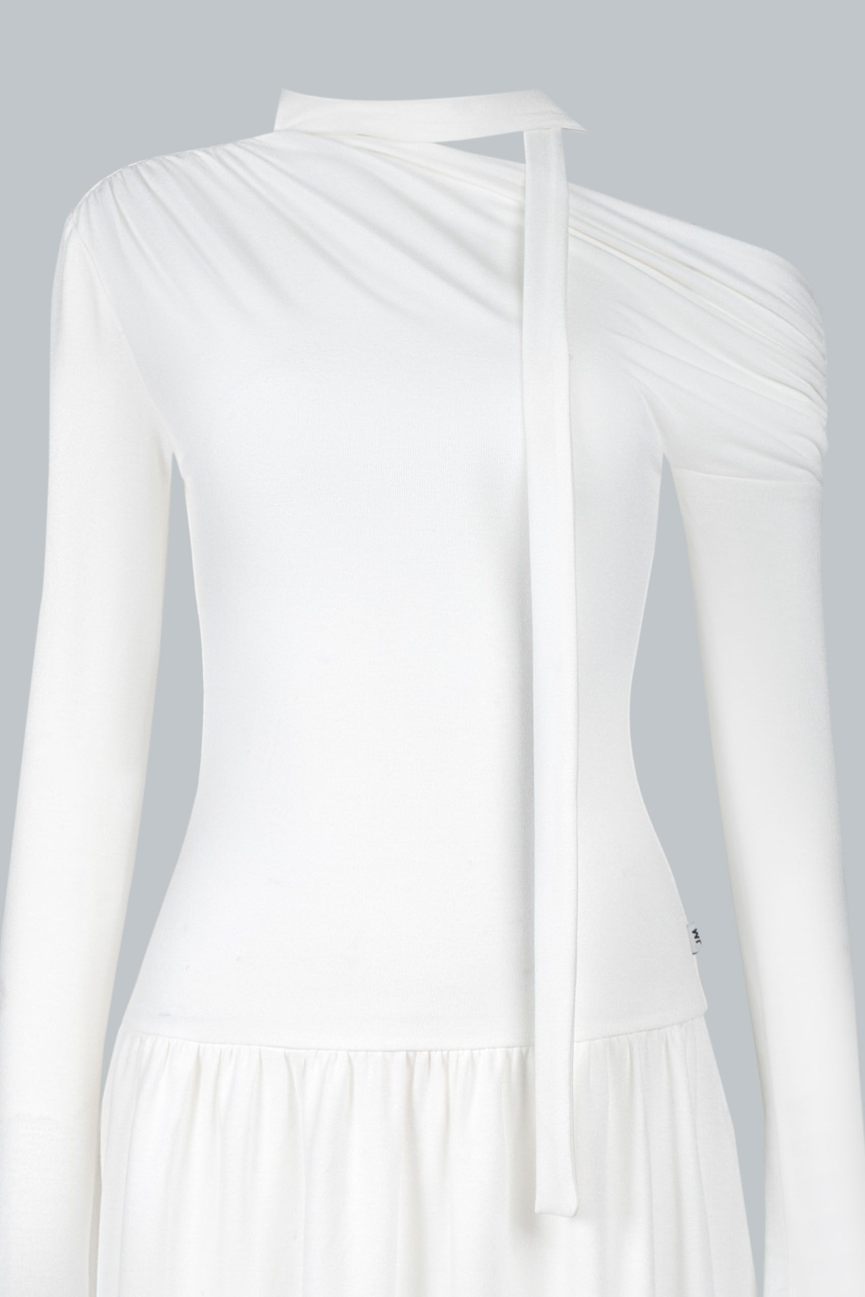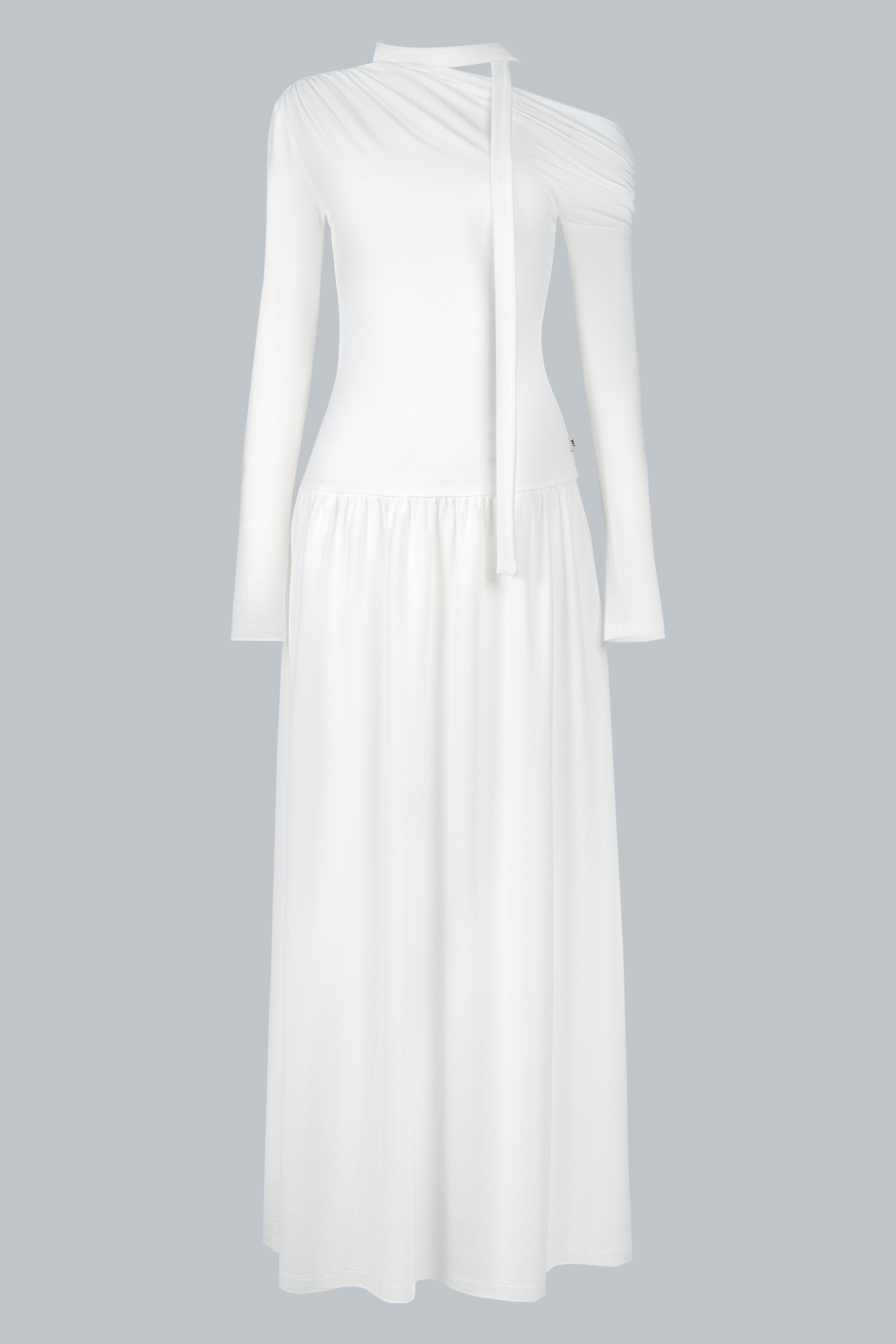 Đầm dài tay lệch vai khéo léo để lộ bờ vai mảnh mai, kết hợp cổ cao vắt dây chéo ôm sát, tạo điểm nhấn vừa gợi cảm vừa thanh lịch. Thân váy buông rủ nhẹ, dáng suông mềm mại giúp tôn dáng nhưng không phô trương, phù hợp phong cách tối giản hiện đại. Màu trắng tinh khôi làm nổi bật vẻ trong trẻo, dễ dàng kết hợp phụ kiện để biến hóa theo từng hoàn cảnh.