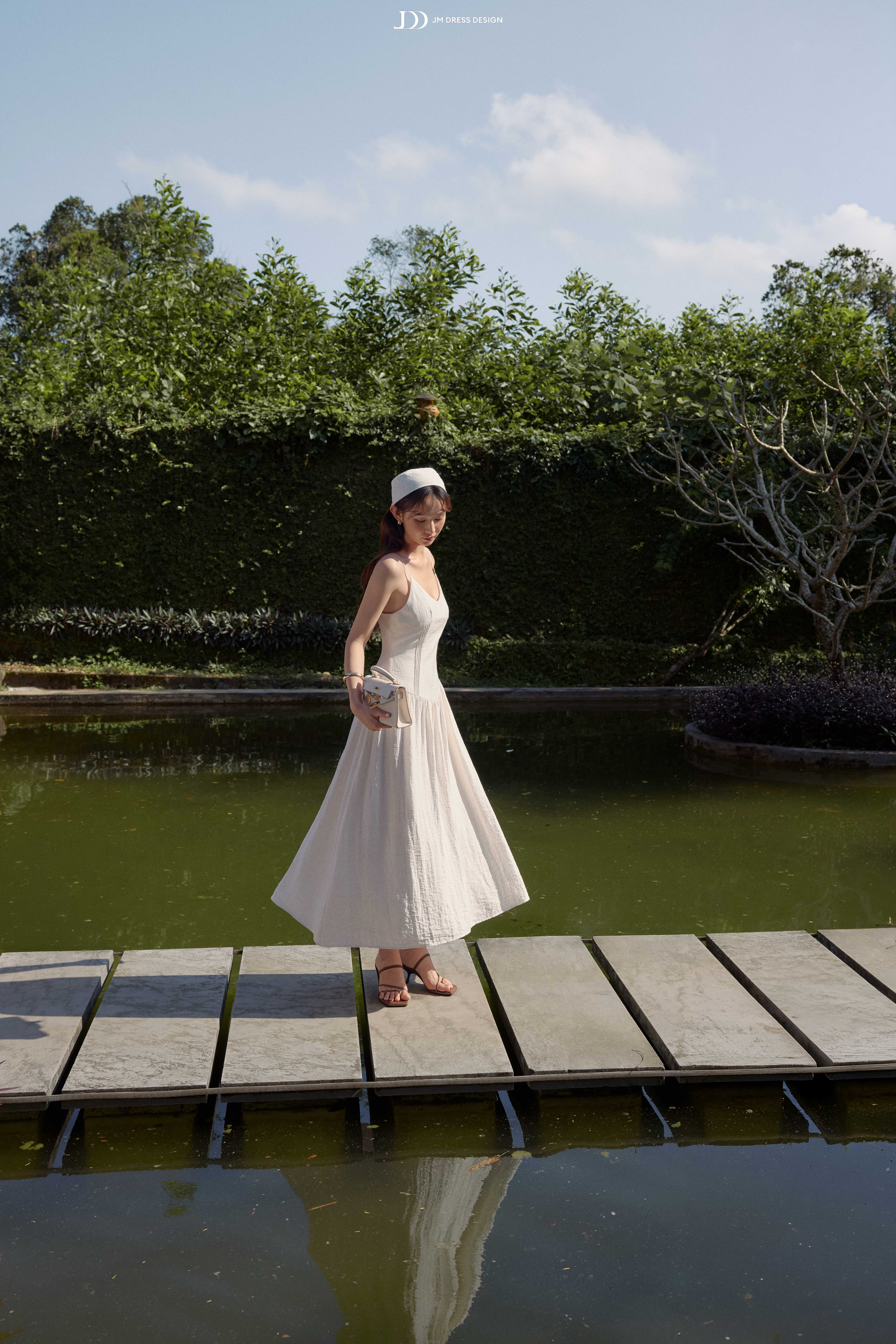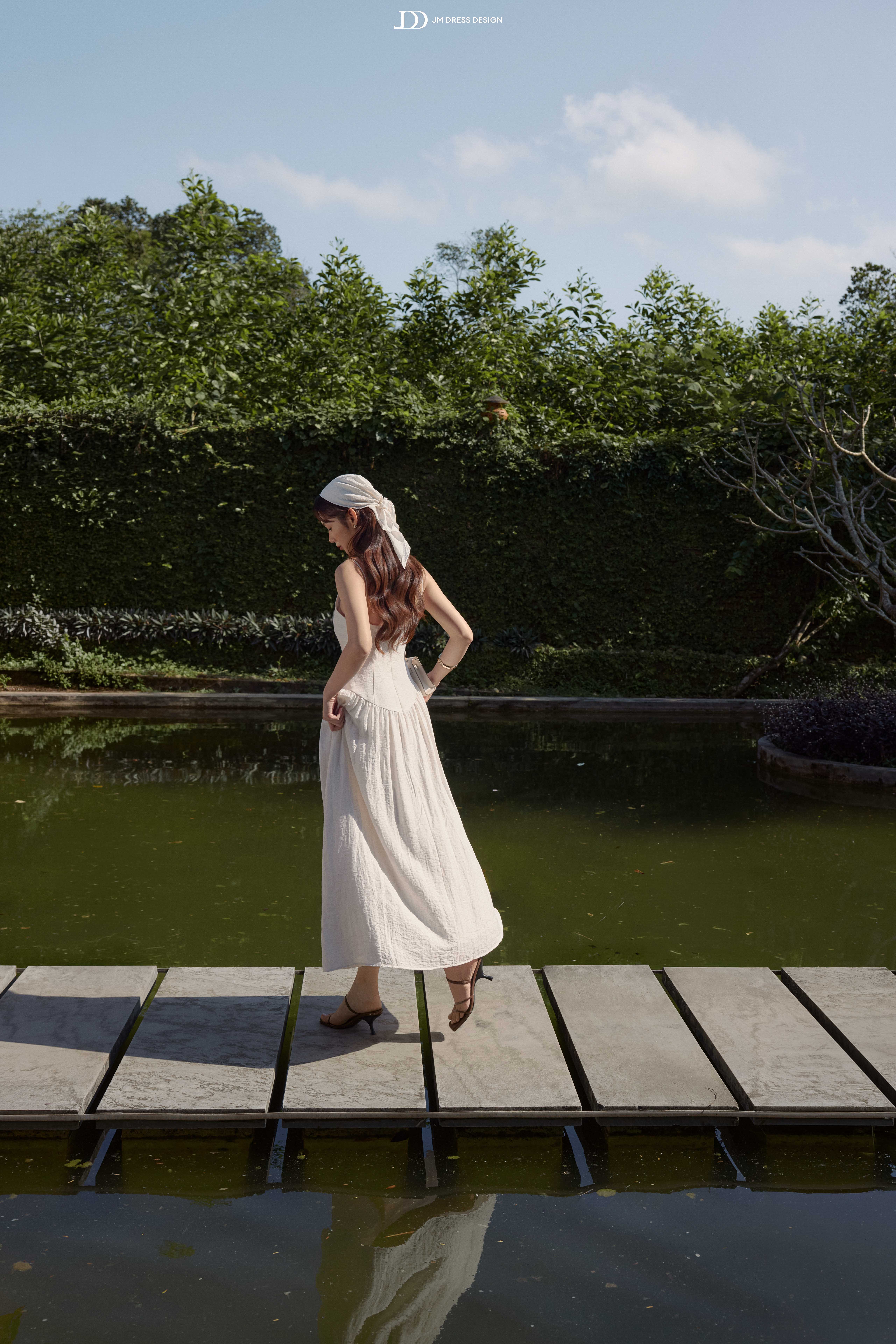Nắng rơi thành từng vệt khẽ chạm trên mặt nước, lấp lánh theo những gợn sóng khẽ lăn tăn. Không gian yên tĩnh đến độ có thể nghe thấy cả tiếng gió lùa qua tán lá, chạm nhẹ vào vai, vào tóc. Nàng bước chậm trên lối đá nhỏ, trong sự uyển chuyển của từng nhịp váy khẽ lay trong gió. Sắc kem dịu trải đều, phản chiếu thứ ánh sáng trong trẻo của buổi chiều.