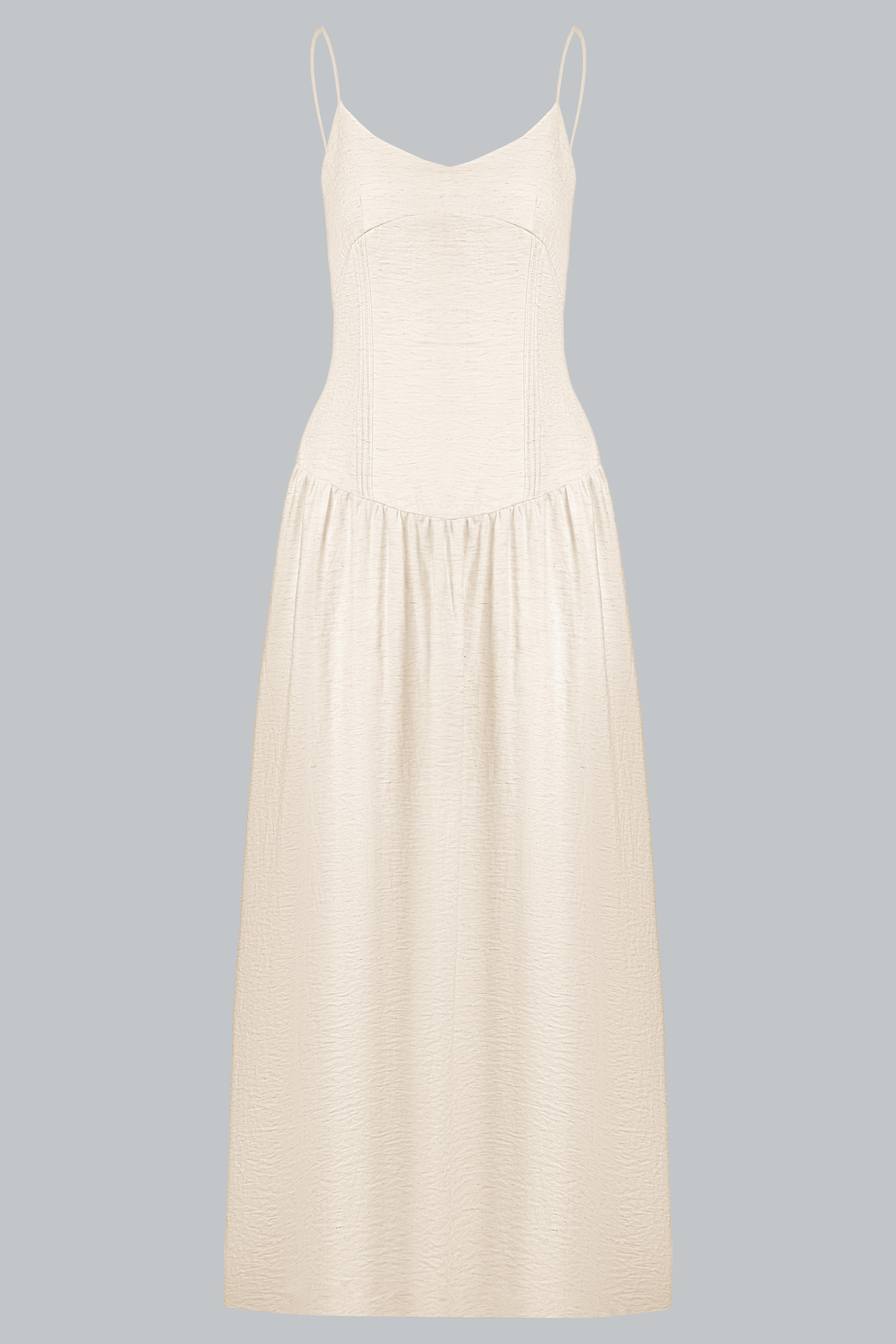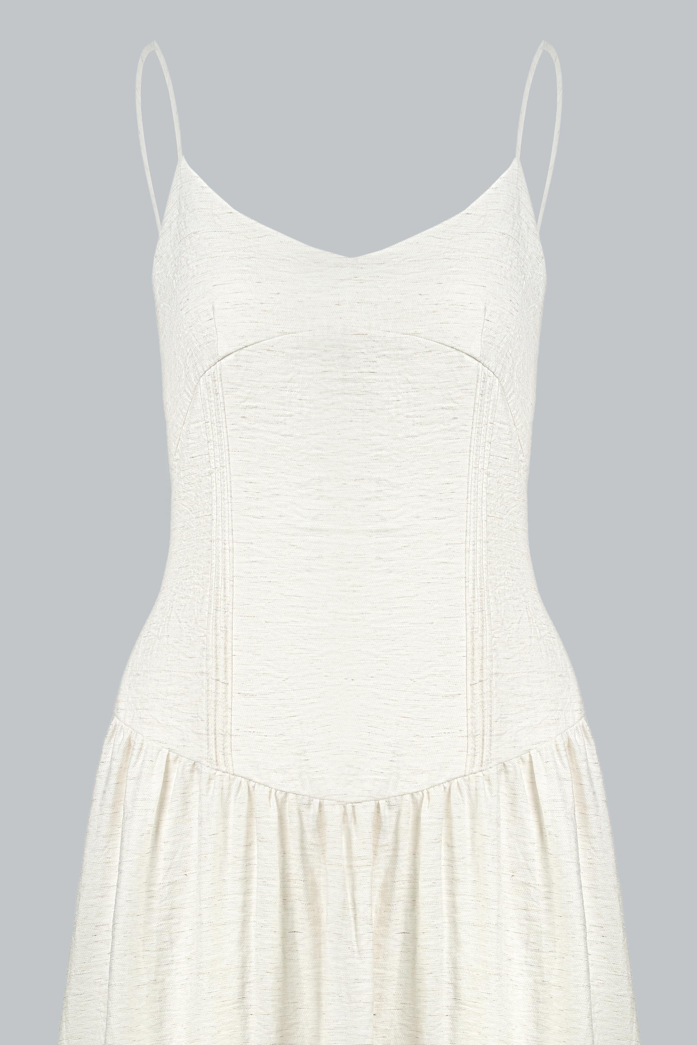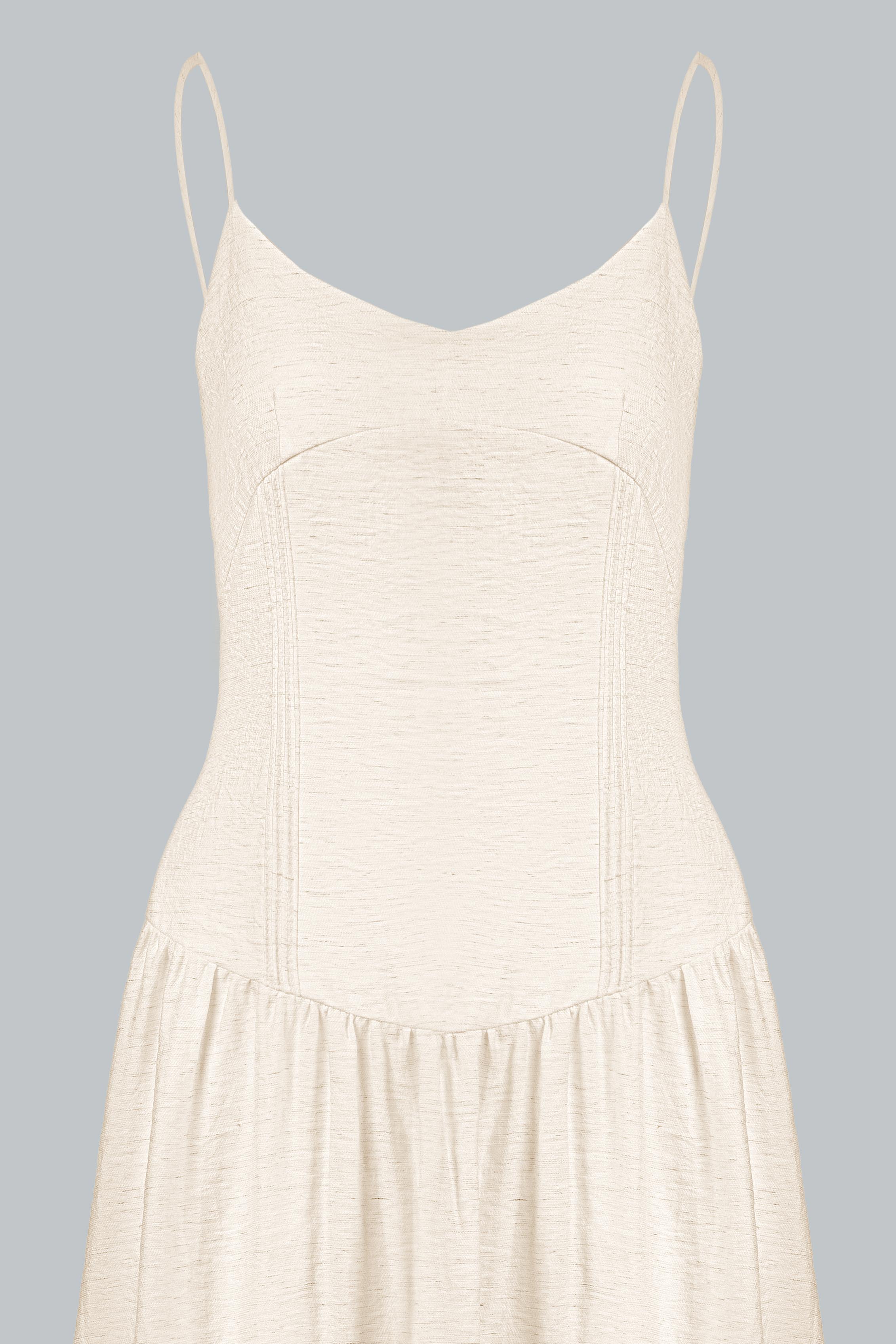 Đầm hai dây dáng midi/maxi xòe nhẹ, phần thân trên ôm nhẹ theo phom corset mềm giúp định hình vòng eo tự nhiên mà không gây gò bó. Thiết kế cổ tim nhẹ kết hợp quai mảnh giúp tôn lên phần vai và xương quai xanh, mang lại vẻ nữ tính và thanh thoát.