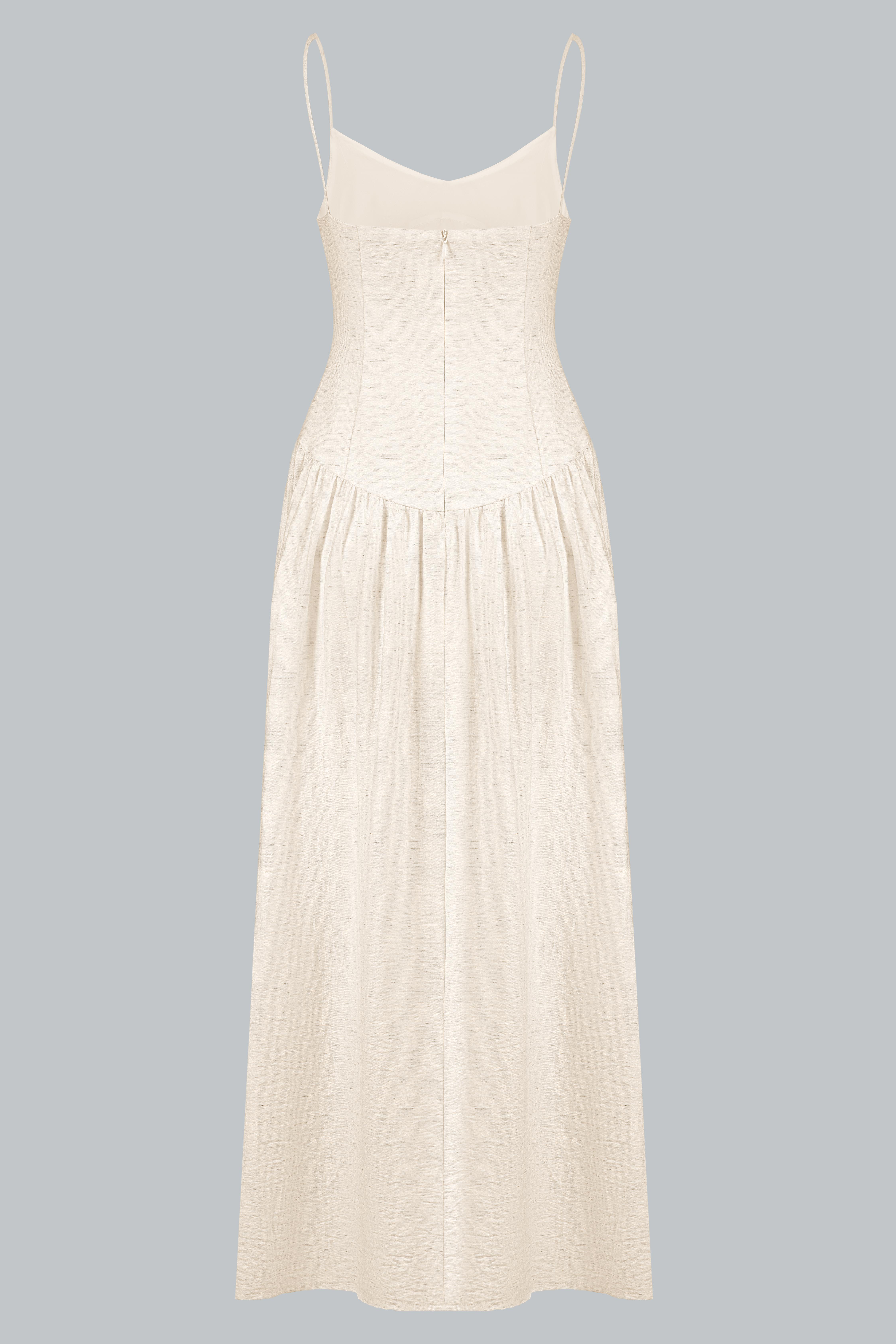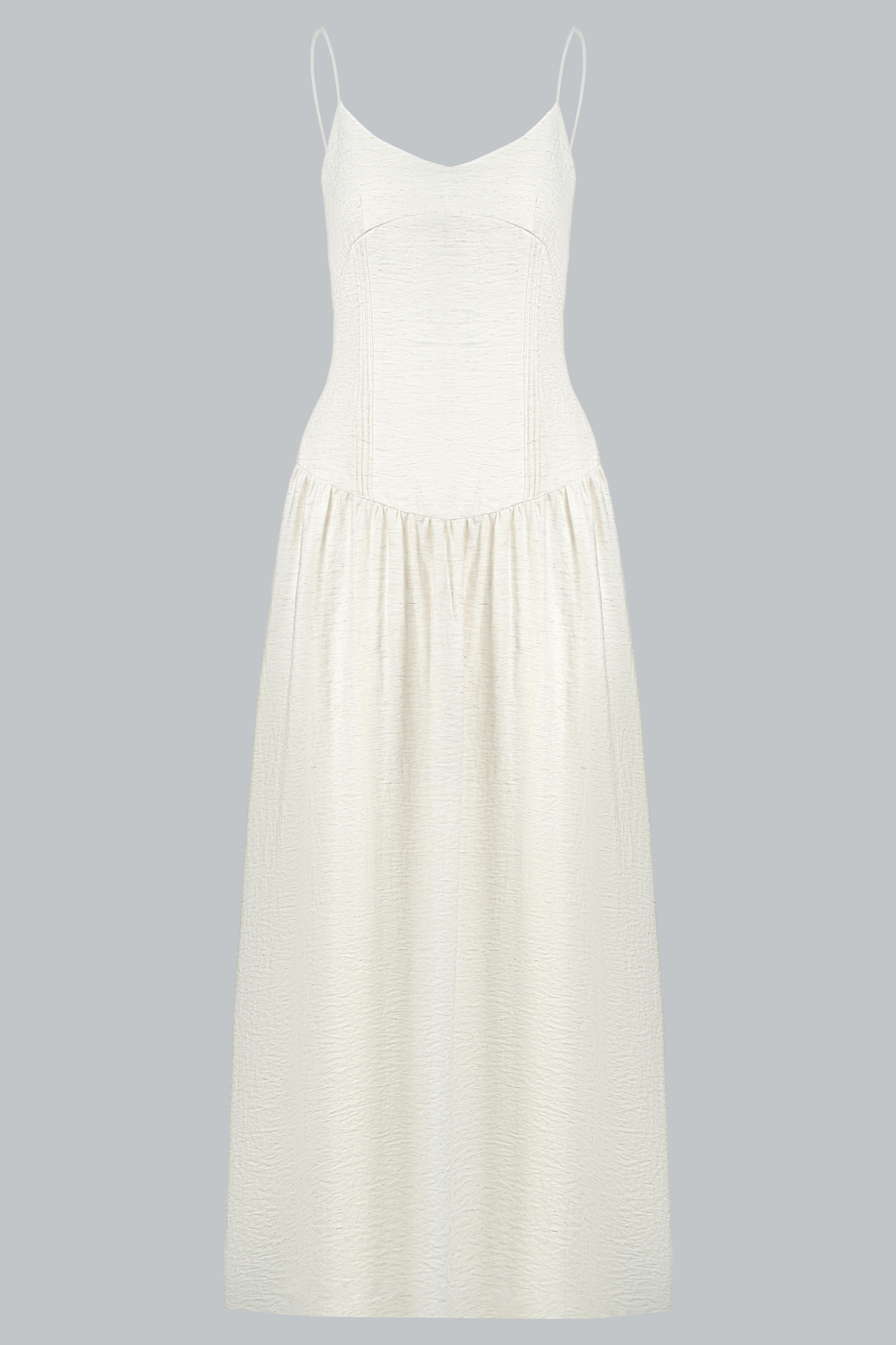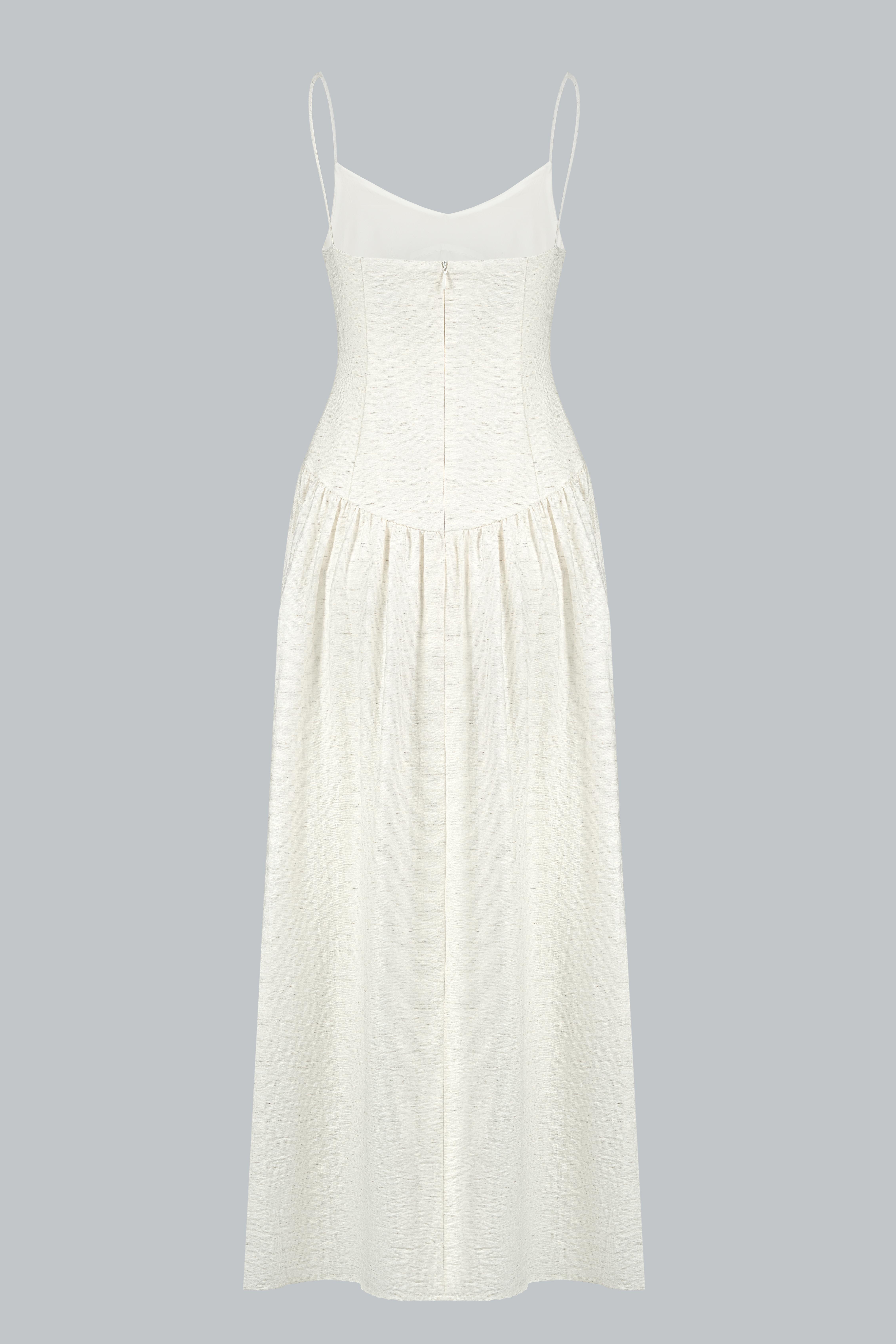 Đầm hai dây dáng midi/maxi xòe nhẹ, phần thân trên ôm nhẹ theo phom corset mềm giúp định hình vòng eo tự nhiên mà không gây gò bó. Thiết kế cổ tim nhẹ kết hợp quai mảnh giúp tôn lên phần vai và xương quai xanh, mang lại vẻ nữ tính và thanh thoát.
