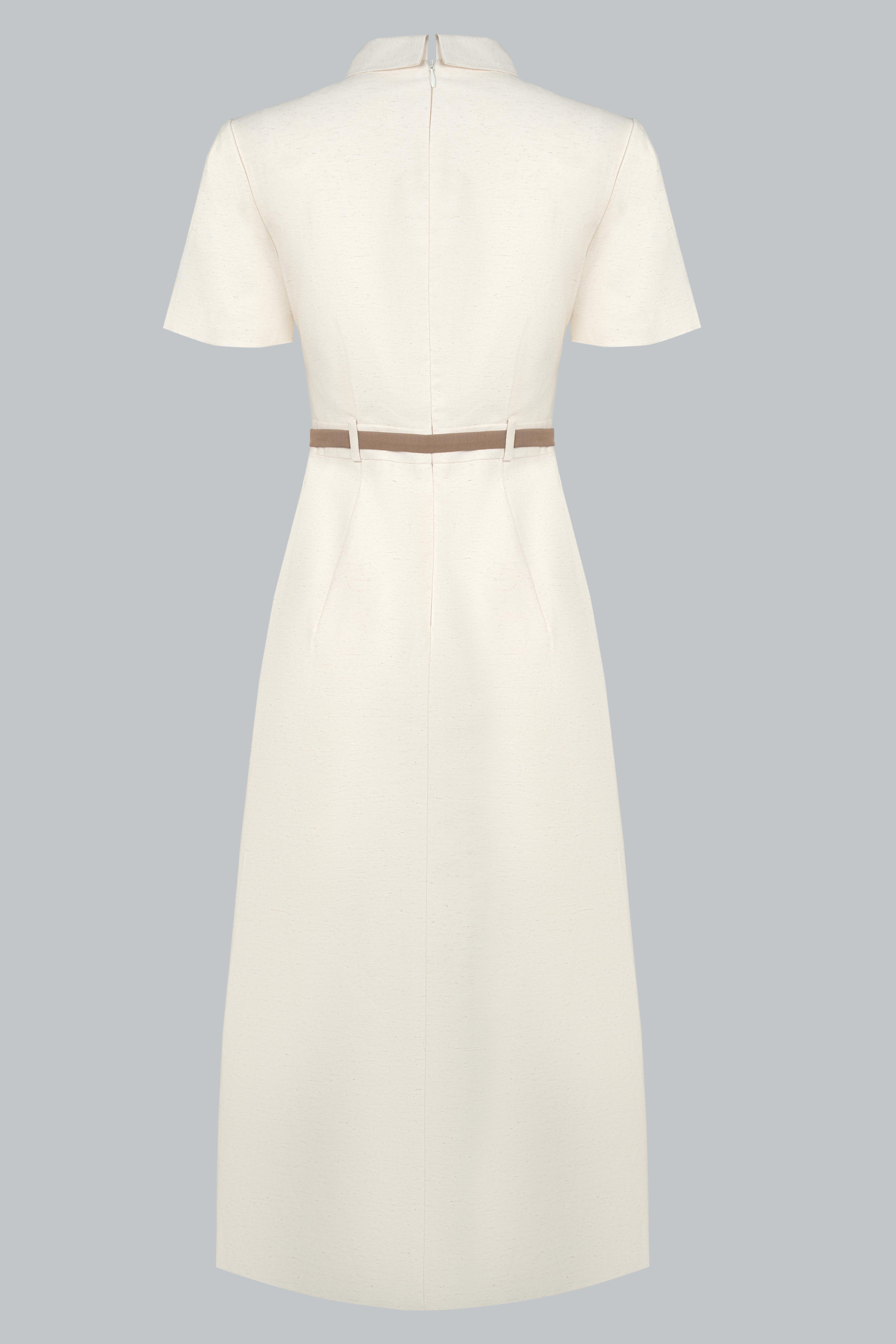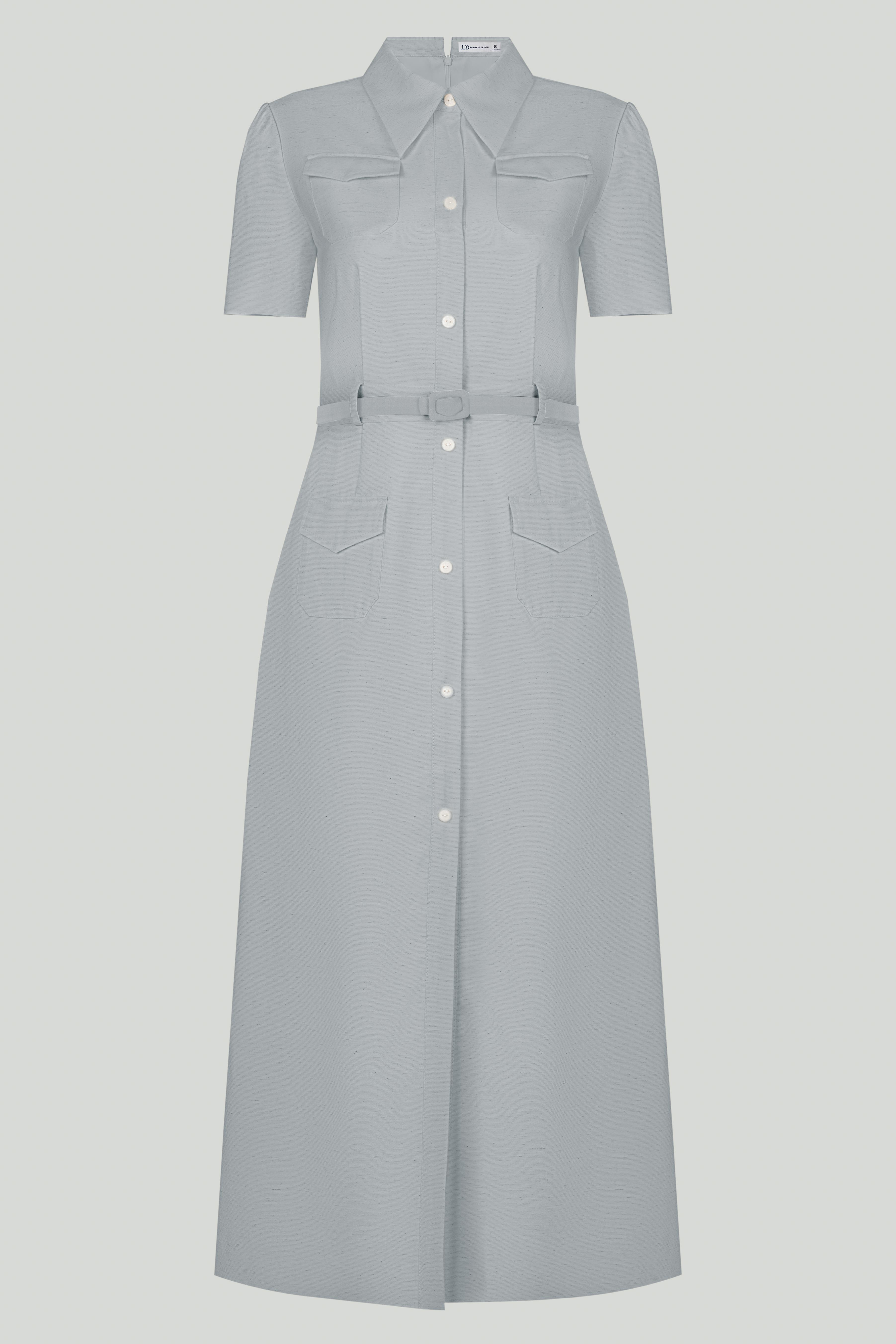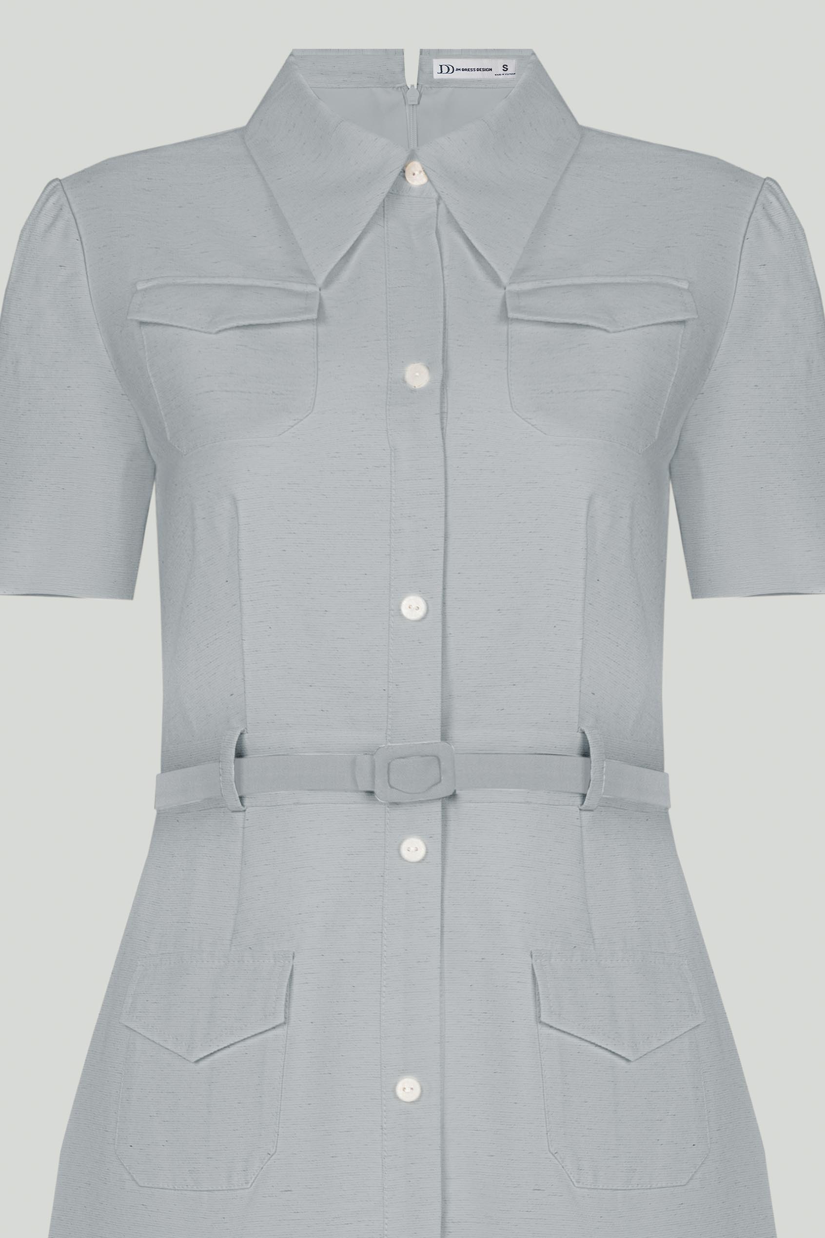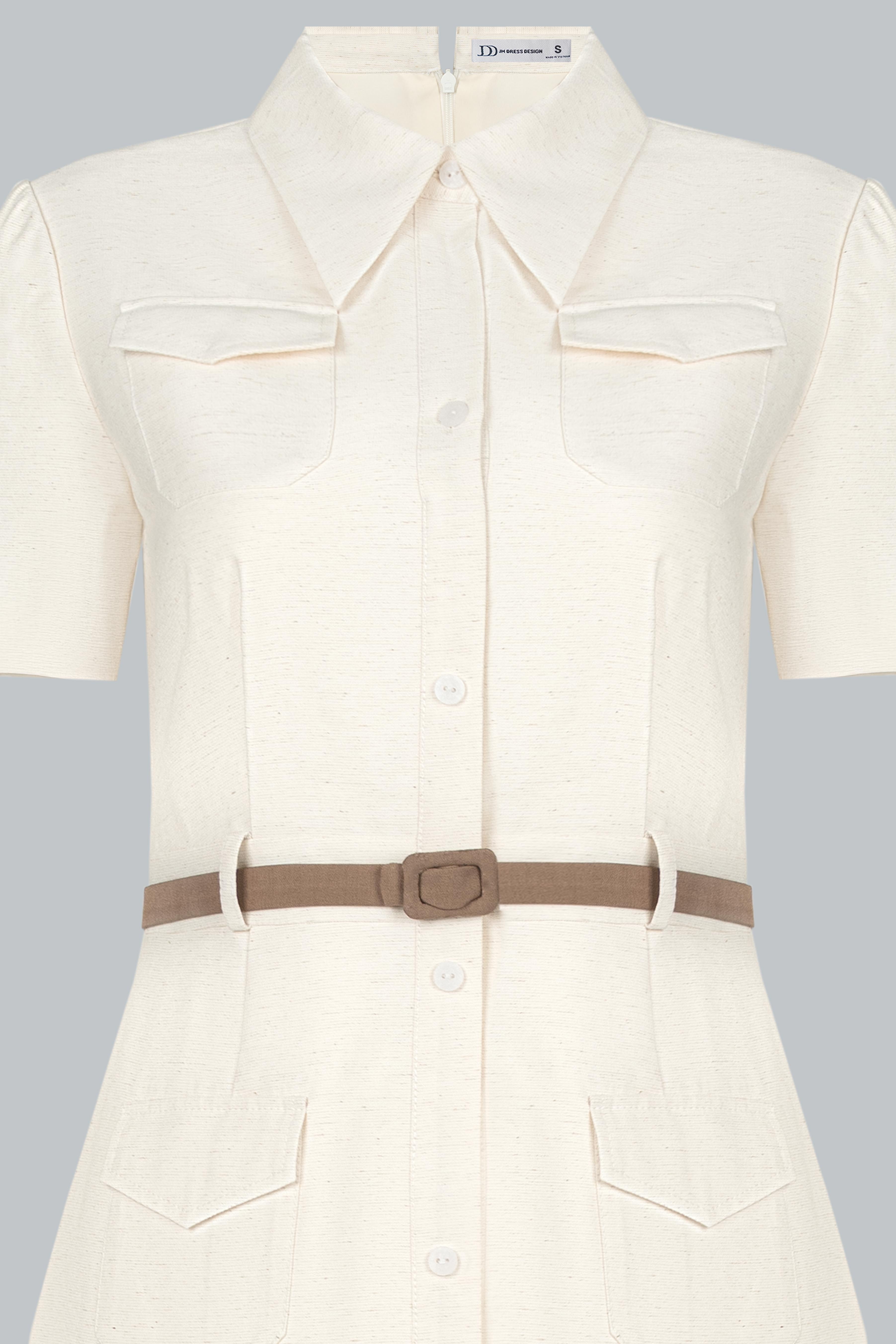 Đầm sơ mi dáng midi cổ điển, hàng nút giữa, cổ bẻ bản nhọn và form dáng thẳng đứng – vừa kín đáo vừa tôn dáng. Thiết kế điểm xuyết bằng bốn túi nắp (2 ngực + 2 hông) mang hơi hướng military/safari nhưng được tiết chế vừa đủ để giữ nét mềm mại. Đai lưng da mảnh màu nâu sáng chia tỷ lệ cơ thể hài hòa và tôn vòng eo gọn gàng. Đường xẻ tà trước vừa đủ giúp váy không cứng nhắc mà linh hoạt hơn khi di chuyển. Một thiết kế cân bằng hoàn hảo giữa nét cổ điển nghiêm trang và sự năng động hiện đại.