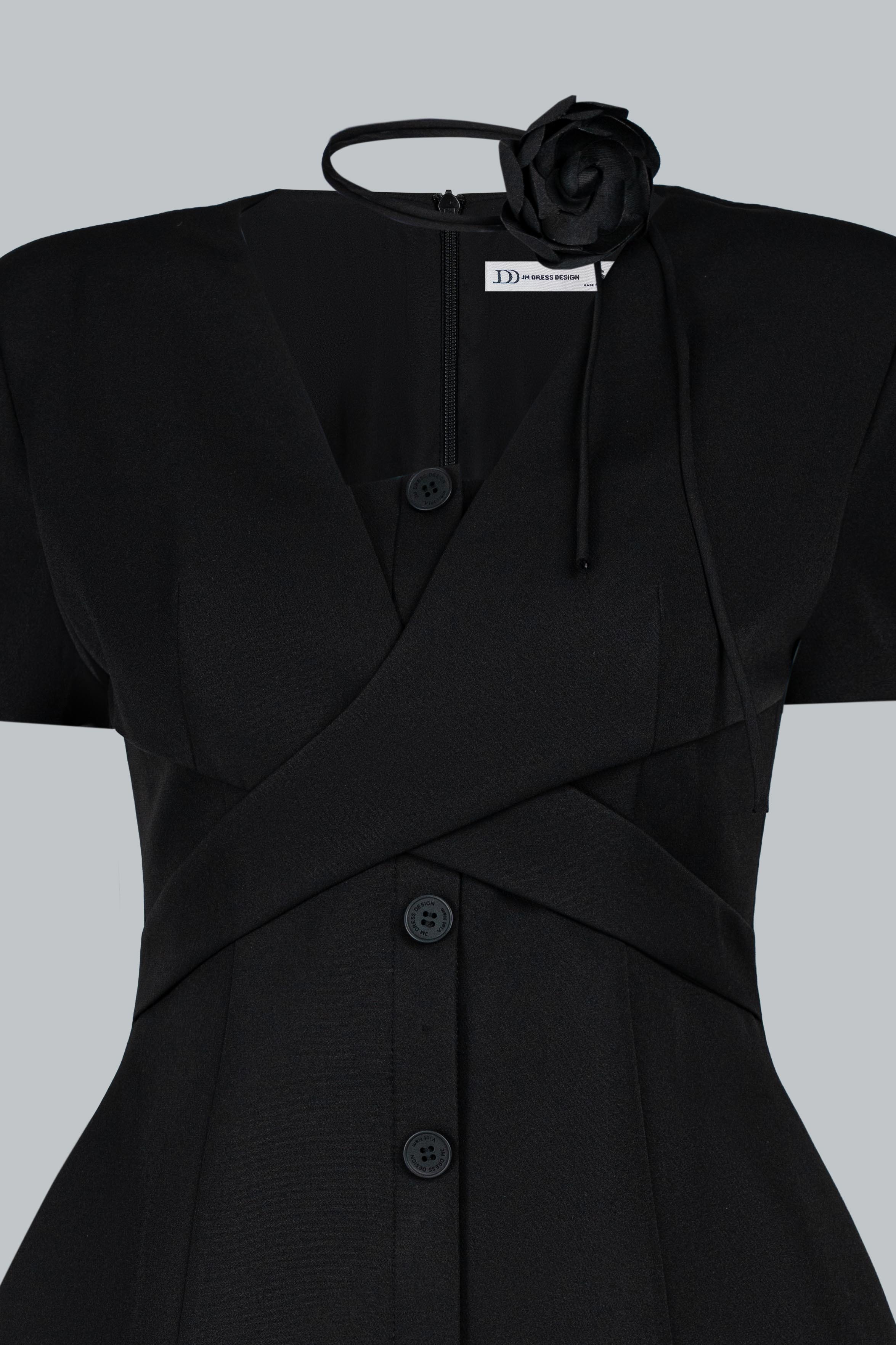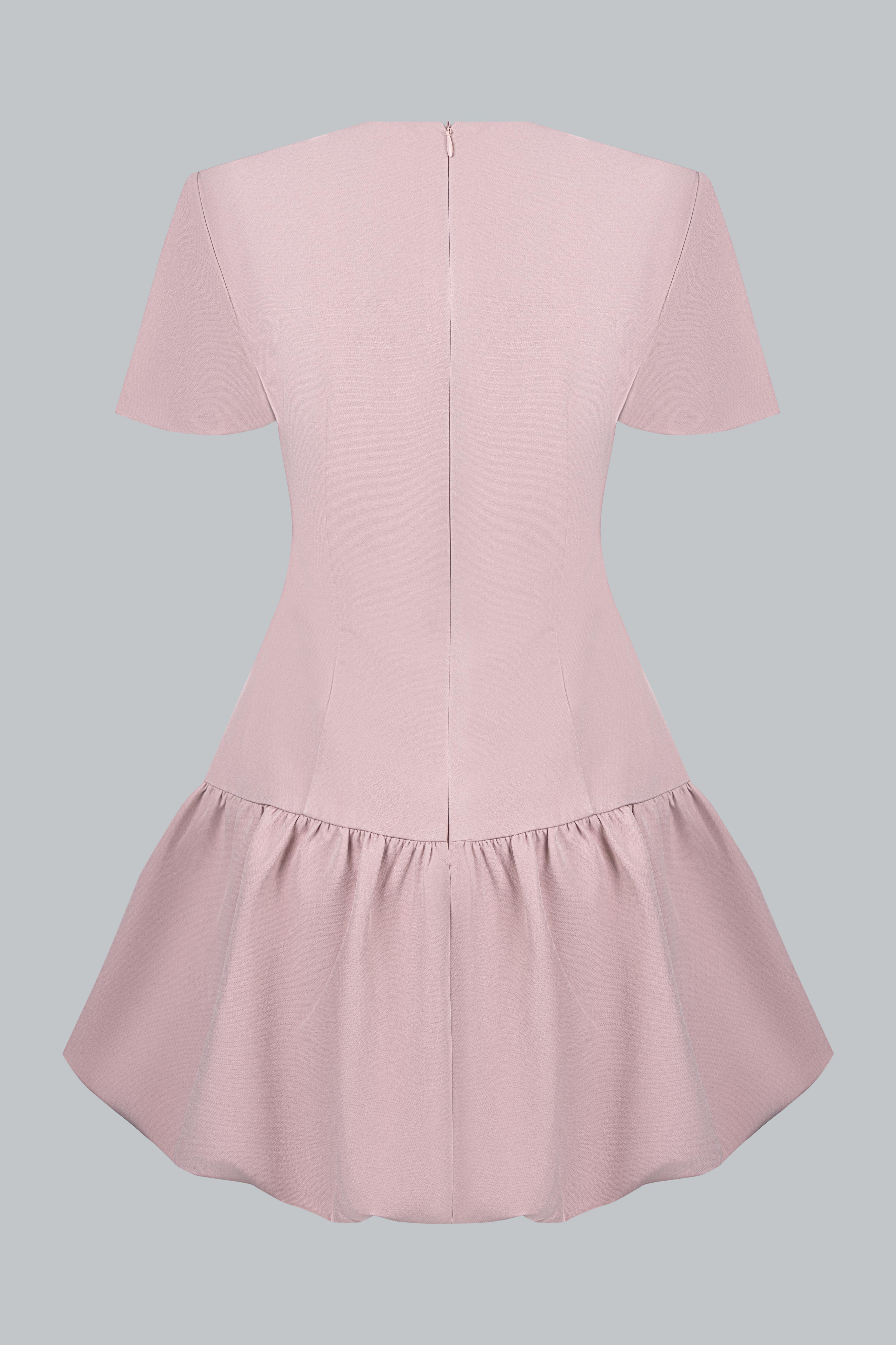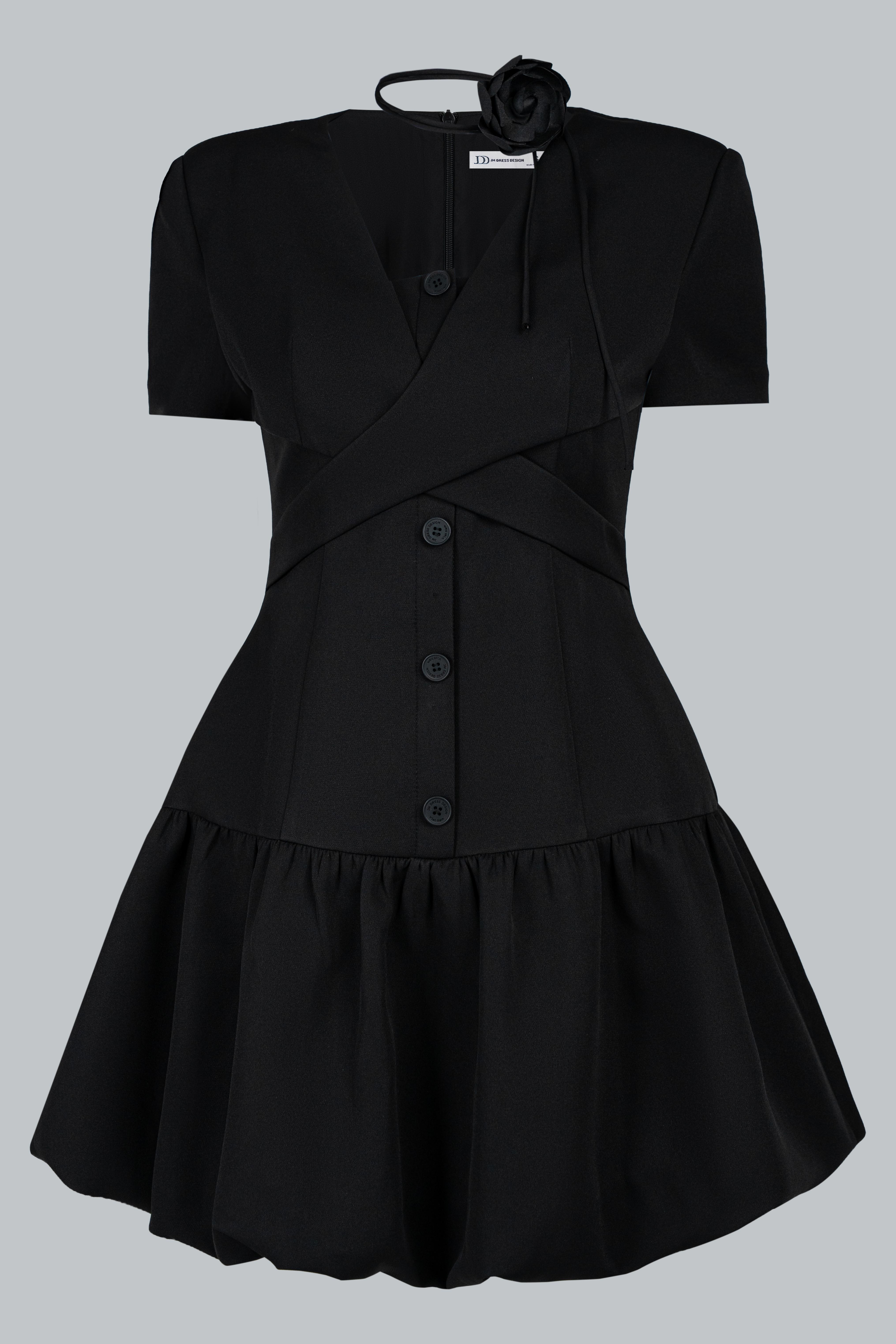 Đầm dáng A ngắn với phần thân trên ôm vừa, giúp tôn dáng và tạo sự cân đối hài hòa. Chân váy giật bom nhẹ mang đến chuyển động mềm mại, cân bằng với phần thân trên sắc nét.