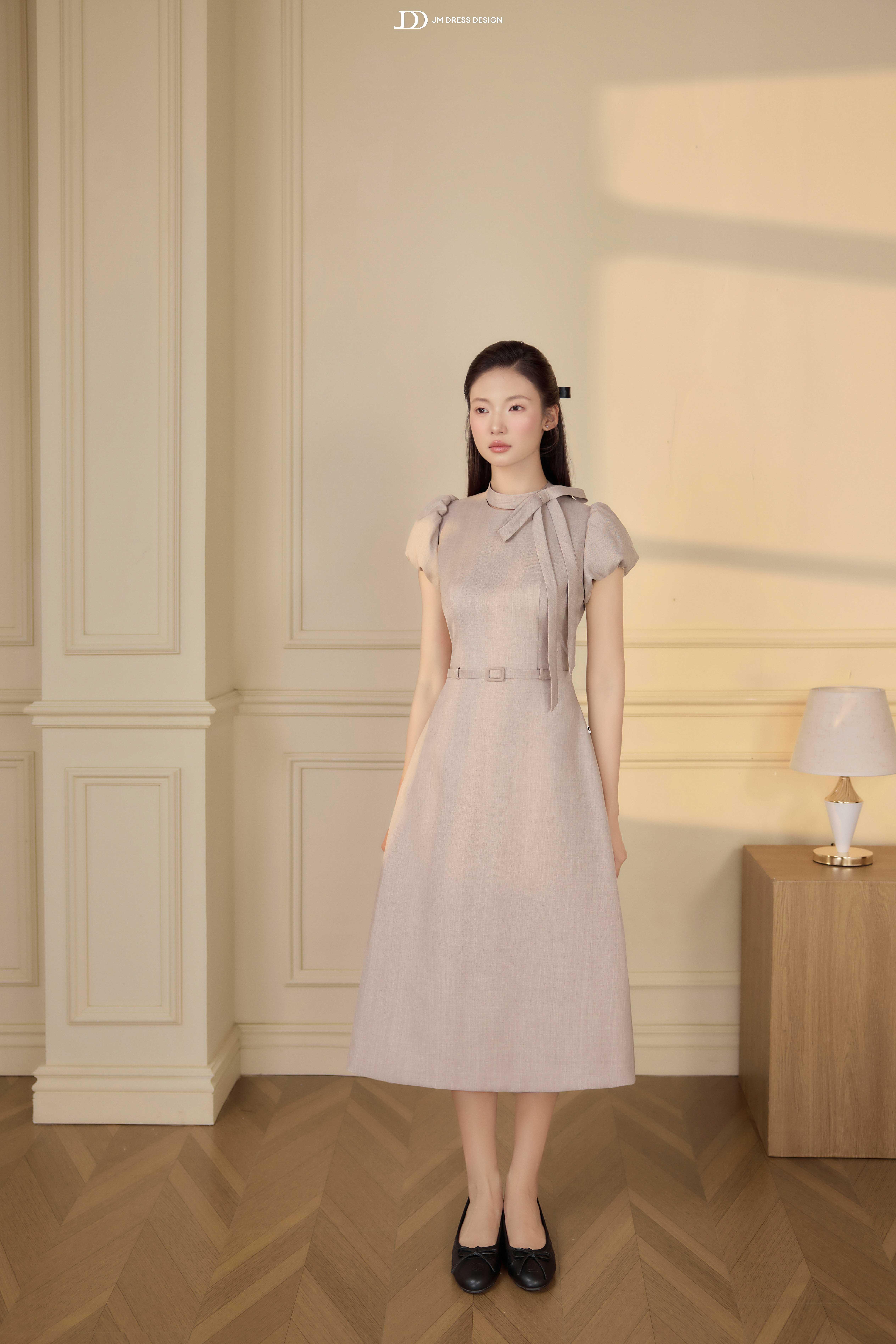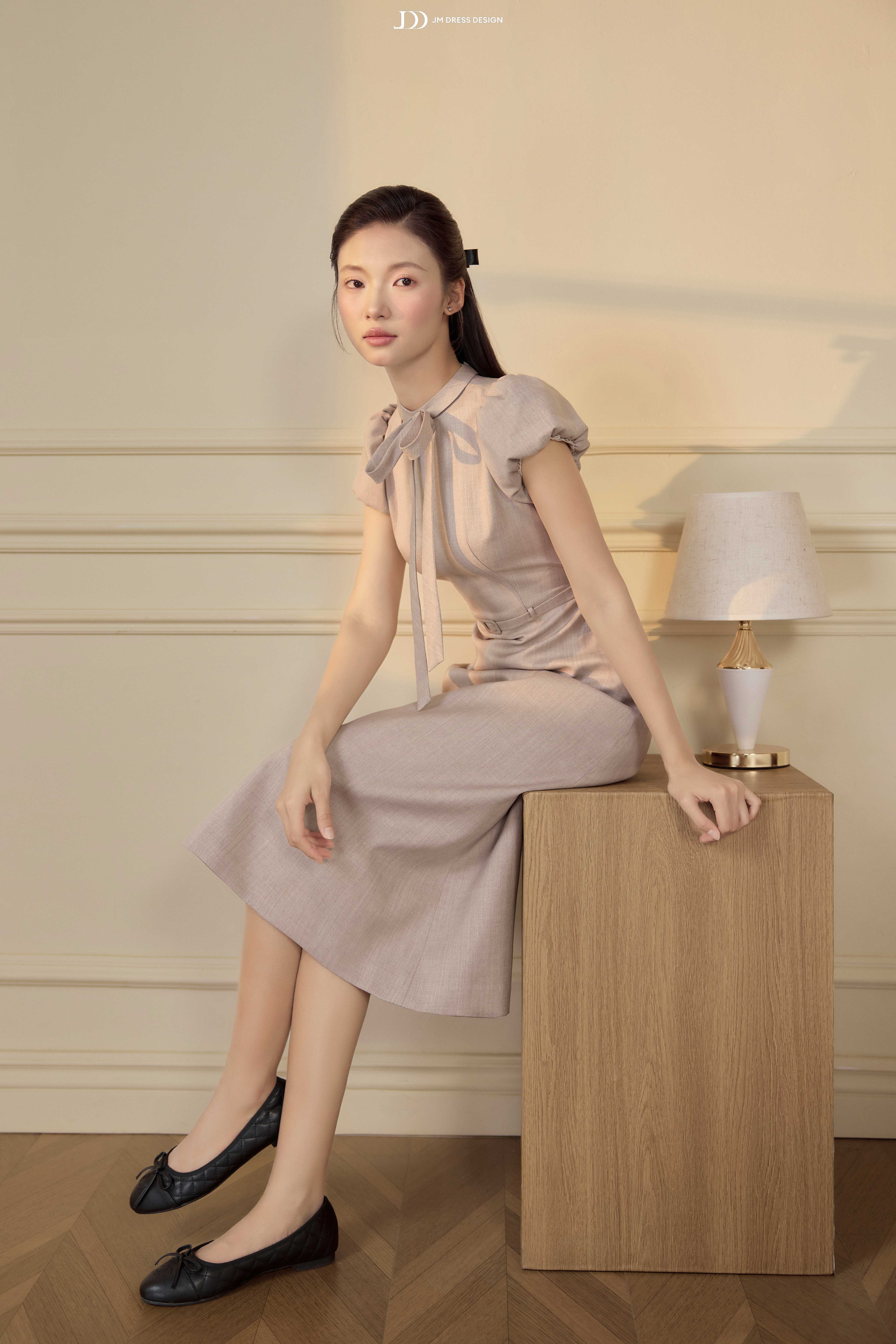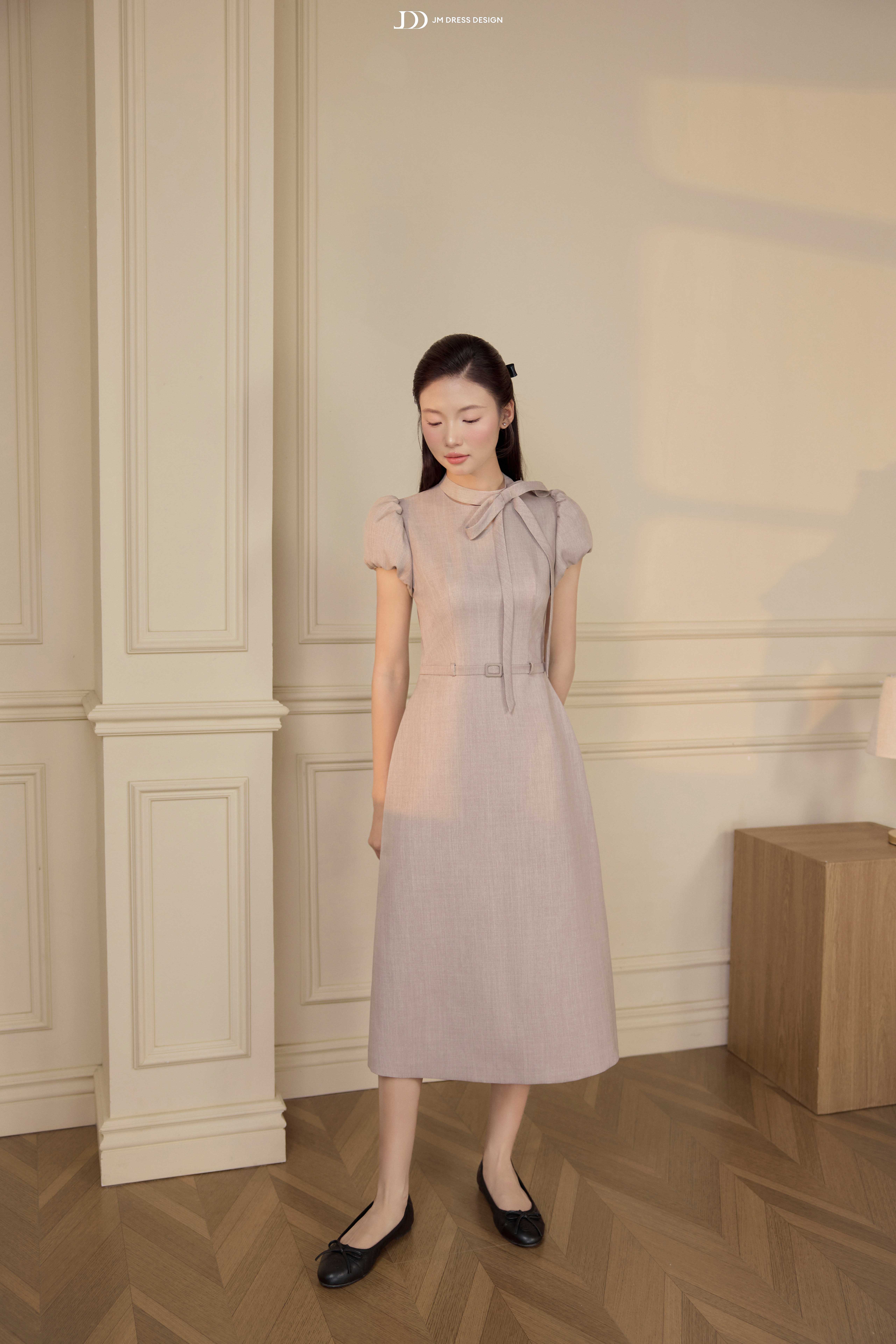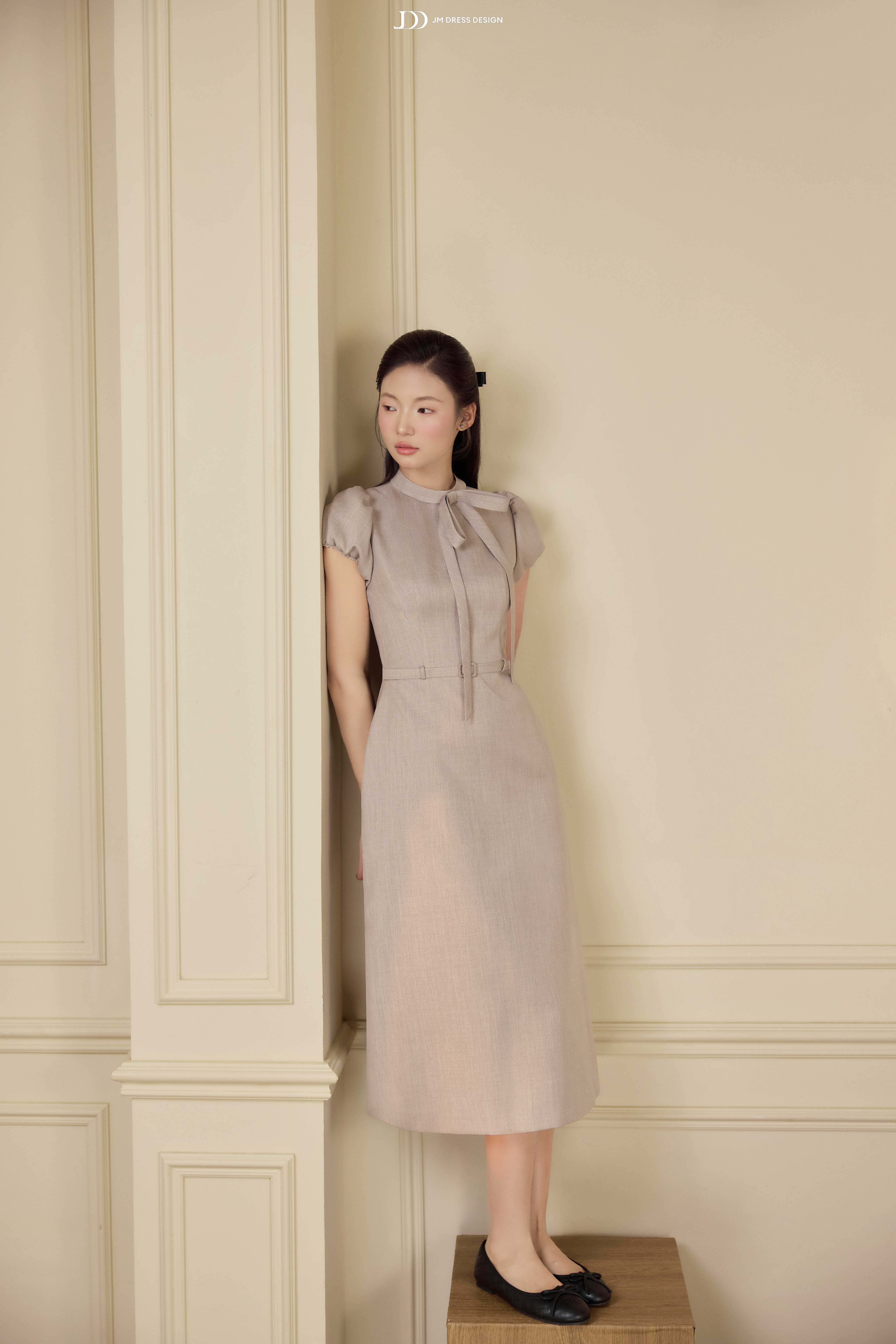Điểm nhấn nằm ở chi tiết nơ buông mềm nơi cổ, được xử lý khéo léo để tạo độ rủ tự nhiên, mang lại chiều sâu cảm xúc cho thiết kế. Phần chiết eo gọn gàng kết hợp đai thắt nhỏ cùng chất liệu giúp tôn vòng eo mà không tạo cảm giác gò bó. Tổng thể thiết kế hướng đến sự chuẩn mực, chỉn chu nhưng không cứng nhắc – đúng tinh thần quý cô công sở hiện đại.