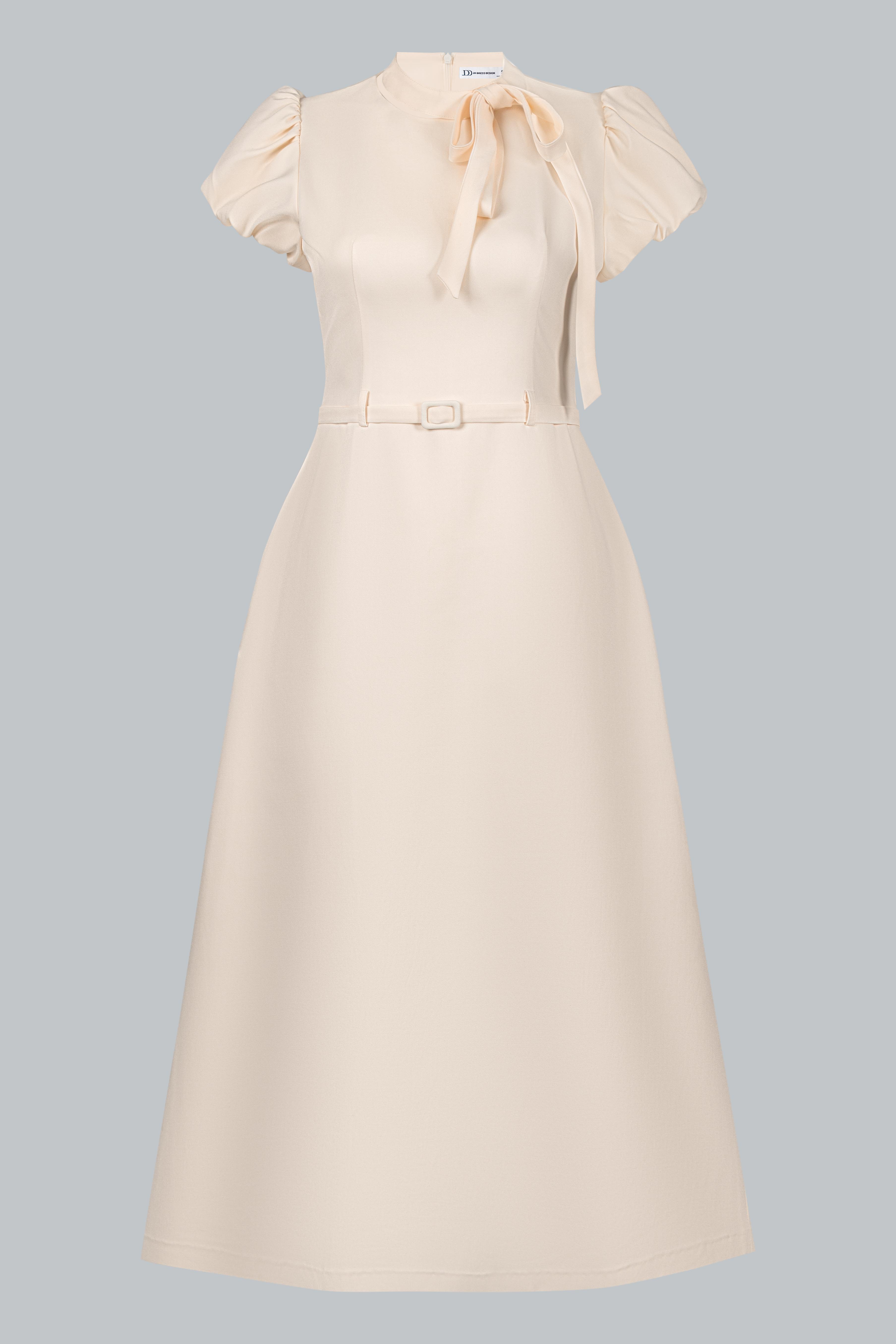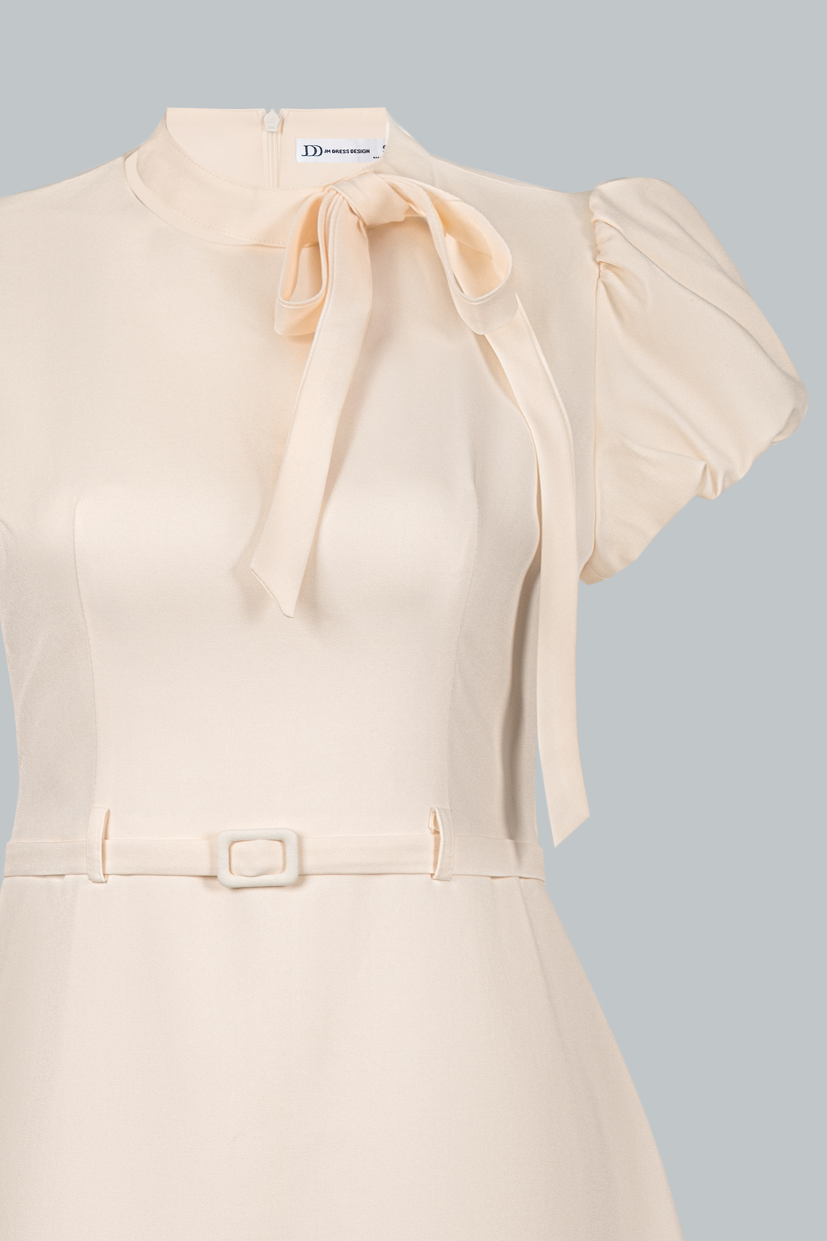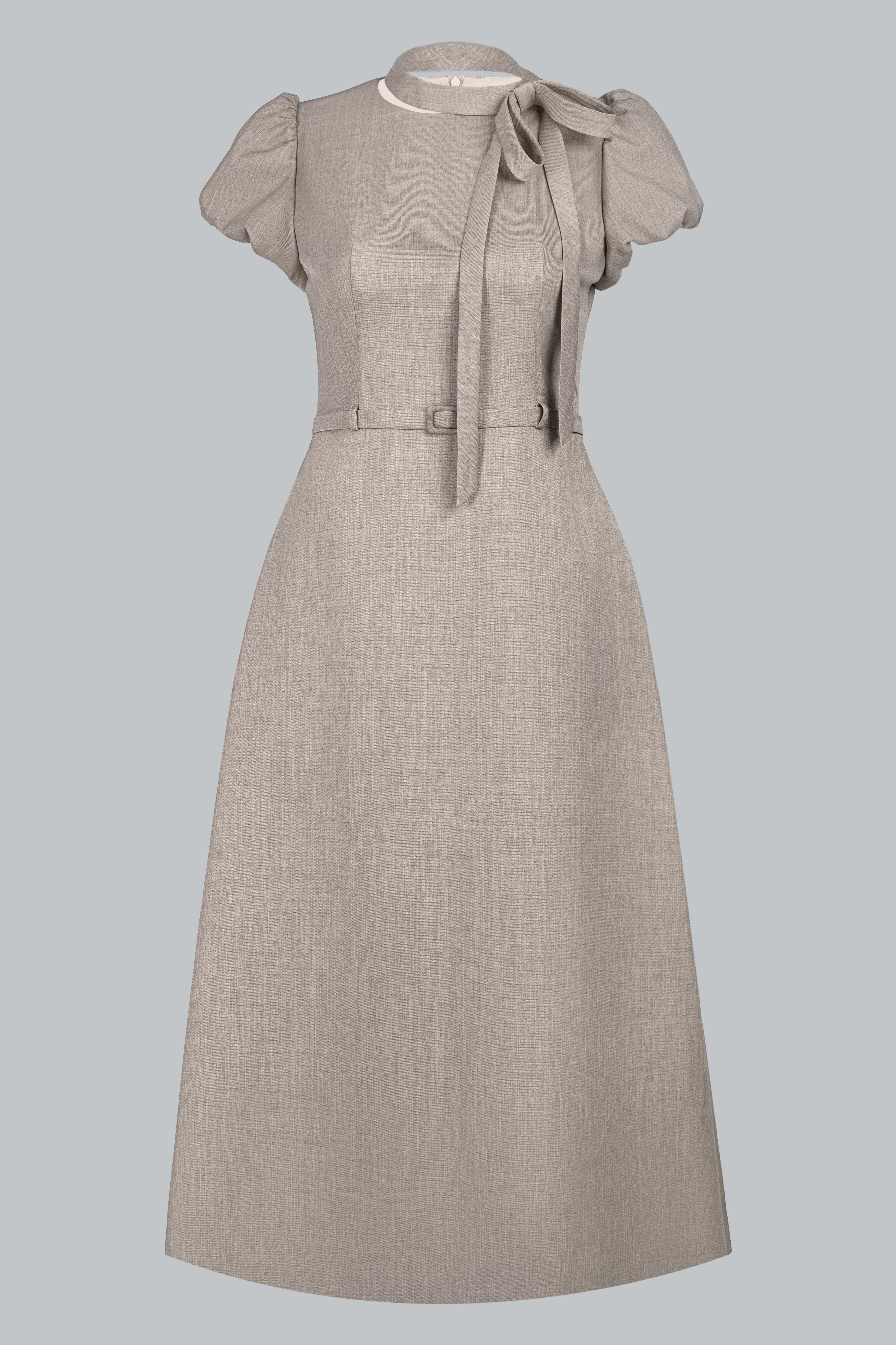 Điểm nhấn nằm ở chi tiết nơ buông mềm nơi cổ, được xử lý khéo léo để tạo độ rủ tự nhiên, mang lại chiều sâu cảm xúc cho thiết kế. Phần chiết eo gọn gàng kết hợp đai thắt nhỏ cùng chất liệu giúp tôn vòng eo mà không tạo cảm giác gò bó. Tổng thể thiết kế hướng đến sự chuẩn mực, chỉn chu nhưng không cứng nhắc – đúng tinh thần quý cô công sở hiện đại.