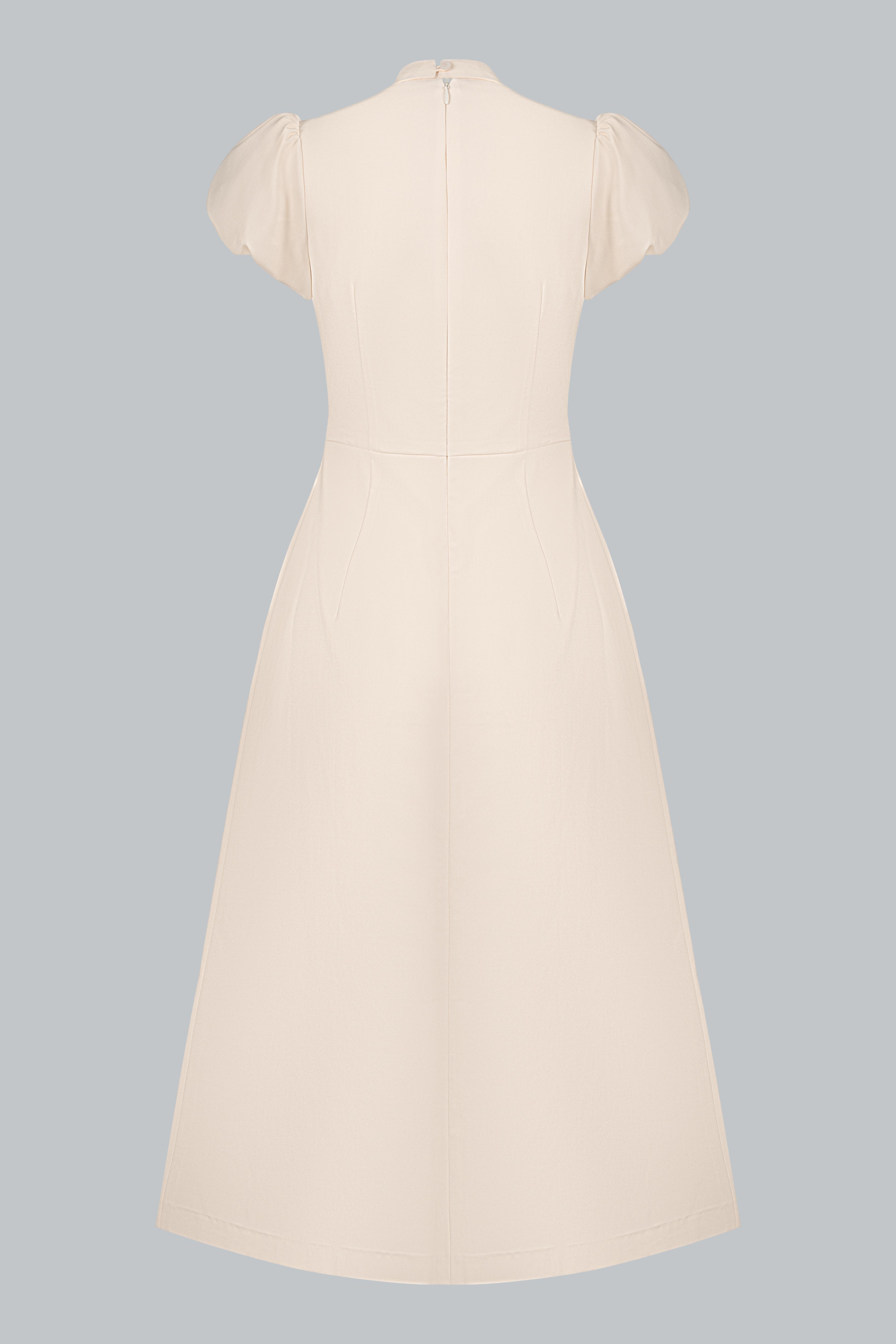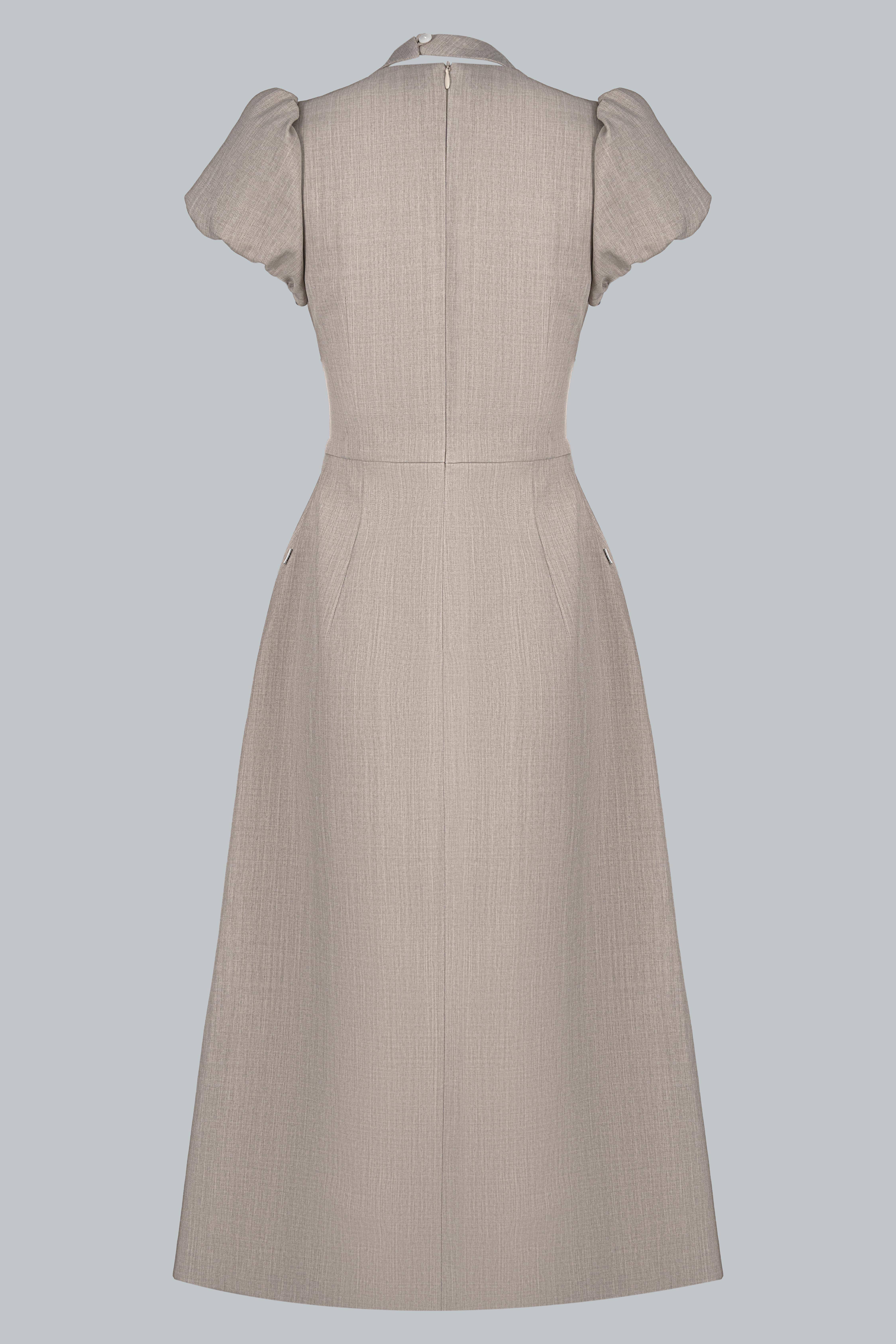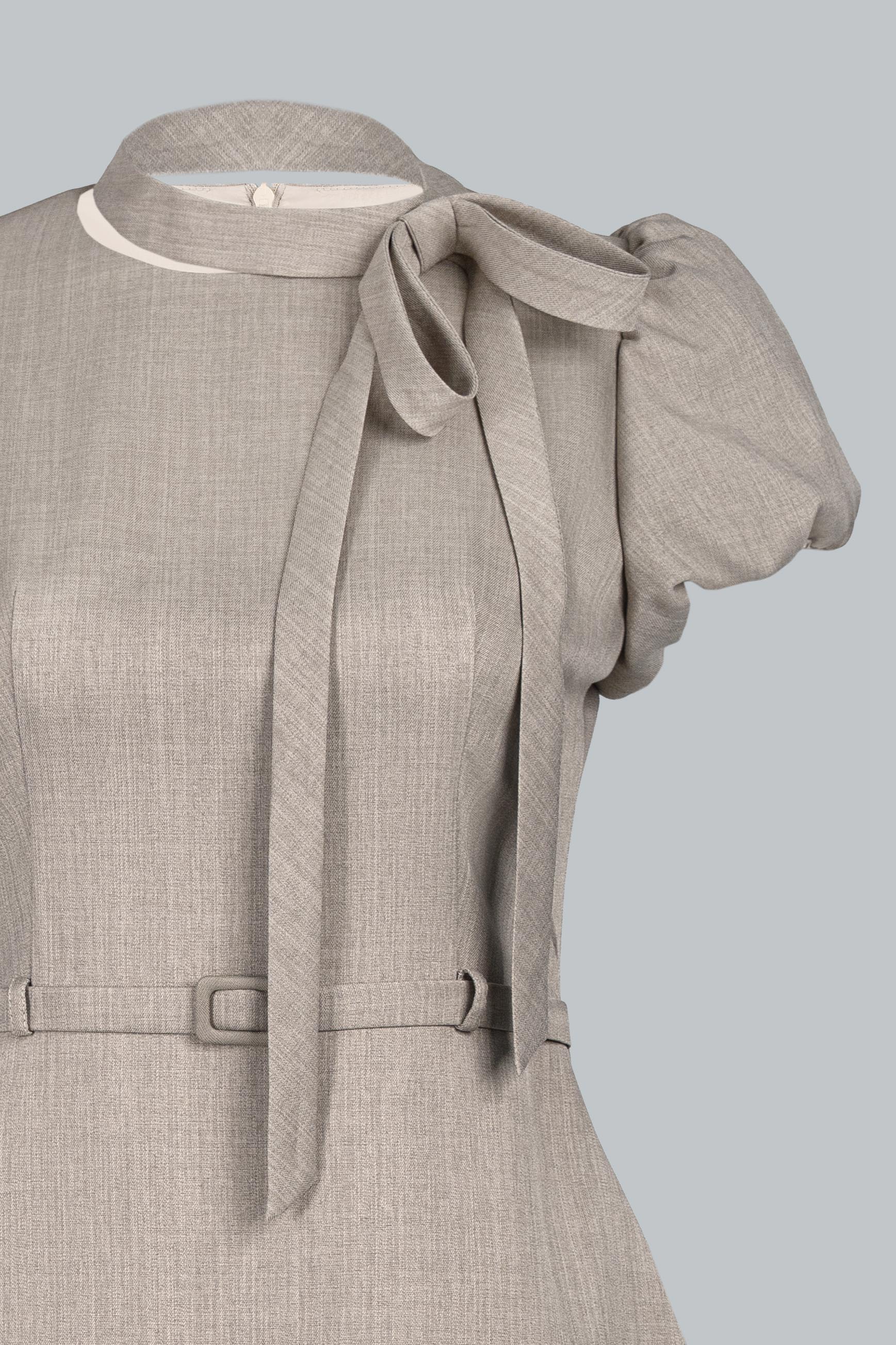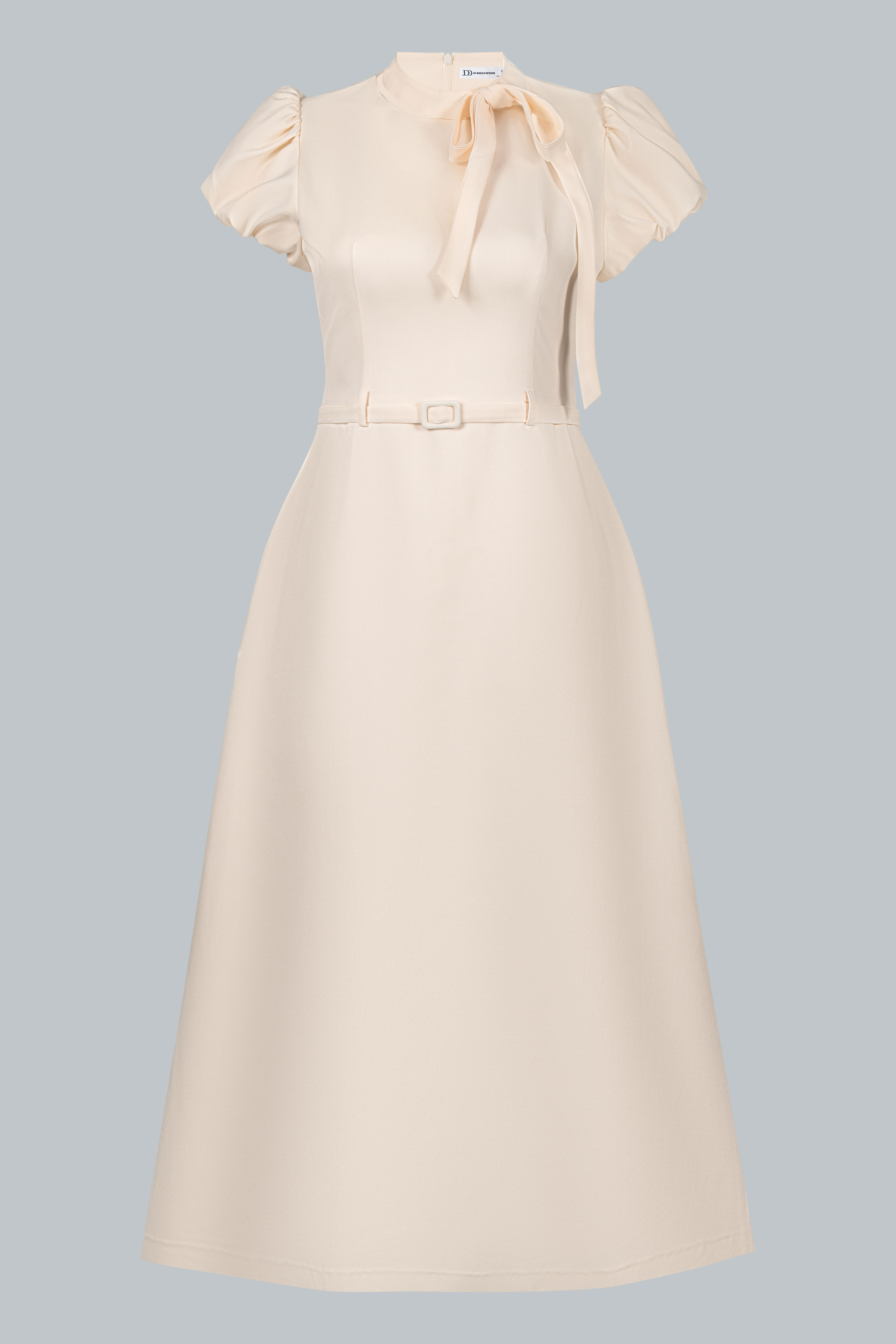 Điểm nhấn nằm ở chi tiết nơ buông mềm nơi cổ, được xử lý khéo léo để tạo độ rủ tự nhiên, mang lại chiều sâu cảm xúc cho thiết kế. Phần chiết eo gọn gàng kết hợp đai thắt nhỏ cùng chất liệu giúp tôn vòng eo mà không tạo cảm giác gò bó. Tổng thể thiết kế hướng đến sự chuẩn mực, chỉn chu nhưng không cứng nhắc – đúng tinh thần quý cô công sở hiện đại.