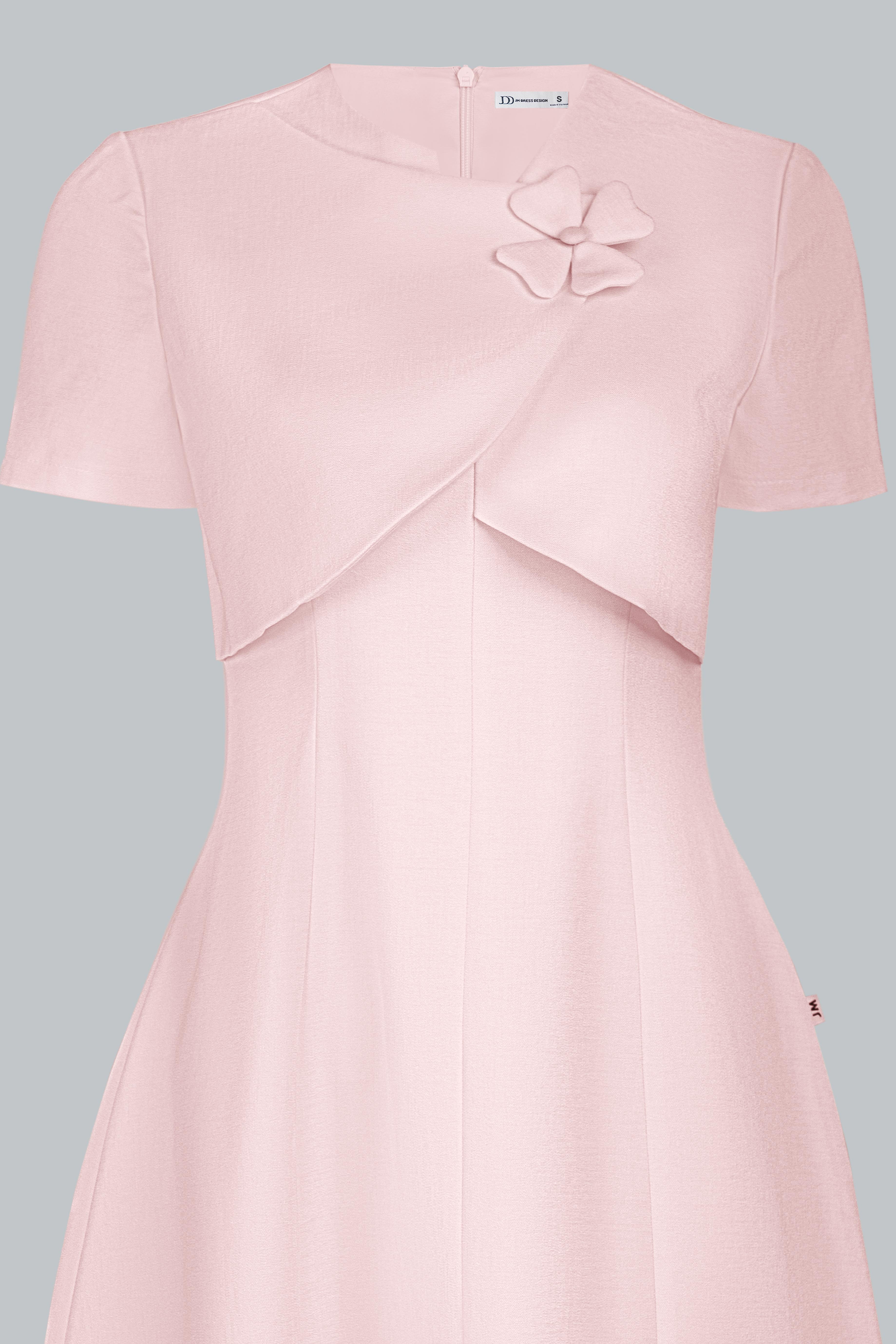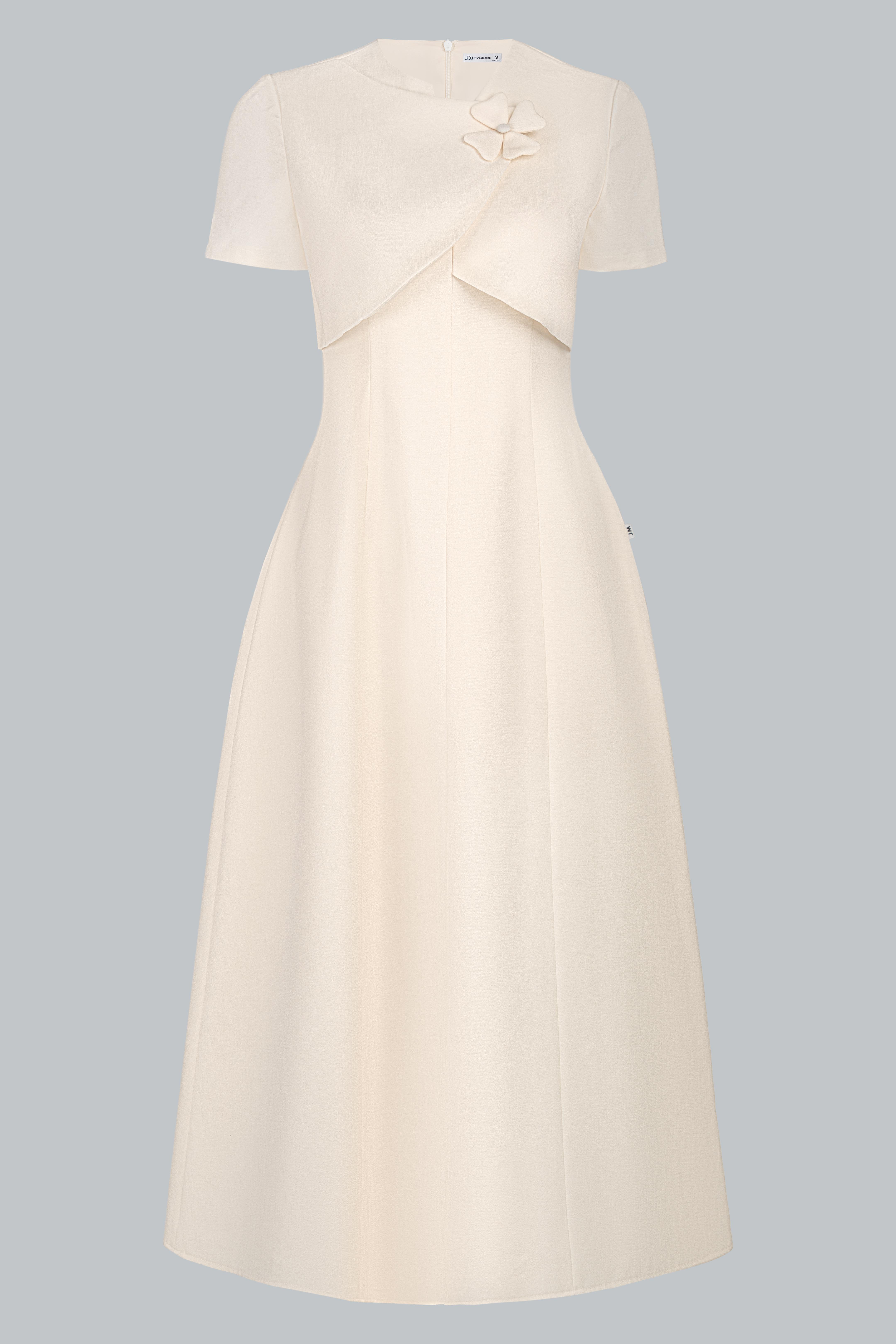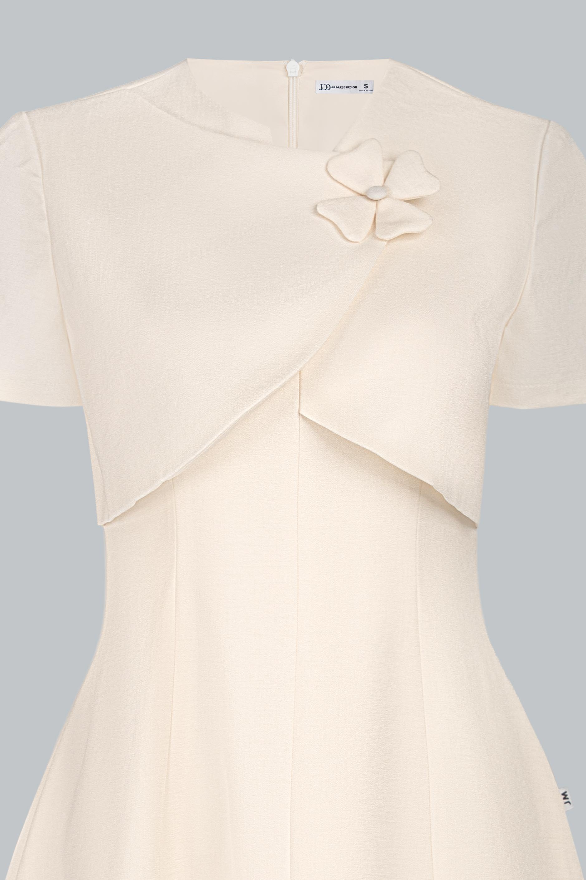 Điểm nhấn nằm ở chi tiết vạt xếp chéo bất đối xứng nơi thân trước, tạo hiệu ứng layering mềm mại như một lớp áo khoác nhẹ, mang lại chiều sâu cho thiết kế. Hoa vải nhỏ đính thủ công cùng tone màu được đặt tinh tế, tăng nét nữ tính mà không làm mất đi vẻ trang nhã.