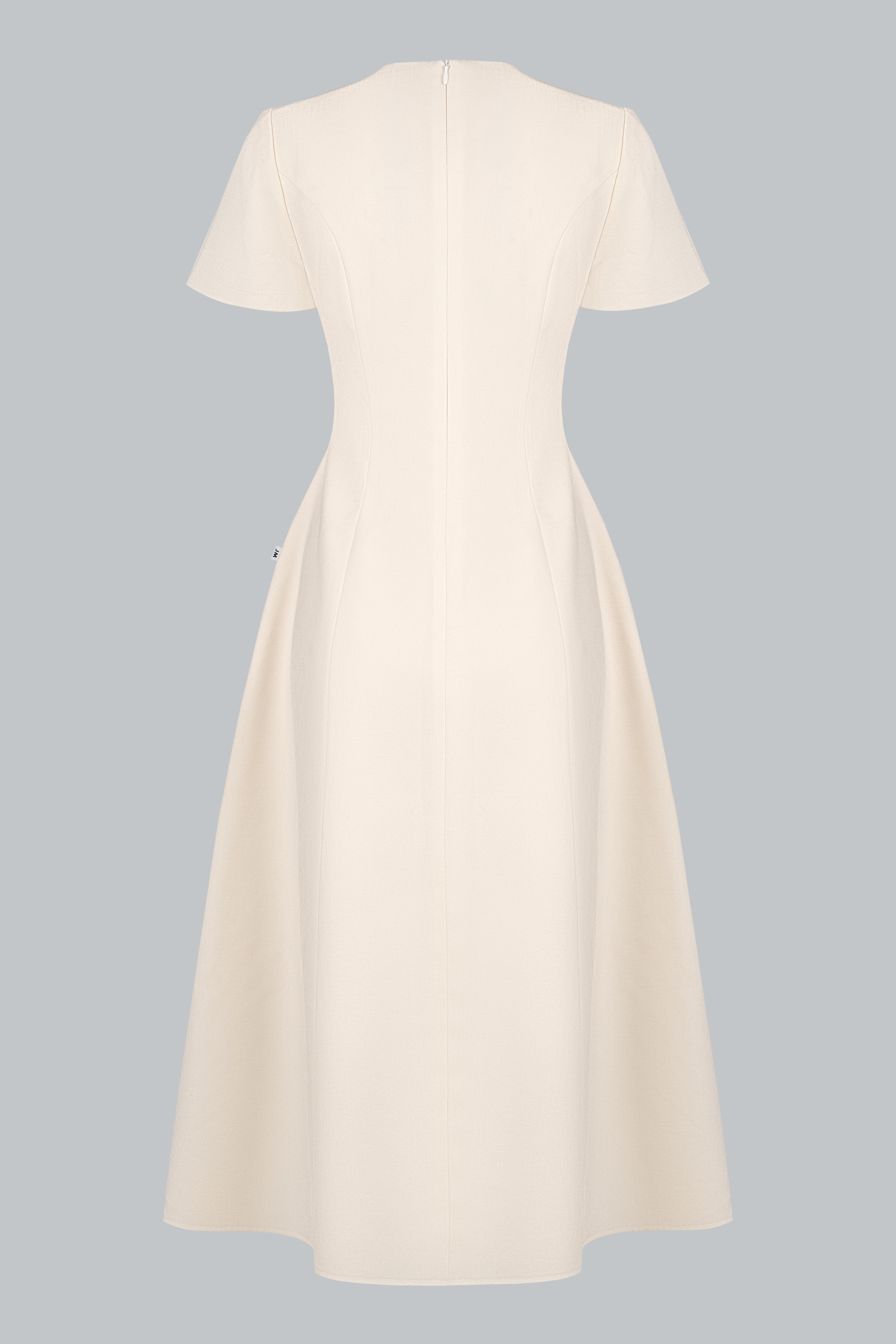 Đầm midi dáng A với chiều dài qua gối, độ xòe vừa phải tạo sự cân đối và tôn dáng tự nhiên.