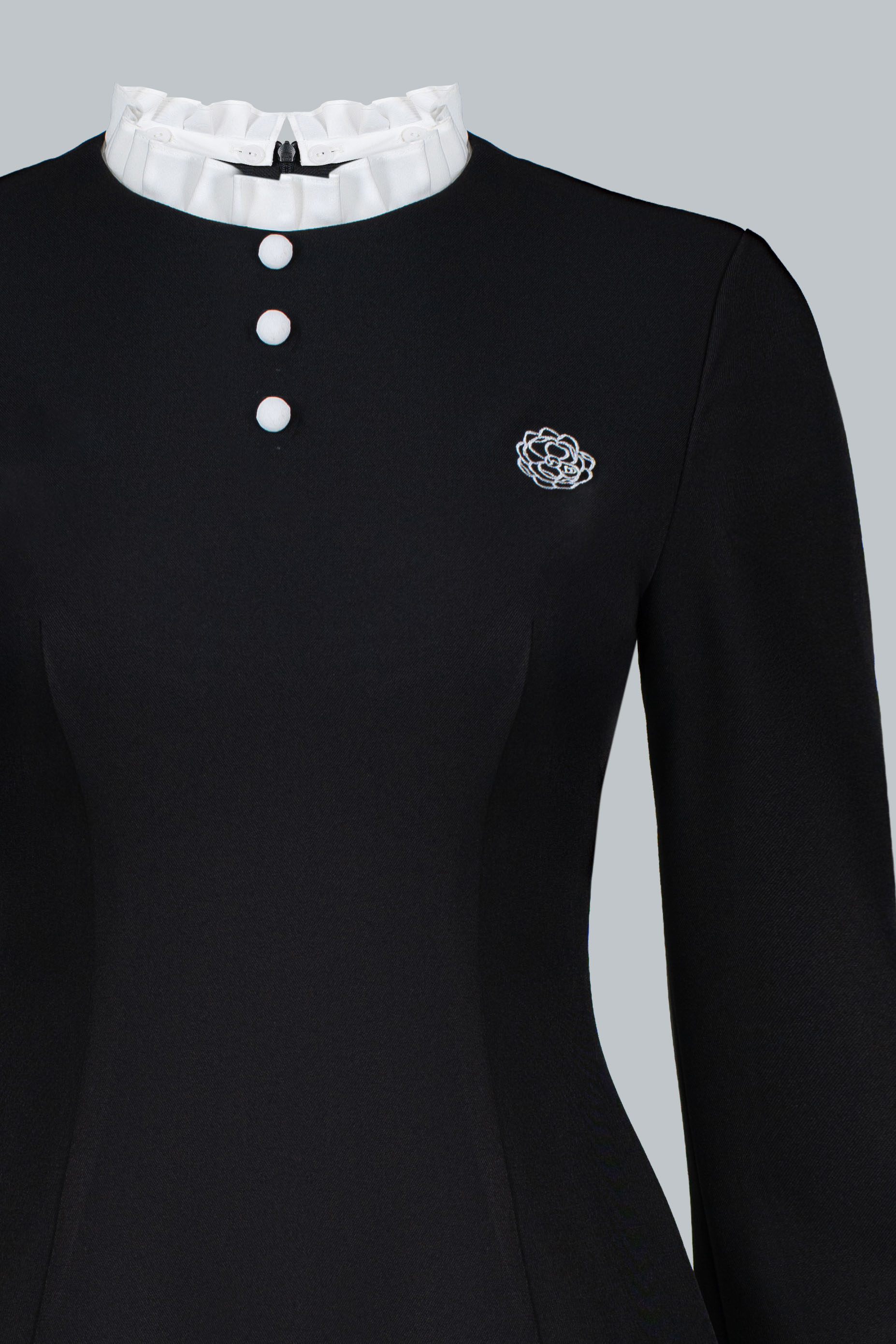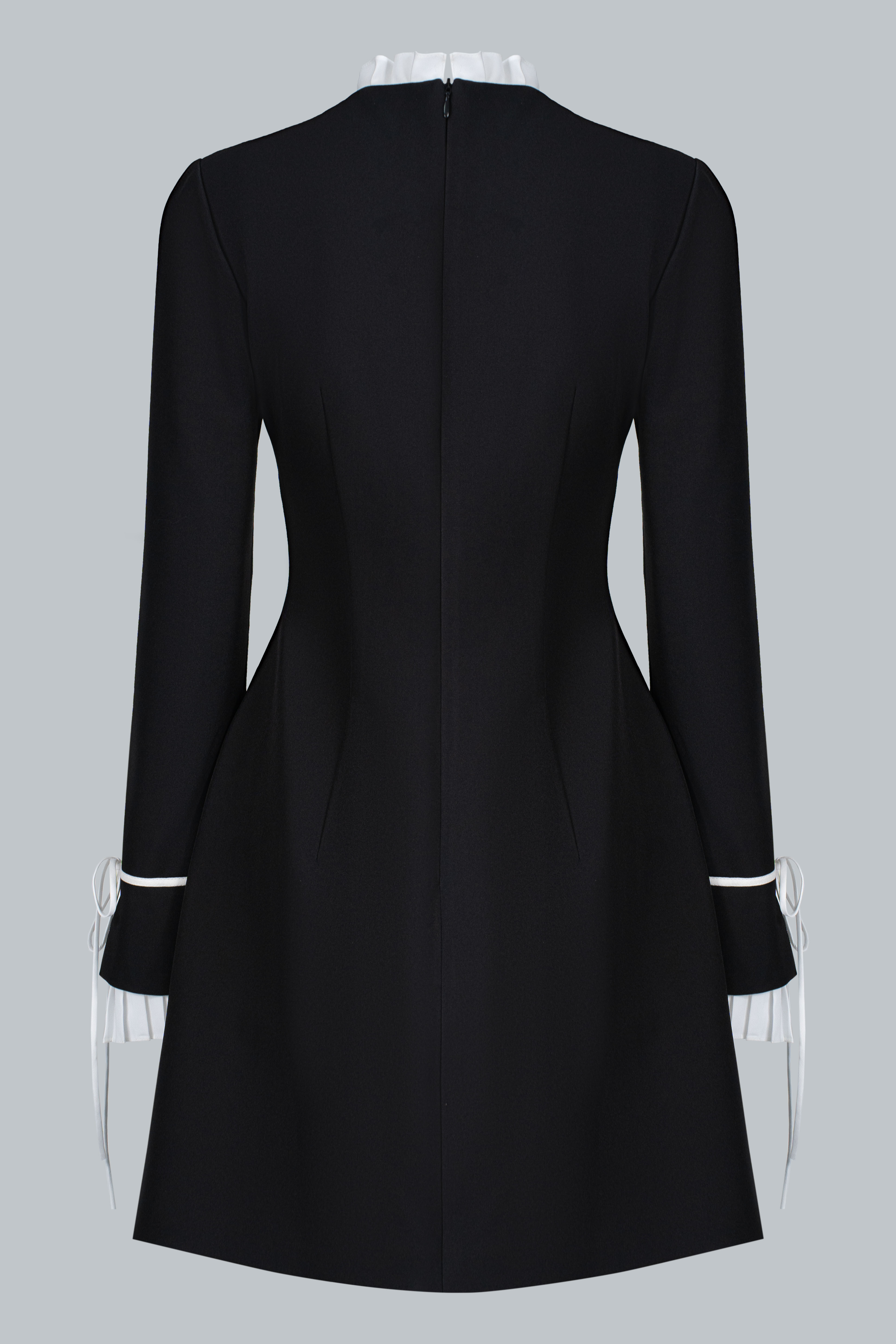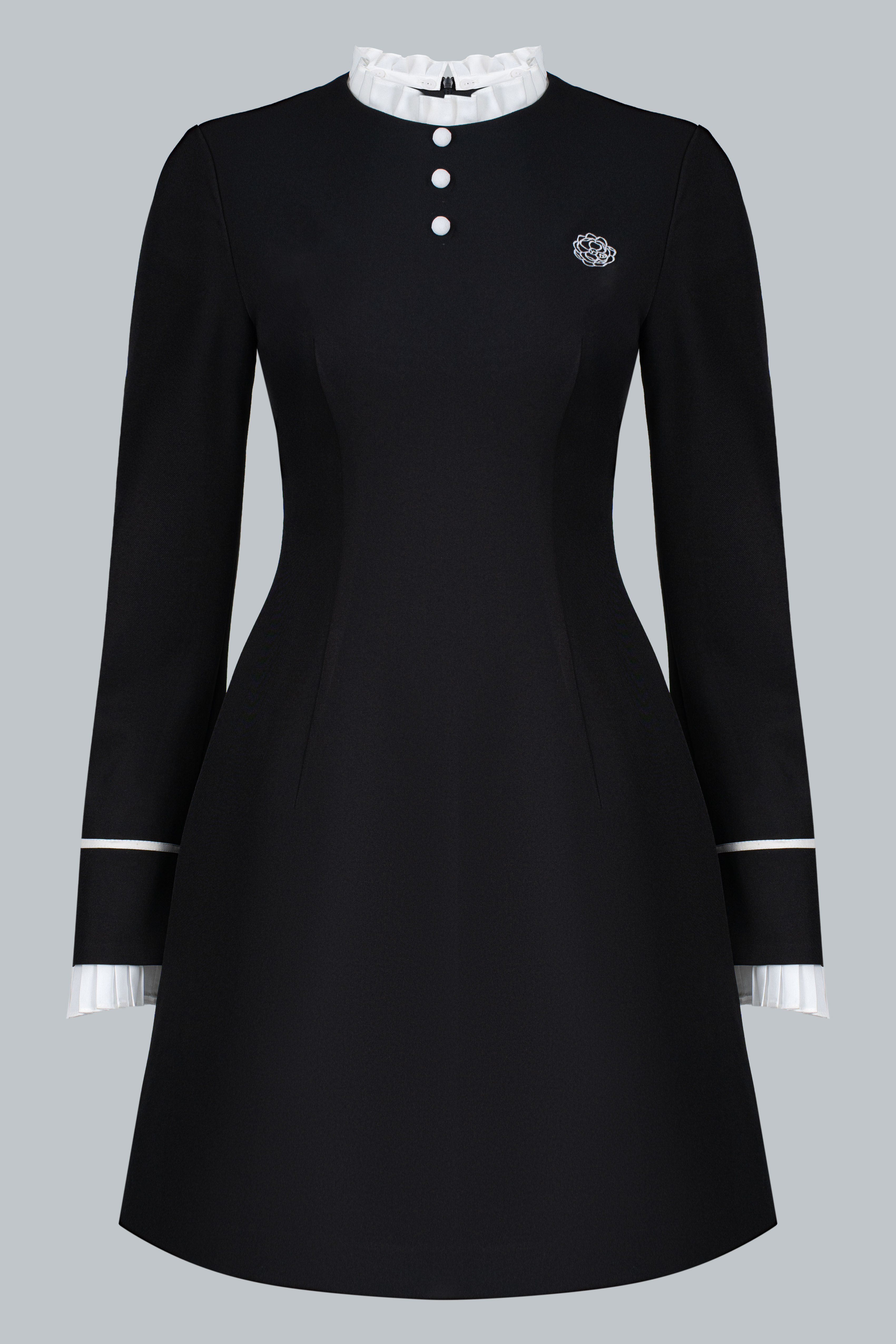 Tựa một dấu lặng cổ điển giữa nhịp chuyển hiện đại. Chiếc đầm mang đến vẻ thanh lịch nền nã, nổi bật qua những tương phản được tiết chế khéo léo: cổ bèo sáng màu đặt tinh gọn trên nền tối, phần tay áo xếp ly có thể linh hoạt tháo rời, và phom váy ôm nhẹ, dài vừa đủ để giữ trọn sự kín đáo. Một lựa chọn không cần quá nhiều điểm nhấn, nhưng vẫn đủ để tạo nên bản sắc rất riêng.