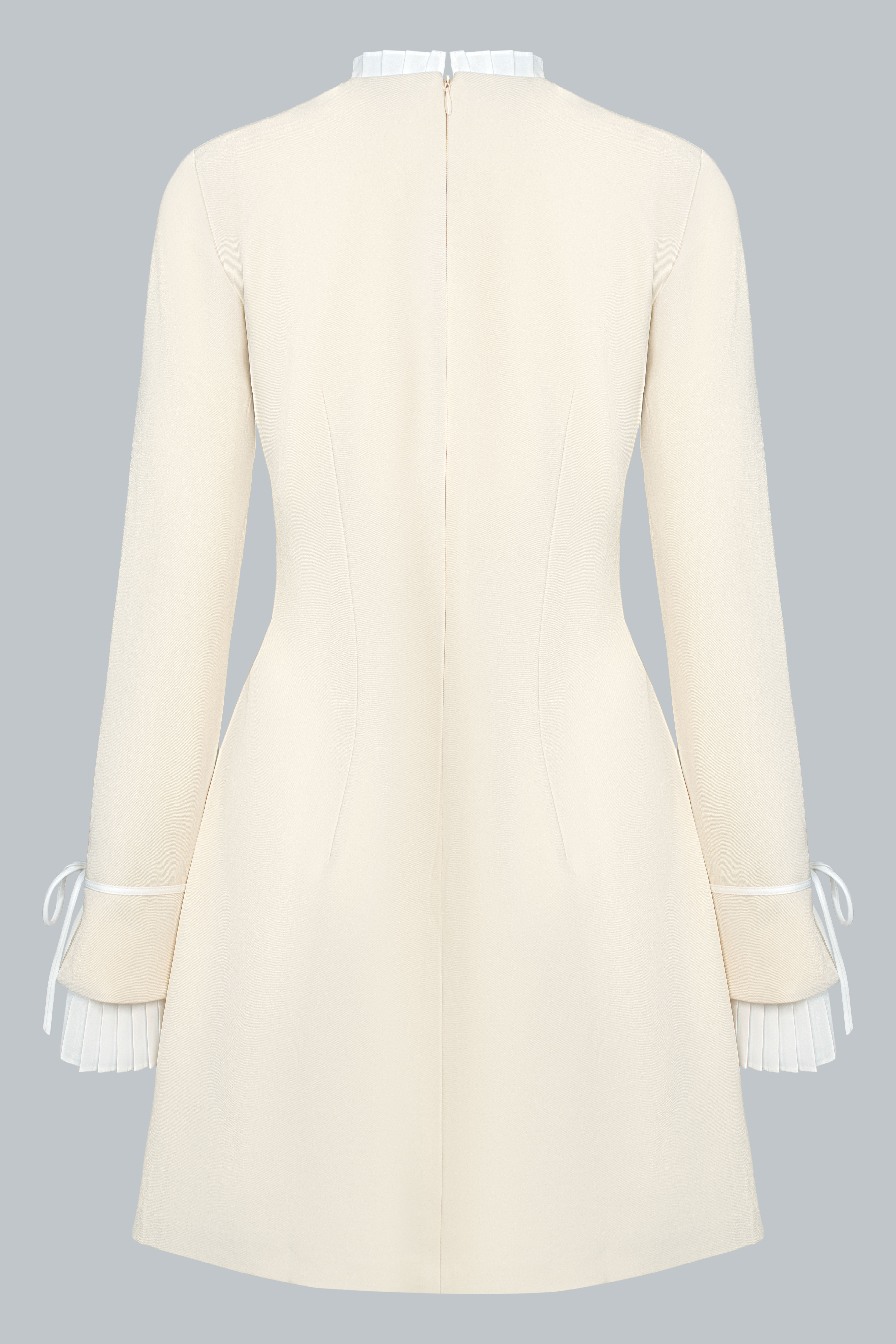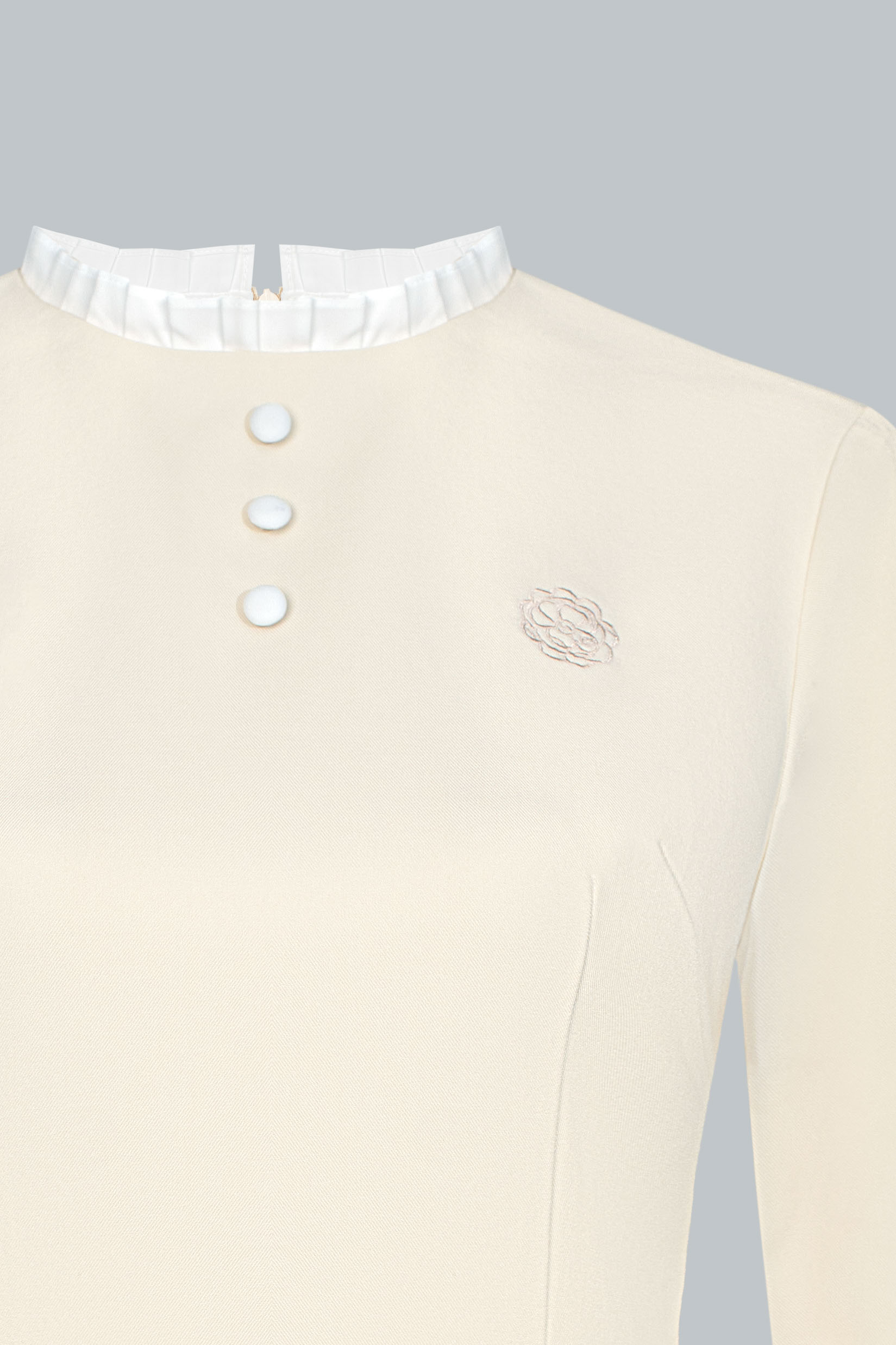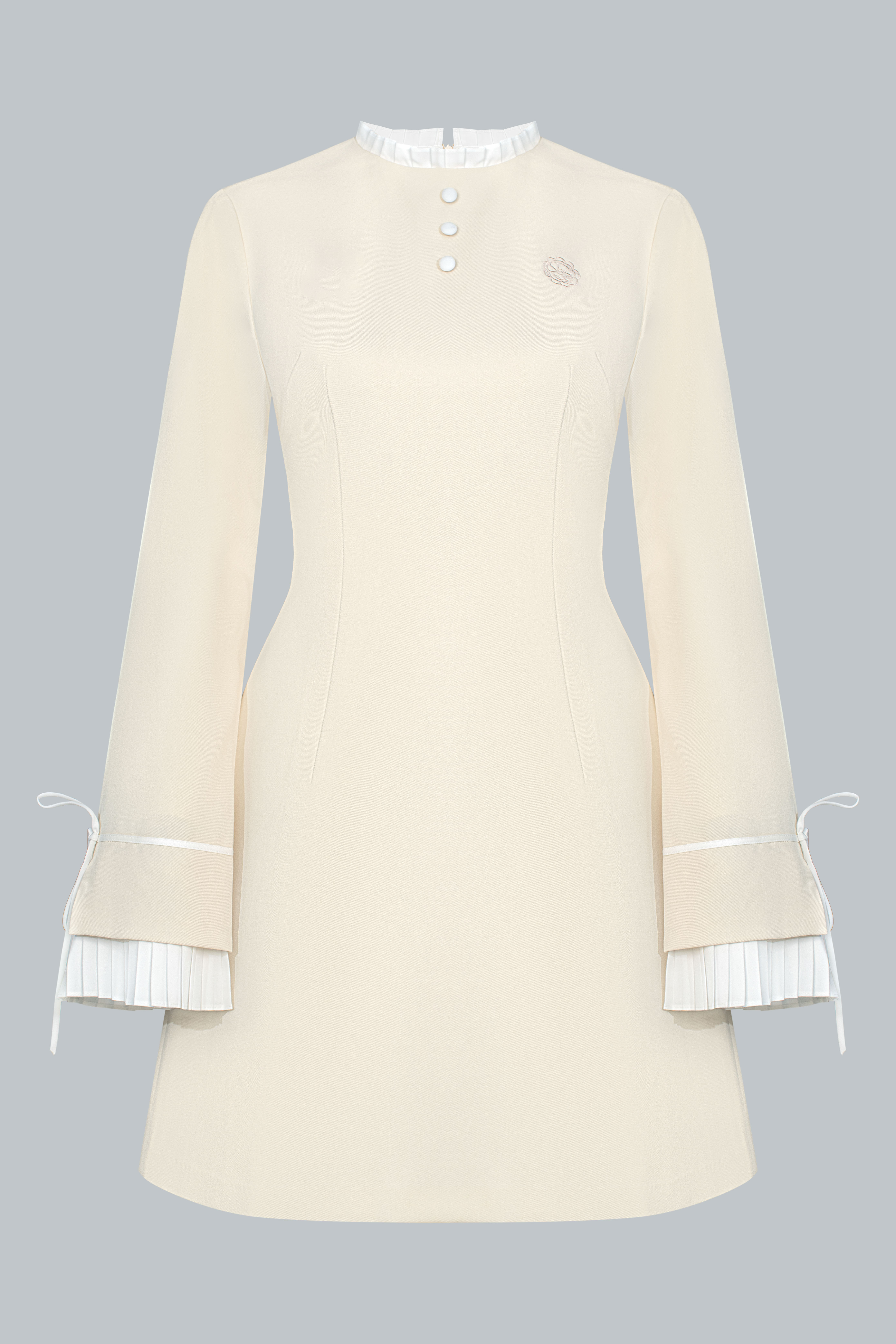 Tựa một dấu lặng cổ điển giữa nhịp chuyển hiện đại. Chiếc đầm mang đến vẻ thanh lịch nền nã, nổi bật qua những tương phản được tiết chế khéo léo: cổ bèo sáng màu đặt tinh gọn trên nền tối, phần tay áo xếp ly có thể linh hoạt tháo rời, và phom váy ôm nhẹ, dài vừa đủ để giữ trọn sự kín đáo. Một lựa chọn không cần quá nhiều điểm nhấn, nhưng vẫn đủ để tạo nên bản sắc rất riêng.