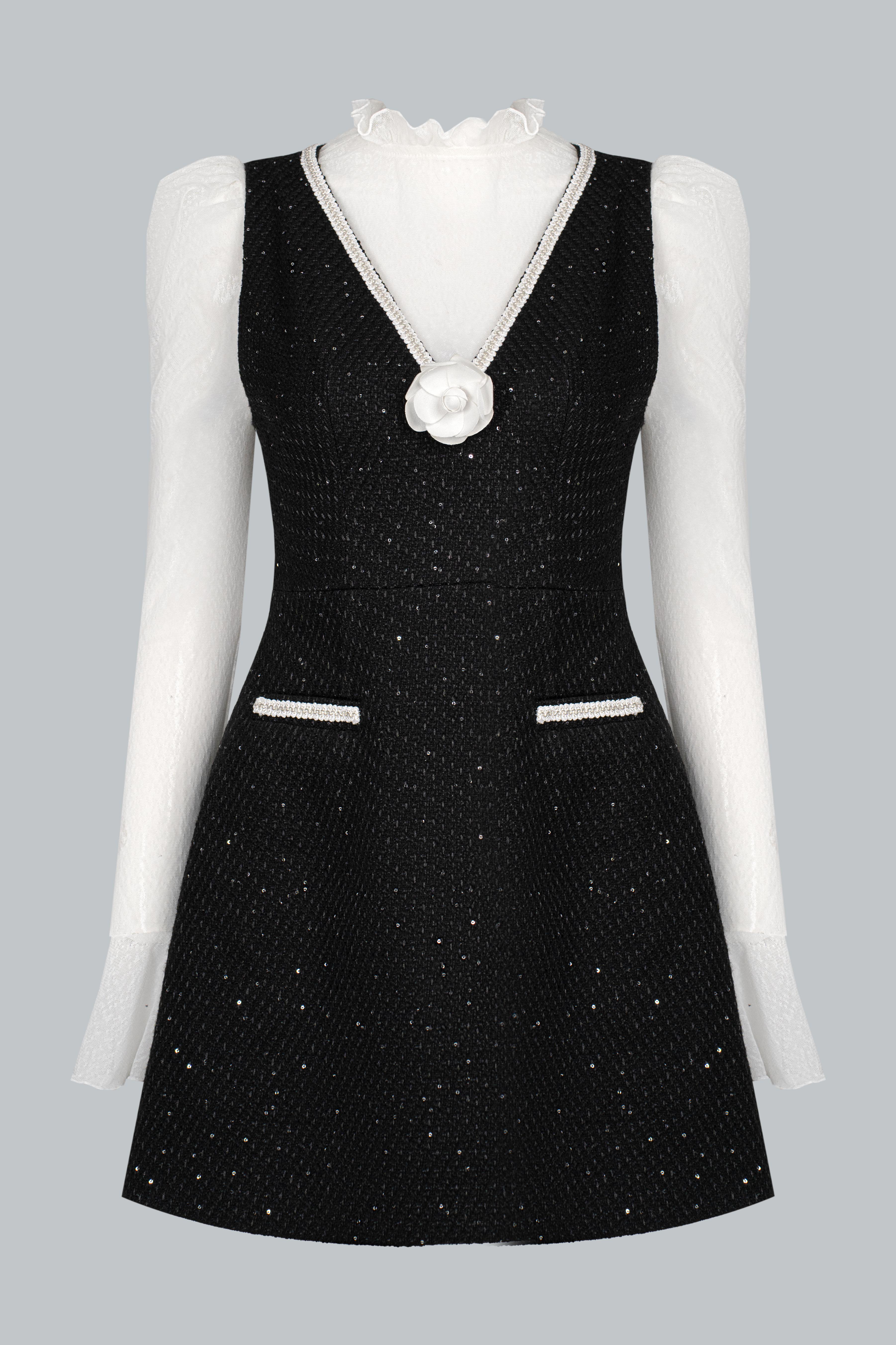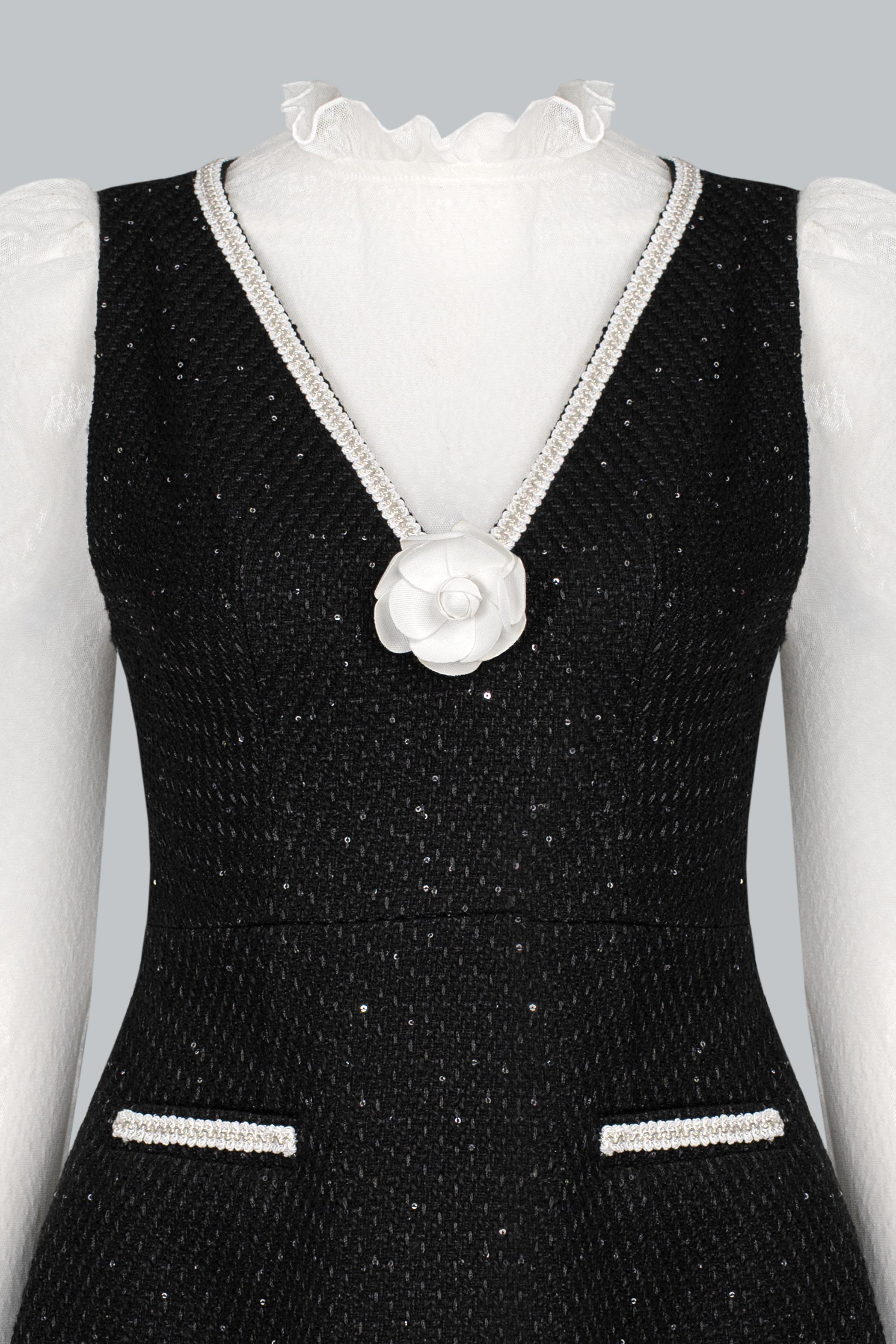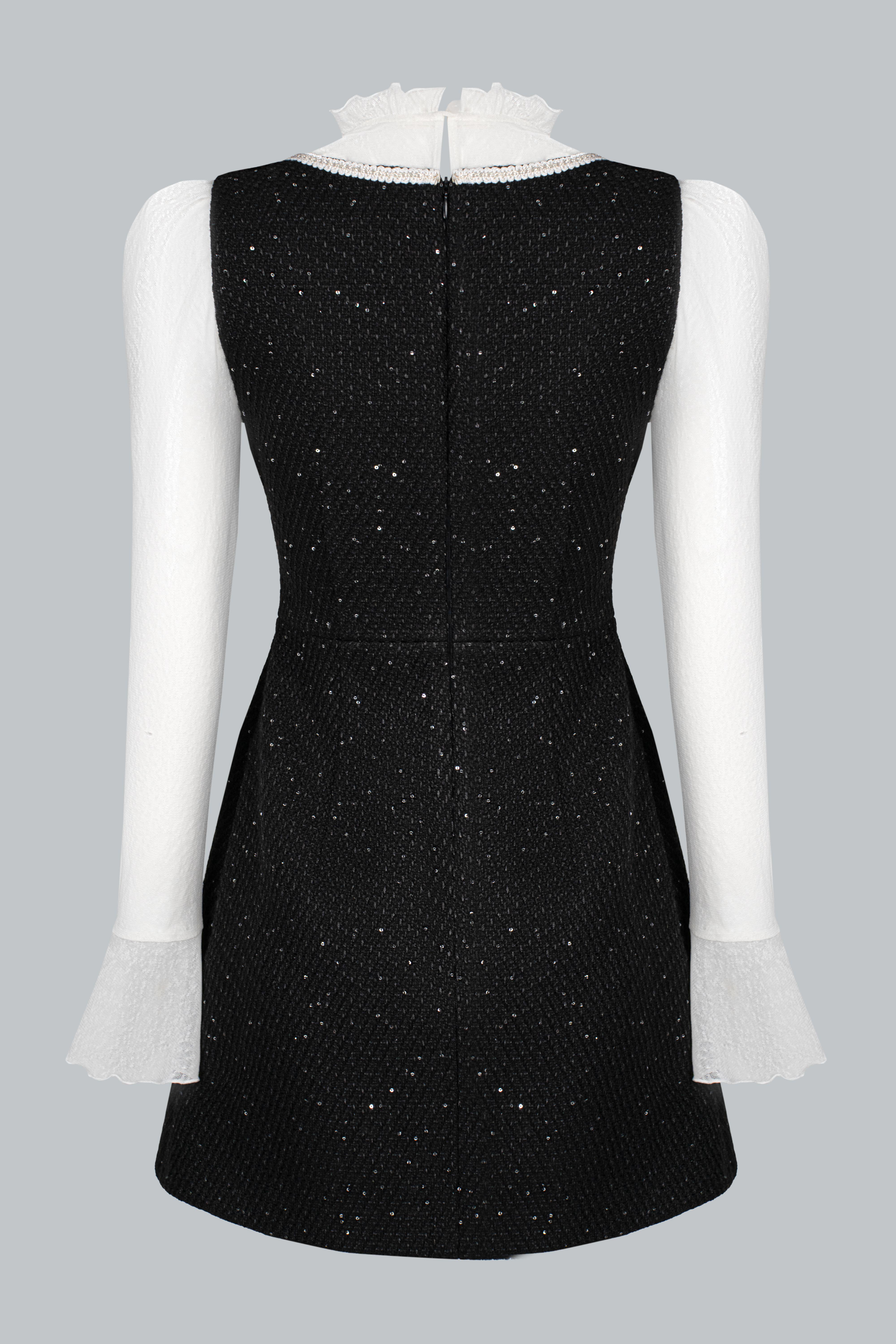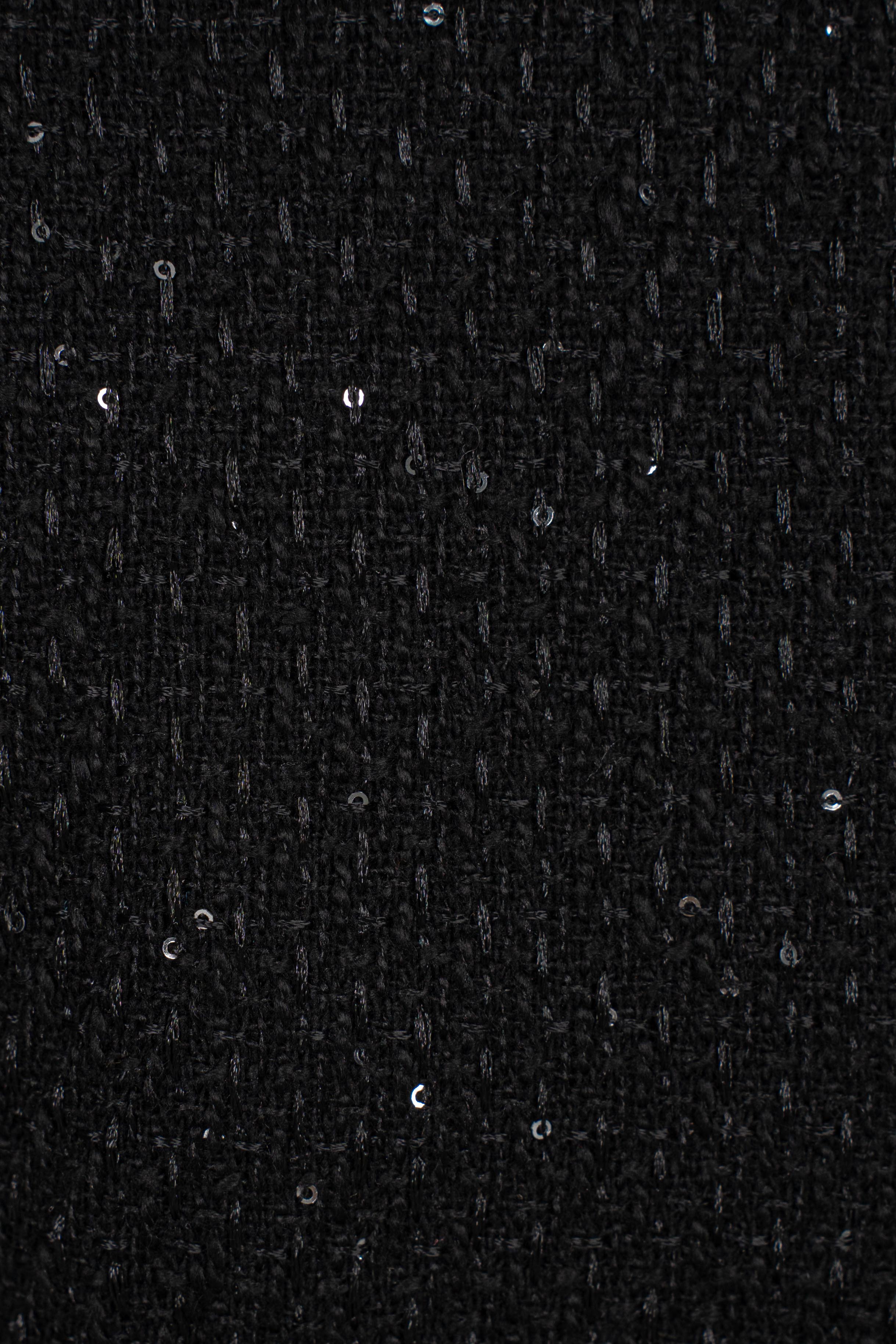 Tweed ánh kim đen sang trọng giữ phom ổn định; lớp kim sa đính tay tinh xảo nâng tầm thiết kế. Lớp áo len trắng mềm mại bên trong tạo cảm giác ấm áp, dễ chịu và làm nổi bật sự tương phản đầy dụng ý.