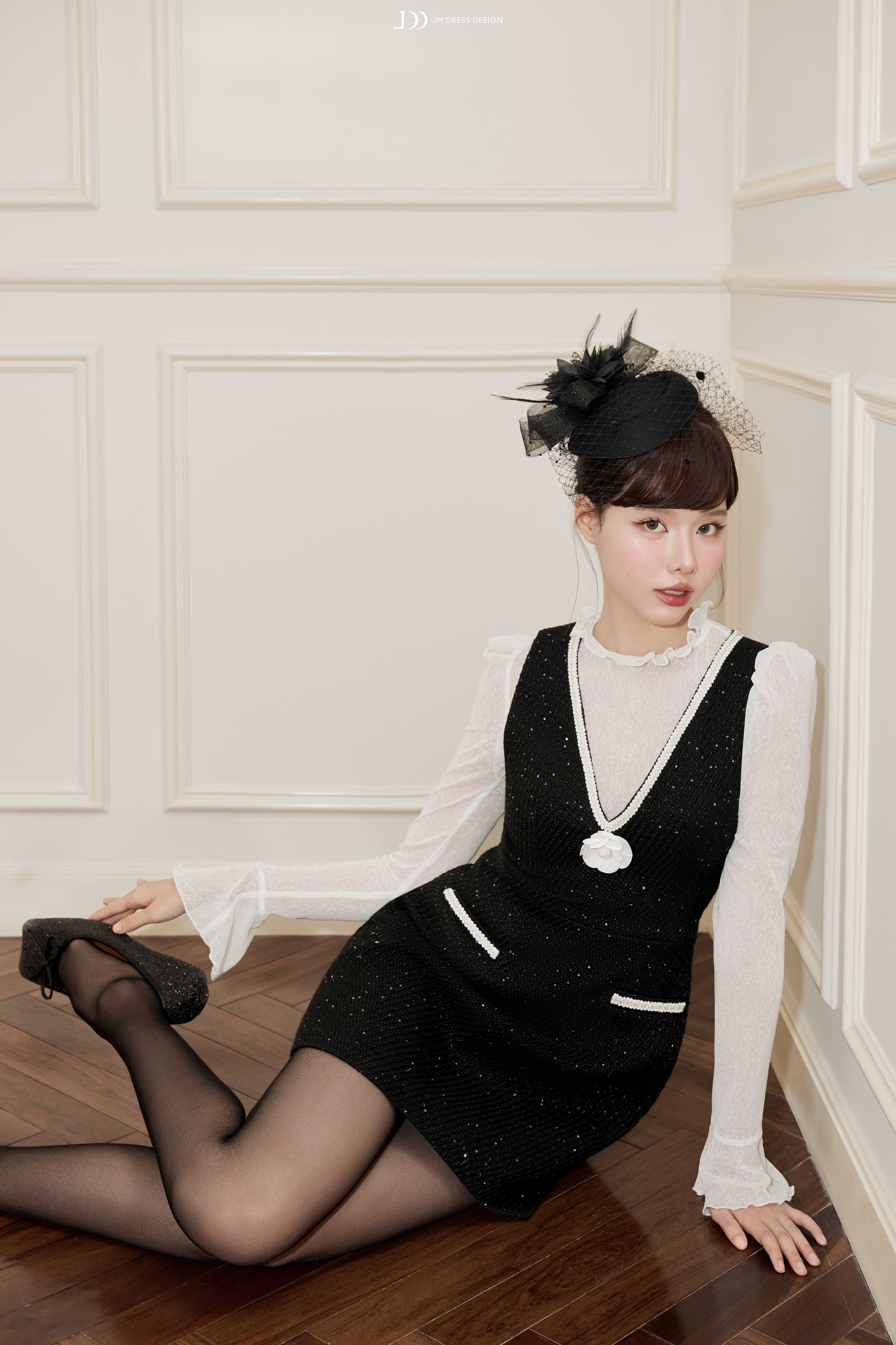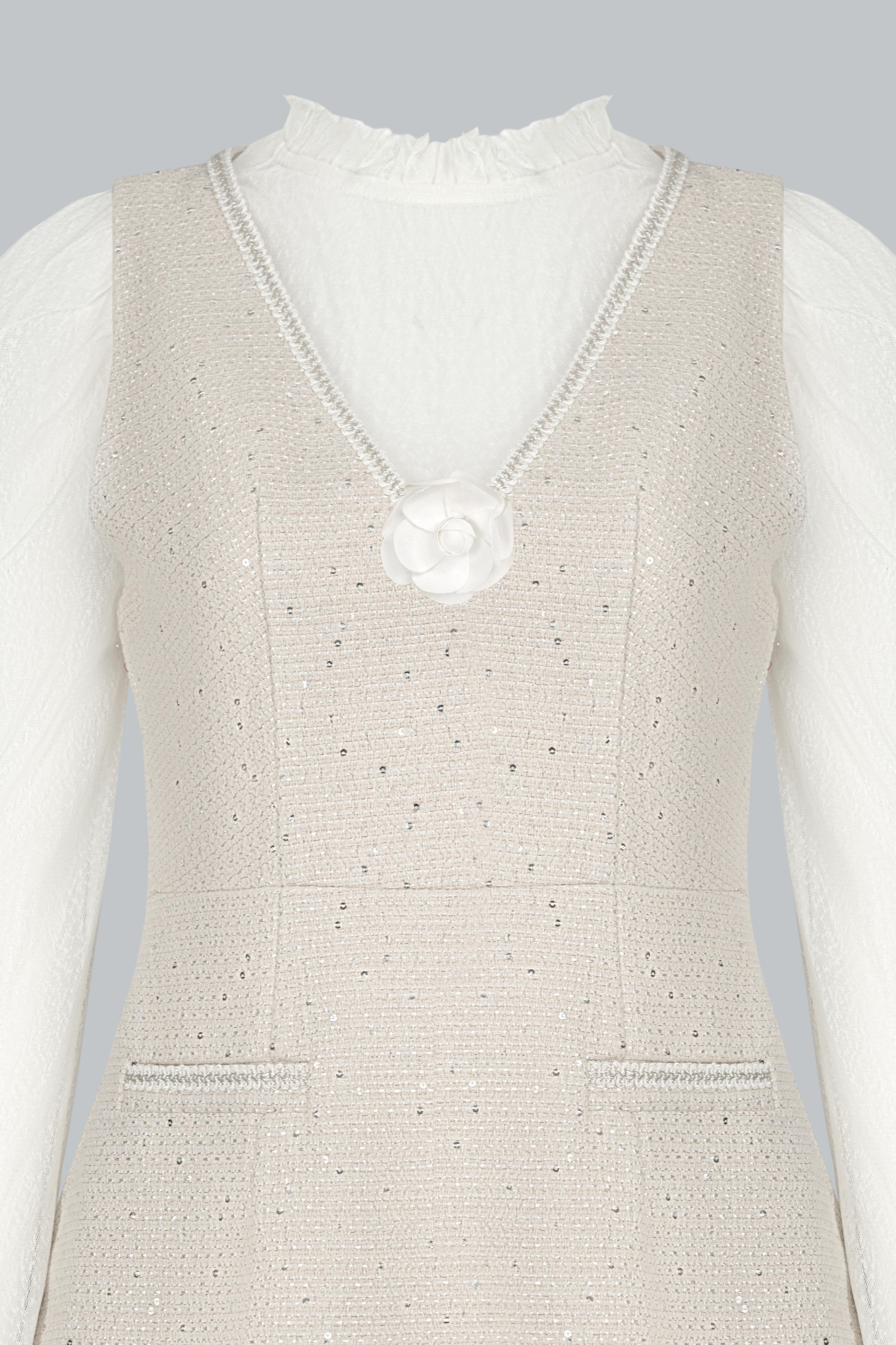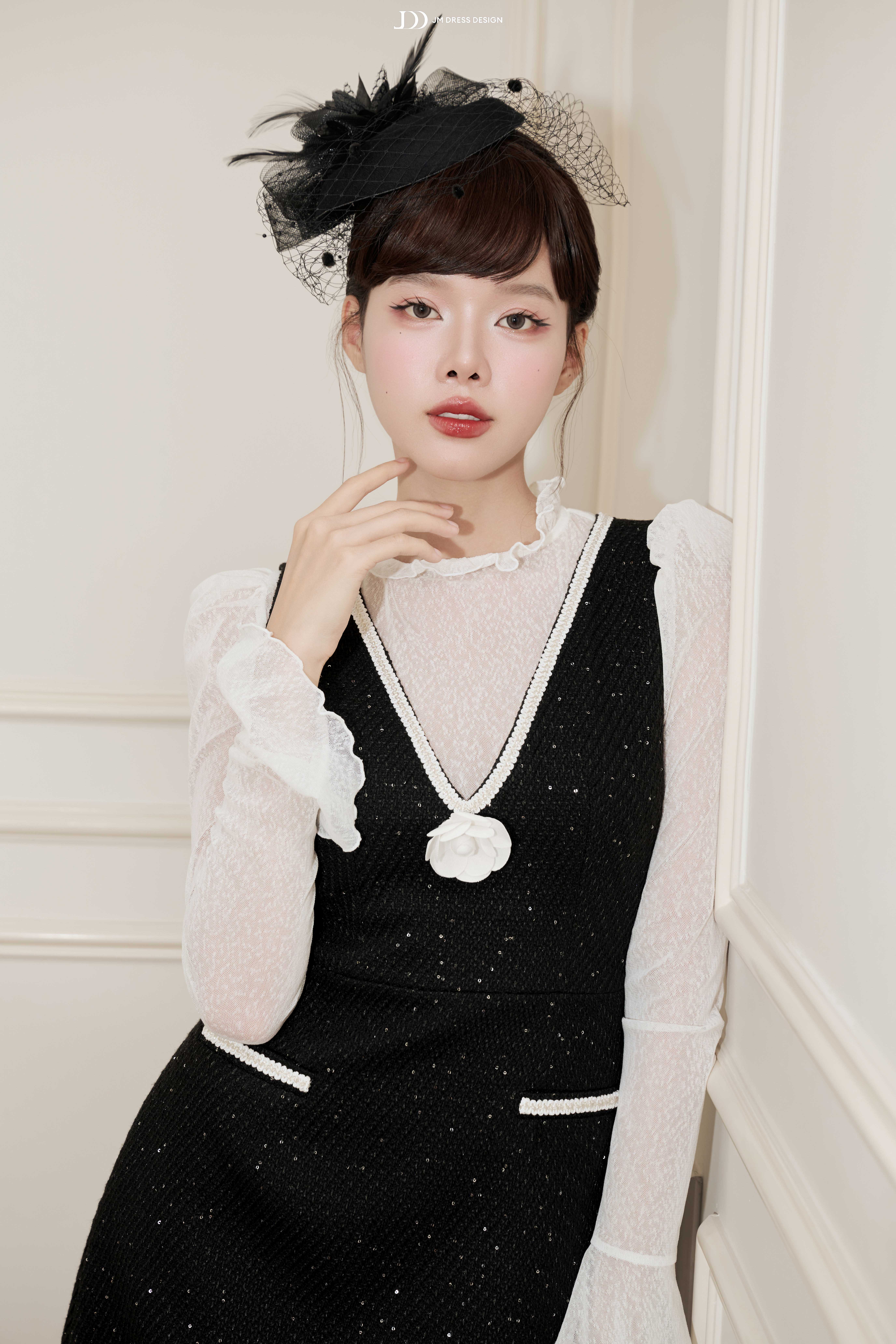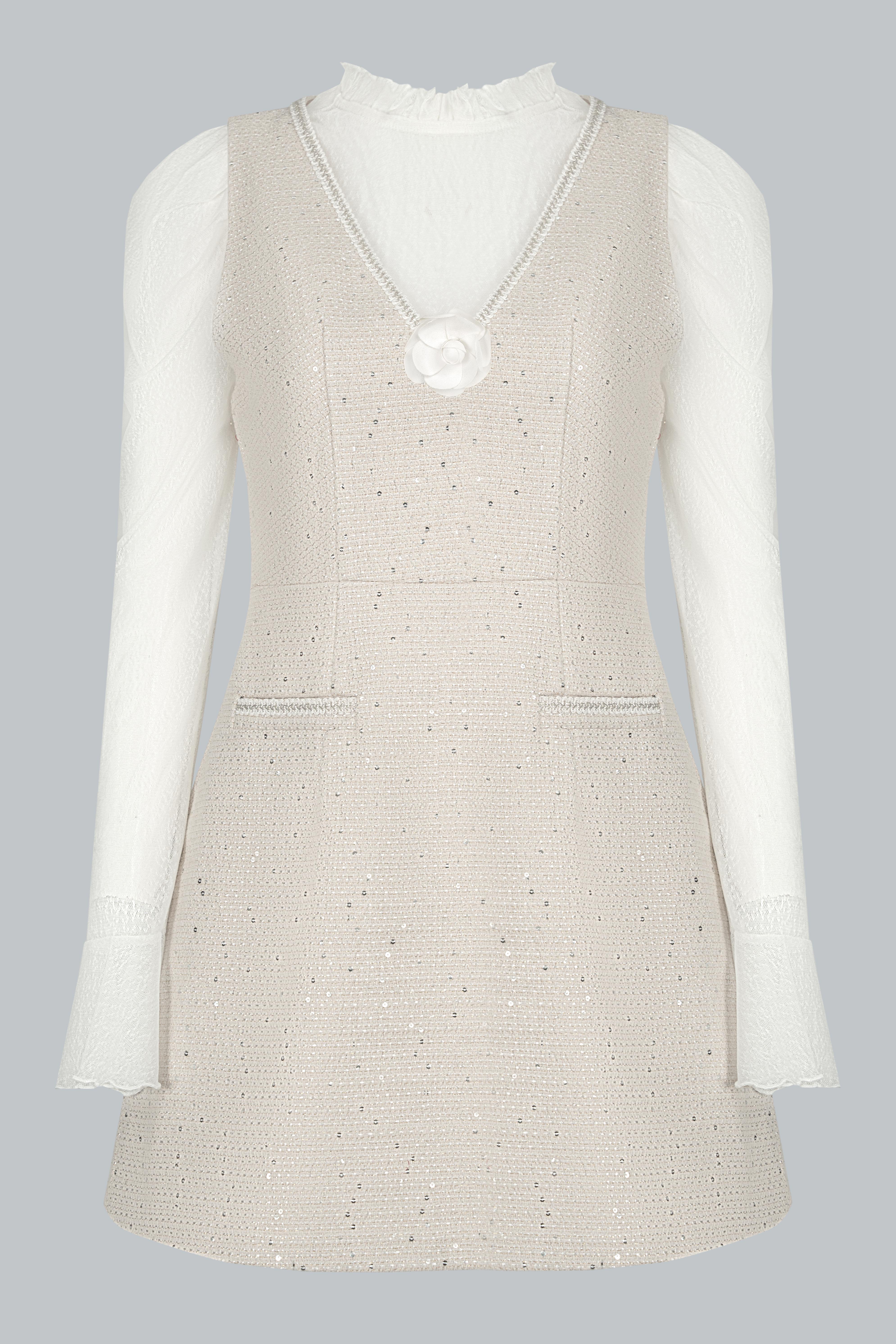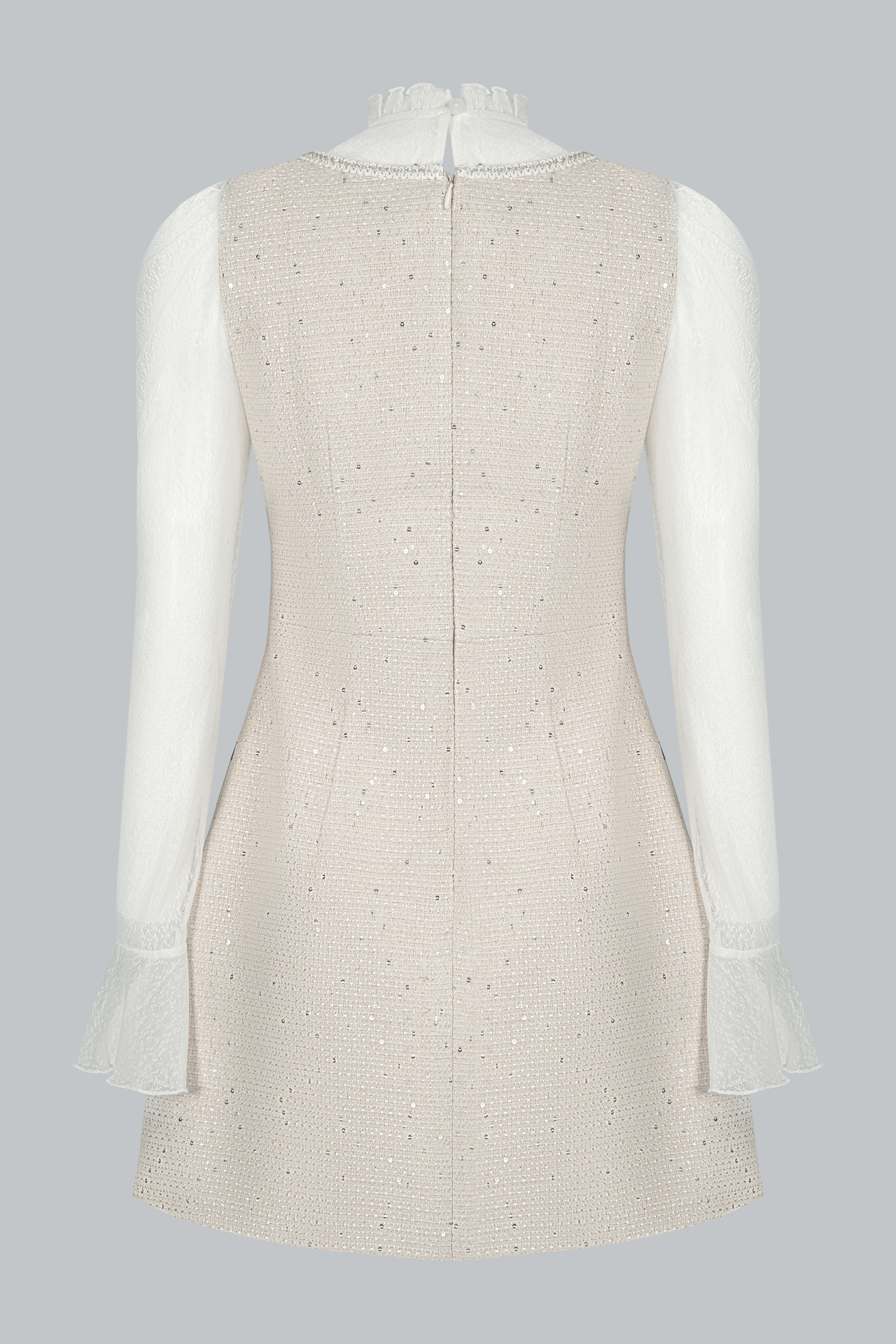 Tweed ánh kim đen sang trọng giữ phom ổn định; lớp kim sa đính tay tinh xảo nâng tầm thiết kế. Lớp áo len trắng mềm mại bên trong tạo cảm giác ấm áp, dễ chịu và làm nổi bật sự tương phản đầy dụng ý.