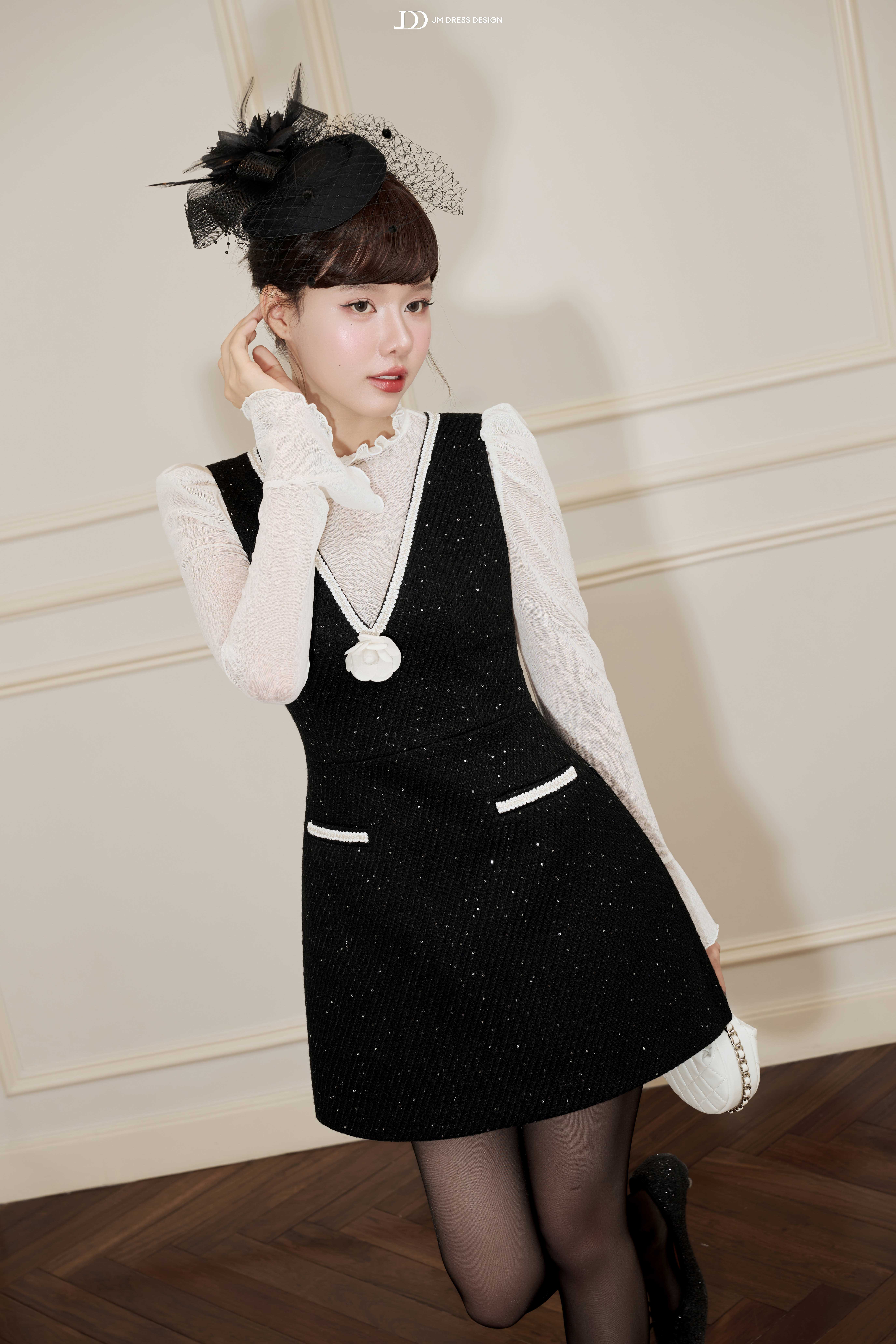 Phom váy A-line ngắn gọn, giúp tôn đôi chân thon dài. Trên nền tweed đen, những hạt kim sa nhỏ được đính tỉ mỉ tạo hiệu ứng ánh sáng lấp lánh. Điểm đặc biệt là lớp áo len trắng đi kèm – với cổ bèo duyên dáng và tay loe retro cực kỳ nịnh dấng. Cổ V thanh thoát khéo léo phô diễn xương quai xanh, mang lại nét nữ tính vừa tinh tế vừa gợi cảm.