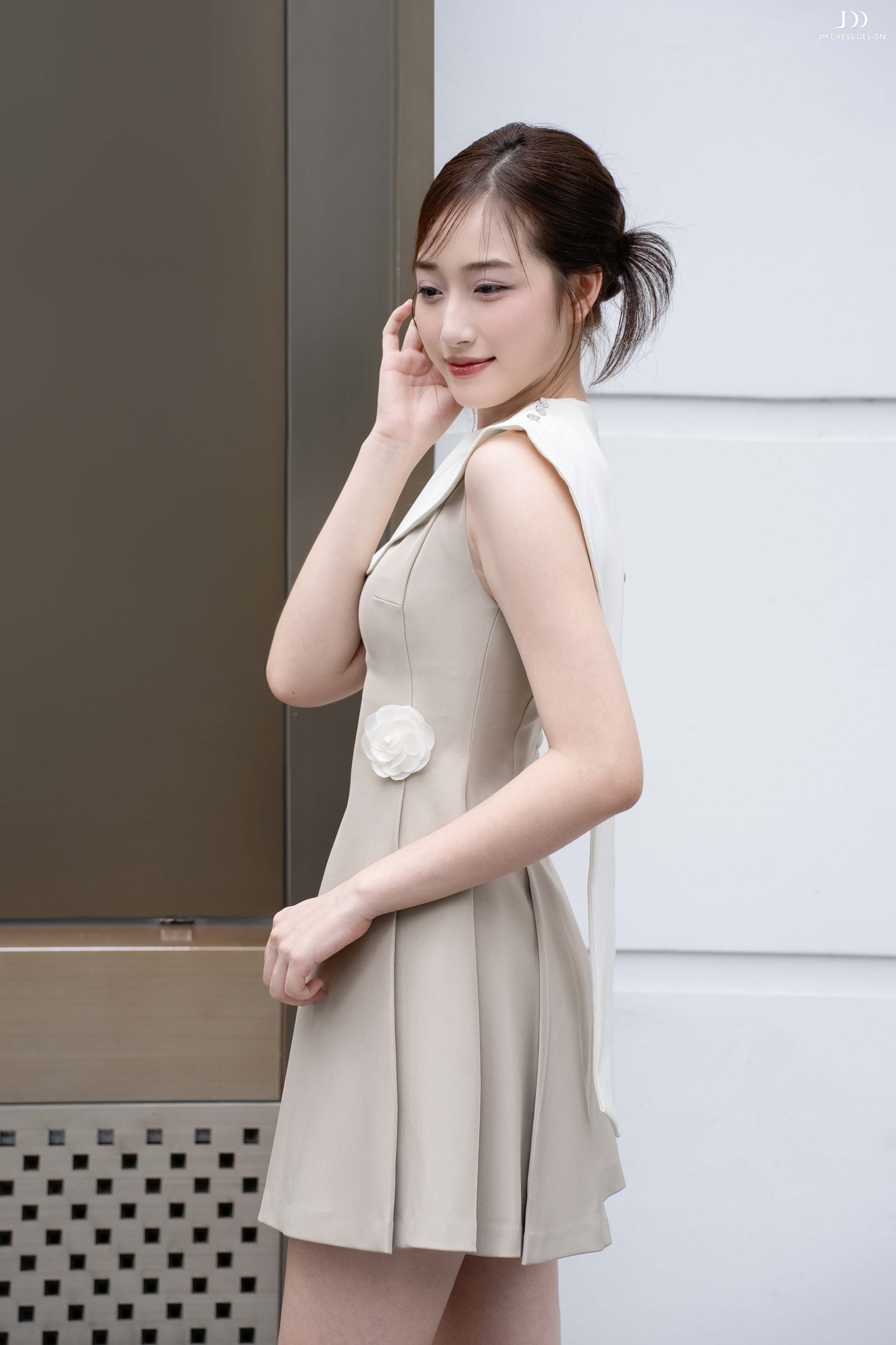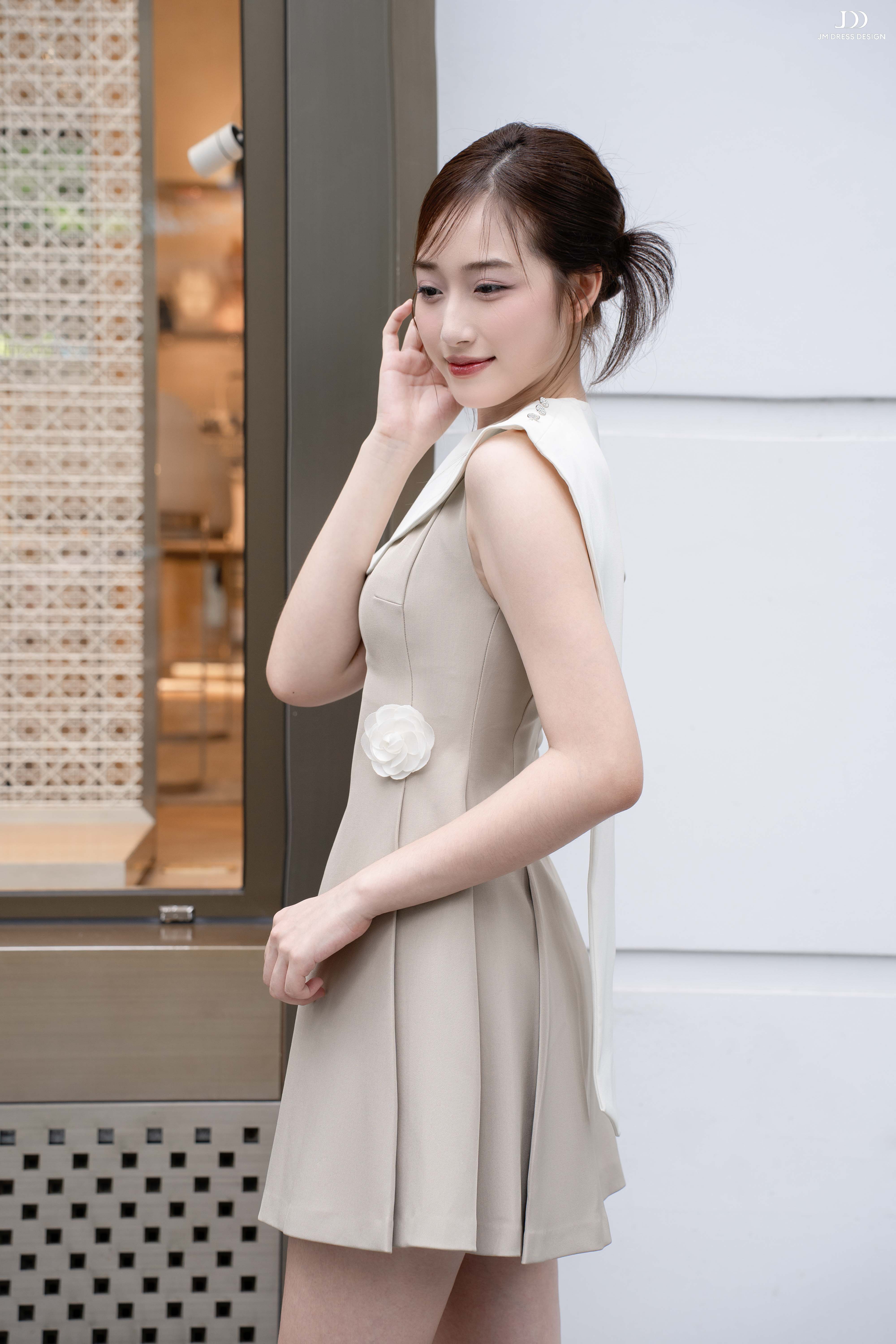 Chiếc nơ hoa nhài đính tại eo là chi tiết "thì thầm" đắt giá – không phô trương mà đủ khiến ánh nhìn dừng lại. Tay sát nách và phần thân trên ôm nhẹ giúp tôn dáng, đồng thời giữ được sự linh hoạt khi di chuyển.