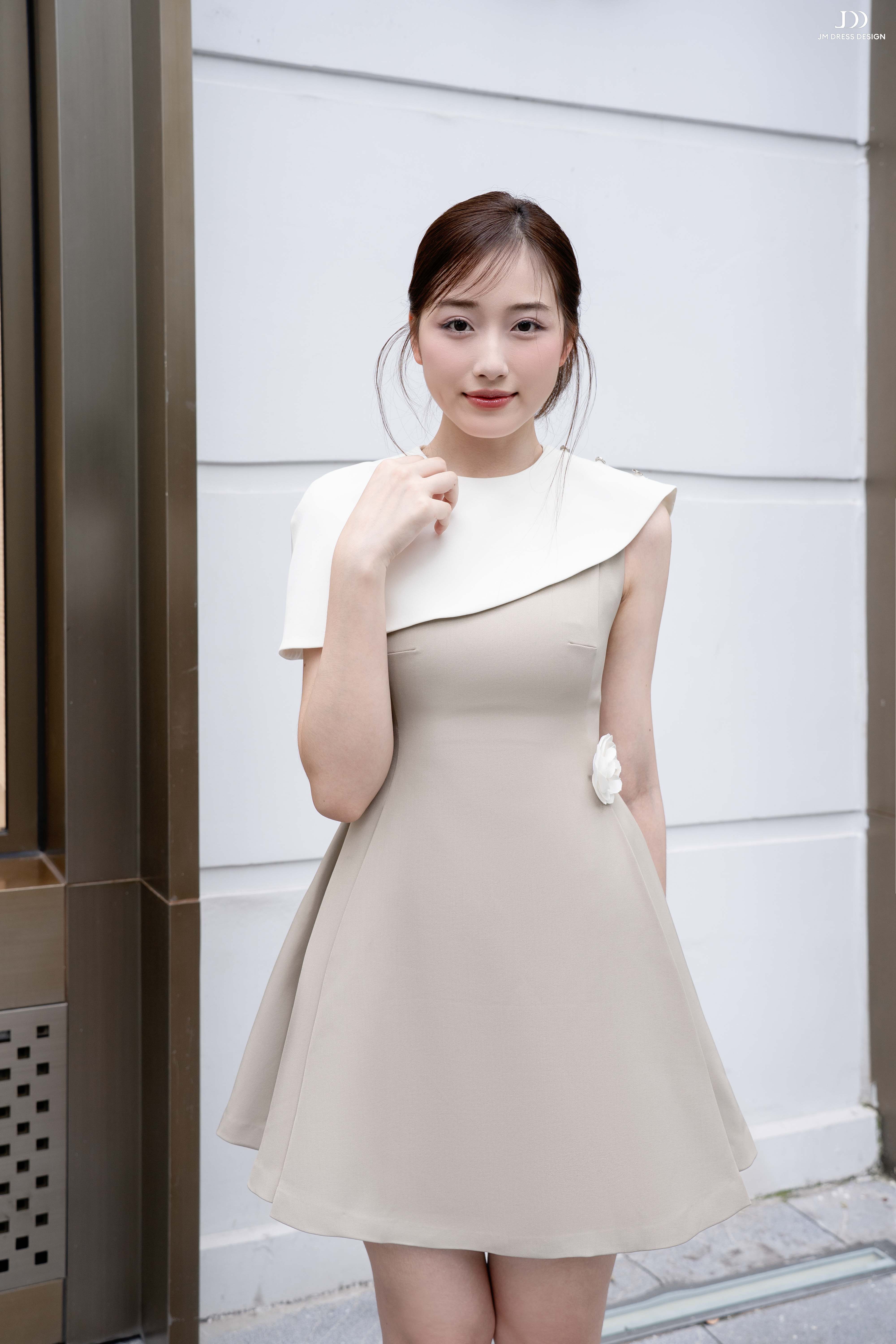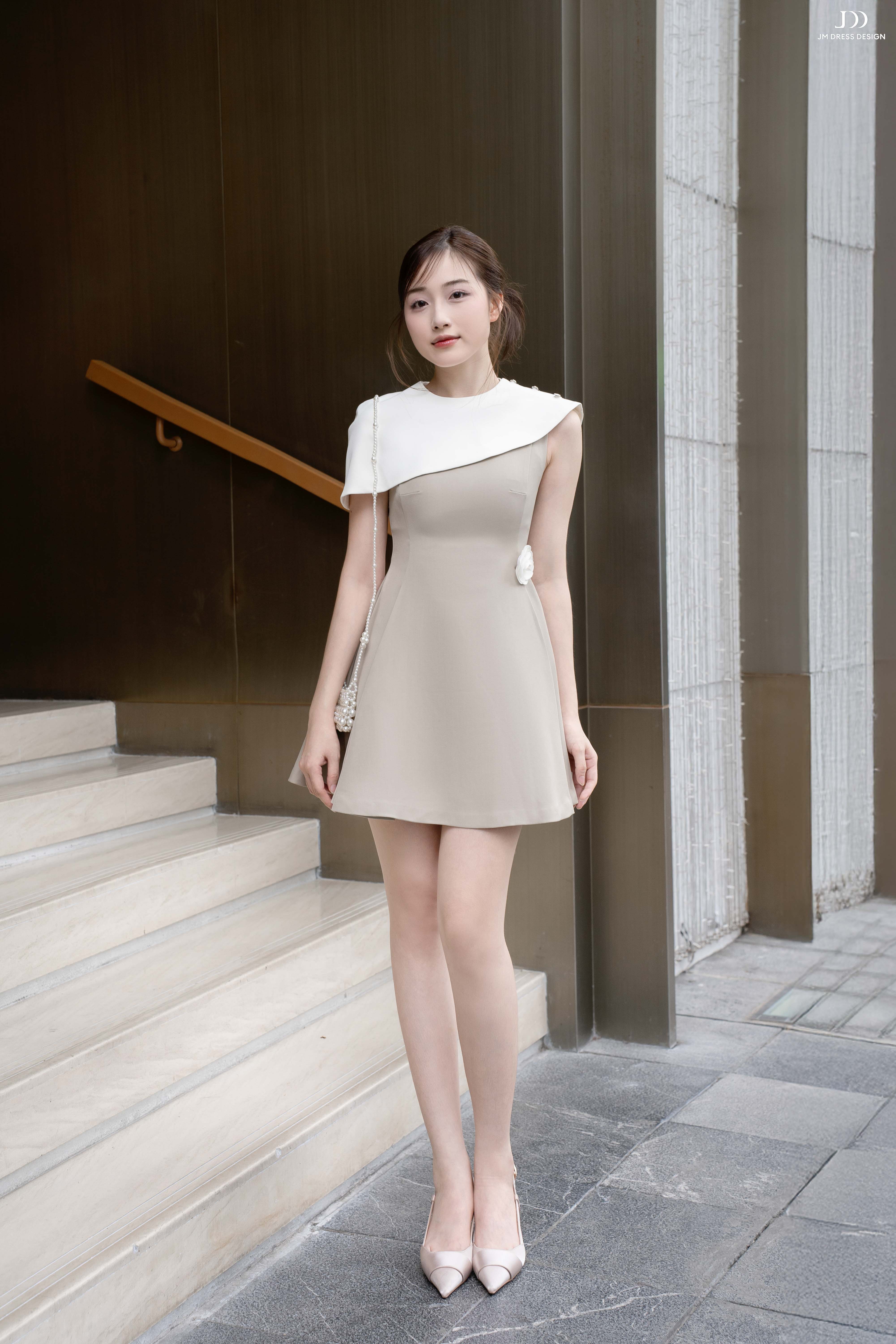 Dáng váy xòe chữ A cùng độ dài trên gối tạo nên vẻ trẻ trung, năng động nhưng không làm mất đi sự chỉn chu. Điểm nhấn đặc biệt nằm ở chi tiết cổ choàng lệch vai – một đường cắt bất đối xứng khéo léo phủ ngang bờ vai phải, mang lại cảm giác thanh thoát như một lớp voan mỏng bay qua. Tông đen chủ đạo kết hợp cùng mảng trắng lệch tạo hiệu ứng thị giác nổi bật, gợi nhớ tinh thần thời trang thập niên 60s – cổ điển nhưng không lỗi thời.