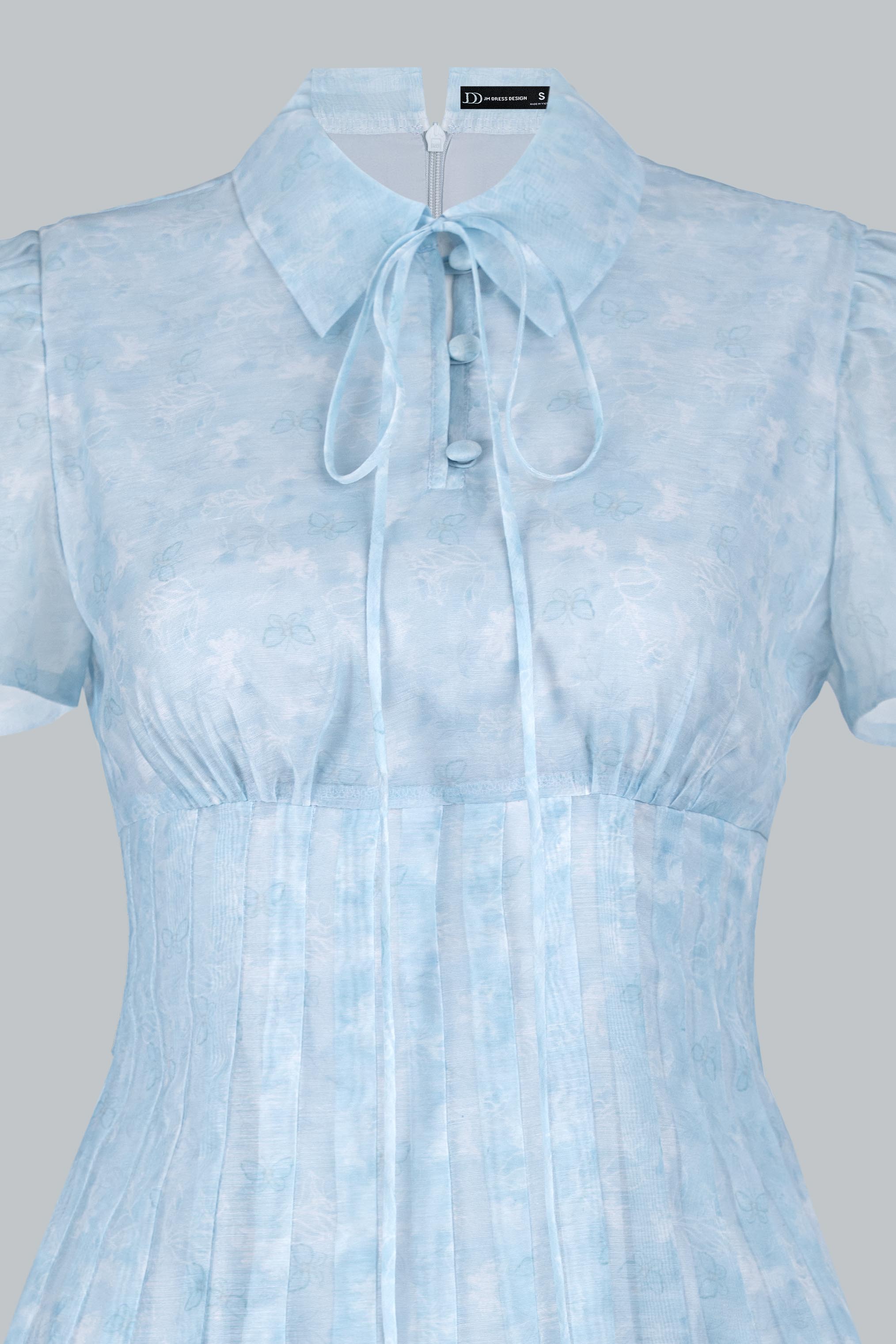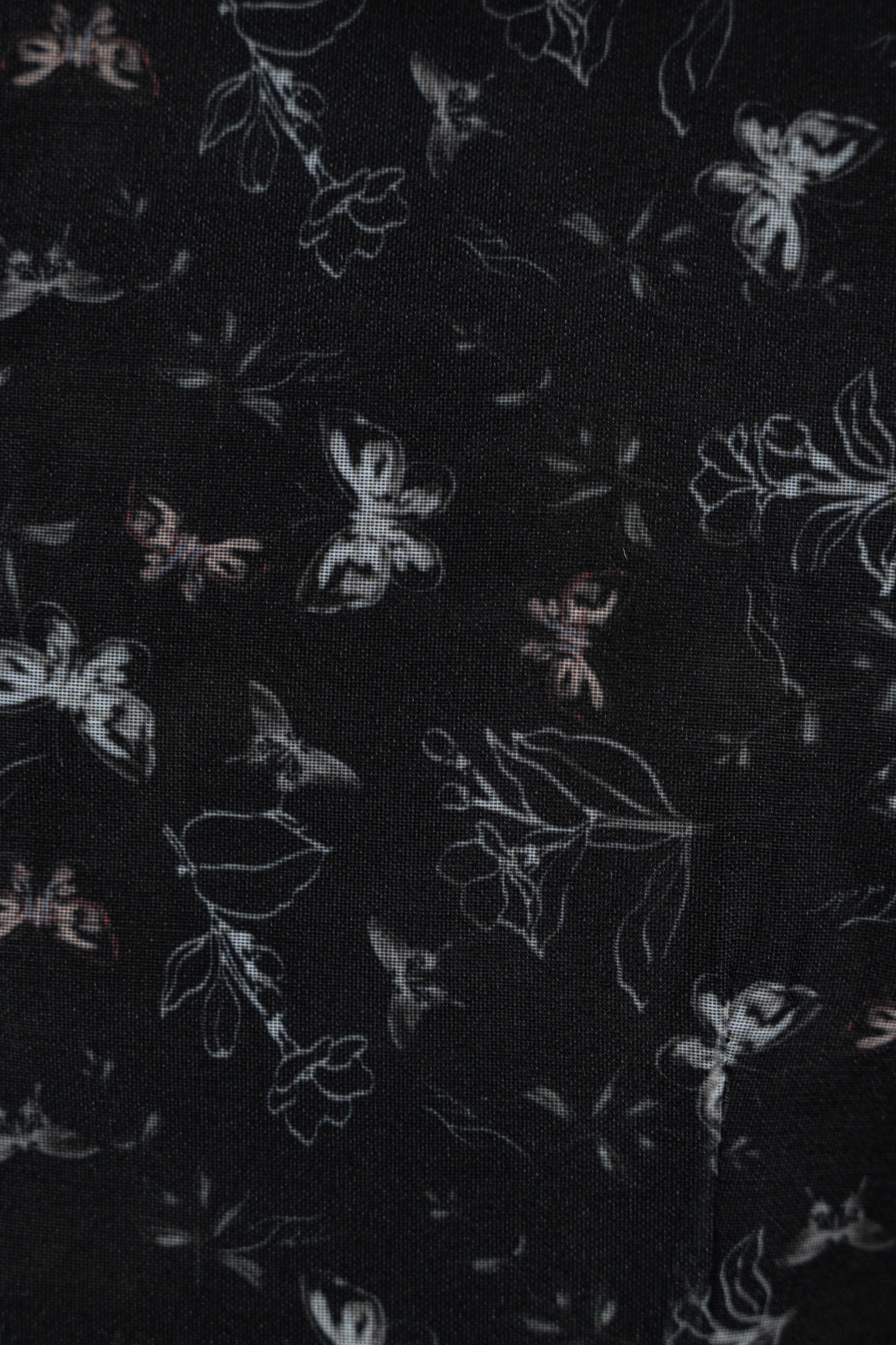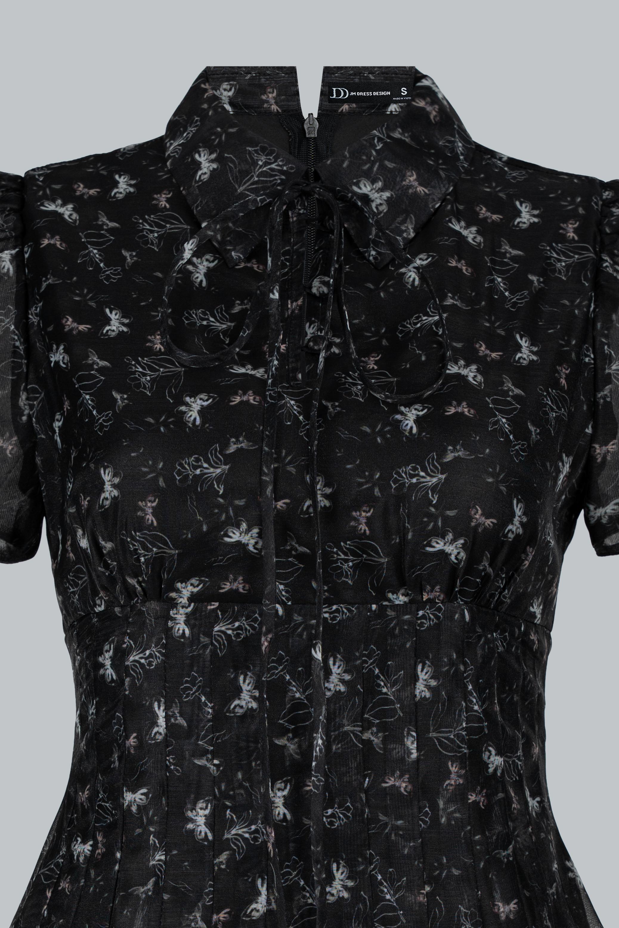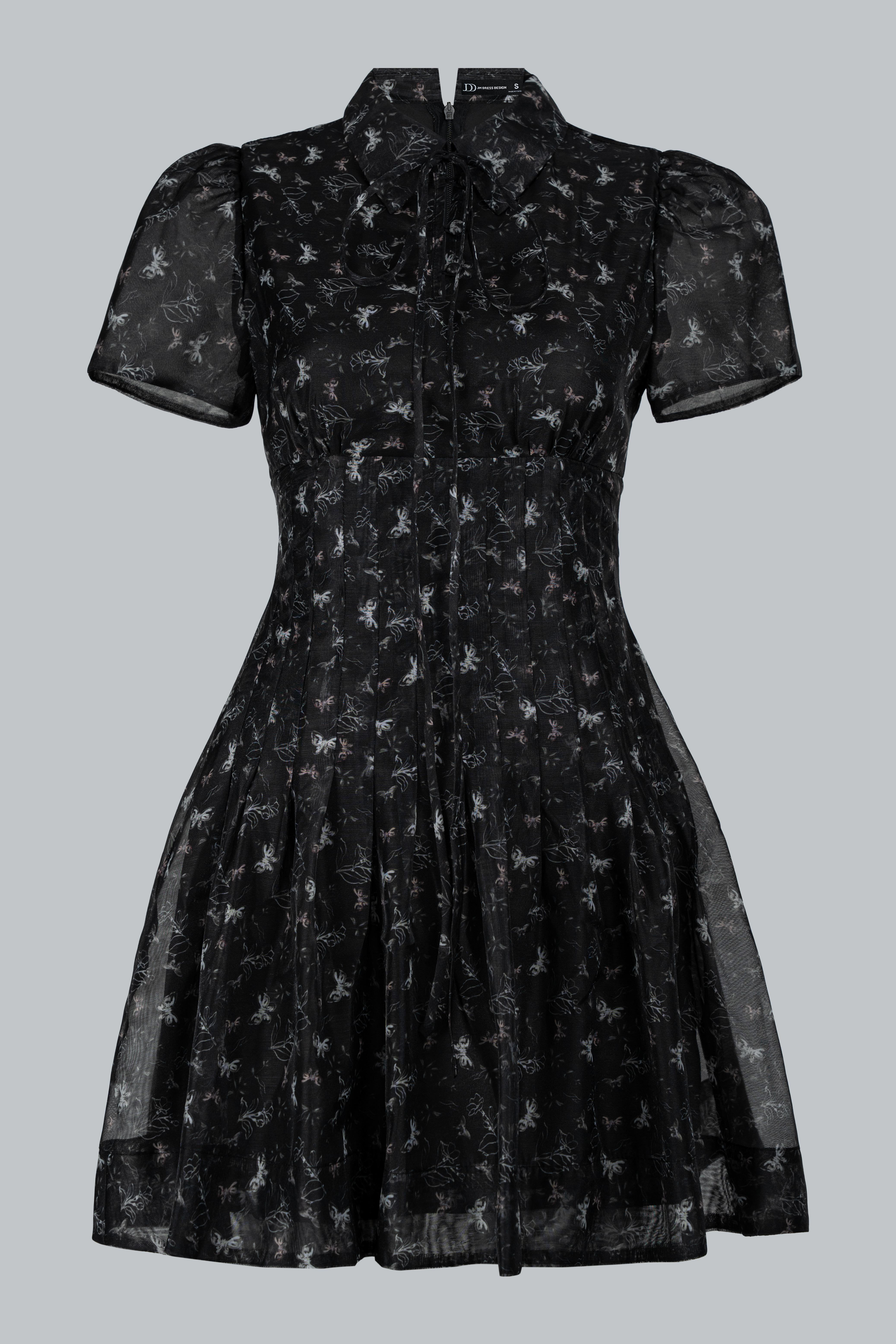 Thiết kế sử dụng vải tơ in họa tiết hoa nhỏ, bề mặt mềm và có độ rủ êm. Chất liệu mang lại cảm giác nhẹ nhàng, thoáng mát, phù hợp với thời tiết xuân – hè và những không gian ngoài trời. Vải giữ phom vừa đủ để chiếc đầm luôn trông gọn gàng và chỉn chu.