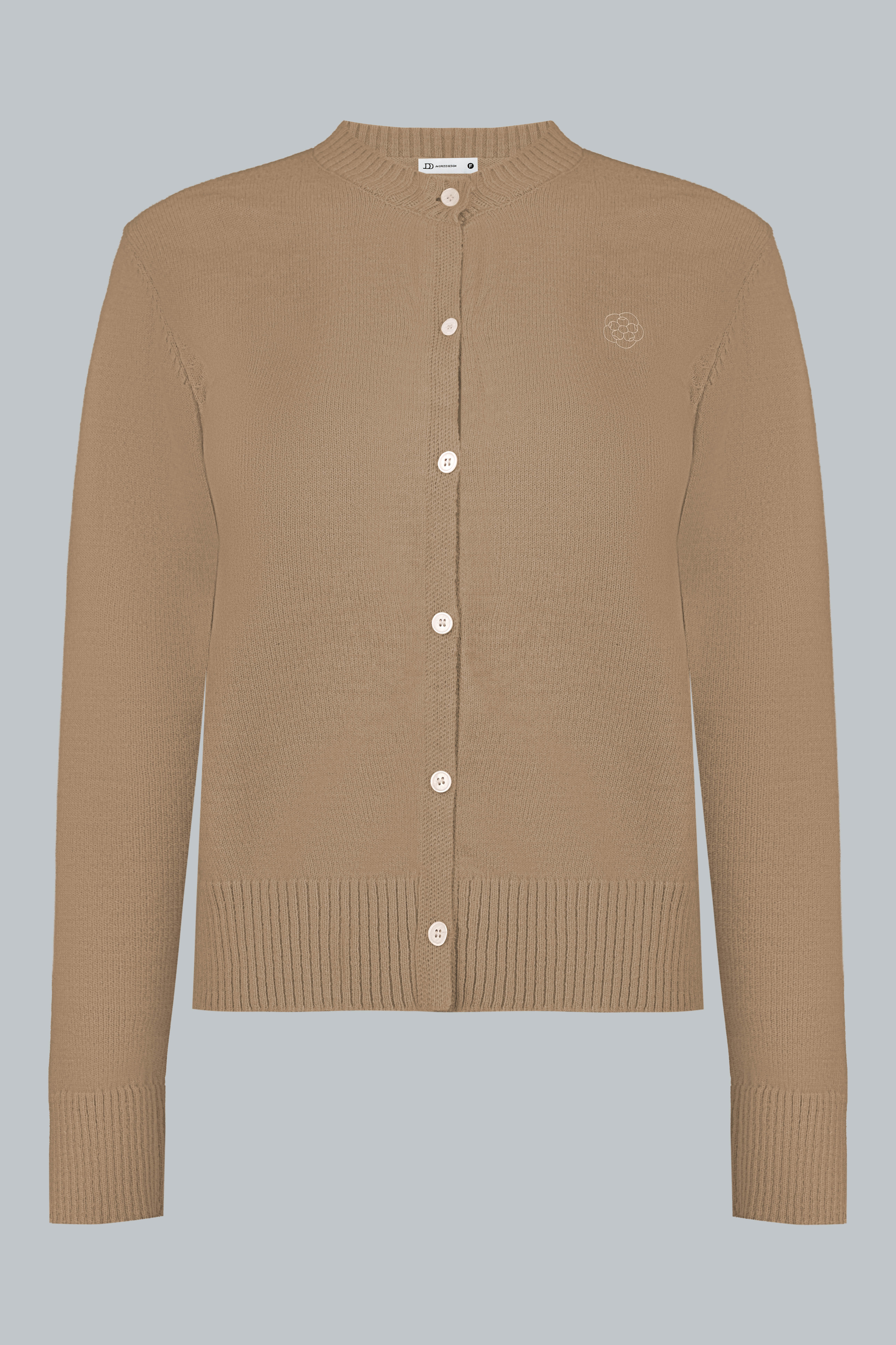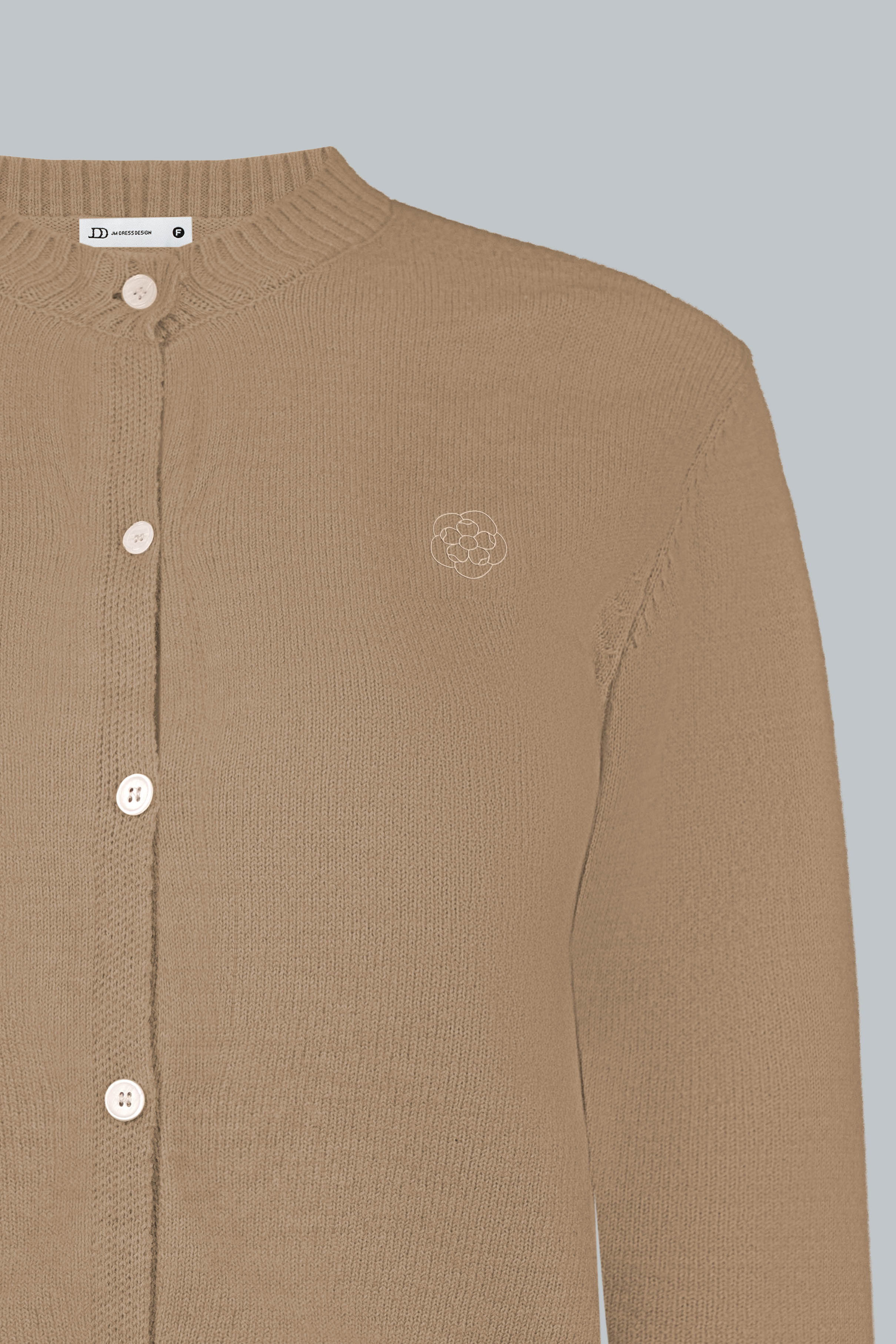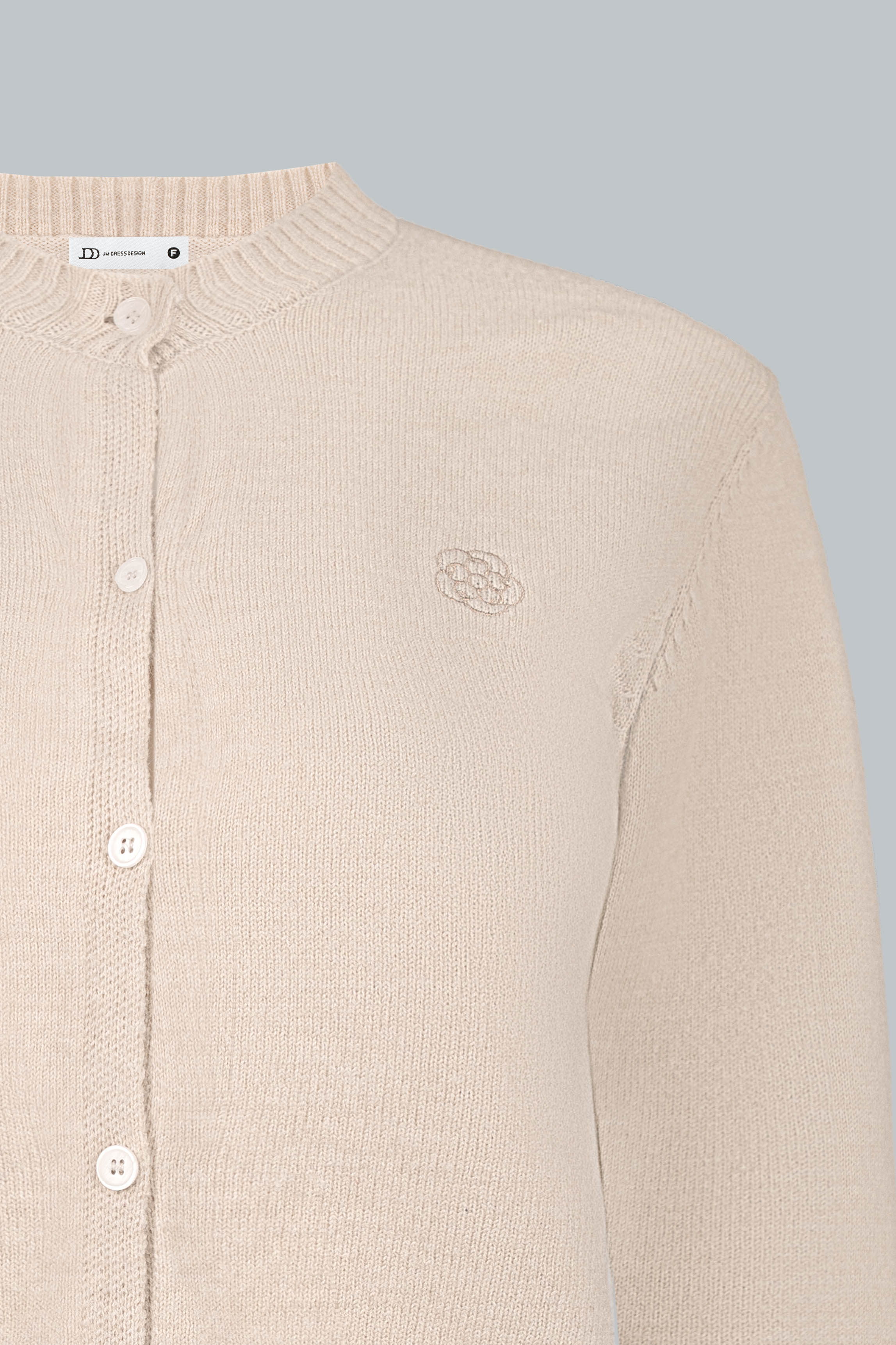 Điểm nhấn nằm ở chi tiết thêu logo tinh tế kết hợp cổ bổ trụ đính cúc JDD, mang nét nữ tính cổ điển, nhẹ nhàng.
